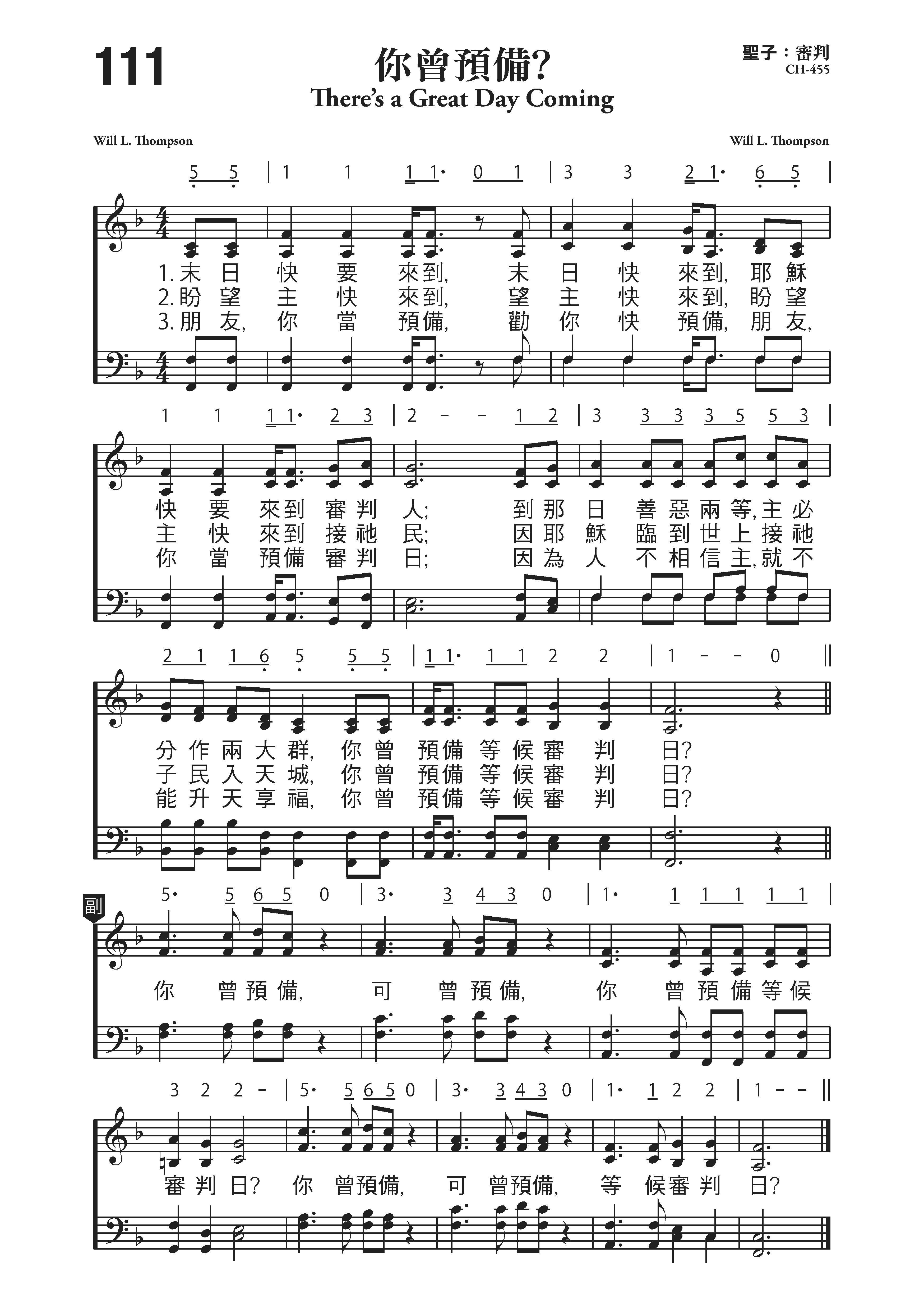 汤普森的这首诗歌是以审判作为主题的。当基督复临之时,耶稣要坐在白色的大宝座上审判天下的万民。那时已经准备好的义人将受到主永远的奖赏,进入那荣耀的天城。但对于尚未准备好的罪人来说,乃是永久的遗憾。所以我们要趁着今生短暂的时光,赶紧接受耶稣为个人的救主,靠着祂的恩典,过得胜的生活,克服与生俱来和后天养成的一切罪恶倾向。这样,我们就回坦然无惧地面对将来。