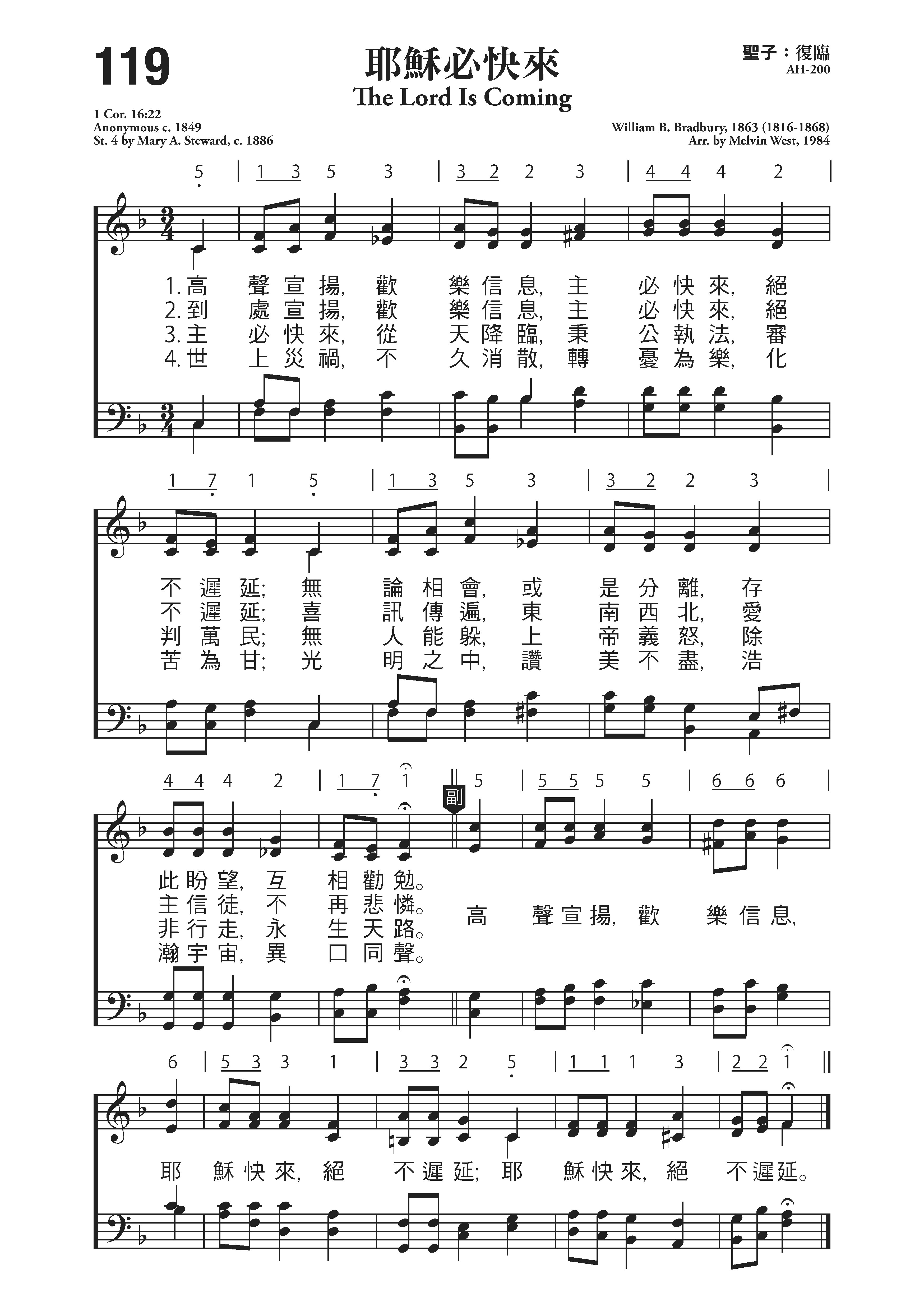 词作者佚名(约1849年),玛丽.斯图尔特(Mary A.Steward)写第4节(约1886年);布拉德伯里(W.B.Bradbury,1816,10,6-1868,1,8)作曲;梅尔文.威斯特(Melvin West)编配(1984年)
