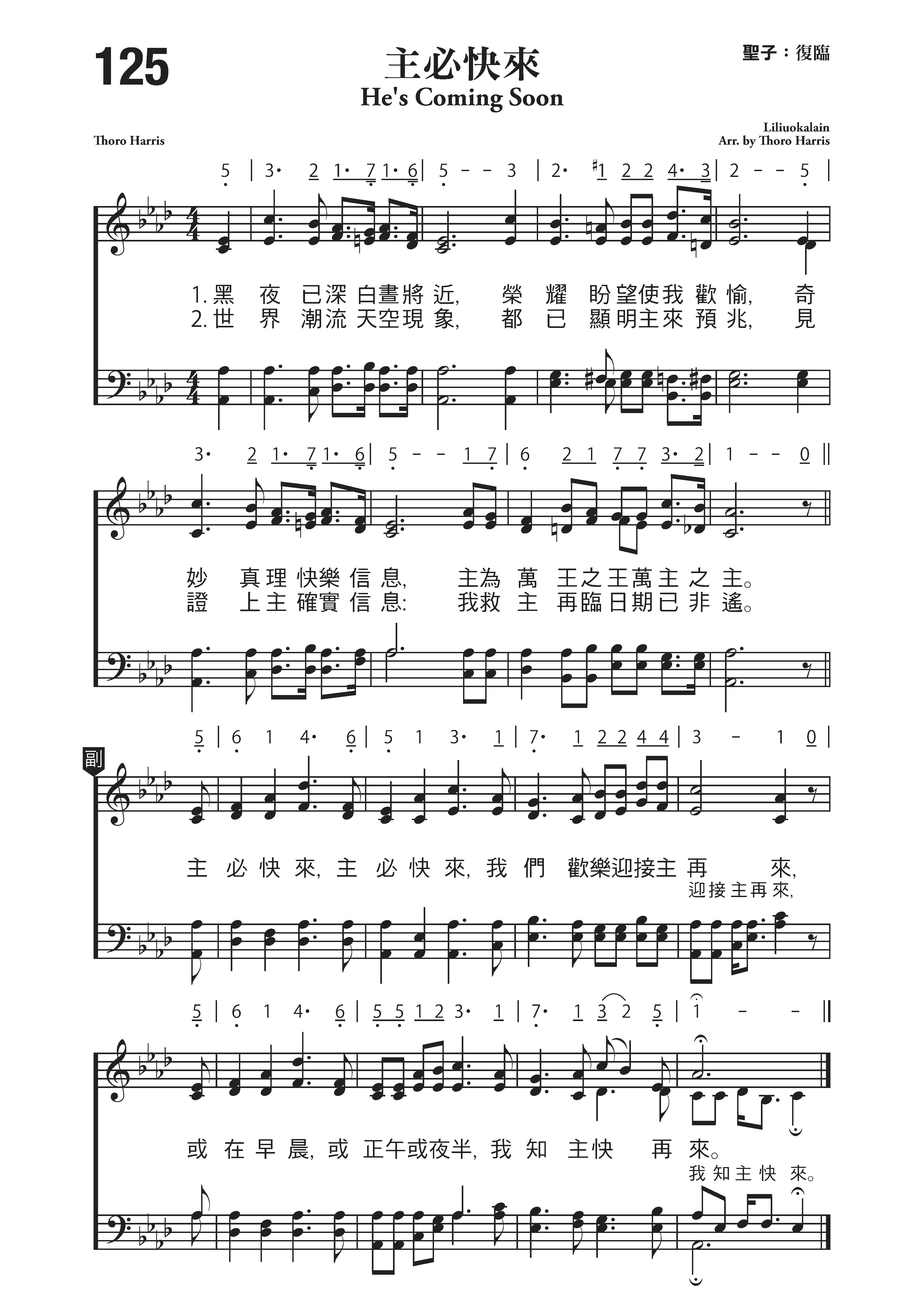 这是一首仰望基督复临的赞美诗。诗人用世界上和自然界所发生的种种事件和圣书的应许,见证主的再来就在眼前。信徒务必警醒祈祷,作好充分的准备迎接主的来临。词作者索罗.哈里斯出生于美国首都华盛顿。曾就读于密歇根州的巴特尔克里克学院。1902年,他在波士顿创作了第一首圣诗。后应比洪(见《赞美诗》505版89首介绍)的邀请前往芝加哥。1932年他前往阿肯色州的尤里卡斯普林斯。他常常背着旅行袋四处销售福音书籍。本诗是他的代表作品。曲调是根据夏威夷民歌《俪歌》改编的。