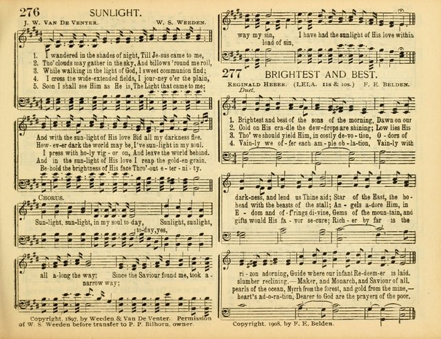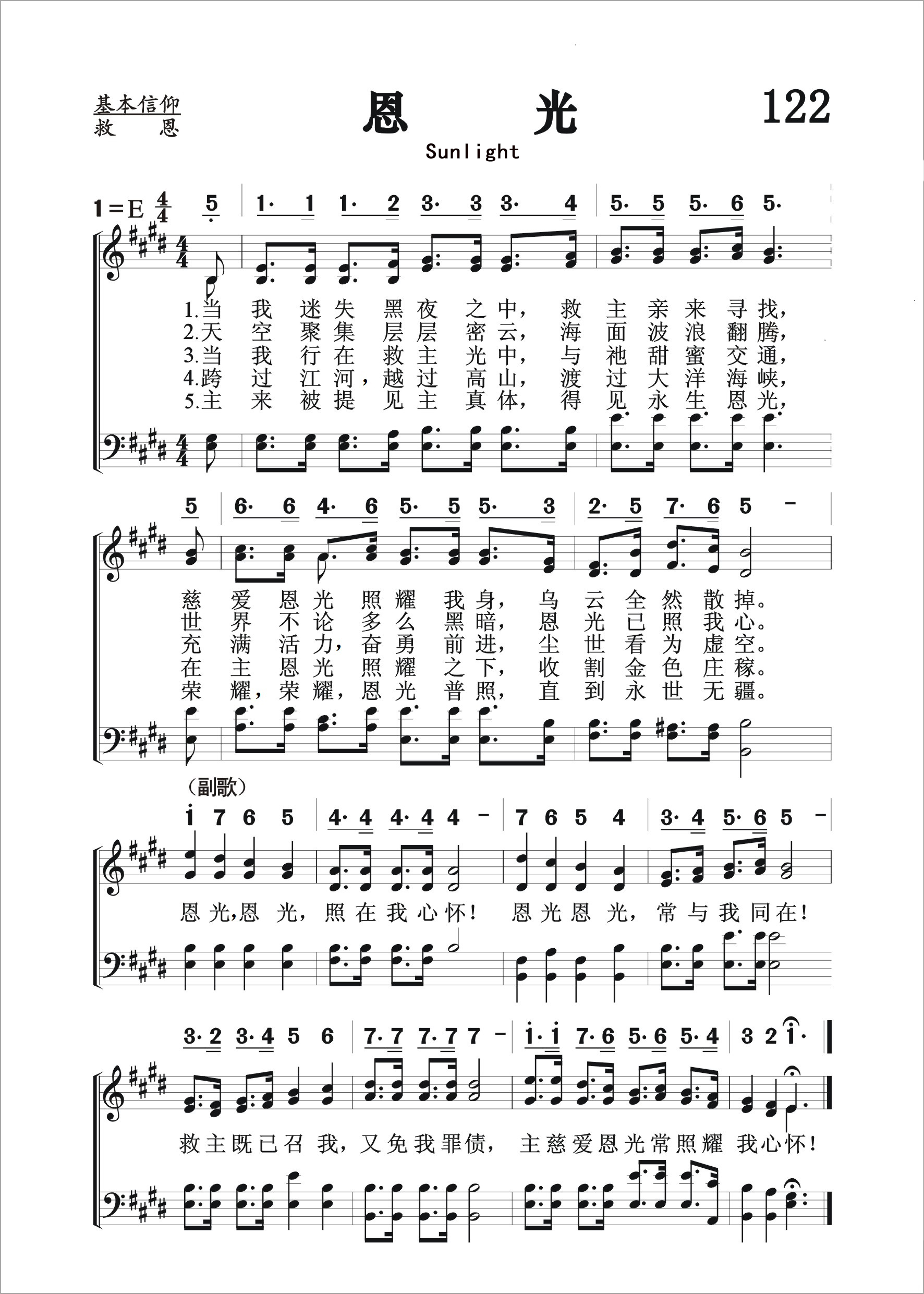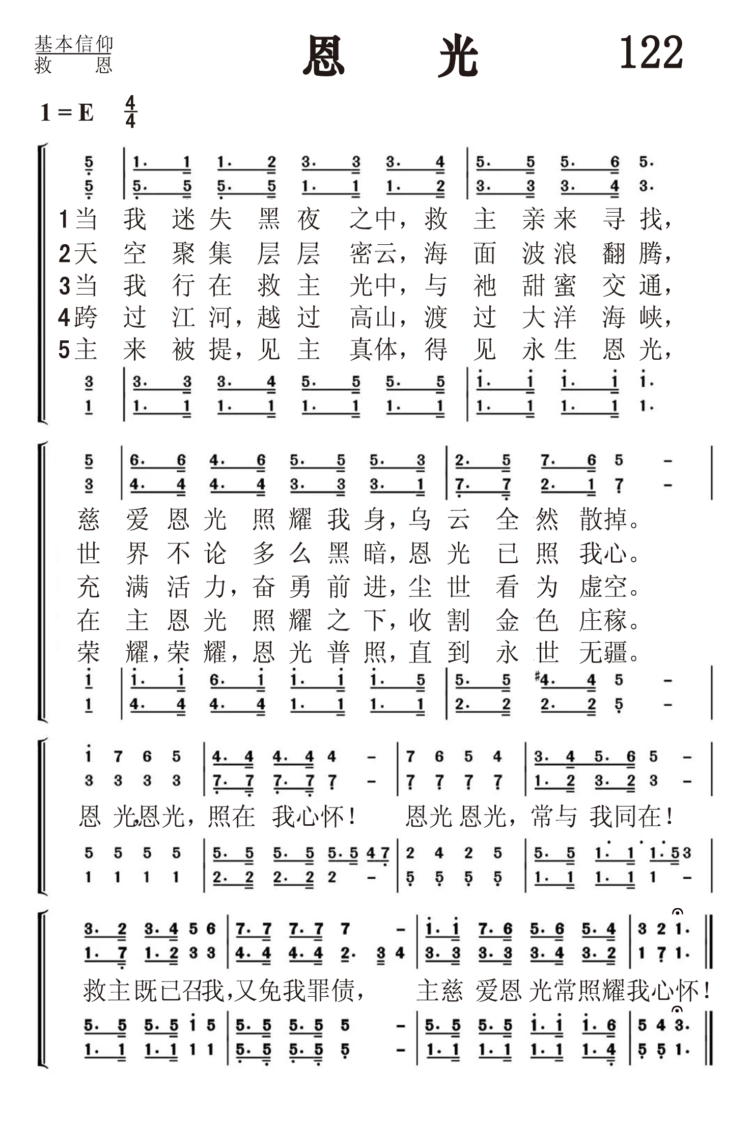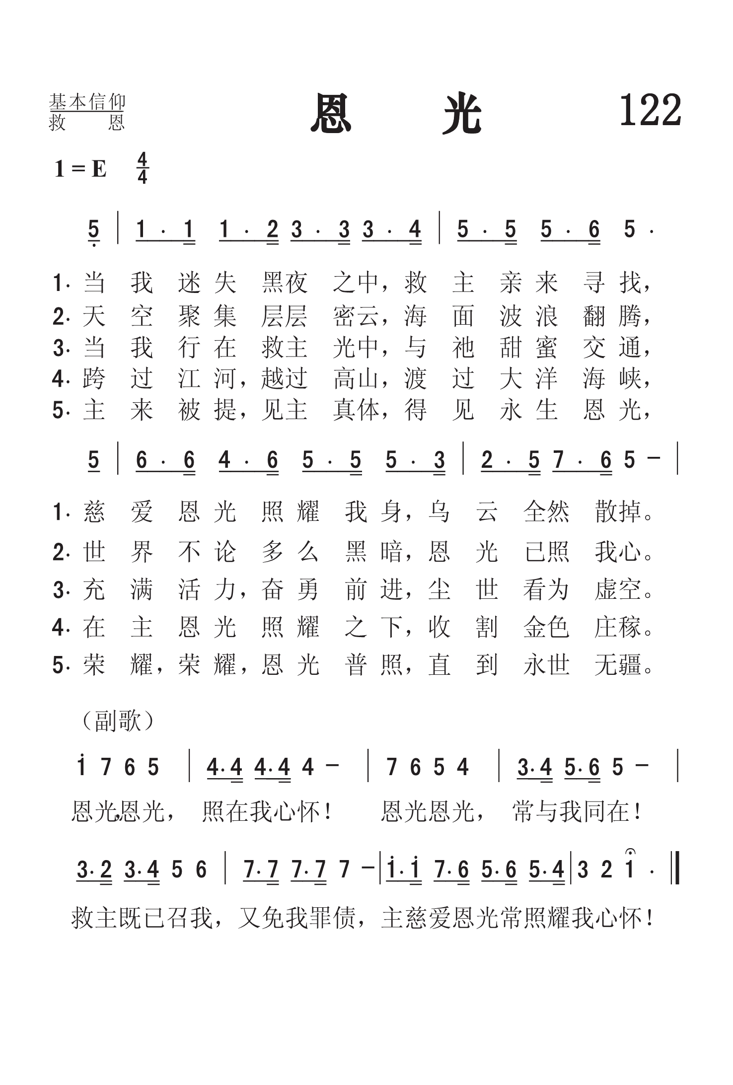 第122首 恩光Sunlight 文特尔(J.W.Van.Deventer,1855,12,5-1939,7,17)作词,威登(W.S.Weeden,1847,3,29-1908,7,31)作曲 当我迷失在黑暗之中,救主亲来寻找, 慈爱恩光照耀我身,乌云全然散掉。 恩光,恩光,照在我心怀! 恩光,恩光,常与我同在! 救主既已召我,又免我罪债, 主慈爱恩光常照耀我心怀! 这首诗歌讲述了基督徒在救主恩光的照耀之下,行走在康庄大道上的快乐和幸福。他们既蒙主的拯救,就已出死入生,不再行走在黑暗之中。他们的前途无限光明。他们的明天灿烂似锦。因为主是他们的向导和随时的帮助。 词作者文特尔是本世纪二三十年代美国的旅行布道家。他生于美国密执安州。他大学毕业后,在中学任教艺术和书法。他原是美国监理会的热心信徒,后来受圣灵感动,从事旅行布道工作,曾到过英格兰,爱尔兰,苏格兰等地。他晚年定居在美国南方的佛罗里达州。他的工作对于国际布道家葛培理有很大的影响。 曲作者威登和词作者有过相似的经历。他中学毕业后任音乐教学多年,以后献身从事传道工作,以声音洪亮闻名。 《颂赞诗歌》470首《一切献上》也是文特尔作词,威登作曲的。