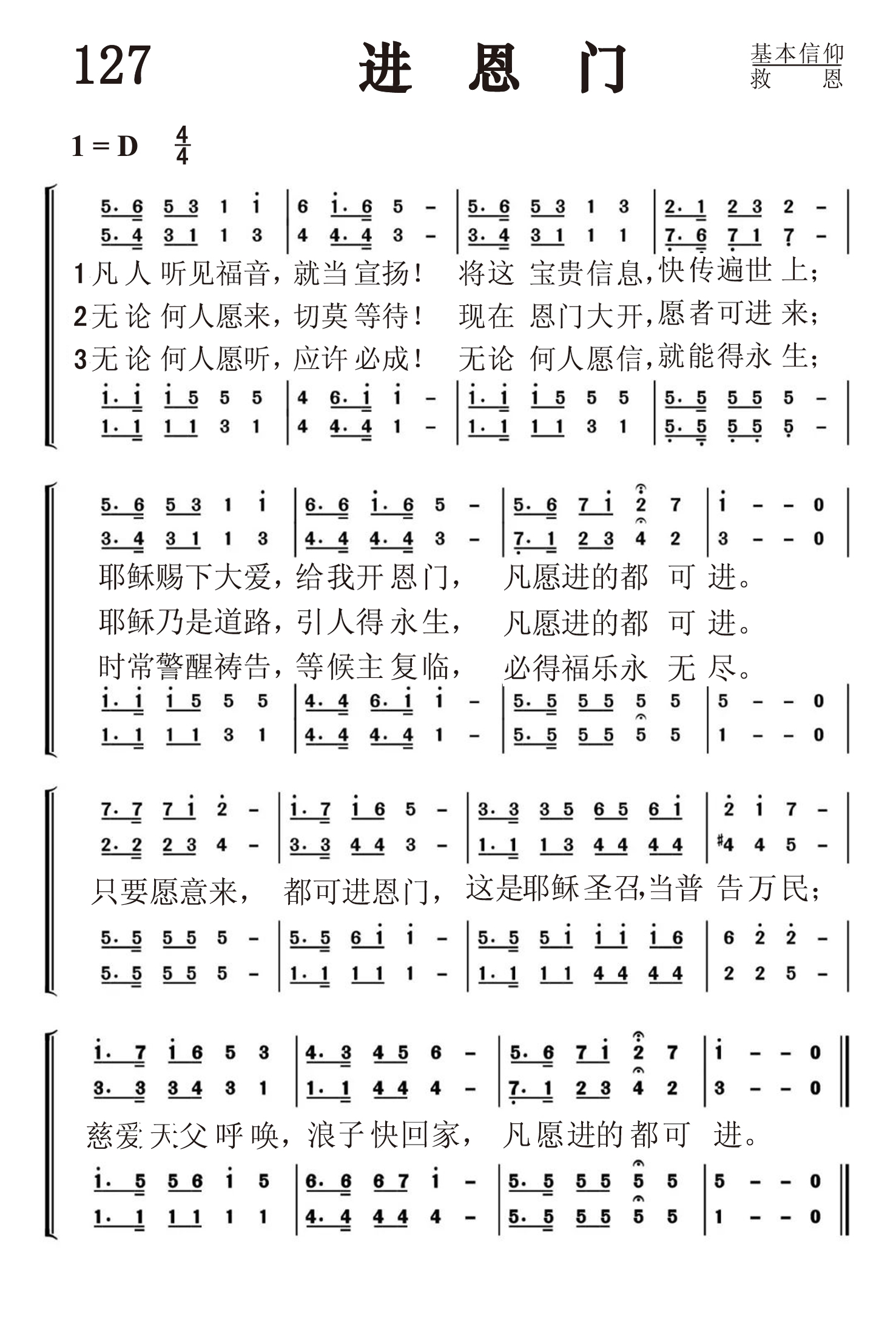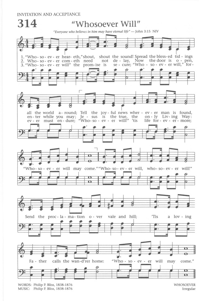 第127首进恩门Whosoever Heareth 布利斯(P.P.Bliss 1838,7,9-1876,12,29)作词作曲 凡人听见福音,就当宣扬!将这宝贵信息,快传遍世上; 耶稣赐下大爱,给我开恩门,凡愿进的都可进。 无论何人愿来,切莫等待!现在恩门大开,愿者可进来; 耶稣乃是道路,引人得生,凡愿进的都可进。 无论何人愿听,应许必成!无论何人愿信,就能得永生; 时常警醒祷告,等候主复临,必得福乐永无尽。 布立斯和桑基同为近代福音圣诗布道的奠基人。他们既写诗,又谱曲,而且所写的歌旋律明快,动听易学。就像桑基与穆迪亲密合作,相得益彰一样,布立斯紧随布道家D.W.惠特尔,与他默契配合。每当惠特尔用充满激情的讲章劝导会众时,布立斯就用优美的歌声打动他们的心。他的歌声所感化的人数,丝毫不在布道家所结的果子之下。 1869年冬天,英国布道家穆尔豪斯到芝加哥开布道会,一连七次都是以约3:16为题,把上帝眷怜世人,甚至舍弃自己的独生子来拯救他们的大爱讲述得淋漓尽致,使在场的人,包括布立斯和穆迪等同工都大受感动。布立斯因此而写下了这首后来广为传唱的福音诗歌《进恩门》,进一步深化了上帝的救恩惠及普世人类的主题。 圣诗音乐家布利斯原是美国卫理公会的平信徒。他出身贫寒,但生性酷爱音乐。在他10岁的时候,有一天被一所房子里传出来的风琴声所吸引,就贸然进去,要求里面的阔太太再弹一曲,竟然因他衣杉褴褛而被赶出去。但他仍不灰心,继续学习唱歌和作曲。他曾谱了一首曲子寄给音乐家鲁特,请求指点,并要求鲁特:如果认为这首歌写得还可以,就送给他一支笛子,因他实在买不起。鲁特不但送他笛子,还写了一封信,鼓励他努力自学。 布利斯先是在一所木刻镜框商店做学徒,同时业余继续自学音乐。后来,他终于考上纽约市的音乐师范大学。毕业后,他搬到芝加哥,以他的音乐天赋事奉上帝,在教会中教唱诗班,自己编曲。谱曲,并且还独唱,然后再教会众齐唱。他的嗓音优美动听,音域宽广,唱起歌来很容易感动人。布利斯写圣诗的特点是主题广泛,灵感丰富,词曲并茂,通俗易晓。一件偶然的事故,一篇动人的故事,一次讲道的感受,一节经文的启发,都可以成为他的题材。有时是主题,歌词,旋律于刹那间同时在脑海中形成。比如他听见牧师讲约翰福音第三章16节的讲题后,便写成了这首著名的《进恩门》。他先随惠特尔在美国各地布道,以后自编《福音诗歌》,并与桑基合编《圣诗与独唱》。他将稿费所得全部捐给了布道团。1876年因火车失事,他为营救他的夫人及孩子而遇难。他在世的时间虽然短暂,但他没有辜负上帝的托付,留下了很多福音圣诗。 《颂赞诗歌》第40首《歌颂救赎主》是布利斯作词的。