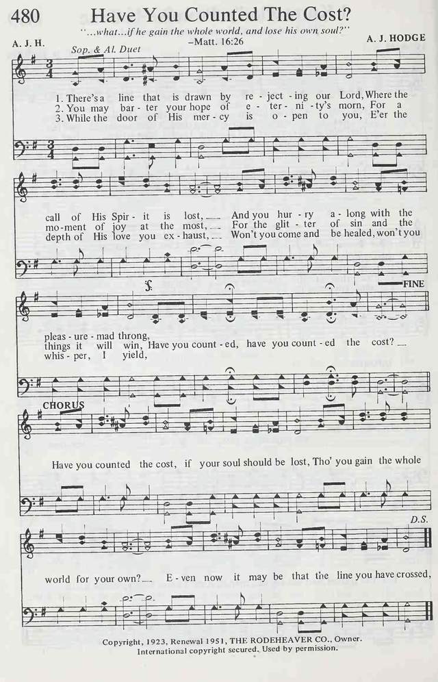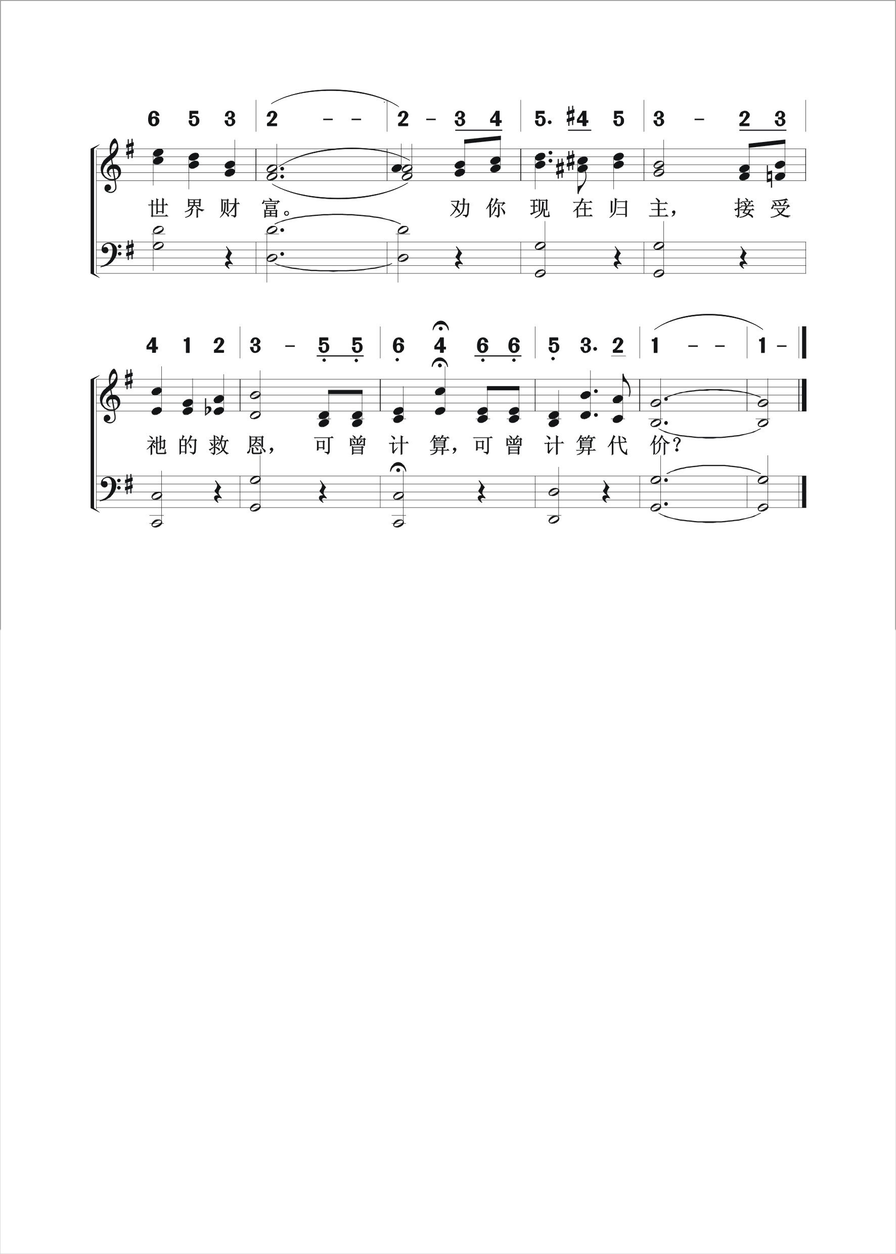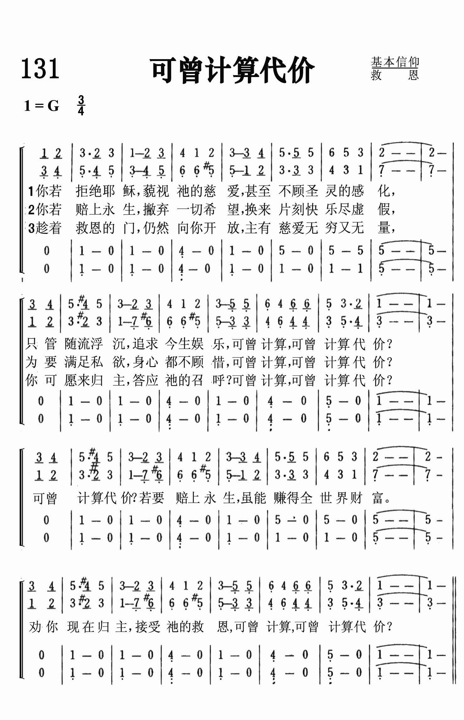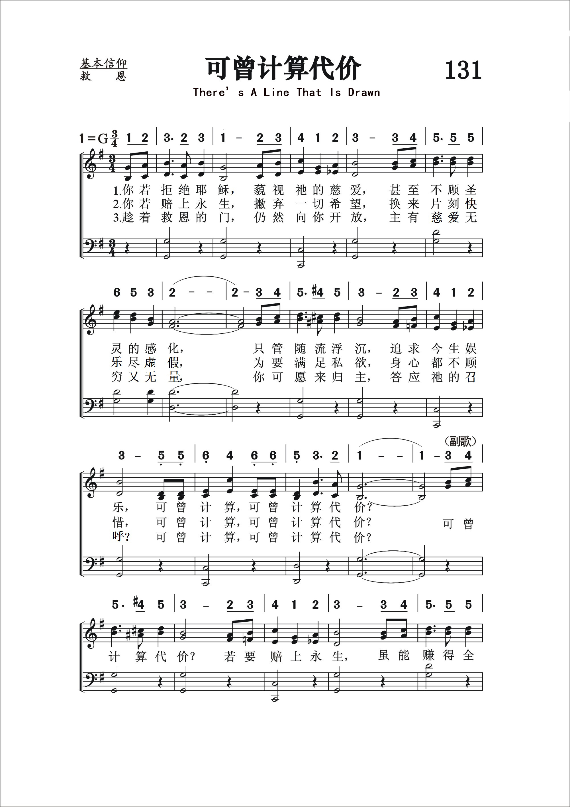 第131首可曾计算代价There’s a Line That Is Drawn 霍奇(A.J.Hodge)作词作曲 你若拒绝耶稣, 藐视祂的慈爱, 甚至不顾圣灵的感化,只管随流浮沉, 追求今生娱乐,可曾计算,可曾计算代价 你若赔上永生,撇弃一切希望, 换来片刻虚空的快乐,为要满足私欲, 身心都不顾惜,可曾计算,可曾计算代价 趁着救恩的门,仍然向你开放. 主还有无穷尽的慈爱,你可愿来归主, 答应祂的呼召 可曾计算.可曾计算代价 可曾计算代价若要赔上永生,虽能赚得全世界财富。 劝你现在归主,接受祂的救恩.可曾计算,可曾计算代价 这首感人值至深的赞美诗是霍奇于1923年创作的。无限慈爱的救主在天上的圣所中天天举起祂带有钉痕的双手为迷路的罪人代求。祂巴不得人人都接受祂所白白提供的救恩,悔改得救。但如果世人执意拒绝祂的劝导,越过了一条不能逾越的界线,圣灵的感动就再也不能对他起作用了。这首诗把永生和永死的严肃问题摆在我们面前,让我们自己来权衡得失,计算代价。诗歌的副歌,回应了主耶稣的至理名言:“人就是赚得了全世界,若赔上自己的生命,又有什么益处呢?”值得每一个人深思! 作者生平不详。但他给我们留下了6首赞美诗歌词,1首曲谱(即本曲)