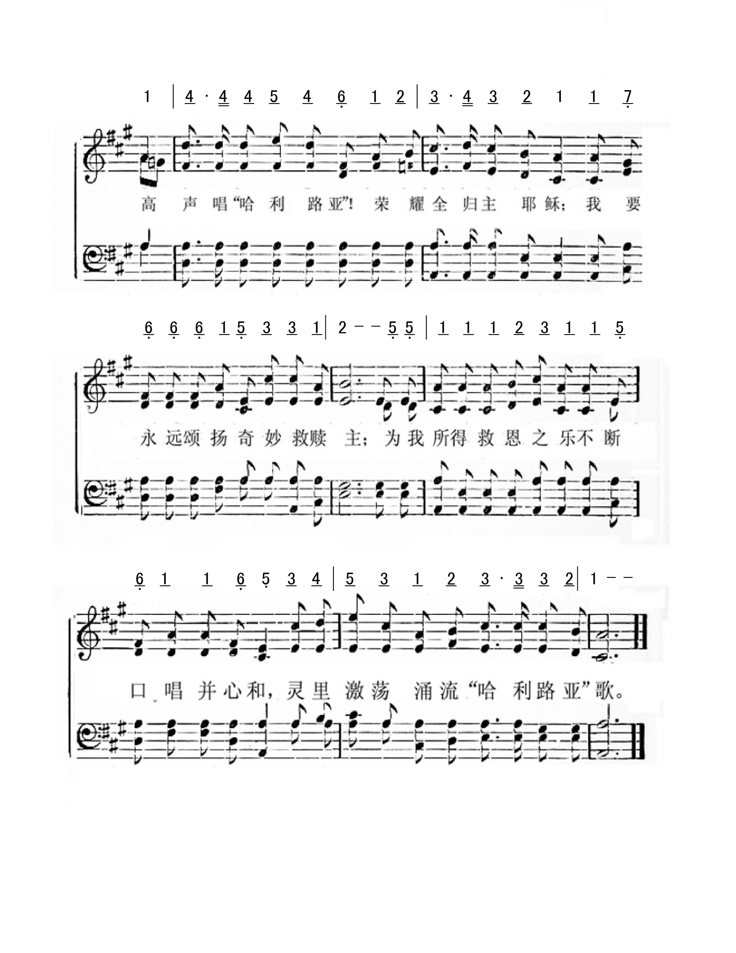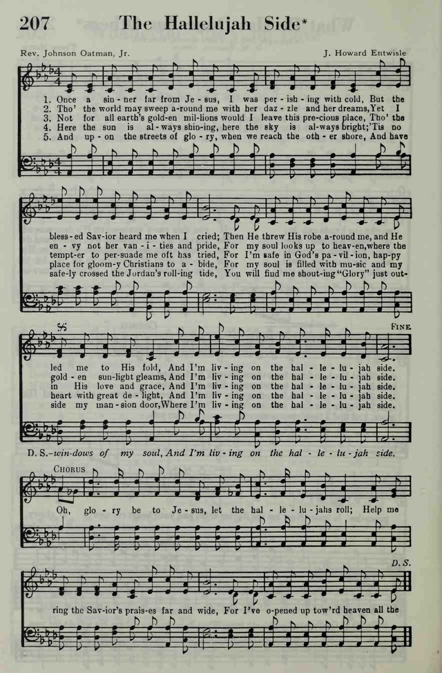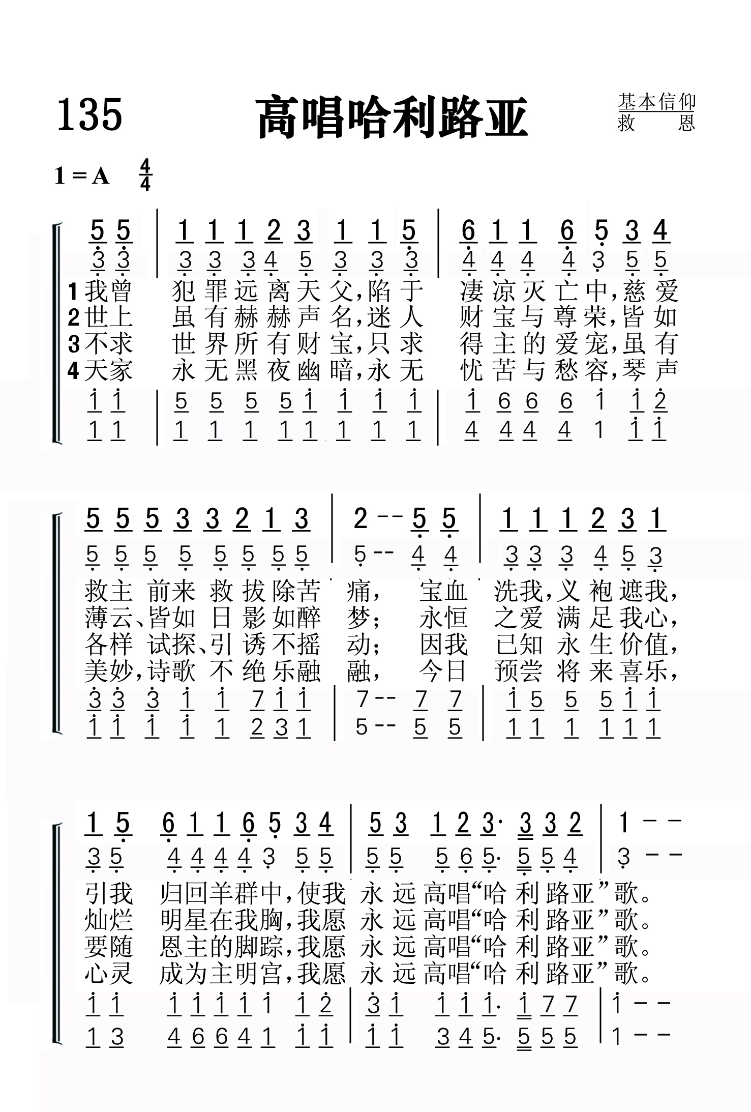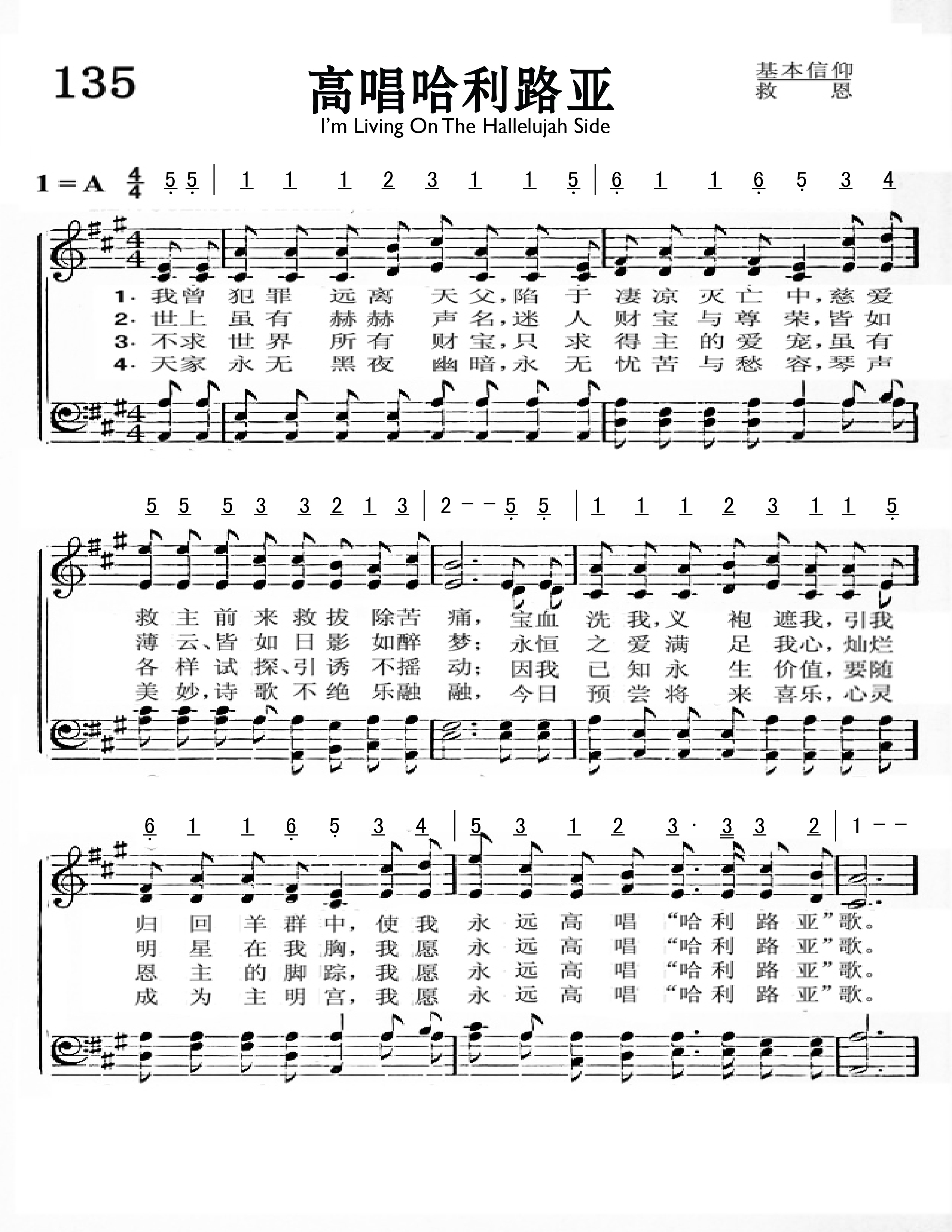 第135首 高唱哈利路亚 I’mLiving on the Hallelujah Side 约翰逊.奥特曼(Johnson Oataman,1856,4,21-1922,9,25)作词,恩特威斯尔( J.Howard Entwisle,1865-1901.12.16)作曲 我曾犯罪远离天父,陷于凄凉灭亡中, 慈爱救主前来救拔除痛苦,宝血洗我, 义袍遮我,引我归回羊群中, 使我永远高唱哈利路亚歌。 世上虽有赫赫声名,迷人财宝与尊荣, 皆如薄云、皆如日影如梦幻; 永恒的爱满足我心,灿烂明星在我胸, 我愿永远高唱哈利路亚歌。 不求世界所有财宝,只求得主的爱宠, 虽有各样试探、引诱不动摇; 因我已知永生价值,要随恩主的脚踪, 我愿永远高唱哈利路亚歌。 天家永无黑夜幽暗,永无忧苦与愁容, 琴声美妙,诗歌不绝乐融融, 今日预尝将来喜乐,心灵成为主明宫, 我愿永远高唱哈利路亚歌。 高声唱哈利路亚!荣耀全归主耶稣; 我要永远颂扬奇妙救赎主; 为我所得救恩之乐不断口唱心和, 灵里激荡涌流哈利路亚歌。 约翰逊.奥特曼是一位著名歌唱家的儿子。父子二人都是美以美会的热心信徒。俄特曼从小就经常跟父亲到教堂做礼拜,听牧师讲道和父亲唱歌,因深受感动,就决心去读神学,准备献身传道,并继承父亲音乐的事业。他神学院毕业以后,被按立为牧师,但没有在教会里担任具体的圣职。于是他和父亲合作经商,在生意上十分活跃,后来又自办保险公司。但在商海的风浪中,他依然不忘依靠主,数算主的恩典。1892年,在他36岁时,他发现自己有音乐的才能,可以写诗来为主作见证,代替讲道。从此他便一心写诗。他一年平均要写200首诗。他的诗深入千万人的心里。 第54首《祂属于我》,第343首《向高处行》和第513首《数算恩典》也是约翰逊.奥特曼作词的。 曲作者恩特威斯尔出生在美国宾夕法尼亚州,生活在该州切斯特市,给我们留下了32首赞美诗歌词,147首曲谱和7本赞美诗集。