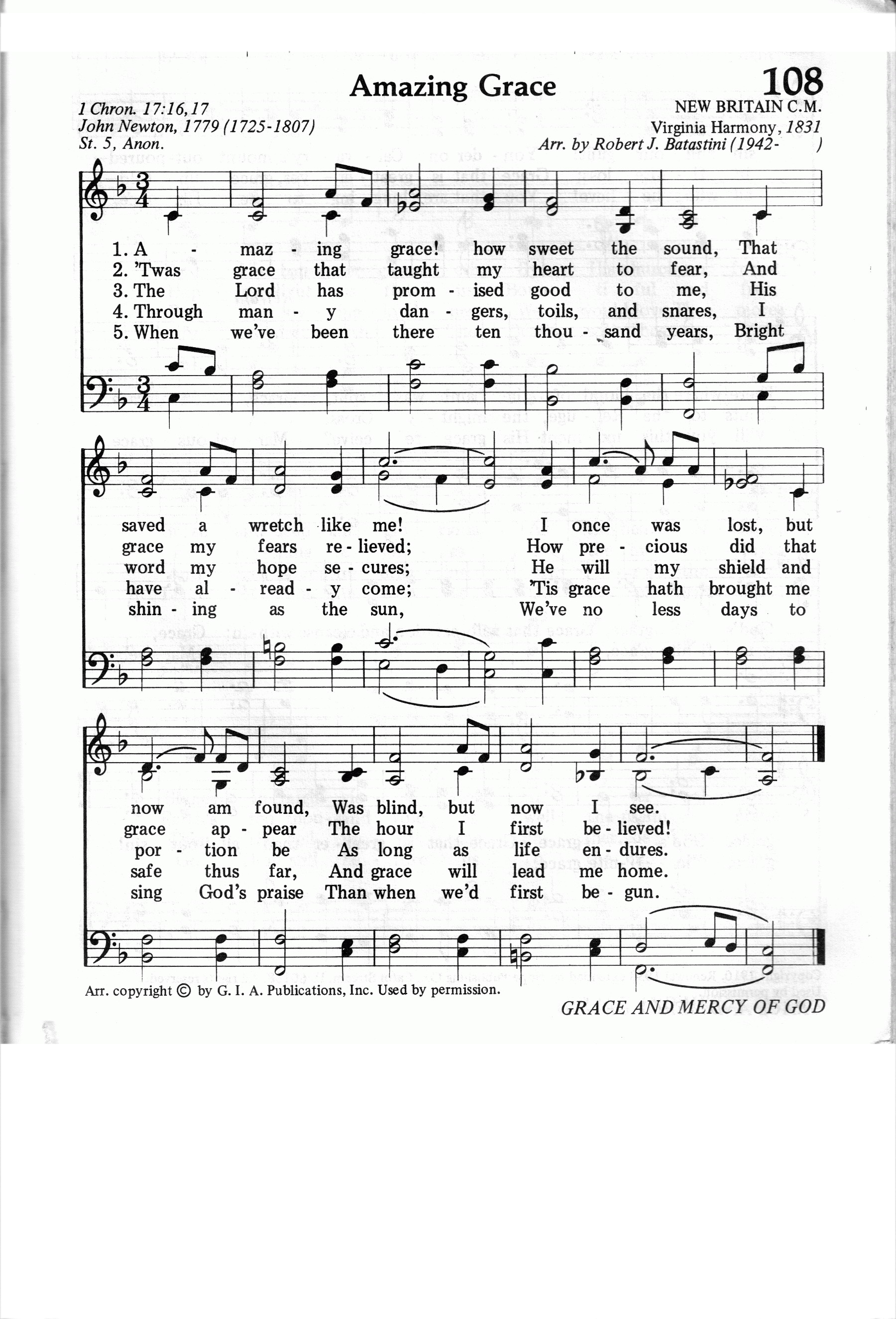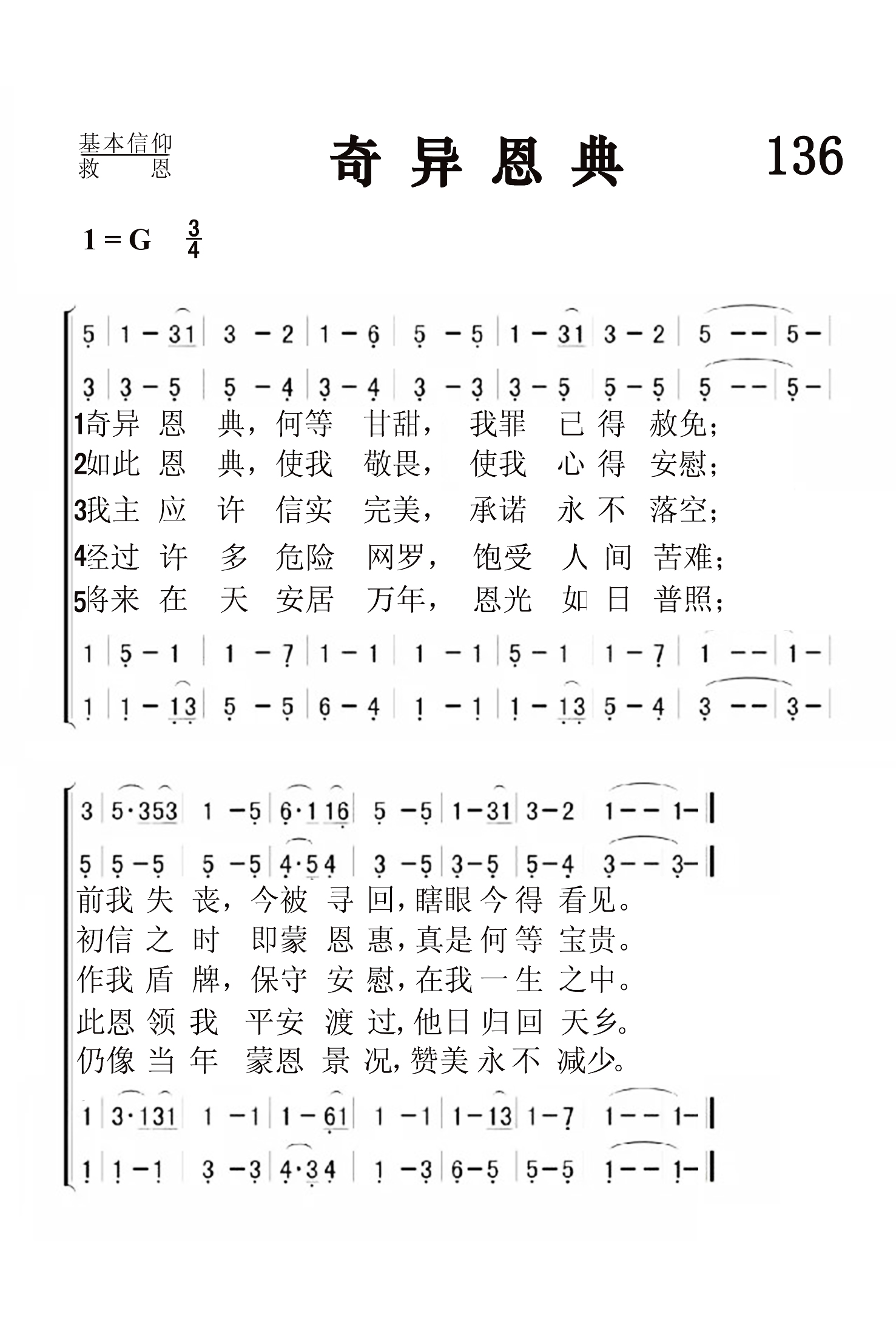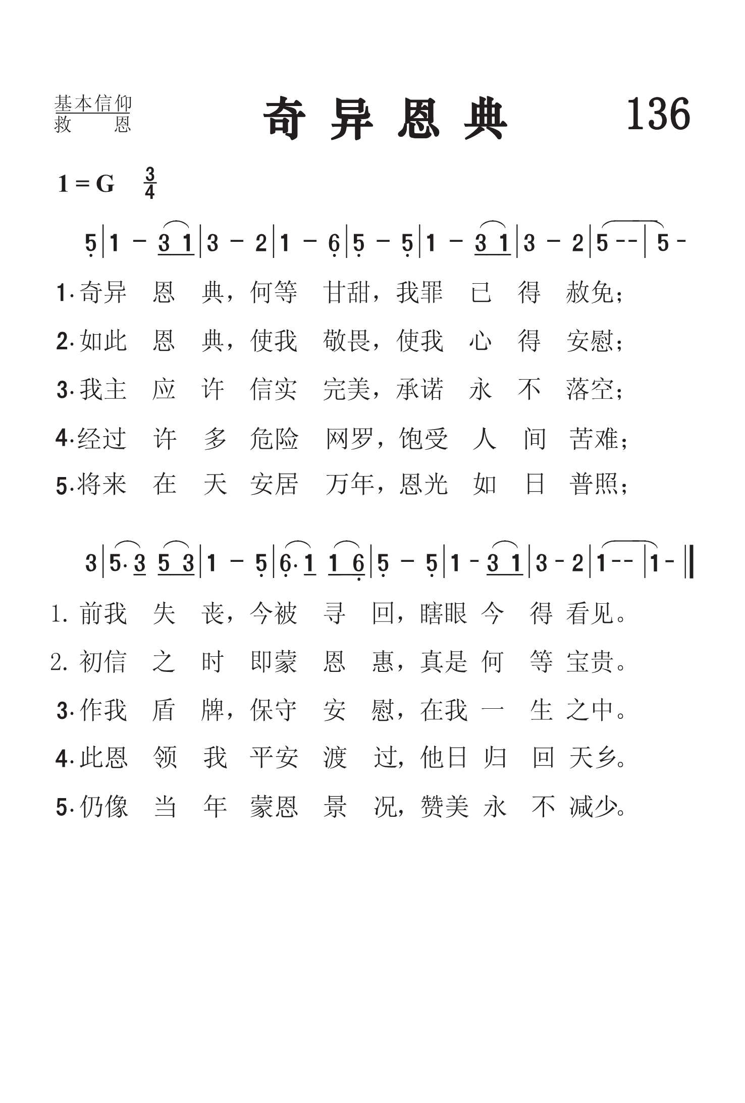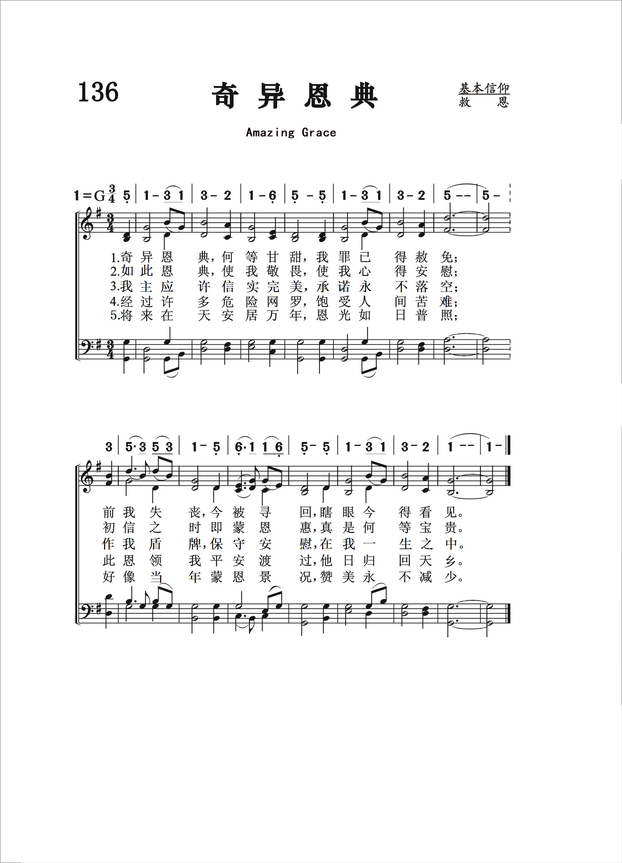 第136首 奇异恩典Amazing Grace 约翰.牛顿(John Newton,1725.7.24-1807.12.21)作词,美国早期民歌曲调,埃克塞尔(E.O.Excell, 1851,12,13-1921,6,10)改编 奇异恩典,何等甘甜,我罪已得赦免; 前我失丧,今被寻回,瞎眼今得看见。 如此恩典,使我敬畏,使我心得安慰; 初信之时,即蒙恩惠,真是何等宝贵。 经过许多危险网罗,饱受人间苦楚; 此恩领我,平安渡过,他日归回天府。 将来在天安居万年,恩光如日普照; 好像最初,蒙恩景况,赞美永不减少。 这是约翰.牛顿悔改的见证和蒙恩的体验。他深知自己曾经沉沦罪恶深渊,多亏救主伸手拯救,使他得以出死入生,进入永生的光明之中。圣灵的大能彻底改变了他的生命,使他从罪的奴仆变成了坚强的福音使者。他的这首诗歌,曾感动了千万与他一样在迷途中徘徊的人,使他们也接受了主耶稣奇妙的救恩。 约翰.牛顿 出生于基督徒家庭。在他很小的时候,他的母亲就将他抱在膝盖上教他读经唱诗,为他恳切祈祷,将他奉献与主。 但世事的变迁往往出人意料。牛顿七岁那年,他虔诚的母亲去世了。牛顿随后只读了两年书,就跟随父亲在海上漂泊。在八年时间里,牛顿过着放荡不羁的生活,成为凶恶的奴隶贩子。烟酒赌嫖,无恶不作,将母亲的上帝置之度外。 牛顿由于行为不端犯法被捕入狱,出来以后沦为奴隶,过着生不如死的生活。他父亲后带他到另一条船上工作,他二十三岁那年,在海上遭遇风暴,轮船随时都有可能倾复。在这生死攸关的急难时刻,牛顿想起了母亲的上帝,开始跪下向天父上帝祷告,省察自己的罪过,痛改前非。轮船脱离危险以后,他改变了自己的生活方式,攻读圣书,在卫斯理等人的指导之下,学习传道。 1764年,他接受按立,正式从事传扬圣道,牧养教会的工作。他忠实履行献身的誓言,一生呕心沥血克已服务。他又为反对奴隶制而大声疾呼。他还和库柏(诗人1731-1800)合作编写圣诗集。他自己写诗达二百八十余首,其中有许多脍炙人口的名篇。到了他弥留之际,他说:“我现在什么都不记得了,但我还记得两件事,第一,我是个大罪人,第二,基督是伟大的救主。” 在他的墓碑上刻着:“约翰.牛顿牧师,原是不信上帝,犯罪作恶的人,曾在非洲作奴隶之仆,但藉着救主耶稣的丰盛怜悯,得蒙保守,拯救和赦免,特派从事宣传福音的工作。” 《颂赞诗歌》第188首《安息日平安来到》(1774年),《赞美诗》(506版)36首《美哉圣名》,214首《美哉锡安》(1779年), 505版194首《罪人良友》(1779年),244首《我心祈求》(1779年)也是约翰.牛顿作词的。 曲改编者埃克塞尔的父亲是德国长老会的牧师。 埃克塞尔年轻时,在美以美会举行的奋兴会中得蒙救恩,乃致力于福音圣诗工作。他从事编辑和出版教会音乐作品,谱写了福音圣诗二千余首。他还亲自追随当时的布道家,到处以歌声宣传福音。著名歌唱家斯特宾斯在回忆录中提到他时说:“美国教会的奋兴布道事业,失去了一位杰出的领导人,歌唱家,福音诗歌的出版家。在现代福音诗歌的历史上,没有一位的成就超过他。” 《颂赞诗歌》第149首《我已蒙救赎》(兼作词),第353首《门外有一位客人》,第513首《数算恩典》和第544首《天父知道》也是埃克塞尔作曲的。