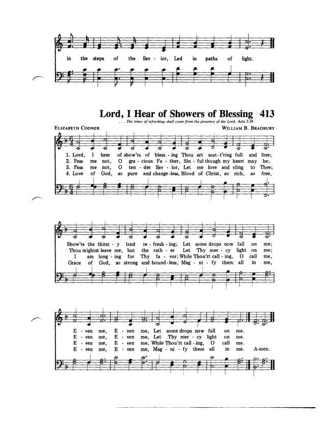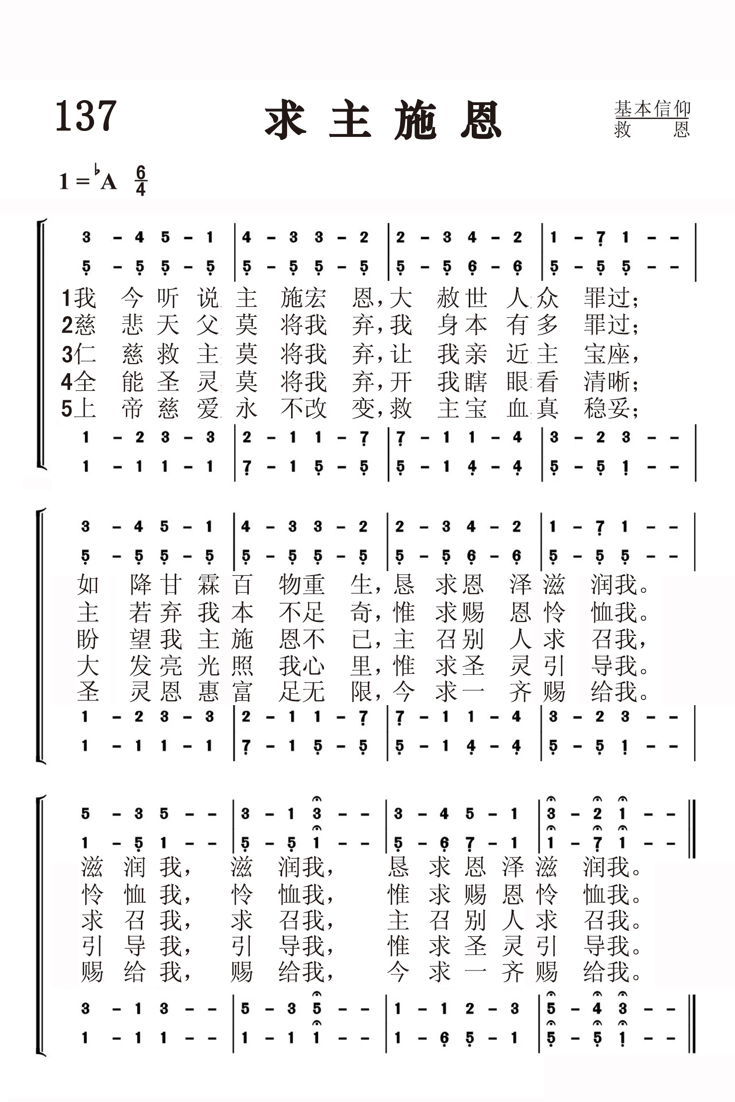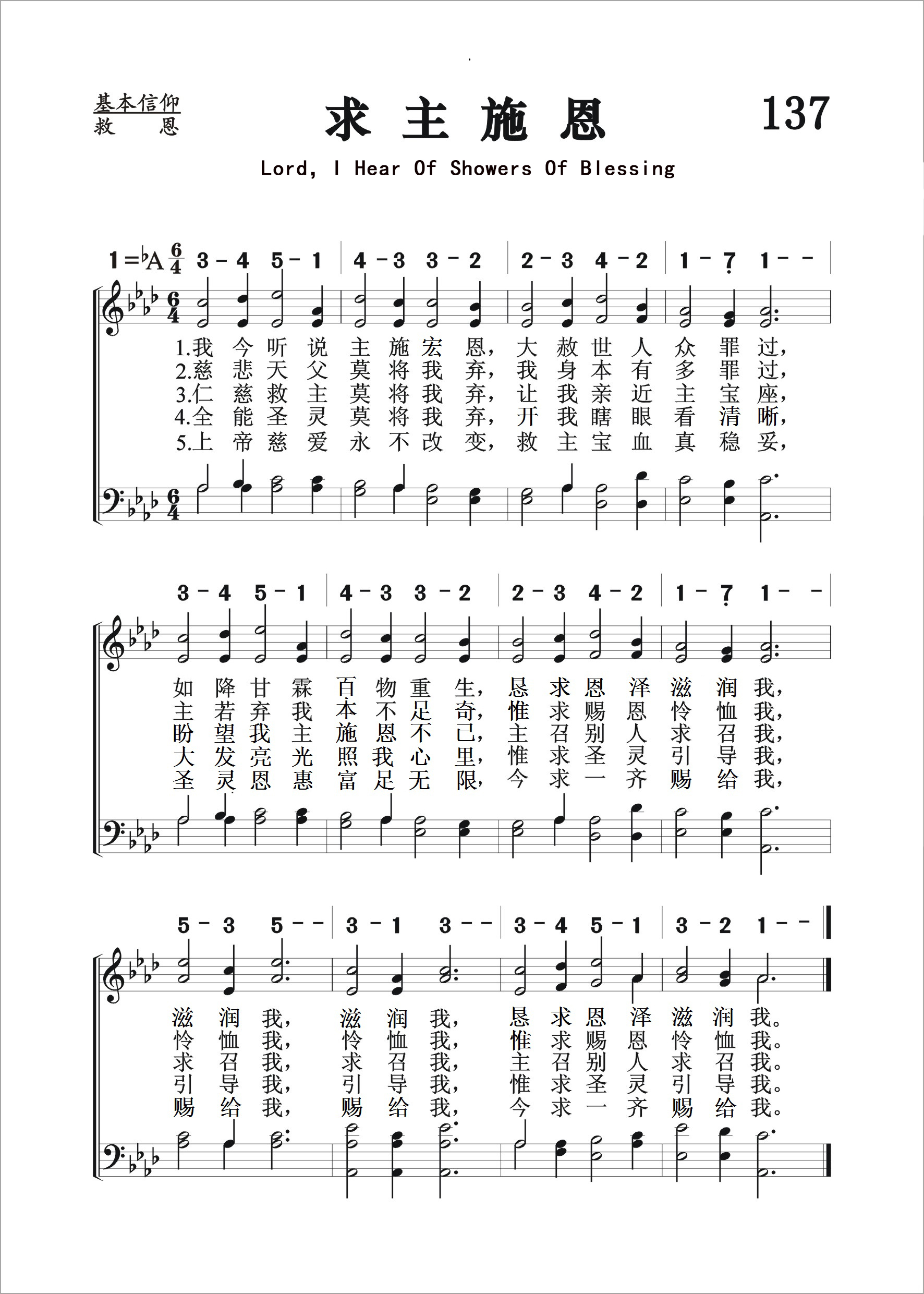 第137首求主施恩Lord,I Hear of Showers of Blessing 科德纳(Elizabeth Codner,1824-1919))作词(1860年),布雷德巴里(W.B.Bradbury,1816,10,6-1868,1,8)作曲(1862年) 我今听说主施洪恩,大赦世人众罪过; 如降甘霖万物重生,恳求恩泽滋润我。 滋润我,滋润我,恳求恩泽滋润我。 慈悲天父莫将我弃,我身本有多罪过, 主若弃我也不为异.但求赐恩怜恤我。 怜恤我,怜恤我,但求赐恩怜恤我。 仁慈救主莫将我弃,让我亲近主宝座, 盼望我主施恩不已.主召别人求召我, 求召我.求召我,主召别人求召我。 全能圣灵莫将我弃.开我瞎眼看清晰, 大发亮光照我心里,惟求圣灵引导我。 引导我.引导我,惟求圣灵引导我。 上帝慈爱永不改变.救主宝血真稳妥; 圣灵恩惠富足无限,今求一齐赐给我。 赐给我,赐给我 ,今求一齐赐给我。 词作者伊利莎白.科德纳是一位英国牧师的妻子。她热心爱主,尤其关心青年的圣工。为了勉励那班可爱的青年人,她决意创作一首诗歌,赠送给他们。 她翻开圣书,朗读《诗篇》72:6“祂必降临,象雨降在已割的草地上,如甘霖滋润田地。”她对自己说,上帝用奇妙而出人意外的方式施恩,有时祂在地震,火柱,雷轰,闪电或微小的声音中显现;有时却以细雨来滋润她虔诚之儿女的心田(参太5:6)。 她又翻到《以西结书》34:26:“我从使他们与我山的四围成为福源;我也必叫时雨落下,必有福如甘霖而降。”基督不仅是生命的粮,而且是活水之源。在这些经文的感动下,她写出了“求主恩雨滋润我”的美丽诗句。 第二,三,四段分别祈求圣父,圣子,圣灵切莫弃她,要怜悯她,呼召她,充满她。第五段以“天父永远丰富慈爱,基督十架的救赎,圣灵恩赐无限能力,今求一切显于我……”结束。 几年以后,科德纳收到了朋友转来的一封信,上面写道: “谢谢《求主施恩》这一首诗歌,我因它而悔改。我本是一沉沦的女人,邪恶的母亲;偷盗,撒谎,虐待我亲爱无辜的孩子。我没有朋友,也没有人理我。我只好独自去参加聚会,在一个星期六下午的聚会上,大家唱起了这首优美的歌‘求主恩雨滋润我’,‘既召别人也召我,’字字扣我心弦。我想,‘耶稣能收留我---即使是我。’这句话领我到他的脚前,罪的重担顿时脱落。我爱这首诗,爱听大家唱,你觉得惊奇吗?” 曲作者布雷德伯里出生于美国缅因州的约克,是浸信会信徒。他14岁以前没有接触过风琴,钢琴。1830年随家迁往波士顿,才接触这些乐器。他参加了梅森的唱诗培训班,后来与梅森在师范研究所共事。他在工作中表现了杰出的音乐天才,曾任浸信会数个会堂的管风琴师和唱诗班指挥,待遇菲薄,年薪仅25美元,但他却毫不计较。他后来到纽约教儿童唱歌,并向中学生介绍音乐,讲解乐理。1847年他获得机会去德国深造,跟名师学习,返美后专任音乐教师。他在1841-1867的二十六年时间里,平均每年出两本赞美诗集,总计59本,销量达二百万册以上。 1854年,他自己成立钢琴制造厂。1917年该厂并入纳普音乐工厂。他所编写的许多音乐书籍和圣诗曲调,已在世界各地广泛流传。 《颂赞诗歌》第146首《来就耶稣》,第185首《莫忘记安息日》,第335首《祷告良辰》,第352首《慈牧领我》(1859年),第365首《耶稣领我》,第586首《主如磐石》,第605首《耶稣爱我》,第621首《安眠主内》(1843年),《赞美诗》(505版)第10首《圣徒崇拜》,第75首《橄榄山头》(1853年),第186首《无量仁慈》,第339首《迎击恶敌》等,也是布拉德伯里作曲的。