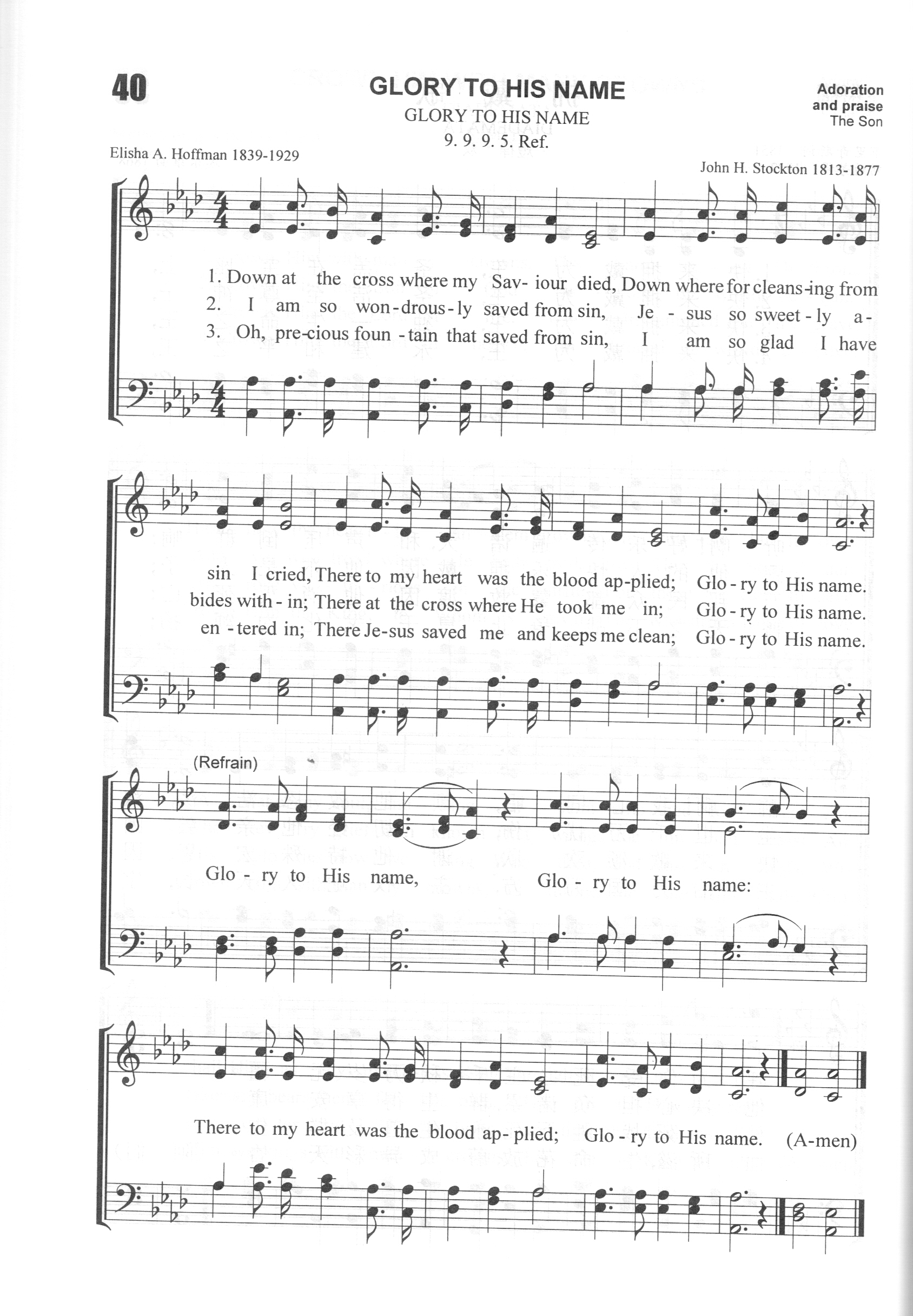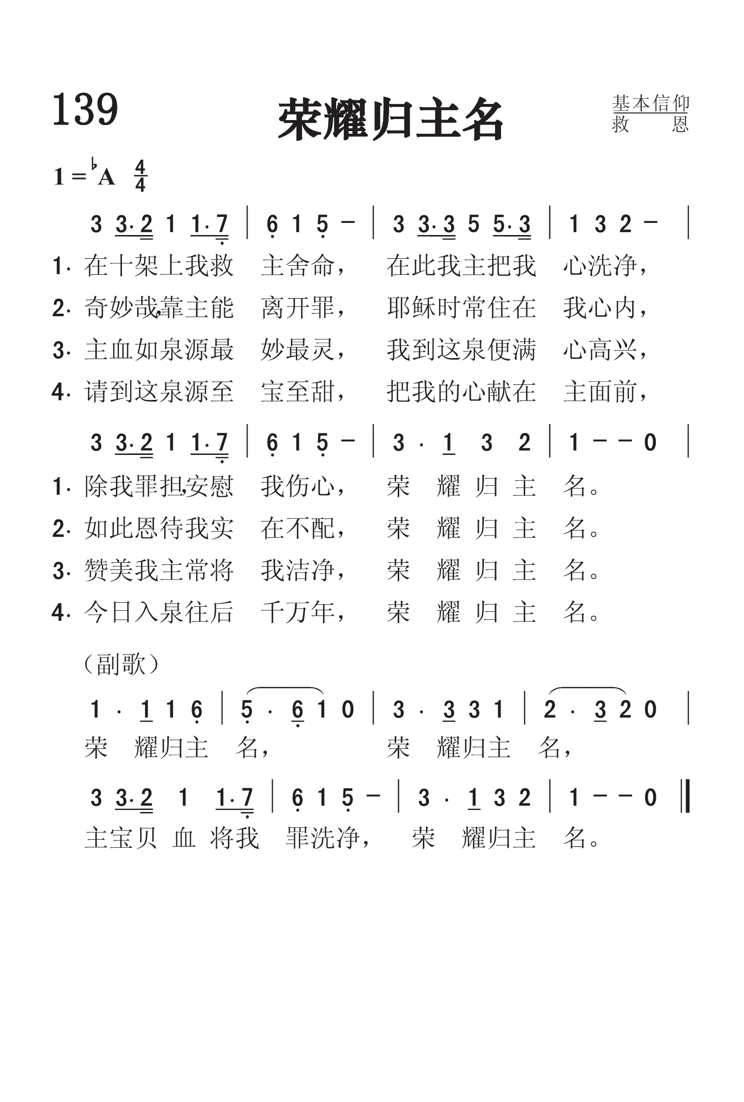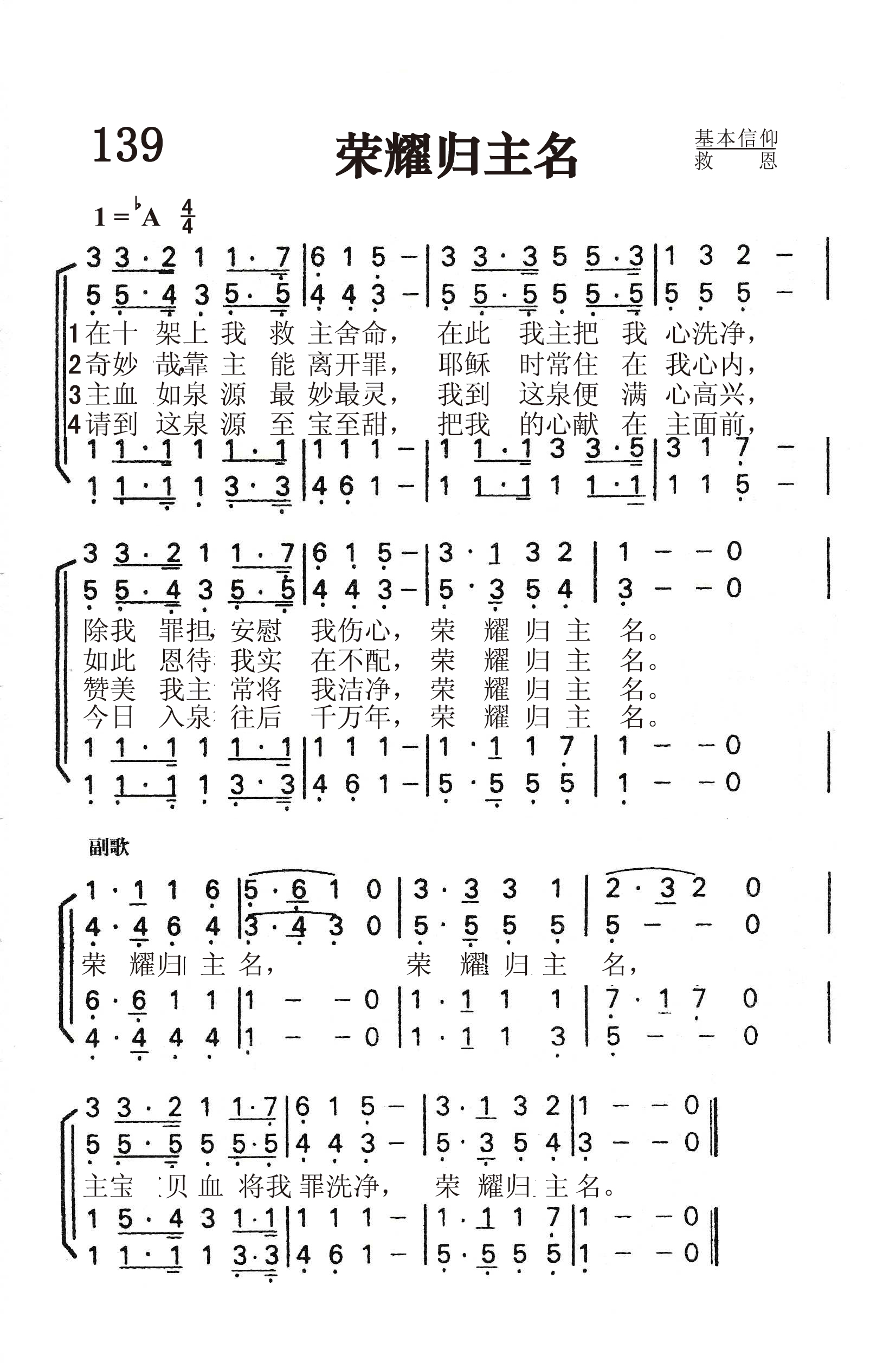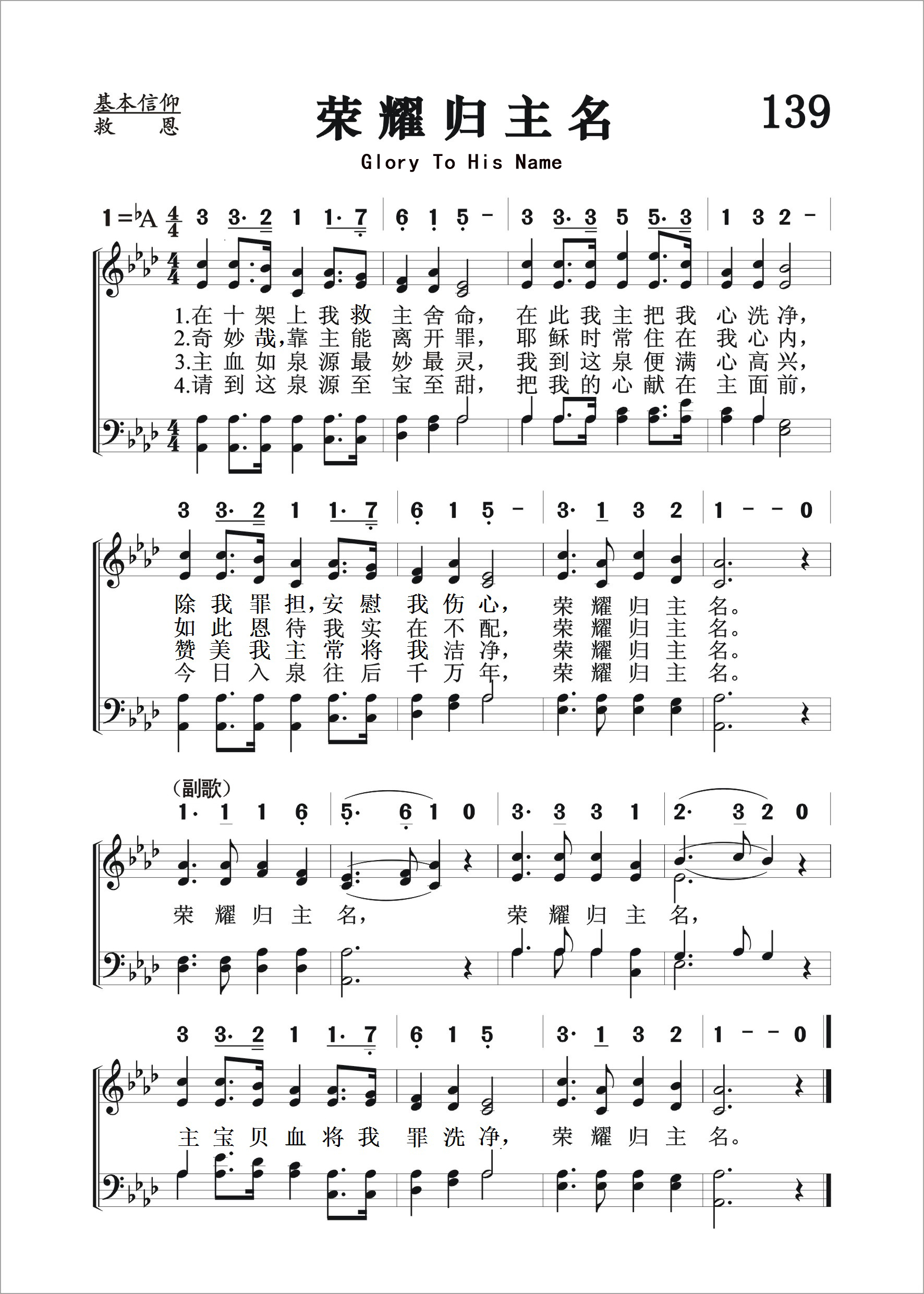 第139首 荣耀归主名Glory to His Name 霍夫曼(E.A.Hoffman 1839-1929)作词,斯托克顿(J.H.stockton,1813-1877)作曲 在十字架上我主舍命,在此我主把我心洗净, 除我罪担安慰我伤心,荣耀归主名。 奇妙哉靠主能离开罪,耶稣时常住在我心内, 如此恩待我实在不配,荣归归主名。 主血如泉源最妙最灵,我到这泉便满心高兴, 赞美我主常将我洁净,荣耀归主名。 请到这泉源至宝至甜,把我的心献在主面前, 今日入泉往后千万年,荣耀归主名。 荣耀归主名,荣耀归主名, 主宝贝血将我罪洗净,荣耀归主名。 “耶和华啊,荣耀不要归与我们,不要归与我们,要因祢的慈爱和诚实归在祢的名下”(诗115:1)。 这首在教会中广为传唱的赞美诗歌颂了十字架的奇妙功效。靠着主所流的宝血,我们的罪孽得以洗净,不再被撒但所奴役。有主耶稣亲自住在我们心中,接纳我们成为天国的永久公民。这样的宏恩大爱,是信徒所感戴不尽的。他们将永远以基督的十字架作为他们的科学与诗歌。 这首诗歌由霍夫曼作词,他是美国福音派牧师,他的文章、诗词、歌曲均颇受人们欢迎,任福音派及福音长老会牧师多年。由斯托克顿作曲,他于1846年起在卫理公会新泽西州年议会几个堂内担任牧师。生前写过若干圣诗和乐曲,对传福音的工作贡献很大。 词作者霍夫曼出生于美国宾夕法尼亚州一个福音协会牧师的家庭。他毕业于福音协会联合神学院,音乐方面全靠自修。家里每天早晚二次的礼拜都要唱一二首诗。父母都唱得很好,给他留下深刻的印象。他逐渐感觉到上帝给他一种恩赐,有能力借着诗歌来表达他的感受和见解。他十八岁就开始写诗,后来竟成多产的福音诗歌作家,总计二千多首,时常兼作词曲,并帮助编印五十种诗歌集,广受欢迎。他在福音派教会担任牧师多年,最后任密执安州一长老会牧师,经常借着诗歌向成千从未听过的人讲道,使教会兴旺发达。 曲作者斯托克顿出生于一位美国长老会信徒的家庭,1832年因参加卫理公的夏令营受了感动而信主。后于1846年在卫理公会新泽西州年议会几个堂内担任牧职。他身体多病,但仍努力写诗和作曲,对于卫理公会内圣乐的发展作出了贡献。他一生写过若干圣诗和乐曲,先后出版有圣诗集《救恩歌曲》(1847年)和《宝贵诗歌》(1875)二卷。他曾作过慕迪和桑基的助手。1877年3月25日,他参加早祷后正与朋友们谈话,突然发病,数分钟后,安然去世。