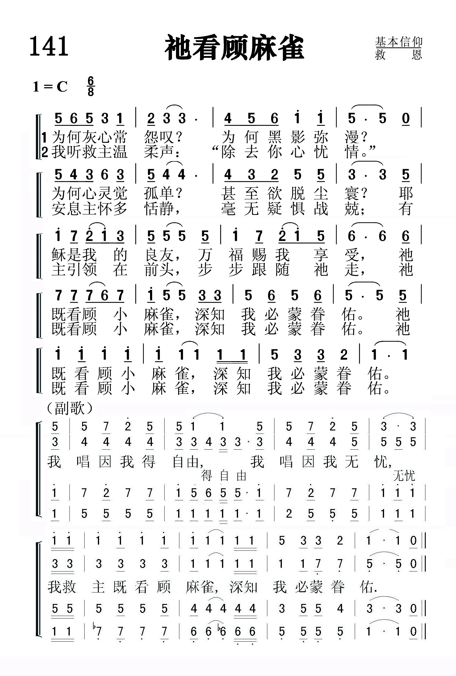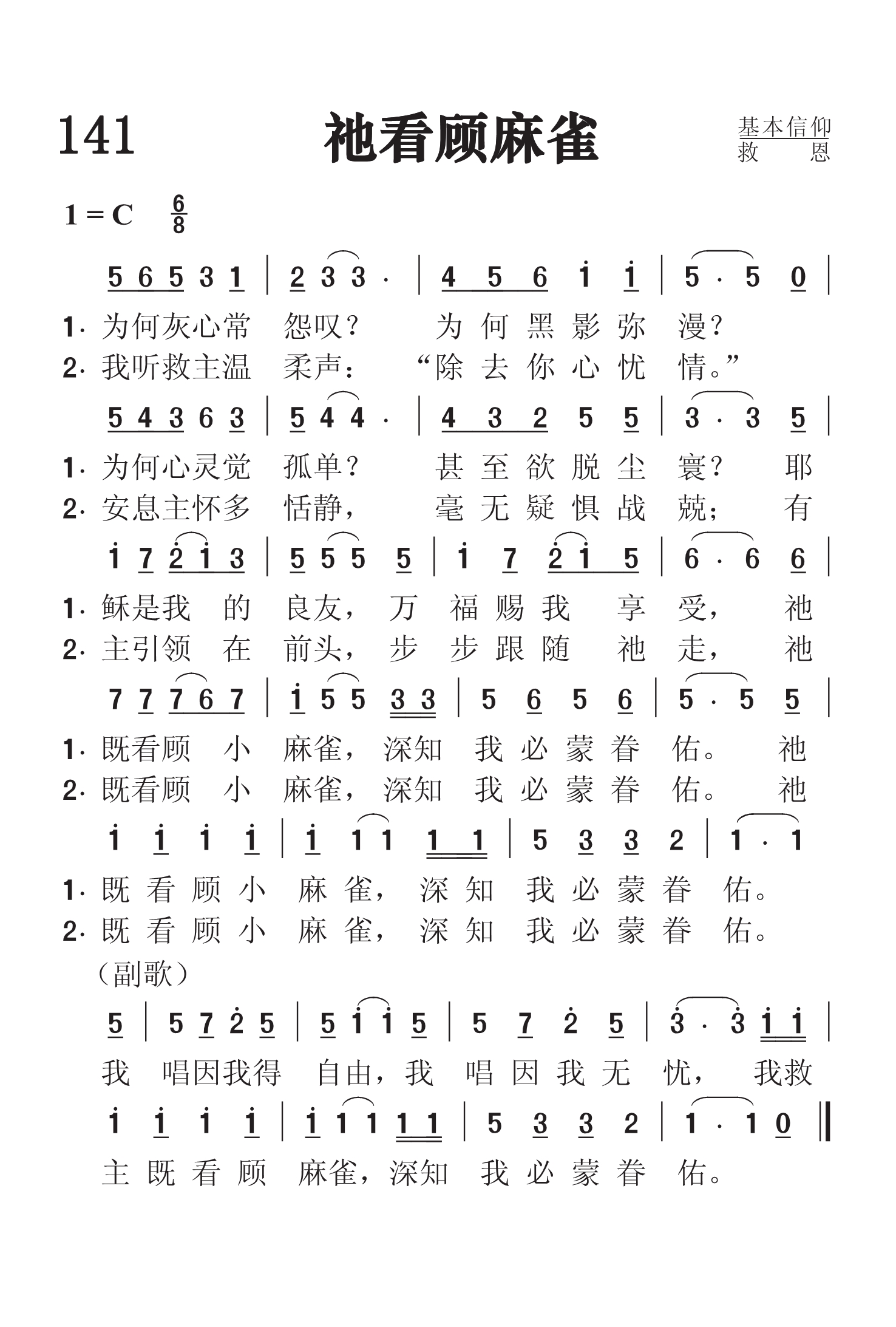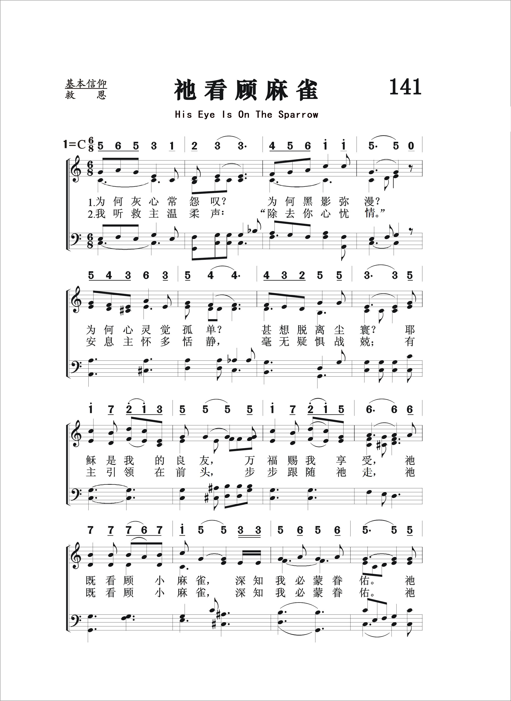 第141首祂看顾麻雀His Eye Is on the Sparrow 马丁夫人(C.D.Martin,1866.8.21-1948.3.9)作词,加布里埃尔(C.H.Gabriel,1856,8,18-1932,9,15)作曲 为何灰心常怨叹 为何黑影弥漫 为何心灵觉孤单 甚想脱离尘寰 耶稣是我的良友,万福赐我享受, 祂既看顾小麻雀,深知我必蒙眷佑。 祂既看顾小麻雀,深知找必蒙眷佑。 我听救主温柔声:“除去你心忧情。” 安息主怀多恬静,毫无疑惧战兢, 有主引领在前头,步步跟随祂走, 祂既看顾小麻雀,深知我必蒙眷佑。 祂既看顾小麻雀,深知我必蒙眷佑。 我唱因我得自由,我唱因我无忧 , 我救主既看顾麻雀,深知我必蒙眷佑。 词作者马丁夫人原是加拿大一个小镇的小学教师。与马丁牧师结婚以后,运用自己的音乐天赋,协助丈夫从事布道工作。 1904年,马丁夫人在纽约州的埃尔迈拉随她丈夫马丁牧师主领一个奋兴会。 有人告诉她,有一对曾任教会执事老年的夫妇,如今妻子得绝症卧病在床,希望她能去探访他们。她听到他们过去在教会、小区热心事奉,如今他们面临病痛死亡,不知如何去安慰鼓励他们,因此一再拖延。她又听到他们也经常为她和马丁牧师的事工代祷,最后她觉得不得不去探访。马丁夫人以为她去的是一个昏暗充满死亡气息的家。 令她出乎意外,她进入了一个漾溢着欢乐生命的屋子。 女主人躺在起居室窗旁的小床上,窗和窗帘都打开着,鲜花的芬芳随着一缕阳光潜入室内。她虽被病魔蹂躏,脸色苍白,但眼神并无怨尤之色,从她的微笑中,马丁夫人嗅到了生命。 两人在床旁交通,马丁夫人发觉她旺盛的属灵生命使她忘却了肉身的痛苦。马丁夫人问她:“你怎能在痛苦中,有这欢愉的心情?”她以颤抖的手,指向窗外。 马丁夫人环视窗外,祗见树木、草地,野花和三、二只麻雀,因此面露困惑之色。 那妇人对她说:“孩子,是麻雀。 当我想到祂看顾小麻雀也看顾我时,我就得安慰和振奋。”马丁夫人离去时,身心都受到激励。 她不再感到繁忙工作的压力,她感到从未如此地被释放过。 她去埃尔迈拉领奋兴会,自己却得到复兴。 她依据路12:6和太10:29,写下了这首《祂看顾麻雀》寄给作曲家加布里埃尔谱曲。 由于旋律的特色与一般圣诗不同,这首诗歌并不适合会众齐唱,或诗班献唱。 这是一首独唱曲。 四十年代名歌星沃特斯(Ethel Waters)时常在教会,夜总会唱福音诗歌。 有一次年轻的布道家葛理翰听到她唱此歌,深受感动,邀她为布道团献唱。 1971年,年迈的沃特斯应邀白宫演唱,尼克松总统特请她唱这首歌。一如往昔,她对这首歌的诠释,使听众流下感人肺腑的眼泪。 《颂赞诗歌》299首《克己服务》和543首《天父顾念你》也是马丁夫人作词的。 曲作者加布里埃尔是20世纪20年代美国布道团中最受欢迎的自学成才歌唱家和作曲家。他在美国南方衣阿华州农场中长大,平生爱音乐,好唱歌,自己在家里学习,在一架破旧的小风琴上弹奏。当时有一群移民时常聚集他家唱诗,而他父亲也常带领团契交通。有一次他对母亲说,他非常渴望有朝一日能作曲闻名于世,母亲回答说:“孩子,我宁愿你能作曲助人,胜过做美国的总统。”他 16岁时就自告奋勇到附近音乐学校教唱,成绩显著,不久被正式聘为教员。从此,他更努力学习,精益求精,终于成为一个有名的作曲家,业余时间还兼任旧金山一个卫理公会礼拜堂的音乐指导。1895年迁居芝加哥,继续写作、编曲。加布里埃尔的作品总计约有八千首,他曾编集三十五本不同的福音圣诗,八本主日学诗歌,七本男声重唱,六本女声合唱,十本儿童诗歌,七十多本清唱剧,及无数乐器的乐谱。