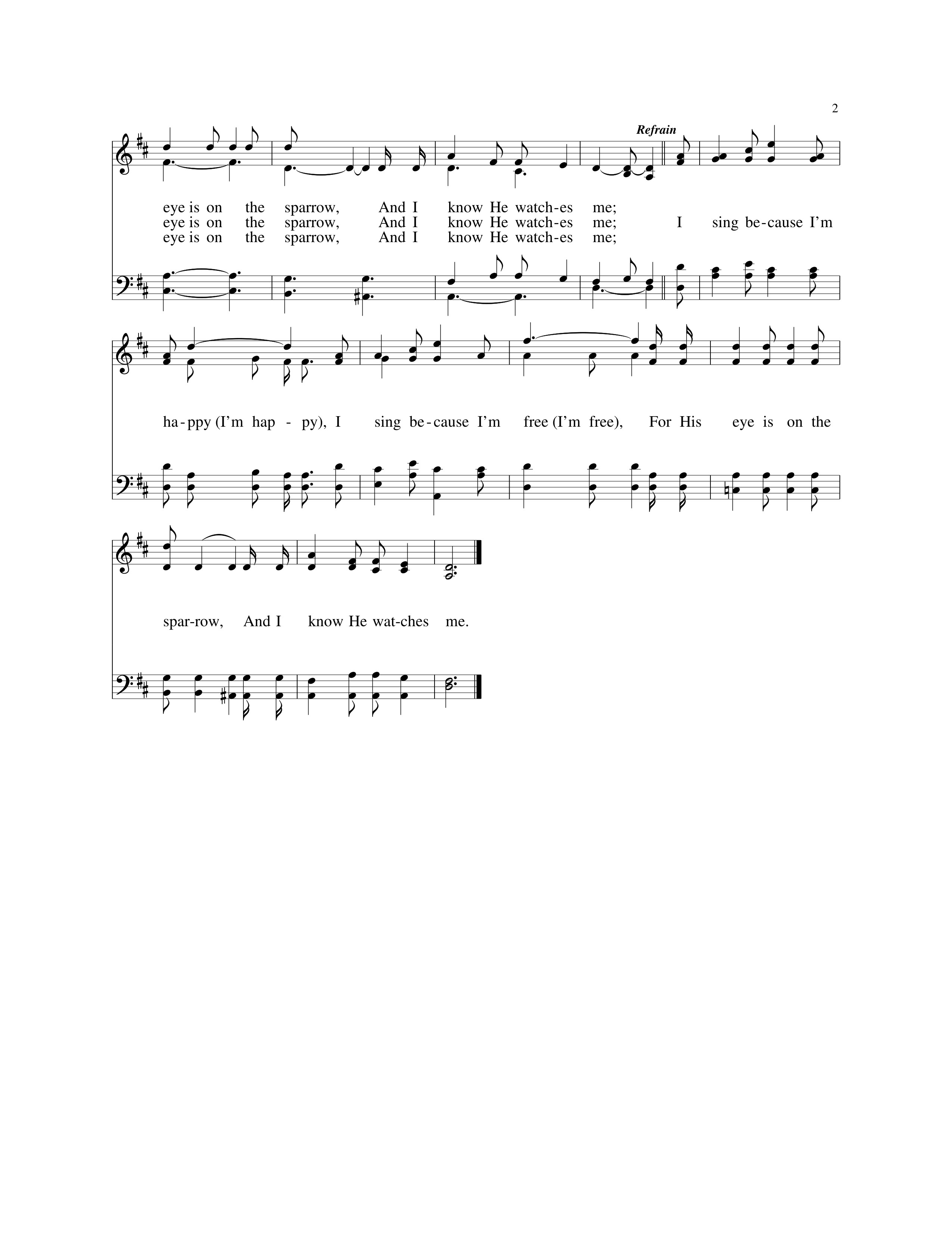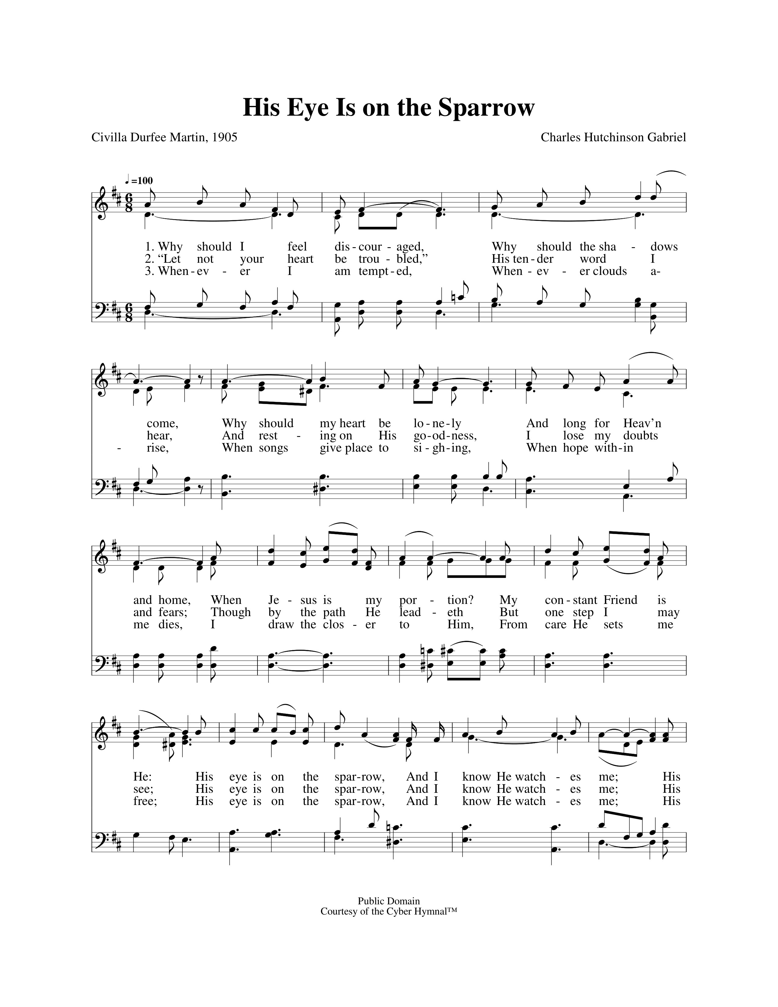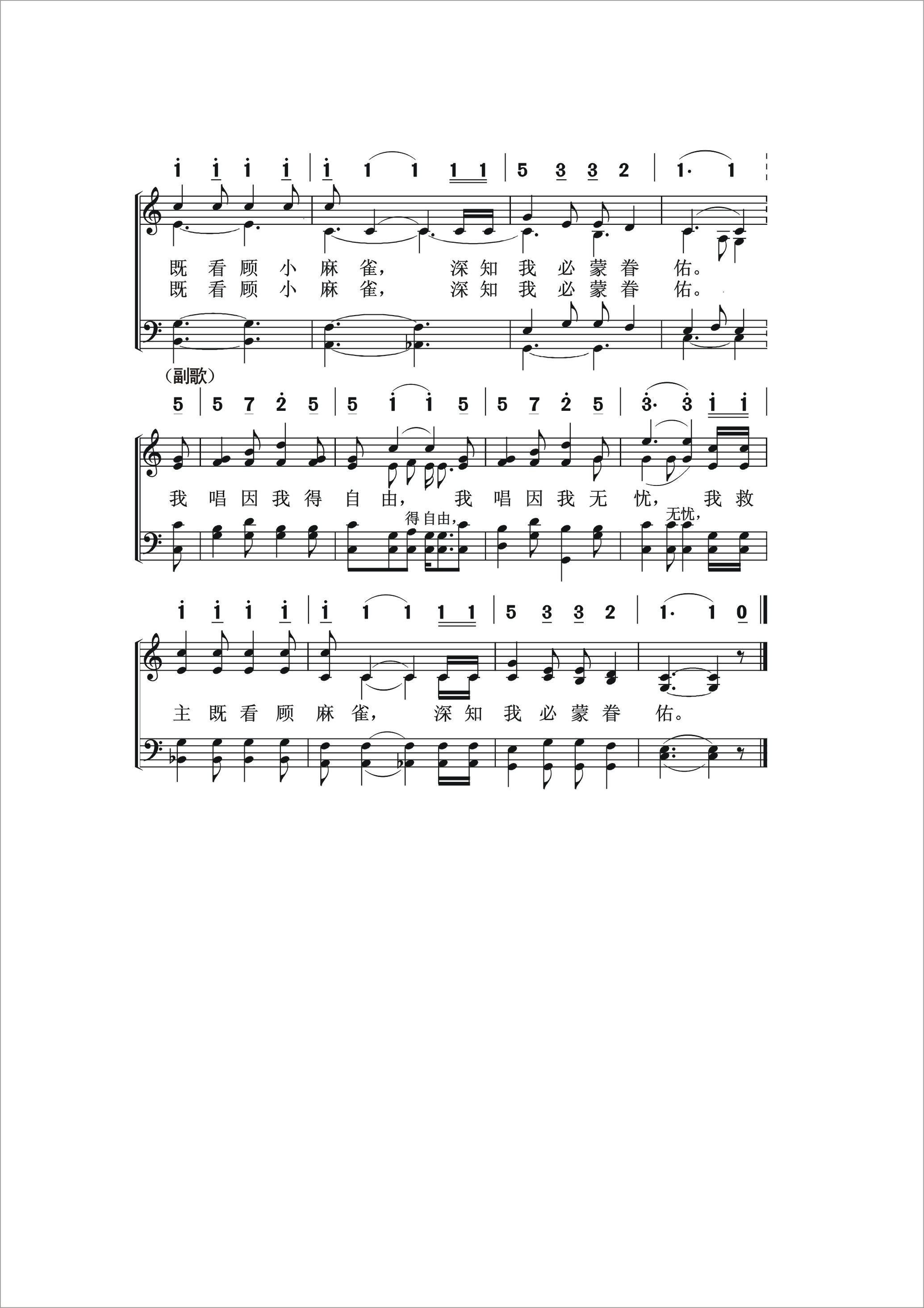 第141首祂看顾麻雀His Eye Is on the Sparrow 马丁夫人(C.D.Martin,1866.8.21-1948.3.9)作词,加布里埃尔(C.H.Gabriel,1856,8,18-1932,9,15)作曲 为何灰心常怨叹 为何黑影弥漫 为何心灵觉孤单 甚想脱离尘寰 耶稣是我的良友,万福赐我享受, 祂既看顾小麻雀,深知我必蒙眷佑。 祂既看顾小麻雀,深知找必蒙眷佑。 我听救主温柔声:“除去你心忧情。” 安息主怀多恬静,毫无疑惧战兢, 有主引领在前头,步步跟随祂走, 祂既看顾小麻雀,深知我必蒙眷佑。 祂既看顾小麻雀,深知我必蒙眷佑。 我唱因我得自由,我唱因我无忧 , 我救主既看顾麻雀,深知我必蒙眷佑。 词作者马丁夫人原是加拿大一个小镇的小学教师。与马丁牧师结婚以后,运用自己的音乐天赋,协助丈夫从事布道工作。 1904年,马丁夫人在纽约州的埃尔迈拉随她丈夫马丁牧师主领一个奋兴会。 有人告诉她,有一对曾任教会执事老年的夫妇,如今妻子得绝症卧病在床,希望她能去探访他们。她听到他们过去在教会、小区热心事奉,如今他们面临病痛死亡,不知如何去安慰鼓励他们,因此一再拖延。她又听到他们也经常为她和马丁牧师的事工代祷,最后她觉得不得不去探访。马丁夫人以为她去的是一个昏暗充满死亡气息的家。 令她出乎意外,她进入了一个漾溢着欢乐生命的屋子。 女主人躺在起居室窗旁的小床上,窗和窗帘都打开着,鲜花的芬芳随着一缕阳光潜入室内。她虽被病魔蹂躏,脸色苍白,但眼神并无怨尤之色,从她的微笑中,马丁夫人嗅到了生命。 两人在床旁交通,马丁夫人发觉她旺盛的属灵生命使她忘却了肉身的痛苦。马丁夫人问她:“你怎能在痛苦中,有这欢愉的心情?”她以颤抖的手,指向窗外。 马丁夫人环视窗外,祗见树木、草地,野花和三、二只麻雀,因此面露困惑之色。 那妇人对她说:“孩子,是麻雀。 当我想到祂看顾小麻雀也看顾我时,我就得安慰和振奋。”马丁夫人离去时,身心都受到激励。 她不再感到繁忙工作的压力,她感到从未如此地被释放过。 她去埃尔迈拉领奋兴会,自己却得到复兴。 她依据路12:6和太10:29,写下了这首《祂看顾麻雀》寄给作曲家加布里埃尔谱曲。 由于旋律的特色与一般圣诗不同,这首诗歌并不适合会众齐唱,或诗班献唱。 这是一首独唱曲。 四十年代名歌星沃特斯(Ethel Waters)时常在教会,夜总会唱福音诗歌。 有一次年轻的布道家葛理翰听到她唱此歌,深受感动,邀她为布道团献唱。 1971年,年迈的沃特斯应邀白宫演唱,尼克松总统特请她唱这首歌。一如往昔,她对这首歌的诠释,使听众流下感人肺腑的眼泪。 《颂赞诗歌》299首《克己服务》和543首《天父顾念你》也是马丁夫人作词的。 曲作者加布里埃尔是20世纪20年代美国布道团中最受欢迎的自学成才歌唱家和作曲家。他在美国南方衣阿华州农场中长大,平生爱音乐,好唱歌,自己在家里学习,在一架破旧的小风琴上弹奏。当时有一群移民时常聚集他家唱诗,而他父亲也常带领团契交通。有一次他对母亲说,他非常渴望有朝一日能作曲闻名于世,母亲回答说:“孩子,我宁愿你能作曲助人,胜过做美国的总统。”他 16岁时就自告奋勇到附近音乐学校教唱,成绩显著,不久被正式聘为教员。从此,他更努力学习,精益求精,终于成为一个有名的作曲家,业余时间还兼任旧金山一个卫理公会礼拜堂的音乐指导。1895年迁居芝加哥,继续写作、编曲。加布里埃尔的作品总计约有八千首,他曾编集三十五本不同的福音圣诗,八本主日学诗歌,七本男声重唱,六本女声合唱,十本儿童诗歌,七十多本清唱剧,及无数乐器的乐谱。