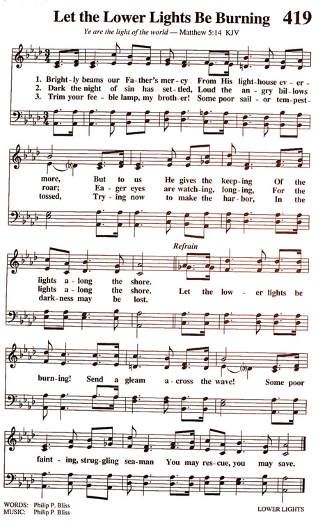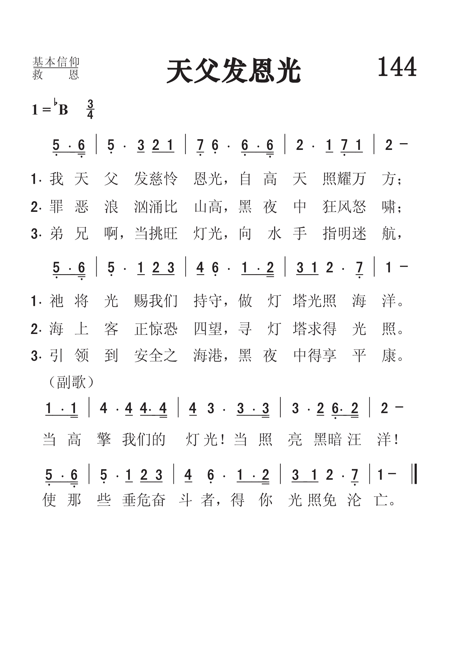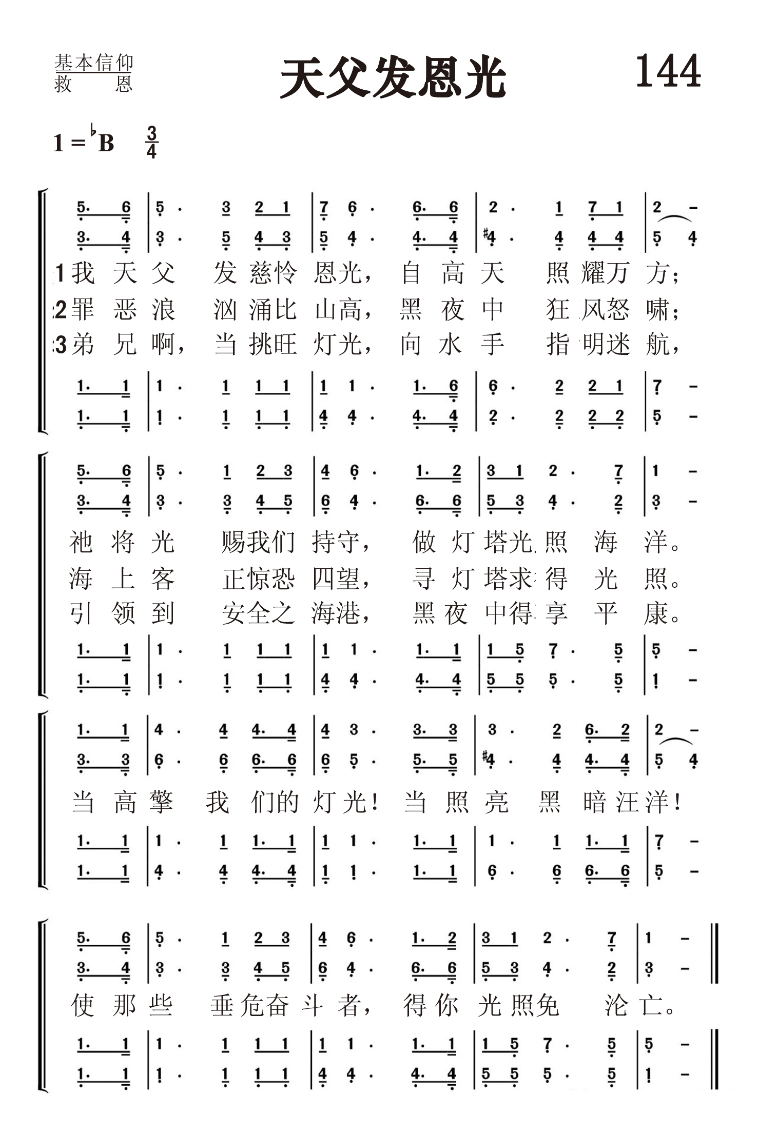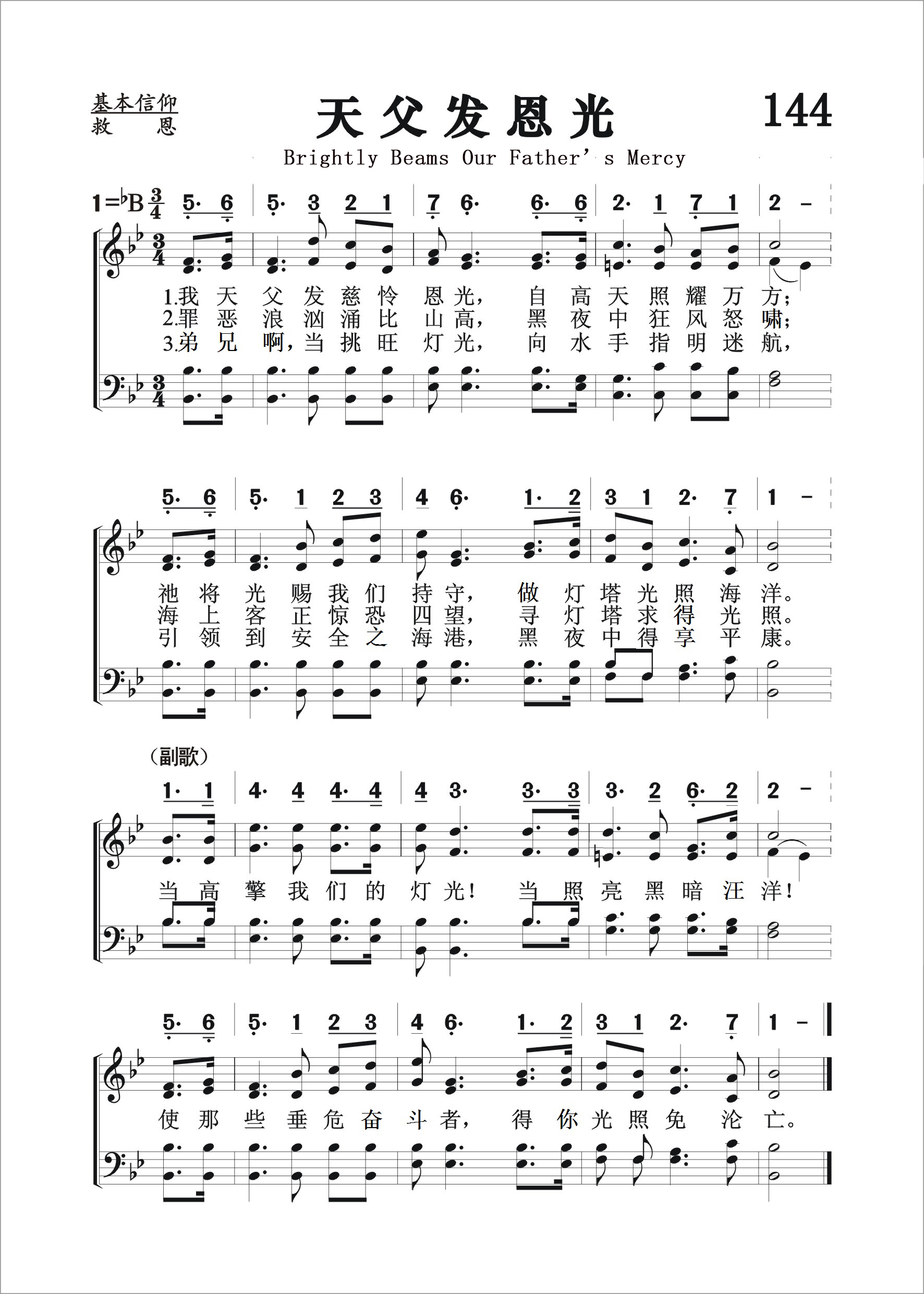 第144首天父发恩光Brightly Beams Our Father’s Mercy 布利斯(P.P.Bliss 1838,7,9-1876,12,29)作词作曲 我天父发慈怜恩光,自高天照耀万方; 祂将光赐我们持守,作灯塔光照海洋。 罪恶浪汹涌比山高.黑夜中狂风怒号: 海上客正惊恐四望,寻找灯塔求光照。 弟兄啊,当挑旺灯光,向水手指明迷航, 引领到安全的海港,在黑夜中得平安, 当高擎我们的灯光!当照亮黑暗汪洋! 使那些垂危挣扎者.得祢光照免沦亡。 本诗发表在1874年出版的《福音诗歌》中。布利斯创作这首赞美诗,是受慕迪所讲的一个故事所启发: 在一个风雨交加,不见星斗的黑夜,一艘大型客轮正驶往克里夫兰。舵手明知在这黑暗之中,只有靠着岸上低处的两盏灯和海中的灯塔相对照,才能找到进港的航道。可是那天夜晚岸上的两盏灯根本看不见。船长非常担心,可是舵手却信心十足。他觉得凭着自己的技术和经验,开到目的地是没有问题的。可是失去灯光指引的轮船最终还是触礁沉没了。慕迪的结论是:“弟兄们,海中的大灯塔由主来照料,而岸上低处的灯光则需由我们自己来剔净照看,使之永放光芒!” “当高擎我们的灯光!当照亮黑海汪洋! 使那些垂危奋斗者,得你光照免沦忘。” 圣诗音乐家布利斯原是美国卫理公会的平信徒。他出身贫寒,但生性酷爱音乐。在他10岁的时候,有一天被一所房子里传出来的风琴声所吸引,就贸然进去,要求里面的阔太太再弹一曲,竟然因他衣杉褴褛而被赶出去。但他仍不灰心,继续学习唱歌和作曲。他曾谱了一首曲子寄给音乐家鲁特,请求指点,并要求鲁特:如果认为这首歌写得还可以,就送给他一支笛子,因他实在买不起。鲁特不但送他笛子,还写了一封信,鼓励他努力自学。 布利斯先是在一所木刻镜框商店做学徒,同时业余继续自学音乐。后来,他终于考上纽约市的音乐师范大学。毕业后,他搬到芝加哥,以他的音乐天赋事奉上帝,在教会中教唱诗班,自己编曲。谱曲,并且还独唱,然后再教会众齐唱。他的嗓音优美动听,音域宽广,唱起歌来很容易感动人。布利斯写圣诗的特点是主题广泛,灵感丰富,词曲并茂,通俗易晓。一件偶然的事故,一篇动人的故事,一次讲道的感受,一节经文的启发,都可以成为他的题材。有时是主题,歌词,旋律于刹那间同时在脑海中形成。比如他听见牧师讲约翰福音第三章16节的讲题后,便写成了一首《进天门》(《颂赞诗歌》127首)的名歌。他先随惠特尔在美国各地布道,以后自编《福音诗歌》,并与桑基合编《圣诗与独唱》。他将稿费所得全部捐给了布道团。1876年因火车失事,他为营救他的夫人及孩子而遇难。他在世的时间虽然短暂,但他没有辜负上帝的托付,留下了很多福音圣诗。 1876年,布利斯夫妇在美国俄亥俄州因火车失事遇难。