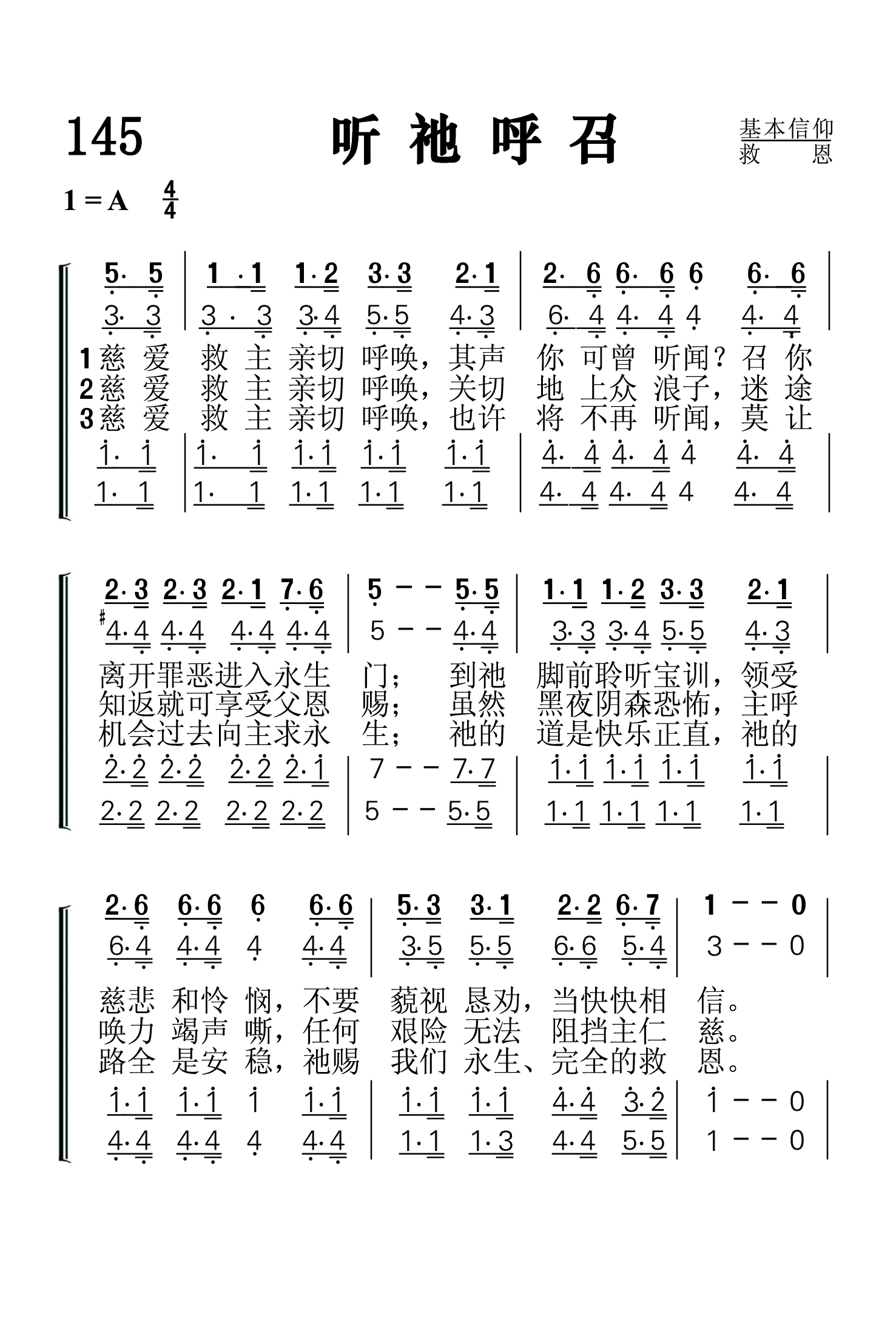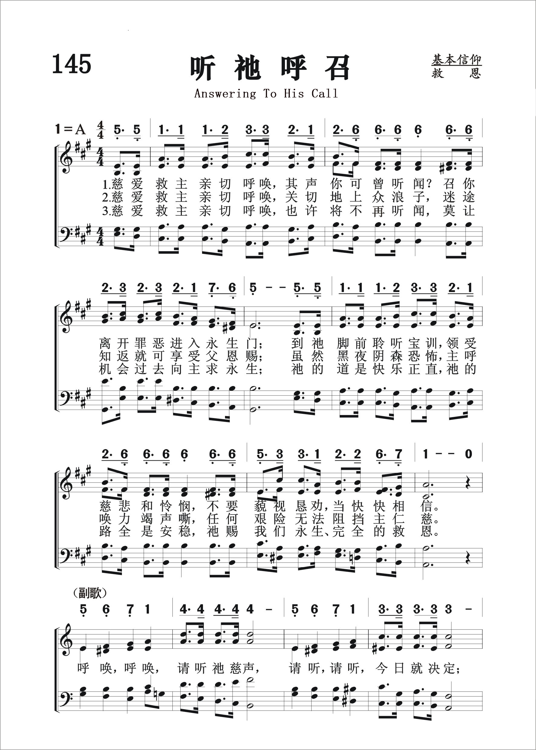第145首 听祂呼召Answeringto His Call 《颂赞圣诗》11首,英文《青年圣诗》102首 赵典仁、吴涤申合译 慈爱救主亲切呼唤,其声你可曾听闻? 召你离开罪恶进入永生门; 到祂脚前聆听宝训,领受慈悲和怜悯, 不要藐视恳劝,当快快相信。 慈爱救主亲切呼唤,关切地上众浪子, 迷途知返就可享受父恩赐; 虽然黑夜阴森恐怖,主呼唤力竭声嘶, 任何艰险无法阻挡主仁慈。 慈爱救主亲切呼唤,也许将不再听闻, 莫让机会过去向主求永生; 祂的道是快乐正直,祂的路全是安稳, 祂赐我们永生、完全的救恩。 呼唤,呼唤,请听祂慈声, 请听,请听,今日就决定; 呼唤,呼唤,主在呼唤你, 恩主慈声今日再次呼唤你。 这首诗歌向我们呈现了一位满有慈悲,耐心亲切的救主。祂一遍又一遍向徘徊歧途的浪子发出呼唤。祂愿意向我们提供永生的快乐和救恩中的平安,只要我们肯听祂呼唤,今日就回转归向祂。