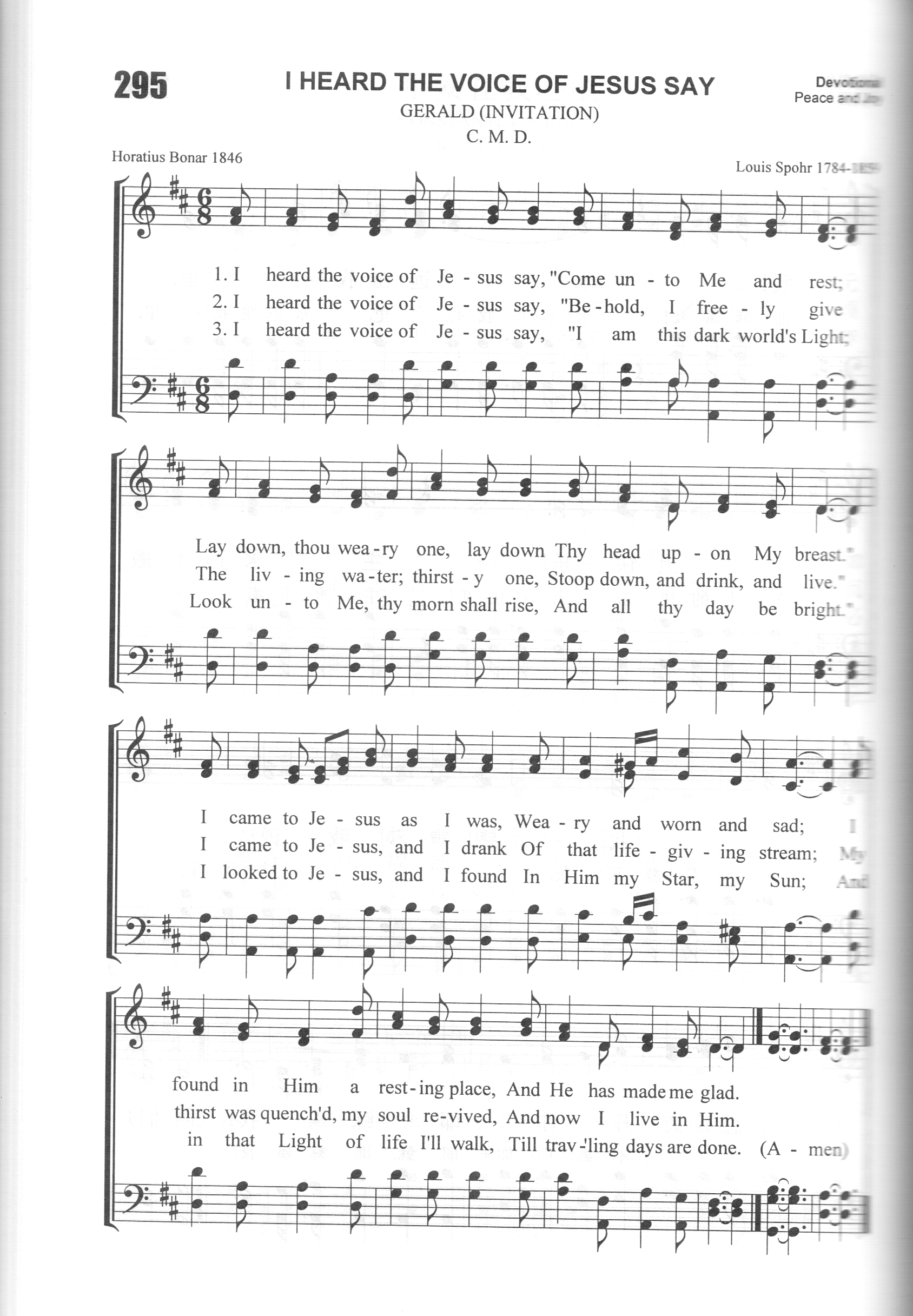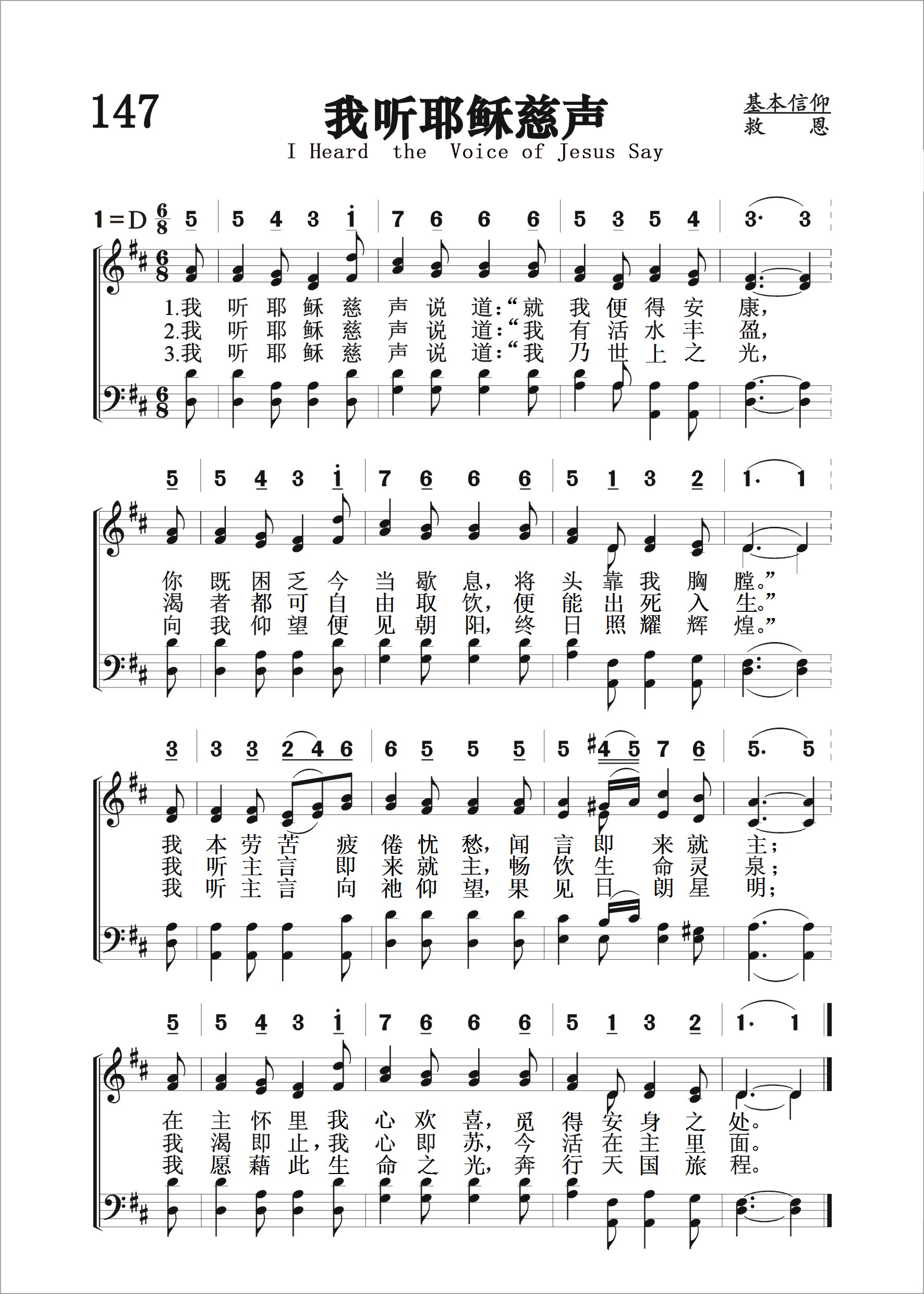 第147首我听耶稣慈声I Heard the Voice of Jesus Say 博纳(H.Bonar 1808,12,19-1889,7,31)作词(1846年);斯波尔(L.Spohr,1784,4,5-1859,10,22)作曲 我听耶稣慈声说道:“就我乃得安康, 你既困乏今当歇息,将头靠我胸膛。” 我本劳苦疲倦忧愁,闻言即来就主, 在主怀里我心欢喜,觅得安身之处。 我听耶稣慈声说道:“我有活水丰盈, 渴者都可自由取饮,便能出死入生”。 我听主言即来就主,畅饮生命灵泉, 我渴即止,我心即苏,今活在主面前。 我听耶稣慈声说道:“我乃世上之光, 向我仰望便见朝阳,终日大有辉煌。“ 我听主言向祂仰望,真是日朗星明, 我愿藉此生命之心光,奔行天国旅程。 这是博纳所写的一首动人而简洁的圣诗,原题为《加利利来的呼声》,是博纳为本堂主日学的儿童所写的。当时苏格兰教会通常所唱的韵文“诗篇”,无论词句与曲调,对于儿童来说都不易学唱。于是博纳自己动手用简洁明了的词句写成了这首赞美诗,不但得到儿童的喜爱,也得到成年人的青睐。这首诗的经文依据是“从祂丰满的恩典里,我们都领受了,而且恩上加恩”(约1:16)。最初发表在他所著的《原著及精选圣诗集》,不久就被许多赞美诗集所选用。每一段的前半部分都是耶稣的呼召,后半部分是信徒心灵的回应。第一段重述了耶稣的安慰:“凡劳苦担重担的人,可以到我这里来”(太11:28)。信徒听见慈声而欣然前来时,就找到了安身之处;第二段表达了主耶稣所说的:“我就是生命的粮,到我这里来的,必定不饿;信我的,永远不渴”(约6:35)。信徒来到主前可以“畅饮澄清活水”;第三段说明主耶稣是“暗中之光”,信徒可以“藉主生命光明,行完一世路程”。 圣诗作家博纳博士是苏格兰长老会中最著名,影响最大的圣诗作者。他于1808年12月19日出生于爱丁堡一个律师兼学者的家庭。他从小就立志献身归主,上大学时师从长老会神学大师多马.查默斯(1750-1847)。他毕业后担任苏格兰教会(即长老会,当时的苏格兰国教)的牧师。1843年追随其师以及一部分教牧人员脱离国教,另行组织自由长老会。查默斯去世后,他受聘担任爱丁堡查默斯纪念会堂首任牧师,并接任苏格兰自由长老会全国大会会长。他一生敬虔事主,努力工作,牧养羊群,素有勤祷告、勤写作、勤讲道、“三勤”牧师之称。 博纳博士以宣讲基督复临的要道见长。他于1855至1856年间漫游埃及与巴基斯坦以后,更增强了对于圣书预言的兴趣。他在报章上多次发表诗文,同时担任预言杂志的主编。他以满腔的热忱盼望基督再来,宣扬战胜死亡,荣归天家的快乐。他以自己虔诚祈祷的人生感动了周围无数的人。 他爱儿童,常常专为儿童写诗。他爱好音乐。在乌云密布的日子,他用笛声表达哀婉之情,然而顷刻间,又吹奏出快乐的旋律。他所写的诗歌,热情奔放,活泼生动,不事修饰,蕴含着不可压抑的内在力量,。尤其是死亡寒流袭来之际,他的诗更象灿烂辉煌的灯光,穿越黑暗,照亮前程。 他于1889年逝世时,虽遇狂风暴雨,前来送行的仍人山人海。他们痛惜教会失去了一个柱石,同时怀念他所写下的不朽诗章。 曲调是德国著名音乐家斯波尔所写的。斯波尔是著名的小提琴家,作曲家和指挥家。自幼就显示了音乐天才,5岁就能作曲,以后跟名师学习,青出于蓝而胜于蓝,但为人刚直,不为当局欢迎。他晚年不幸断臂,不能再指挥乐队,但继续作曲,取得很大的成就。他偏爱半音阶的和谐进行法与变调。本曲调名《邀请(INVITATION,GERALD)》,选自他所著的歌剧《耶稣的最后时刻》中的唱段,旋律优美,悦耳动听,表达了主耶稣柔声呼召的神韵。