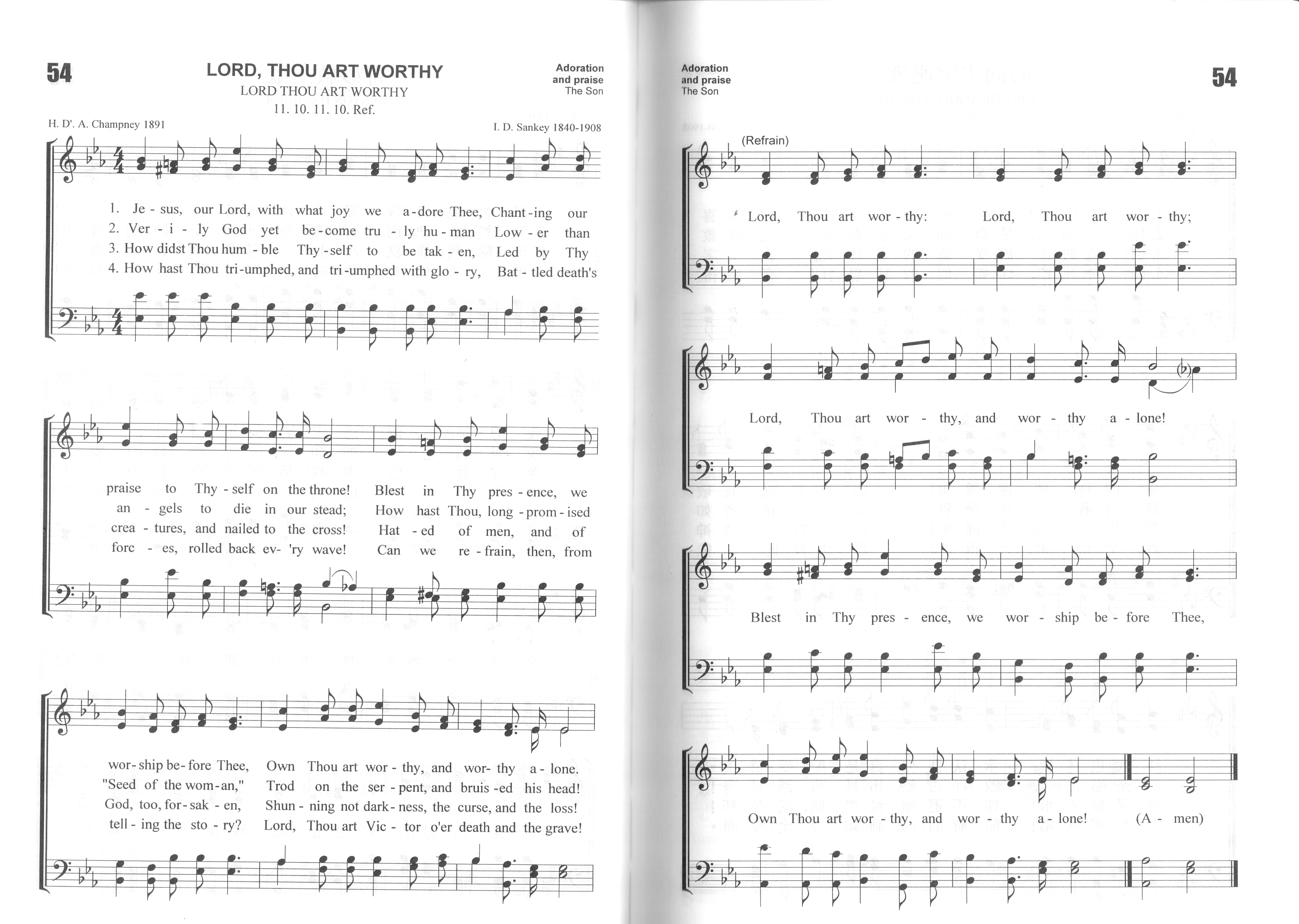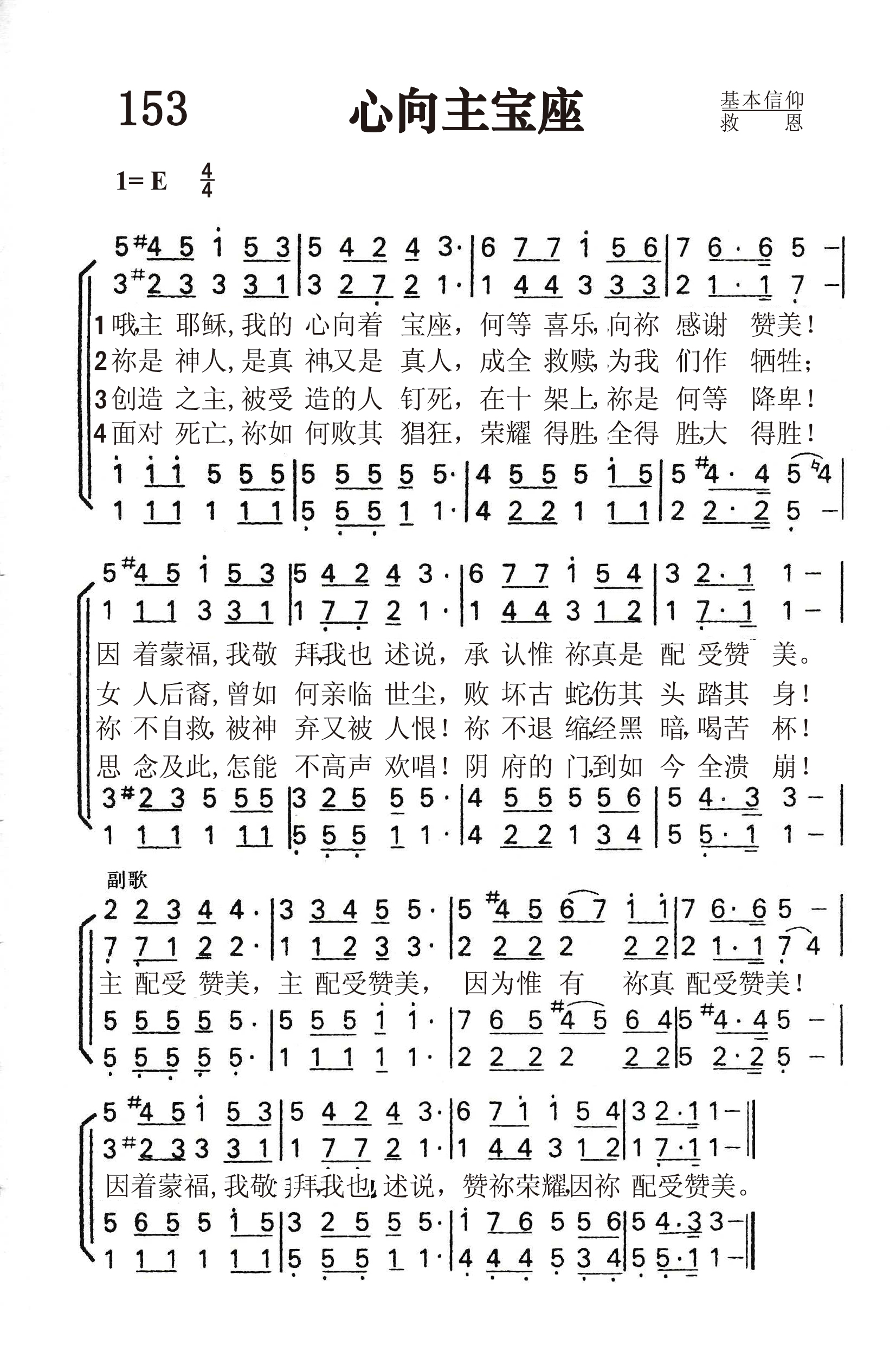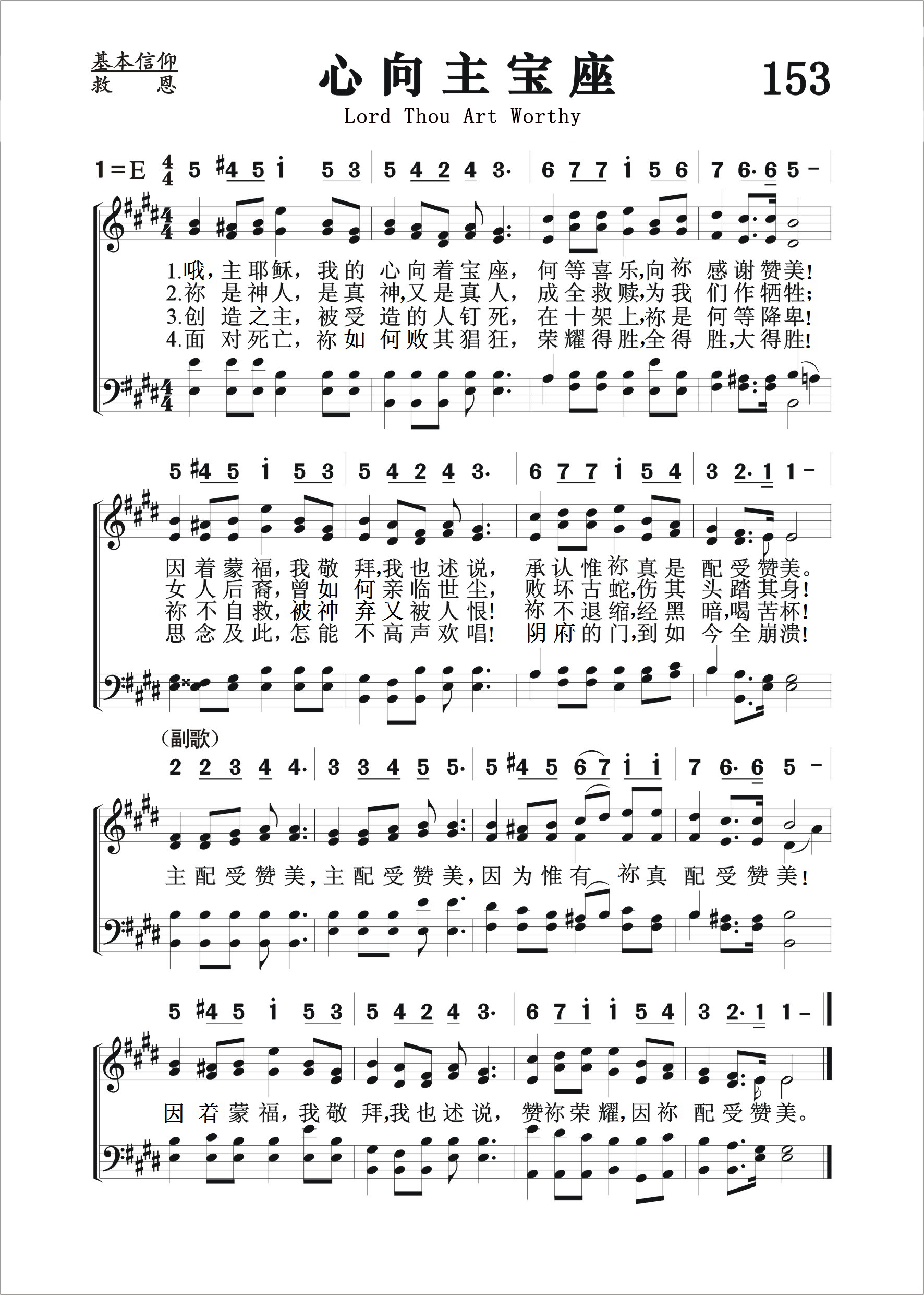 第153首 心向主宝座Lord Thou Art Worthy 香普尼(H.D’Arcy Champney,1854-1942)作词(1891年),桑基(Ira D.Sankey,1840-1908)作曲 哦,主耶稣!我的心向着宝座,何等喜乐,向你感谢赞美! 因着蒙福,我敬拜,我也述说,承认惟你真是配受赞美。” 祢是神人.是真神又是真人,成全救赎为我们作牺牲; 女人后裔.曾这样亲临世尘.败坏古蛇,伤其头踏其身! 创造之主.被受造的人钉死.在十架上,祢是何等降卑! 祢不自救,被神弃有被人恨,祢不退缩,经黑暗喝苦杯! 面对死亡.祢如何败其猖狂,荣耀得胜,全得胜,大得胜, 思念及此.怎能不高声欢唱,阴府的门,到如今全溃崩! 主配受赞美!主配受赞美!因为惟有祢真配受赞美! 何等蒙福.我敬拜,我也述说.赞祢荣耀,因祢配受赞美。 这首优美的诗歌表达了蒙恩的信徒对上帝宝座的向往。救主所成就的伟大救赎,祂在十字架上所流的鲜血,所受的苦刑,祂与魔鬼与死亡的搏斗中所取得的胜利,使祂成了最配接受崇拜和赞美的对象。在圣徒的歌颂声中,阴间的权势将要崩溃,永生的国度将要来到。 词作者香普尼出生于英国约克郡,曾就读于剑桥桥圣体学院,被按立为英国国教牧师。后来他离开国教,加入普里茅斯兄弟会。1901年,他迁往德文郡,后被列在退休牧师和学校校长的名单之中。 曲作者桑基生于美国宾夕法尼亚州,自幼参加教会活动。17岁时,他的父亲说:“我看这孩子将来除了每天在腋下夹着一本赞美诗到处歌唱之外,不会找别的工作。”的确,他经常在教会的主日学中教唱赞美诗,后来果然成为一位世界著名的福音圣诗歌唱家。他曾担任宾夕法尼亚州青年会的总干事。为建造青年会会址,他募集了4万美元。后来他与慕迪(Moody)同工,在布道会上教唱福音诗歌,也曾编辑并创作过许多首赞美诗。他曾经将他的作品编辑好,准备出版,但一次失火将他的原稿烧毁。1906年他眼睛失明后,还出版了一本《我的生平及福音赞美诗的故事》。在书中说:“我不是一个音乐家,也不是一个歌唱家,我从来没有学过声乐,也没有受过艺术教育,但我对所唱诗歌的每一句和每一字都深有体验。我每唱一首诗都必须把它唱到每一个听众的心里。我常感到好的旋律易找,但好的歌词却不易找。” 桑基一生创作了几十首福音赞美诗,其中三十首至今仍在教会的聚会中传唱。