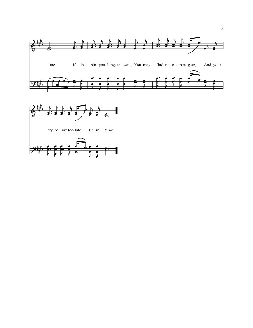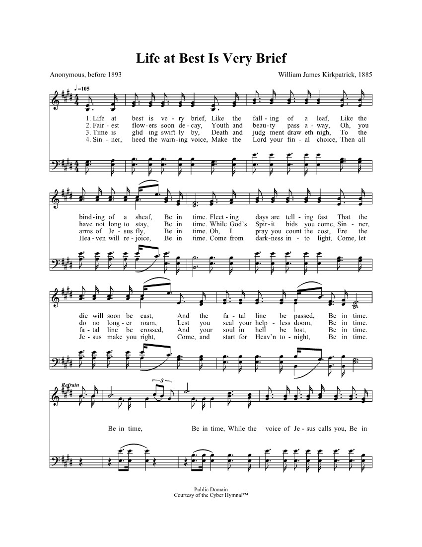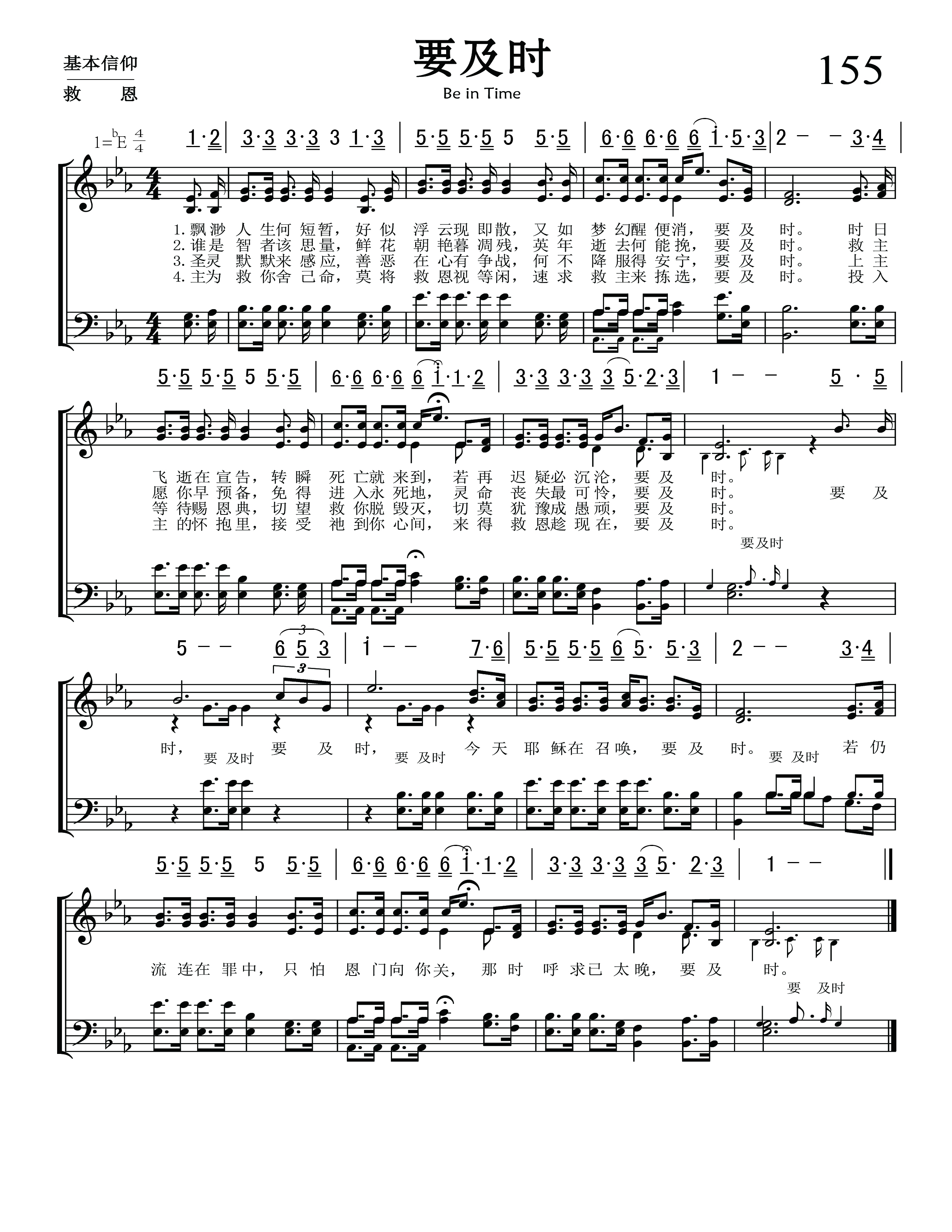 第155首 要及时Be in Time 词作者不详,柯克帕特里克(W.J.Kirkpatrick,1838,2,27-1921,9,20)作曲 飘渺人生何短暂,好似浮云现即散, 又如梦幻醒便消,要及时。 时日飞逝在宣告,转瞬死亡就来到, 若再迟疑必沉沦,要及时。 谁是智者该思量,鲜花朝艳暮凋残, 英年逝去何能挽,要及时。 救主愿你早预备,免得进入永死地, 灵命丧失最可怜,要及时。 圣灵默默来感应.善恶在心有争战. 何不降服得安宁, 要及时。 上主等待赐恩典,切望救你脱毁灭, 切莫犹豫成愚顽,要及时。 主为救你舍己命,莫将救恩视等闲, 速求救主来拣选,要及时。 投入主的怀抱里,接受祂到你心间, 来得救恩趁现在,要及时。 要及时,不等待, 今天耶稣在召唤。要及时。 若仍流连在罪中,只怕恩门向你关, 莫待呼求时已晚,要及时。 曲作者柯克帕特里克是美国音乐出版家,宗教音乐作曲家。他出生于爱尔兰,自幼跟他父亲学音乐,以后受教于几个名师,青年时移居美国。南北战争时他参军,任军乐队吹笛手。1862年至1872年在美国费城做家具商,并在美以美会担任义工,曾任美国费城美以美会唱诗班指挥。同时他还作曲。他在1859年21岁时即开始编辑出版赞美诗工作,以后与斯托克顿.斯威尼合编出版约一百多部宗教音乐集和书刊。他谱写了不少信徒所喜爱的福音歌曲。