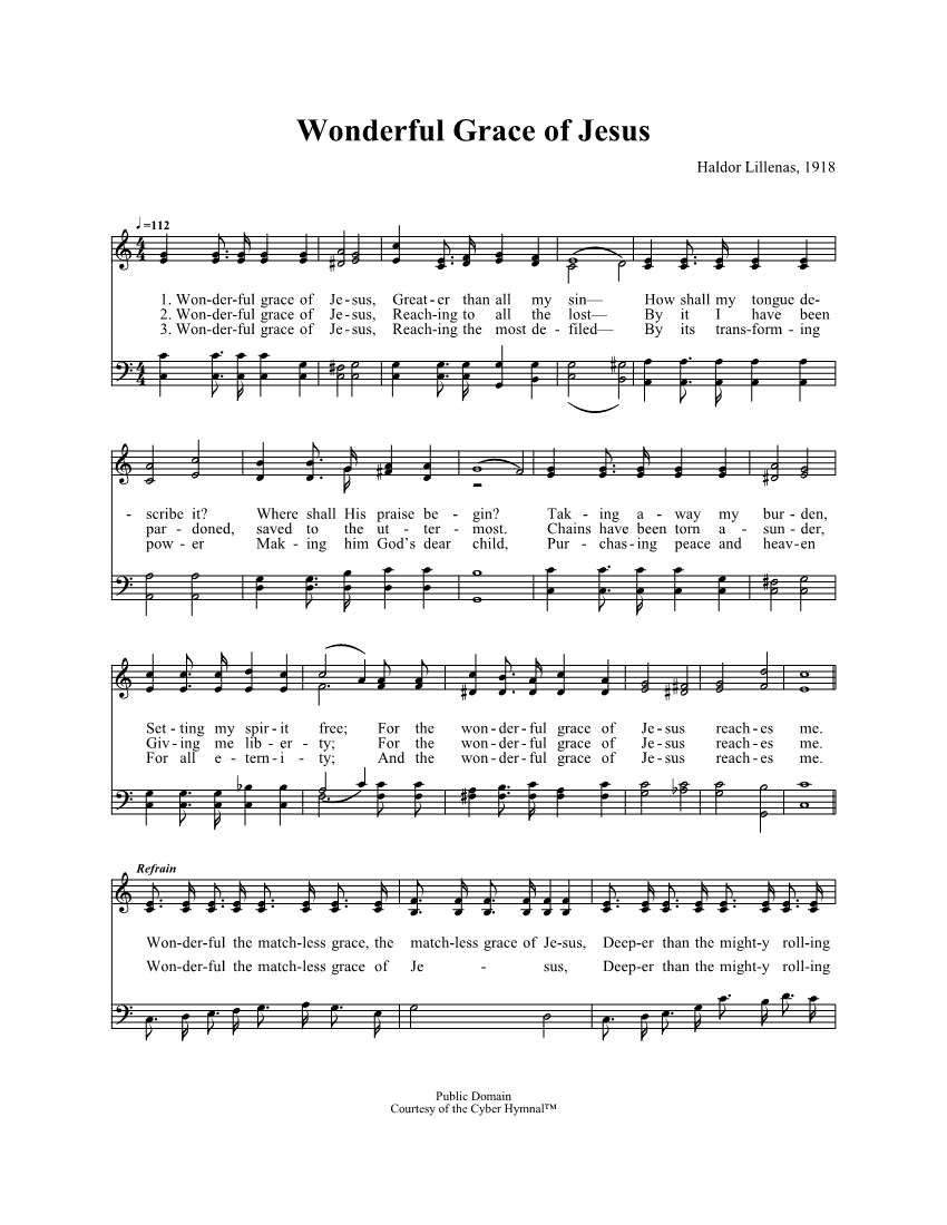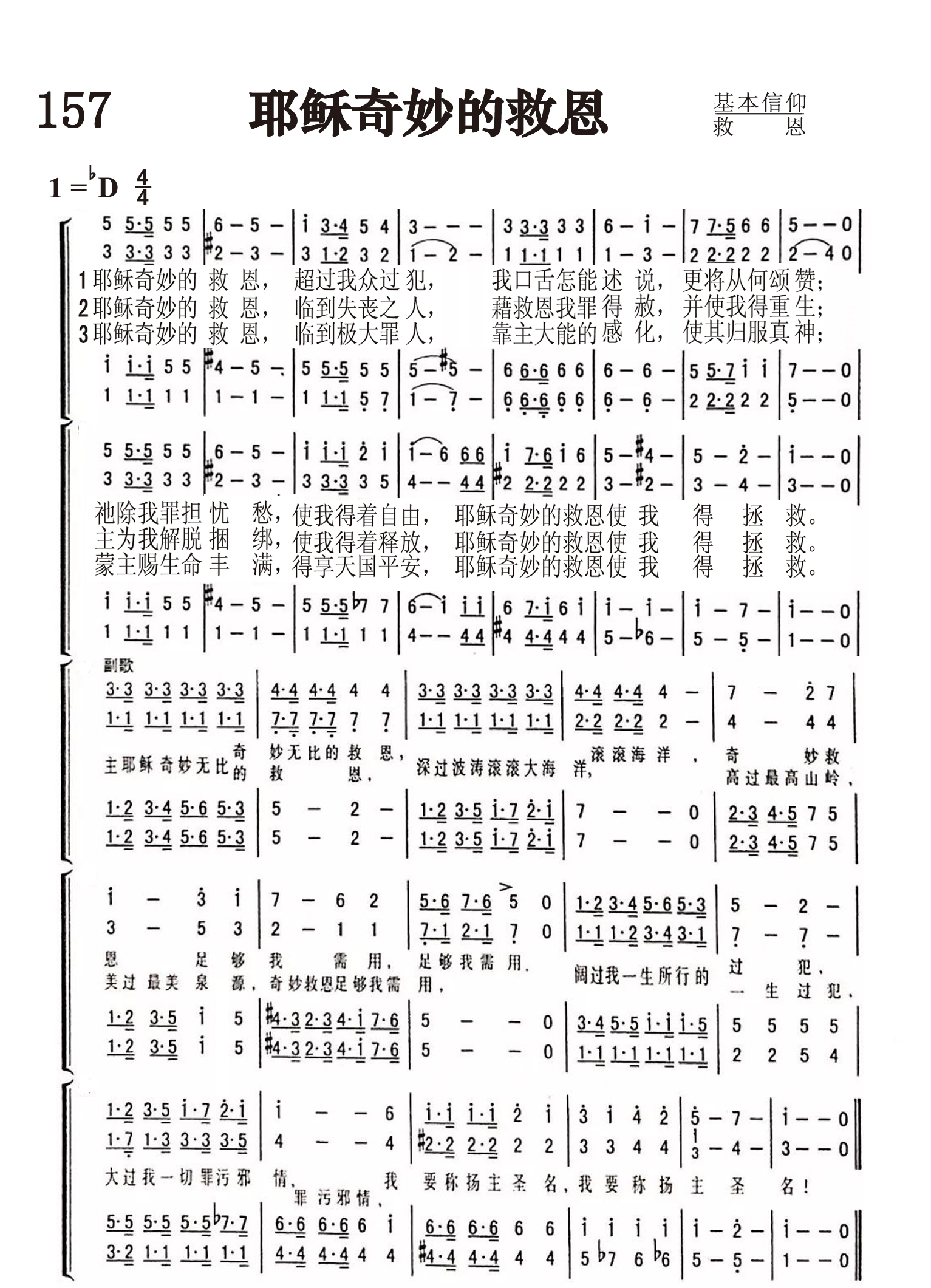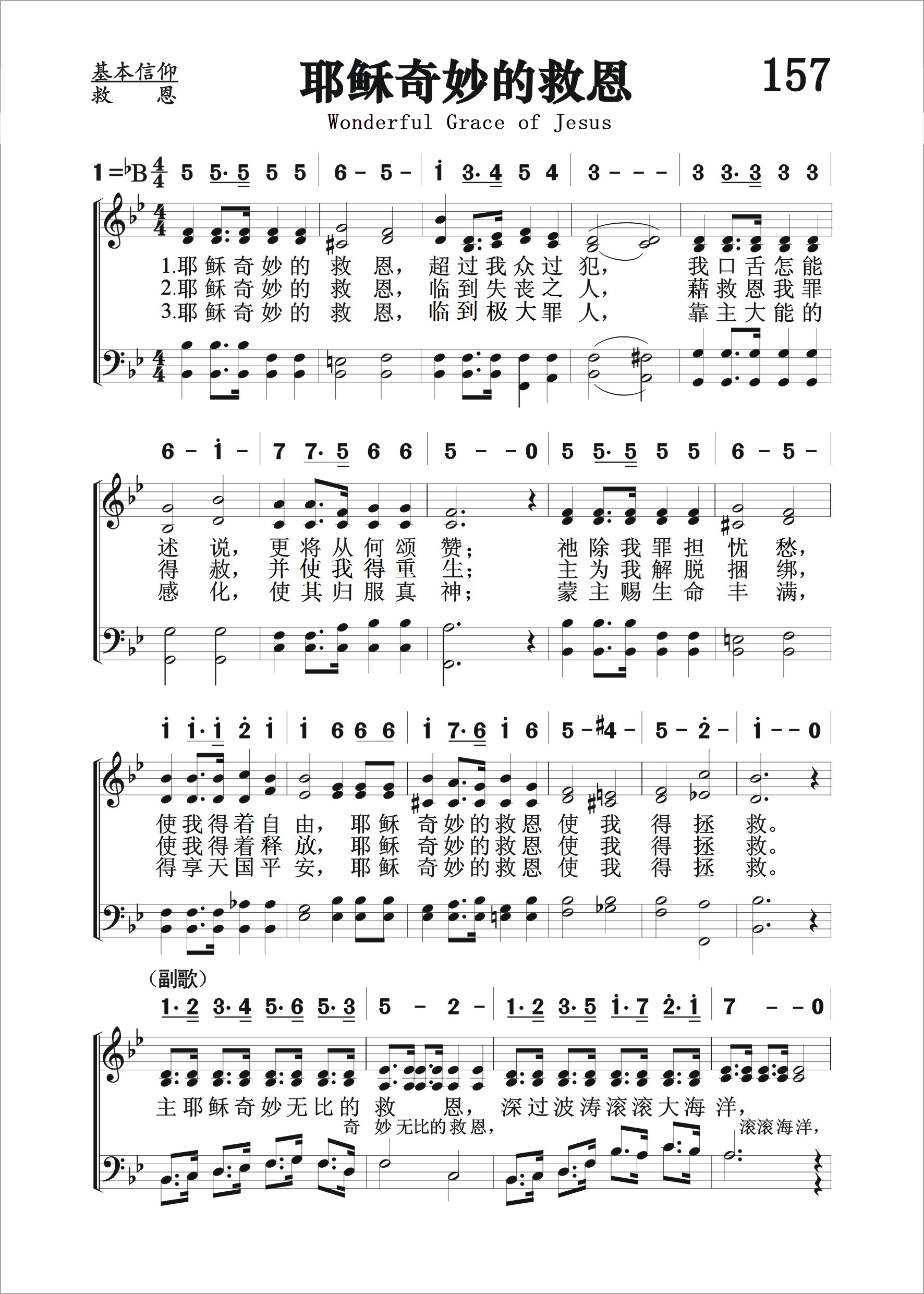 第157首 耶稣奇妙的救恩Wonderful Grace of Jesus 利勒纳斯(Haldor Lillenas,1885 –1959)作词作曲 耶稣奇妙的救恩,超过我众过犯, 我口舌怎能述说,更将从何颂赞; 祂除我罪担忧患.使我得享自由. 耶稣奇妙的救恩使我得拯救。 耶稣奇妙的救恩,临到失丧之人, 藉救恩我罪得赦,并使我得重生; 主为我解脱捆绑,使我得着释放, 耶稣奇妙的救恩使我得拯救。 耶稣奇妙的救恩.要施与众罪人, 靠主大能的感化,使他归服真神; 蒙主赐生命丰满,得享天国平安, 耶稣奇妙的救恩使我得拯救。 主耶稣奇妙无比的救恩,深过波涛滚滚大海洋, 高过最高山岭,美过最美泉源, 奇妙救恩足够我需用: 阔过我一生所行的过犯,大过我一切罪污邪情, 我要称扬主圣名.我要赞美主圣名。 利勒纳斯出生于挪威,童年随父母移民美国,定居俄勒根州。 在他4-14岁间,全家住在离城市十三里的森林,家中早晚有灵修。 星期天,偶而有牧师前来领会,但多数时,邻居们聚集一起,唱诗、读经、祷告、然后有一人读一篇讲章。利勒纳斯没有上过主日学,但父亲经常以问答的方式教导他读经。 他十五岁时在信义会受坚振礼。 母亲过世后,家中失去了温暖,他离家去一农场工作。 海滨垂钓,林间拾残枝都不能消除他内心的悲伤和空虚。1906年,有一天他在街头,听到一个年轻的女孩唱一首母亲期待她浪子归家的圣诗,深受感动,知道自己必须重生。 两周后,他在一次的布道会中决志奉献,他的生命经历了惊人的改变。 他开始在各街头布道的工作中事奉。 1909年,他深感自己学识不够,决心去洛杉矶读神学。 教会赠他一张单程的火车票,师母给了他数天的干粮,于是他身怀九元美金,踏上了火车。 他备受艰辛地半工半读。 有一天他在洛杉矶一条冷静的街上看到一个男人在殴打妻子,他前往劝阻,反被打伤了手,以致数周都不能练琴,这使他更感到街头传道的重要性。 他与女作曲家威尔逊(Bertha Mae Wilson)结婚后,在拿撒勒人教会十分活跃,他们巡回布道并从事圣乐事工。 1917年,他们在伊利诺伊州的一小镇,首次自建一小屋,竣工时,已无余款添置家具。 可是他们急需一架钢琴和若干乐器,最后在附近的邻居家,以五元美金购到了一台杂音重重的旧钢琴,而许多圣诗都藉此琴完成。《耶稣奇妙的救恩》就是其中之一,于1922年发表。 虽然它是一首轻快活泼的圣诗,但利勒纳斯李理纳时常不满会众将此诗唱得过于快速,以至咬字不清。 他说:“唱圣诗必须字义清晰,从容不迫。” 1924年利勒纳斯在印第安州成立了音乐公司,六年后与拿撒勒人出版社合并,他担任音乐主编有廿年之久。 他一共写了四千首圣诗,他是本世纪重要的圣诗作家之一。 1959年夏,拿撒勒人大学授予荣誉音乐博士学位,以表扬他对教会音乐的贡献。