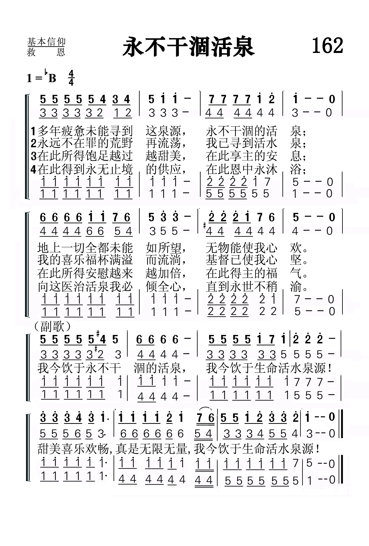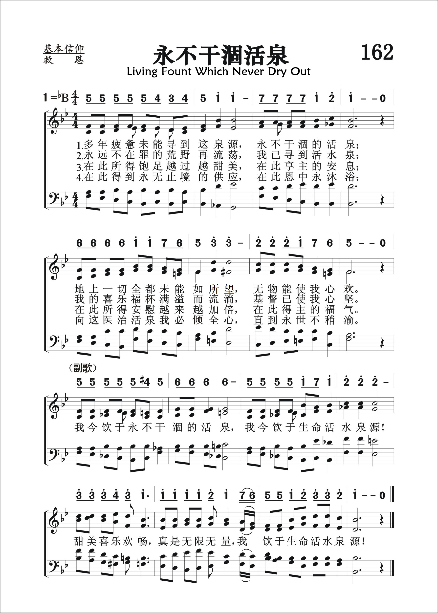 第162首 永不干涸活泉Living Fount Which Never Dry Out (《颂赞圣诗》212首) 多年疲惫未能寻到这泉源.永不干涸的活泉: 地上一切全都未能如我愿,无物能使我心欢。 永远不在罪的荒野再流荡.我已寻到活水泉; 我的喜乐福杯满溢而流淌,基督已使我心坚。 在此所得饱足越过越甜美,在此享主的安息: 在此所得安慰越来越加倍.在此得主的福气。 在此得到永无止境的供应,在此恩中永沐浴; 向这医治活泉我必倾全心,直到永世不稍渝。 我今饮于永不干涸的活泉,我今饮于生命活水泉源! 甜美喜乐欢畅.真是无限无量,我饮于生命活水泉源! 对于长途跋涉,疲惫劳顿的客旅来说,一股凛冽的清泉意味着生命和希望。主耶稣正是这样的荒漠甘泉。我在世路行走,地上财富和美物并不能满足我们心灵的饥渴,因为这一切不能解决我们对赦罪,对平安,对灵魂得救的期盼。救主道成肉身,降世受苦受难,牺牲在十字架上。祂肋旁流出的血和水,成了我们的赎罪泉源。这个永不干涸的活泉,白白提供给世人畅饮。惟愿我们都从中获益。
