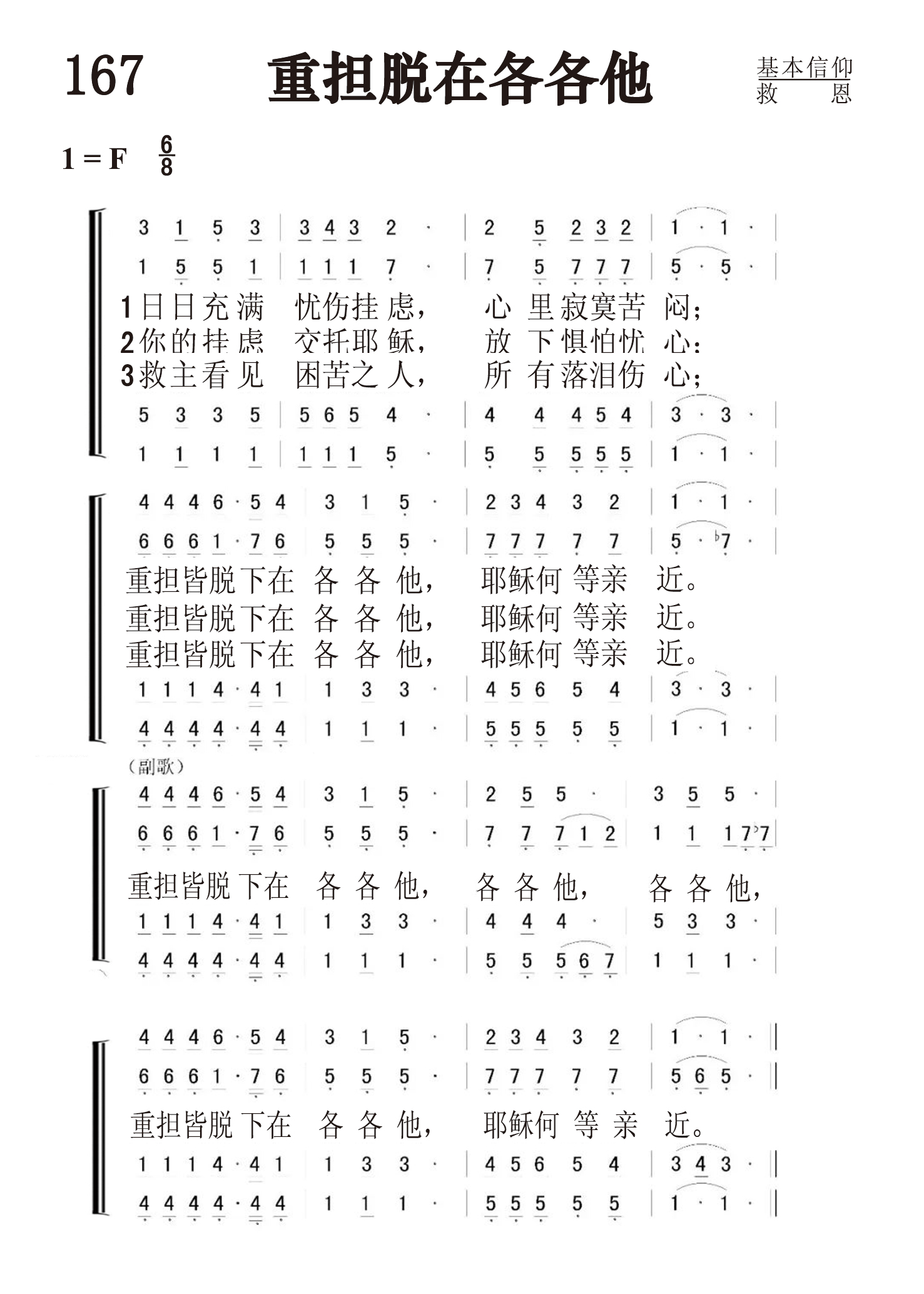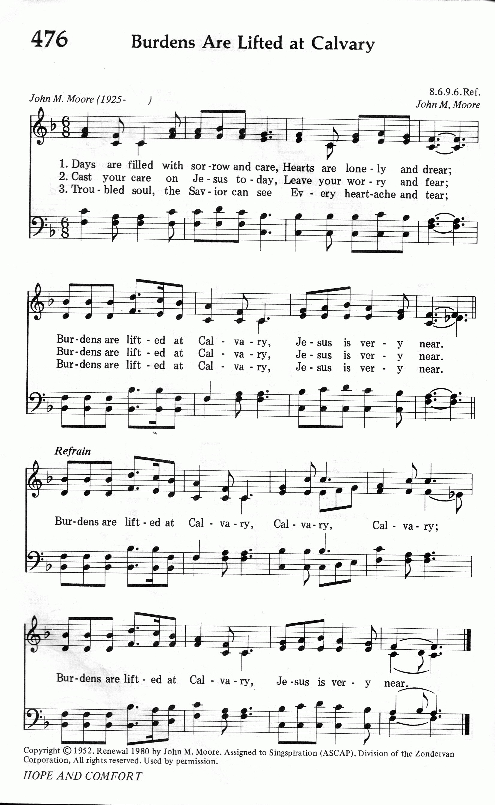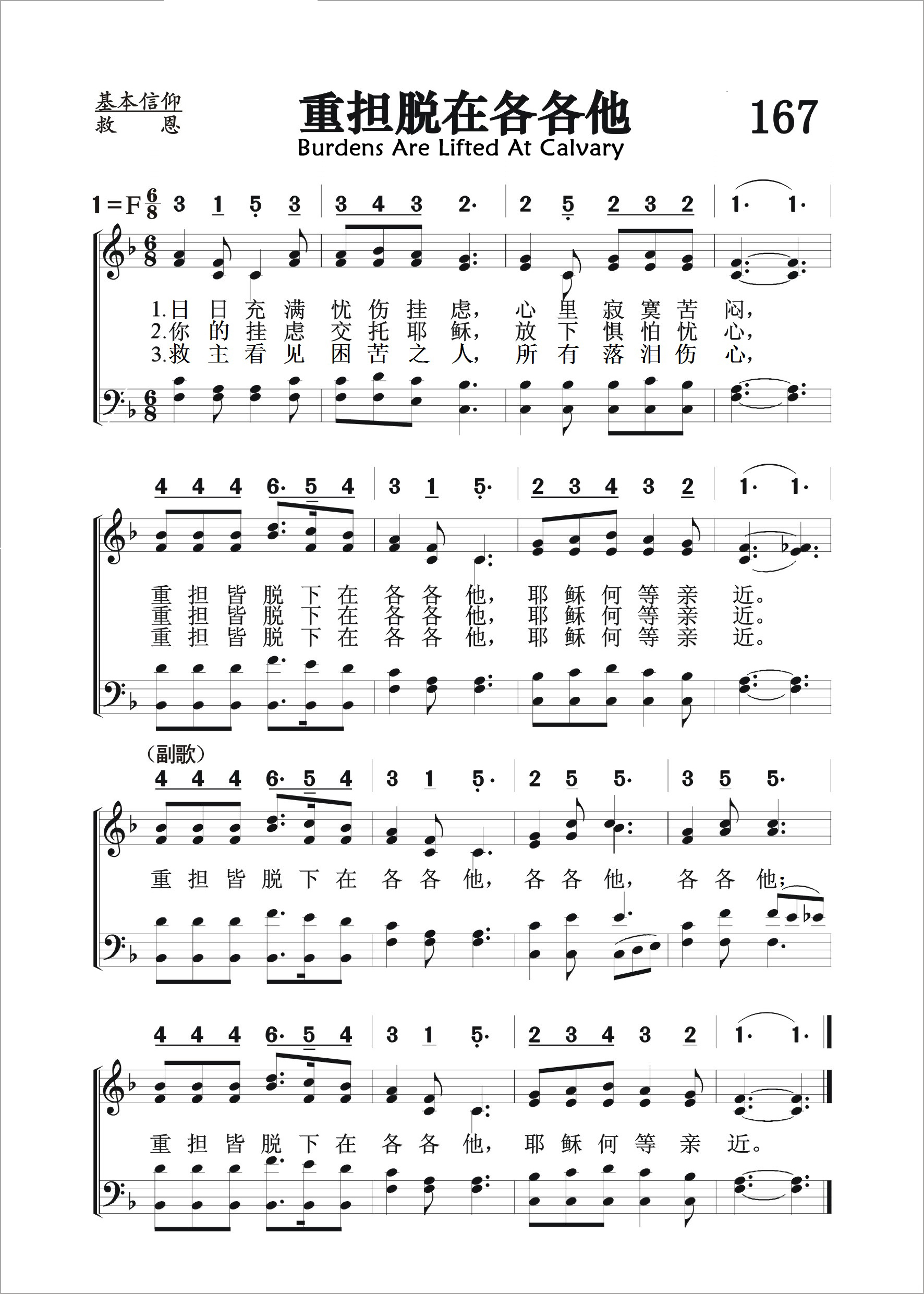 第167首 重担脱在各各他 Burdens Are Lifted at Calvary (《赞美诗》506版323首) 约翰.摩尔(John M.Moore)作词作曲 日日充满忧伤挂虑.心里寂寞苦闷; 重担皆脱下在各各他,耶稣何等亲近。 你挂虑速交托耶稣,放下惧怕忧心; 重担皆脱下在各各他,耶稣何等亲近。 救主看见困苦之任,所有眼泪伤心眼泪; 重担皆脱下在各各他,耶稣何等亲近。 重担皆脱下在各各他,各各他,各各他; 重担皆脱下在各各他,耶稣何等亲近。 约翰.摩尔1925年9月1日出生在苏格兰的丹巴顿郡,在苏格兰格拉斯哥浸信会宣教圣书学院接受教育,先后在格拉斯哥,加拿大多伦多等地担任浸信会教会的牧师和主管。 1952年,约翰.摩尔在苏格兰格拉斯哥的海员教会任助理时,一家大航运公司秘书来电,请他去当地医院探访一位病危的年轻水手,他自手提包中取了一张单张给水手。单张上印着天路客背负着重担来就十架的图片,他对年轻人简述了图片的故事,告诉年轻人:走向基督的十架,卸下重担时神也清除了心中的罪咎感。又见证了他自己的经验,他们一起祷告。祷告后年轻人脸上露出了笑容,是重担解脱后的平安和释放。当晚,他心中一直难忘白天的境遇,就写下了这首诗歌。 忧愁是上帝的犁头,挖掘我们心灵的深处,使我们省察、痛悔、认识自己。神常用忧愁去训练祂的仆人,许多被上帝重用的人都经过忧愁。忧愁缓冲急躁,使人进深思考,当我们走出忧愁的心境时必有喜乐相随。主耶稣也为我们的缘故而忧愁,祂被称为“忧患之子”。你要把你的重担卸给耶和华,祂必抚养你,祂永不叫义人动摇。 约翰.摩尔一共写过150多首赞美诗,有一些已经翻译成其他文字,包括罗马尼亚语。
