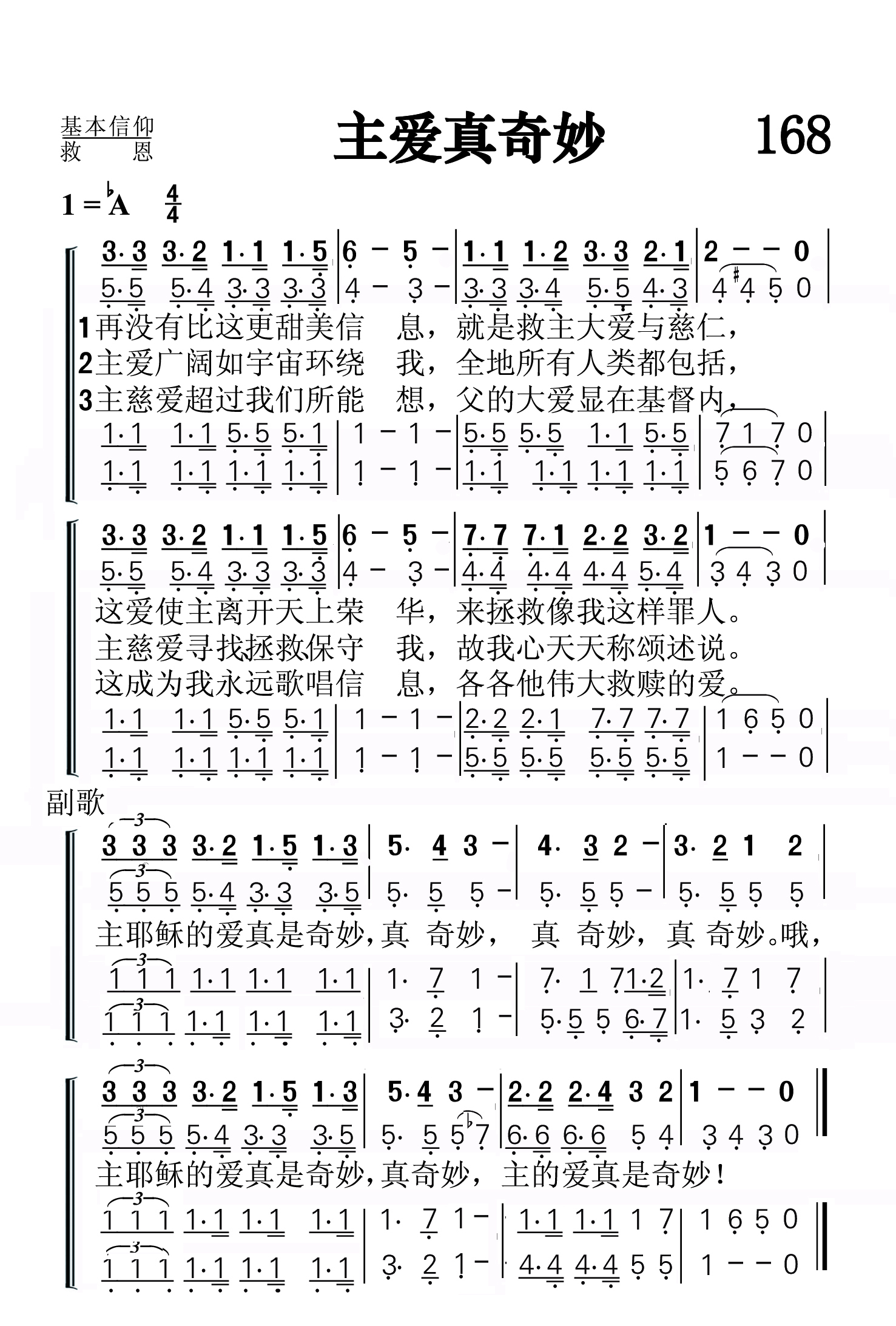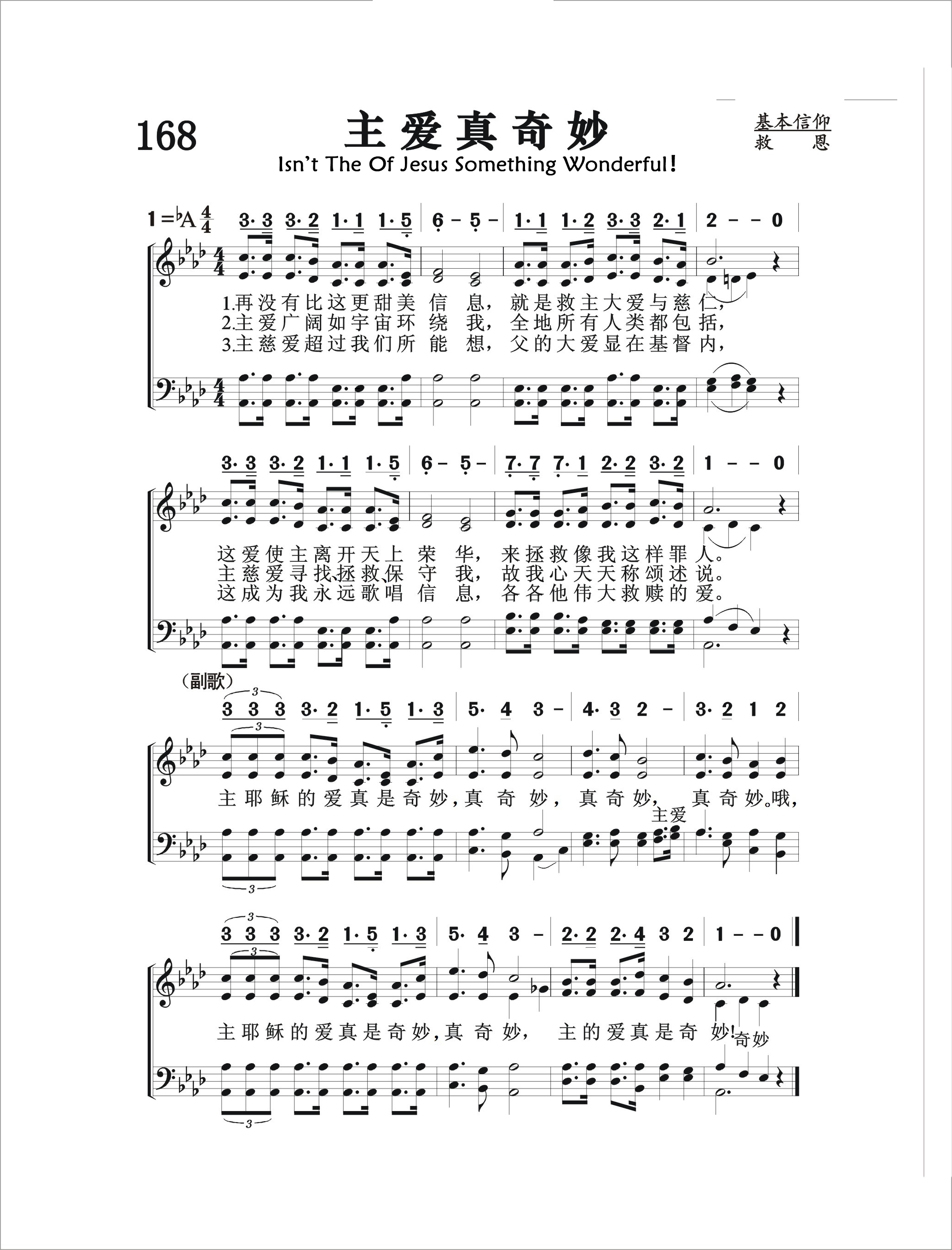 第168首 主爱真奇妙Isn’t the of Jesus Something Wonderful! 约翰.W.彼得森(John W. Peterson ,1921-2006.9.21)作词作曲 再没有比这更甜美信息.就是救主大爱与慈仁, 这爱使主离开天上荣华,来拯救像我这样罪人。 主爱广阔如宇宙环绕我.全地所有人类都包括, 主慈爱寻找拯救保守我,故我心天天称颂述说。 主慈爱超过我们所能想,父的大爱显在基督内, 这成为我永远歌唱信息,各各他伟大救赎的爱。 主耶稣的爱真是奇妙,真奇妙 , 真奇妙,真奇妙, 哦,主耶稣的爱真是奇妙,真奇妙,主的爱真是奇妙! 约翰.W.彼得森是一位天才的基督教福音音乐作者,曾创作过一千多首诗歌和35部康塔塔。《大能神迹》是他最著名的福音诗歌之一。他出生于美国堪萨斯州的林德伯格,第二次世界大仗期间,他曾作为飞行员前往中国执行艰难的任务。仗后他进入慕迪圣书学院,从事福音广播工作。1953年他毕业于芝加哥美国音乐学院,在宾夕法尼亚州继续进行诗歌创作。然后他在密歇根州的大急流域市担任一家圣乐出版公司的总裁和总编辑达十年之久。1961年,他编辑出版了赞美诗集《伟大的信心赞歌》。