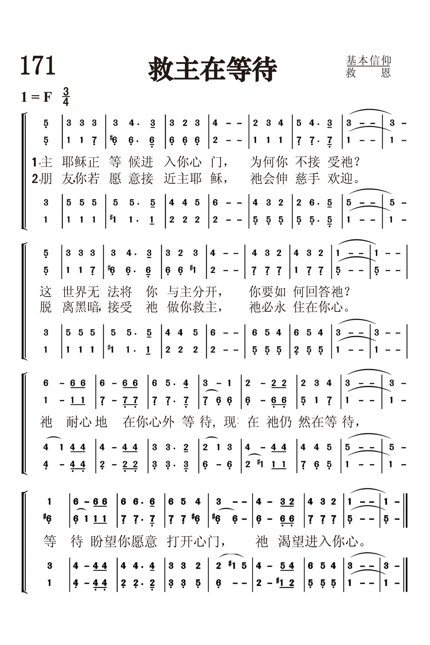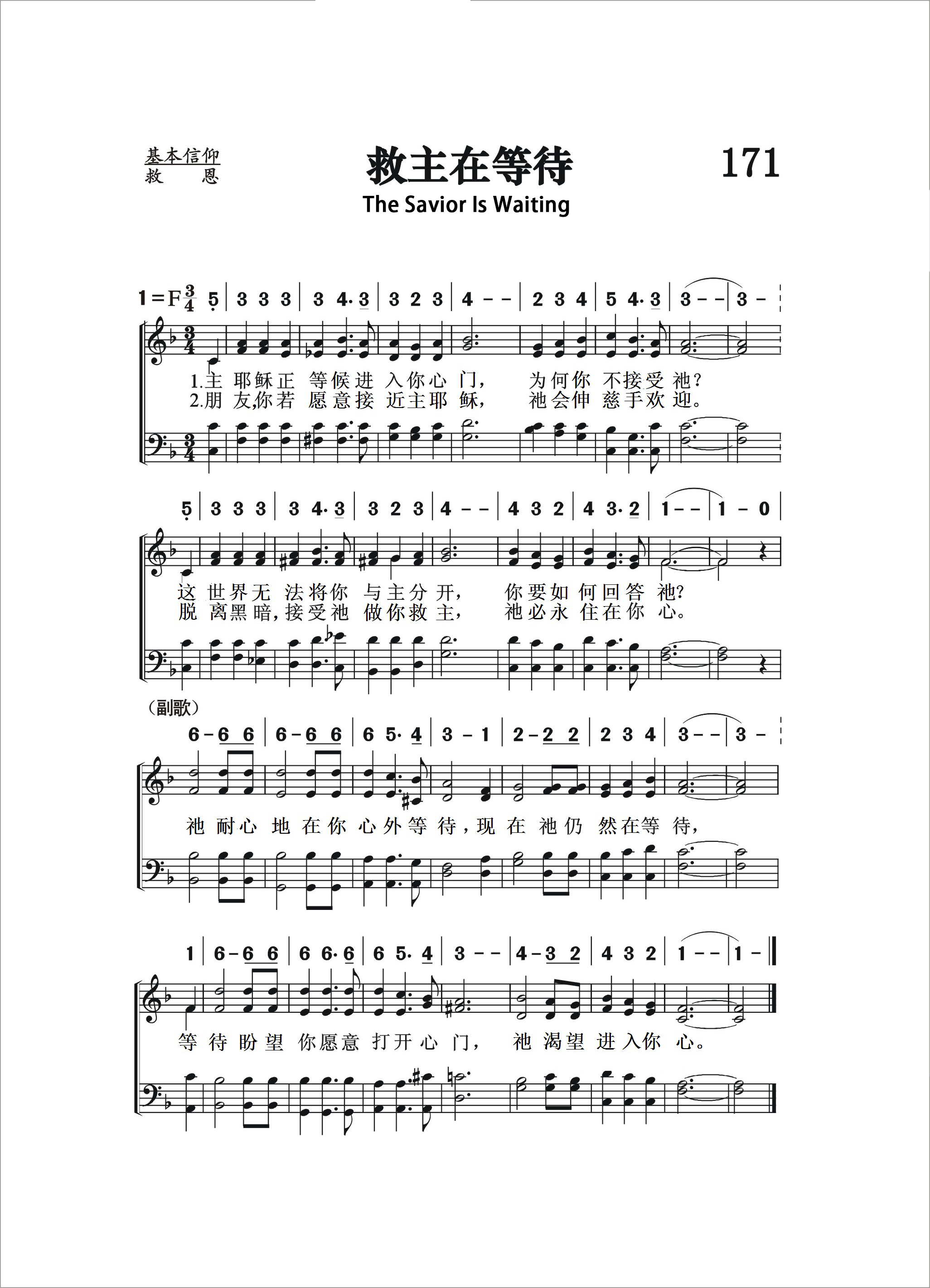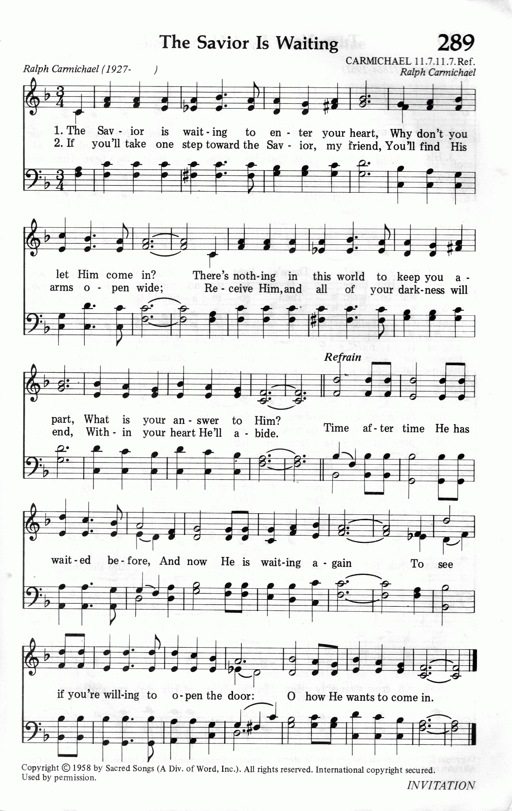 第171首救主正在等待The Savior Is Waiting 卡迈克尔(Ralph Carmichael, 1927 - )作词作曲 主耶稣正等候进入你心门, 为何你不接受祂? 这世界无法将你与主分开, 你要如何回答祂? 朋友, 你若愿意接近主耶稣,祂会伸慈手欢迎。 脱离黑暗,接受祂做你救主, 祂必永住在你心。 祂耐心地在你心外等待,现在祂仍然在等待, 等待盼望你愿意打开心门, 祂渴望进入你心。 卡迈克尔出生在美国加利福尼亚州一个喜爱音乐的牧师家庭中,四岁时开始学小提琴。他的家境并不富裕,在那艰难的三十年代,全家缩衣节食地供他学了十三年的小提琴,在大雪纷飞的冬夜,他父亲带着六岁的他伫立街上,希望音乐会的守门者容他们在中场时进去听半场免费的音乐会。 大学时,他学会了鼓、钢琴、喇叭、指挥、作曲。 大学毕业后,他组织了一个十四人的管弦乐队,和十六人的男声诗班,巡回演唱。 1949年他首次上巴沙迪那( Pasadena)电视台,在《基督教校园时间》(The Campus Christian Hour)参加演唱及演奏器乐。该节目在他策划下持续了76周,荣获1951年艾美(Emmy)电视奖。同时他也在洛杉矶城中浸信会任音乐主任,组织管乐团及交响乐队,指挥二百人诗班献唱弥赛亚神曲。 次年他为葛理翰的影片《德州先生》(Mr. Texas)及其它葛理翰所制的影片撰写乐谱。 他也为许多基督教的电视节目配乐。 《救主正在等候》是卡迈克尔最著名的圣诗。 这首圣诗原是应洛杉矶城中教会的牧师所请而写的一首《邀请决志》的诗歌。 他其它的作品有:《求告主耶稣》(Reach Out to Jesus),《救主是我一切》(He’s Everything to Me)。卡迈克尔对各种音乐的表达方式能兼容并蓄。他希望能打破典雅圣诗和轻快流行音乐间的鸿沟,这崭新的观念,在当时曾被排斥。 五十年代时,卡迈克尔随世界展望会(World Vision, International)的创办人皮尔斯(Bob Pearce)赴日本为期一个月的巡回布道,他集训了六千人的诗班。 每晚的布道会,有一千人组成的诗班献唱,最后邀请决志时,就唱《救主在等候》。在场的美国陪谈员将这首诗歌带回各自教会,广受欢迎,就此流传全世界各地。 卡迈克尔是教会、宗教团体和音乐界、影艺界之间的桥梁。他年高德劭,受各界敬重。他乐意推荐有潜力的年轻人,也能唤起成名的音乐家、艺术家来回馈社会。卡迈克尔说;“基督徒被劝诫,勿以自我为中心,如果我们肯衷心接受基督的信息,我们就有责任去帮助那些有需要的人。”