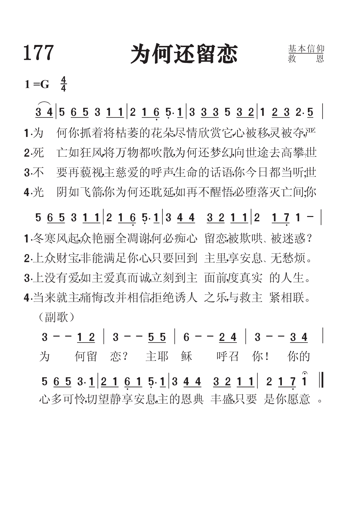 第177首 为何还留恋Why Still Yearn for? (《颂赞圣诗》42首) 赵典仁、吴涤申译自英文《青年圣诗》108首 何你抓着将枯萎的花朵,尽情欣赏它,心被移,灵被夺, 严冬寒风起众艳丽全凋谢,何必痴心留恋被欺哄、被迷惑 死亡如狂风,将万物都吹散,为何还梦幻,向世途去高攀? 世上众财宝非能满足你心,只要回到主里享安息、无愁烦。 不要再藐视主慈爱的呼声,生命的话语,你今日都当听; 世上没有爱,如主爱真而诚,立刻到主面前,度真实的人生。 光阴如飞箭,你为何还耽延?如再不醒悟,必堕落灭亡间; 你当来就主,痛悔改并相信,拒绝诱人之乐,与救主紧相联。 为何留恋主耶稣呼召你!你的心多可怜,切望静享安息, 主的恩典丰盛,只要是你愿意。 这首诗歌所揭示的是罪中之乐的虚空。看似艳丽的花朵令人心夺神移,但曾几何时,光鲜的表象荡然无存,世俗之花凋谢飘零。诗歌劝勉我们倾听主的呼唤,来到救主面前,静享主所赐的安息,领受祂的丰盛恩典。