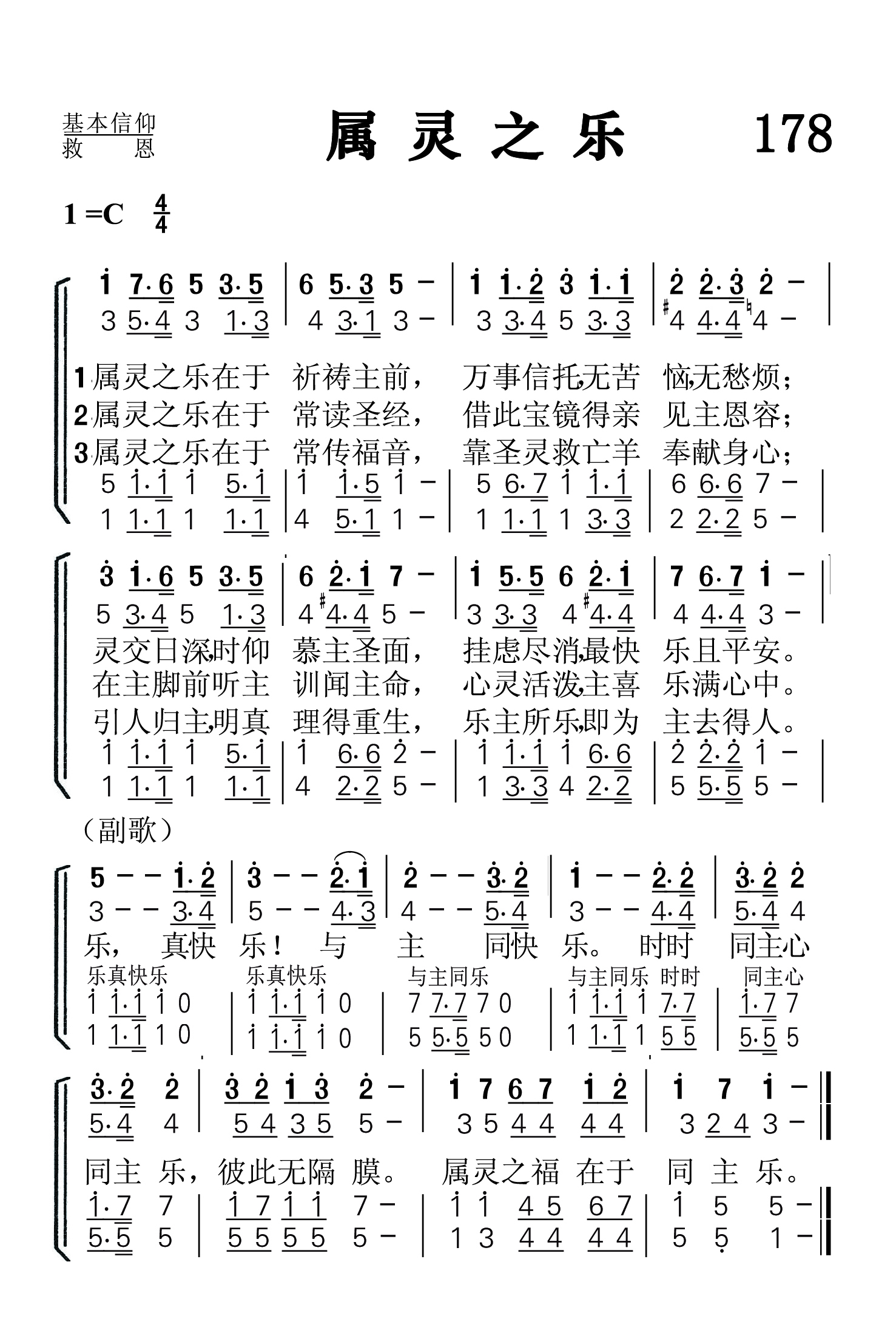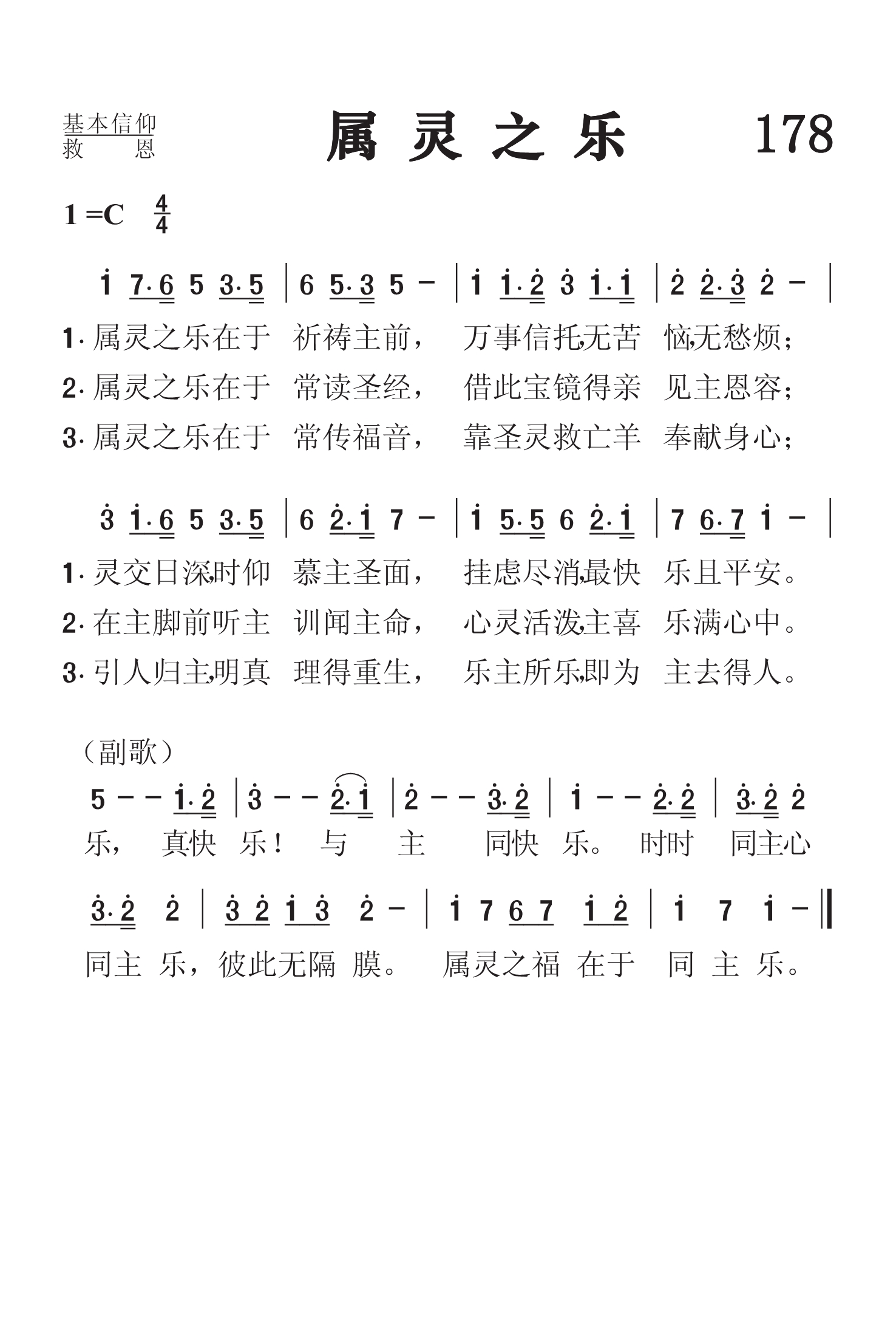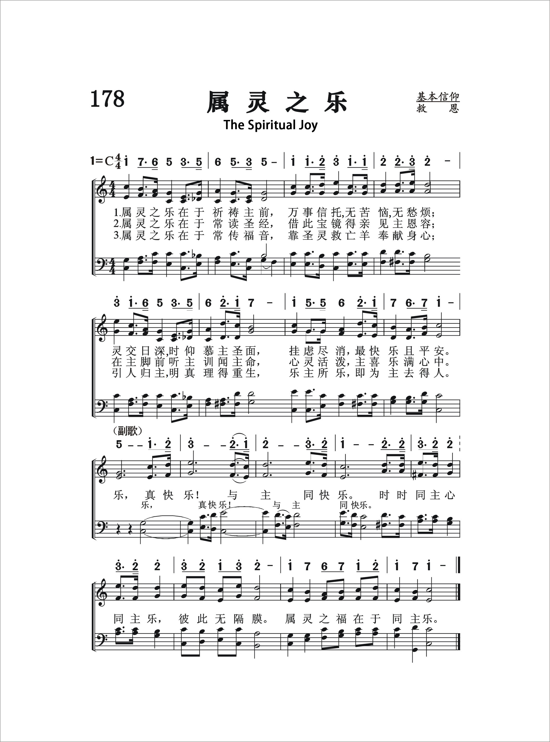 第178首 属灵之乐The Spiritual Joy (《颂赞圣诗》454首) 属灵之乐在于祈祷主前,万事信托,无苦恼.无愁烦; 灵交日深,时仰慕主圣面,挂虑尽消,最快乐且平安。 属灵之乐在于常读圣书,借此宝镜得亲见主恩容; 在主脚前听主训闻主命,心灵活泼,主喜乐满心中。 属灵之乐在于常传福音,靠圣灵救亡羊奉献身心; 引人归主,明真理得重生,乐主所乐,即为主去得人。 乐,真快乐! 与主同快乐。 时时同主心同主乐,彼此无隔膜。 属灵之福在于同主乐。 属灵的快乐与世俗的快乐在性质上是完全不同的。世俗的快乐是暂时和虚幻的。它转瞬即逝,留下来的,只是更大的失落感。属灵之乐源于喜乐的泉源耶稣。它使人无苦恼.无愁烦,凡事信靠。它使人心灵活泼,积极向上。这首诗歌所颂唱的属灵之乐是值得羡慕的,也是信徒所要努力追求的。