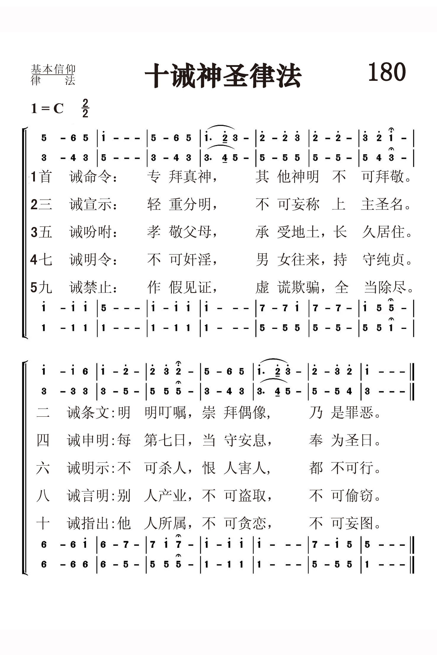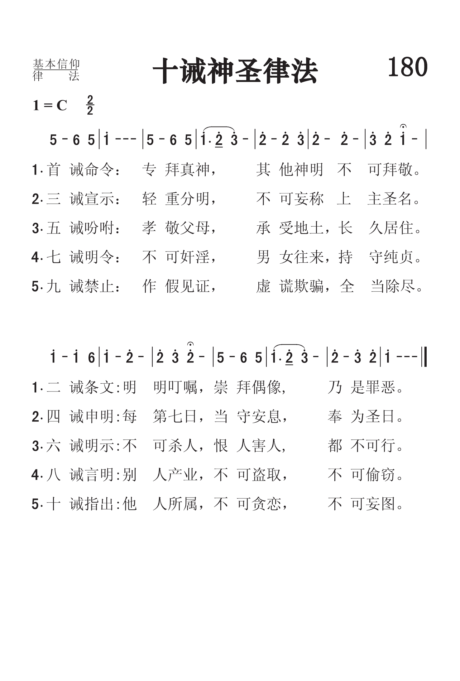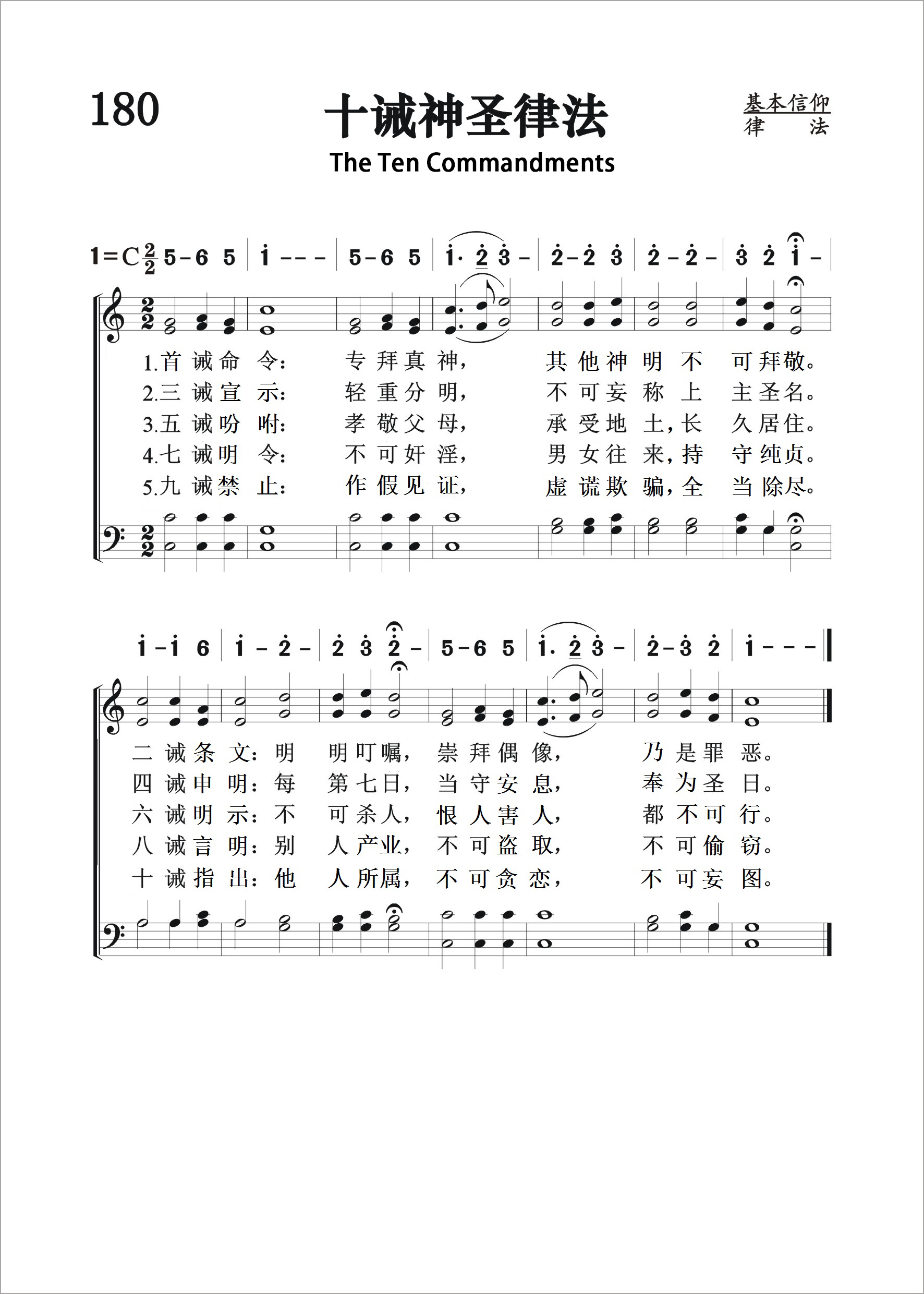 第180首 十诫神圣律法The Ten Commandments 词作者佚名,埃默森(Luther.Orlando.Emerson,1820,8,3-1915,9,29)作曲 首诫命令:专拜真神,一切假神,都不拜敬。 二诫条文:明明叮嘱,崇拜偶像,乃是罪恶。 三诫宣示:轻重分明,不可妄称,上主圣名。 四诫申明:每第七日,当守安息,奉为圣日。 五诫吩咐:孝敬父母,承受地土,长久居住。 六诫明示:不可杀人,恨人害人,都不可行。 七诫明令:不可奸淫,男女往来,持守纯真。 八诫言明:别人产业,不可盗取,不可偷窃。 九诫禁止:作假见证,虚假欺骗,全当除尽。 十诫指出:他人所属,不了贪恋,不可妄图。 曲作者埃默森出生于美国缅因州。他原打算成为一名医师,但对音乐是酷爱使他立志以音乐作为自己的终生事业。他在当时的名师埃萨克.伍德伯里门下刻苦学习声乐,钢琴与风琴数年之久,后迁往马萨诸塞州的塞勒姆以年薪100美元的报酬接受第一份圣诗班的工作。到1853年,他觉得自己已有足够的能力向公众展示自己的才华,遂出版了自己的一些音乐作品。八年以后,他前往波士顿,成为一个教堂的司琴和音乐指挥。1857年,他加入一家出版社的工作。由于他在音乐方面的杰出贡献,俄亥俄州的芬得利学院最后授予他音乐博士学位。