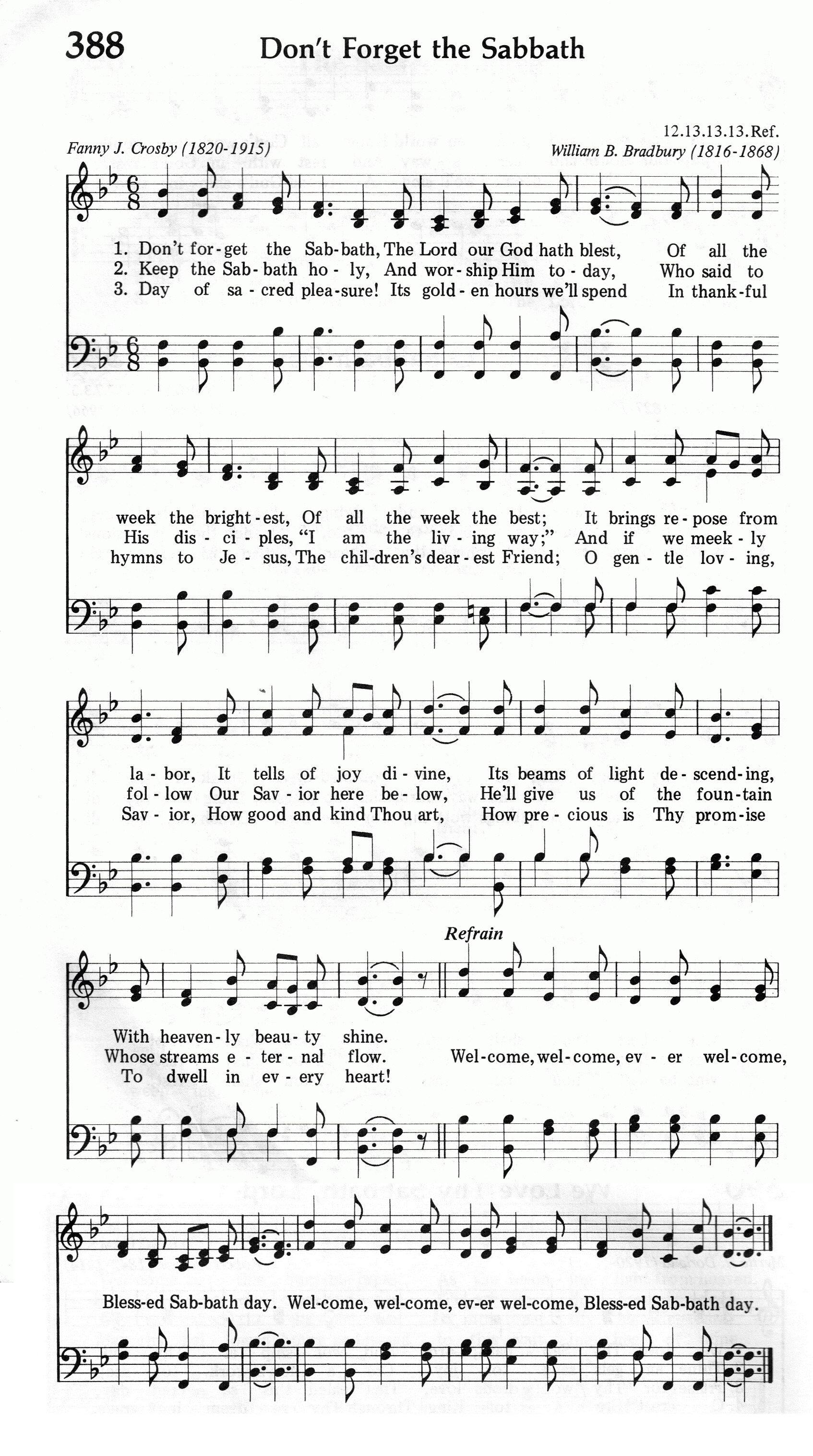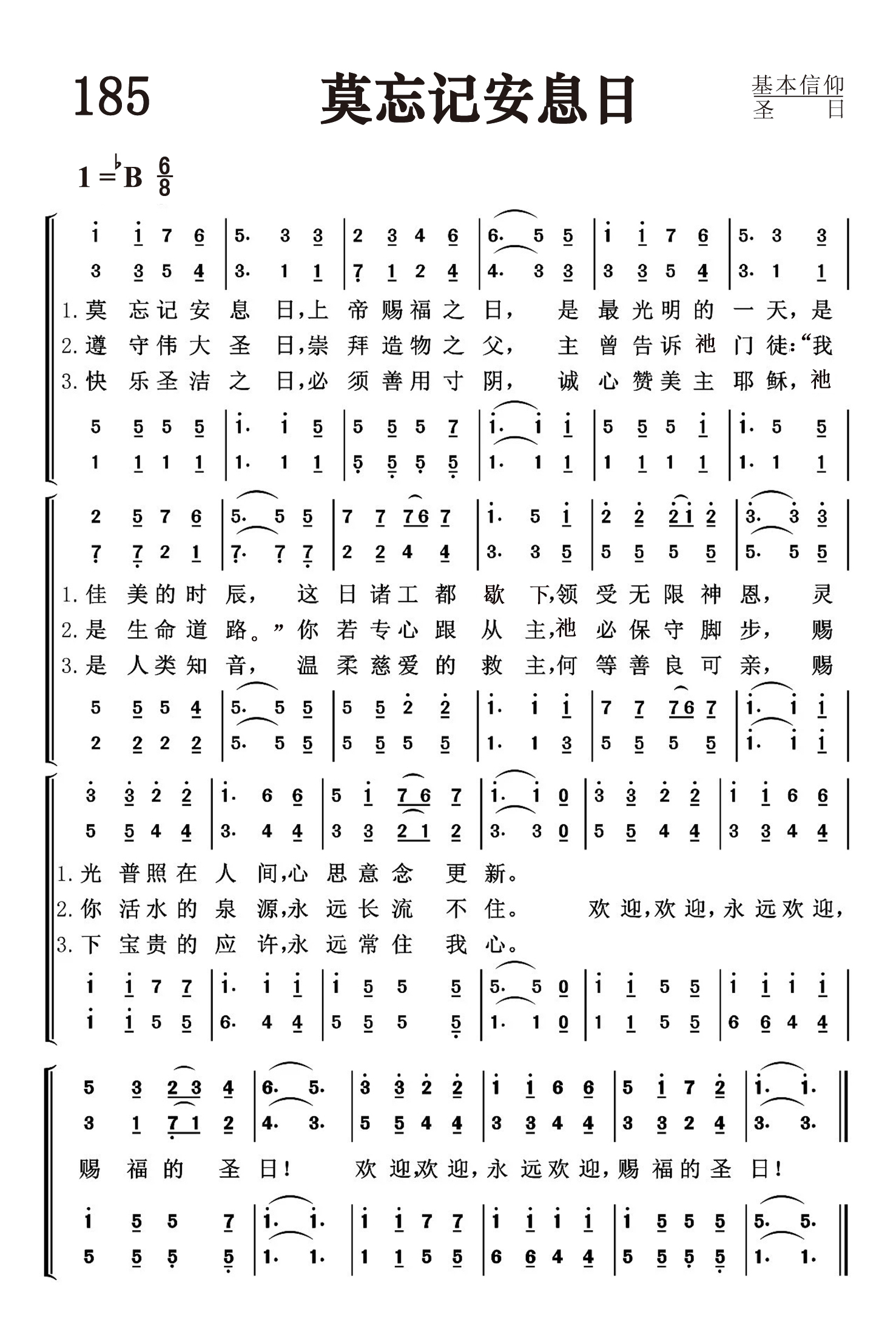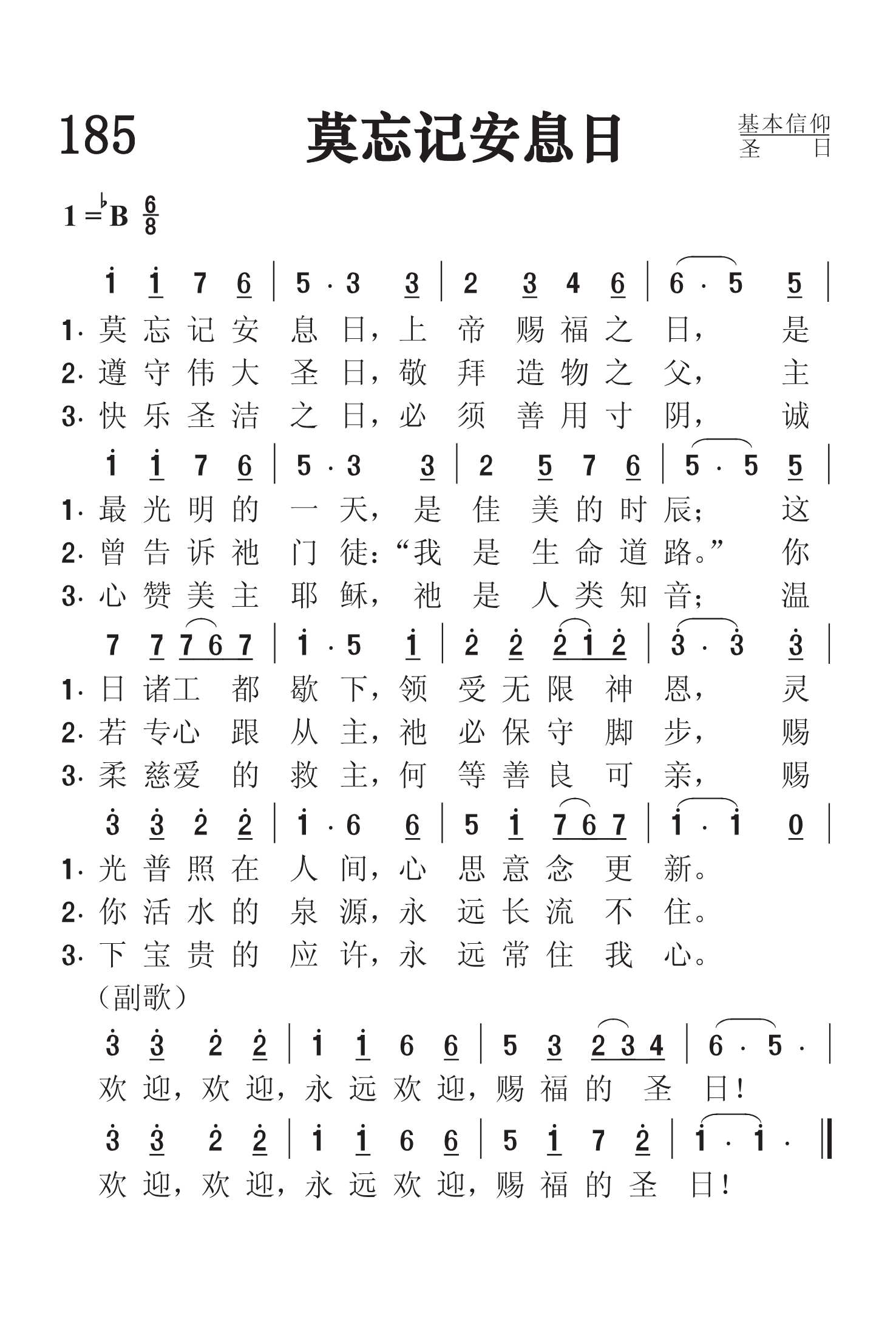 第185首莫忘记安息日Don’t Forget the Sabbath 克罗斯比(1820-1915年)作词,布雷德巴里(W.B.Bradbury,1816,10,6-1868,1,8)作曲 莫忘记安息日,上帝赐福之日, 是最光明的一天,是佳美的时辰; 这日身心都体息,领受无限神思。 灵光普照在人间.心思意念更新。 遵守伟大圣日,敬拜造物的父, 主曾告诉袍门徒:“我是生命道路。” 你若专心跟从主,袍必保守脚步, 赐你活水的泉源,永远长流不住。 快乐圣洁之日,必须善用寸阴, 诚心赞美主耶稣,袍是人类知音i 温柔慈爱的救主,何等善良可亲, 赐下宝贵的应许,永远常住我心。 欢迎,欢迎,永远欢迎,赐福的圣日! 欢迎.欢迎,永远欢迎,赐福的圣日! 这是克罗斯比为遵守圣日而写的一首赞美诗。诗歌告诫信徒不要忘记上帝为赐福人类而设立的圣日。要纪念创造之功和救赎之爱。要就近长流不息的生命之泉,畅饮救主所赐的活水。要珍惜圣日的美好时光,与人类的知音亲密交往,持住主的宝贵应许,让主永居我们之心。 词作者克罗斯比是美国才华出众,负有盛名的福音女诗人。她出生六个月时因庸医,误诊而双目失明。15岁时她就读于纽约最早的一所盲童学校。1847-1858年,她留在该校教授英语语法,修辞学,罗马史和美国历史。她少年时代就开始写诗,24岁时出版了《盲女与她的诗》,引起美国文坛的注意。1850年灵性奋兴的经验,使她集中全力专写圣诗,后在福音圣诗作曲家和编辑布雷得伯里的鼓励下,立志以创作福音圣诗作为自己的终生事业,于是与纽约一家出版社签订合同,每周写圣诗三首,结果写了5929首。此外,她还为布利斯写525首,为桑基写237首,为劳里写219首,为多恩写1500首。她一生共写了8440首圣诗,堪称为最多产的圣诗作家。 曲作者布雷德伯里出生于美国缅因州约克。他14岁以前没有接触过风琴,钢琴。1830年随家迁往波士顿,才接触这些乐器。他参加了梅森的唱诗培训班,后来与梅森在师范研究所共事。他在工作中表现了杰出的音乐天才,曾任浸信会数个会堂的管风琴师和唱诗班指挥,待遇菲薄,年薪仅25美元,但他却毫不计较。他后来到纽约教儿童唱歌,并向中学生介绍音乐,讲解乐理。1847年他获得机会去德国深造,跟名师学习,返美后专任音乐教师。他在1841-1867的二十六年时间里,平均每年出两本赞美诗集,总计59本,销量达二百万册以上。 1854年,他自己成立钢琴制造厂。1917年该厂并入纳普音乐工厂。他所编写的许多音乐书籍和圣诗曲调,已在世界各地广泛流传。