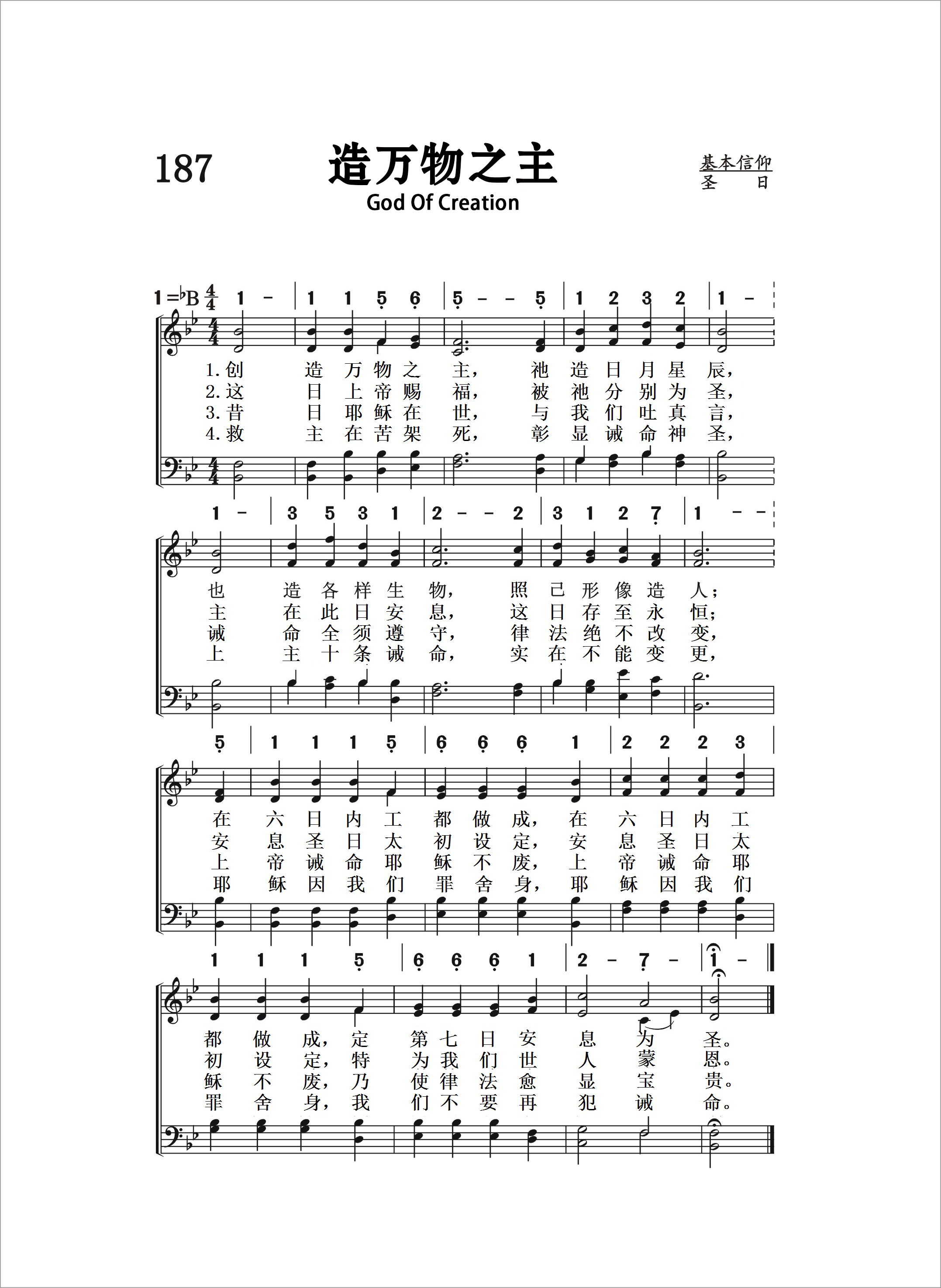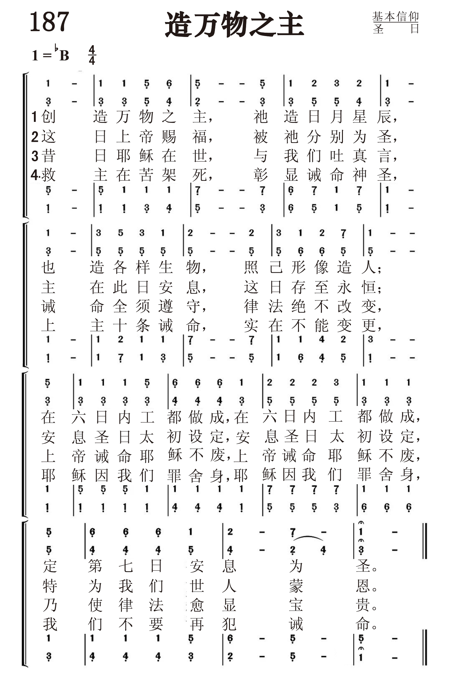 第187首造万物的主God of Creation 词作者佚名,埃德森(Lewis Edson,1748,1,22-1820)作曲 创造万物的主,祂造日月星辰,也造各样生物,照己形像造人。 在六日内工都成就,在六日内工都成就,第七日安息为圣。 这日上帝赐福,被祂分别为圣,主在此日安息,这日存至永恒; 安息圣日太初设定,安息圣日太初设定,为我们世人蒙恩。 昔日耶稣在世.与我们吐真言,诫命全须遵守.律法绝不改变, 上帝诫命耶稣不废.上帝诫命耶稣不废,乃使律法显为宝贵。 救主在苦架死,彰显诫命神圣,上主十条诫命,实在不能变更, 耶稣因我们罪舍身,耶稣因我们罪舍身,我们不要再犯诫命。 本诗的曲调原是为卫理公会创立150周年而写的赋格曲。曲作者埃德森出生于美国麻萨诸塞州,以铁匠为生。独立战争时因亲英立场而迁居渺无人烟的麻萨诸塞州西部。1776年迁回纽约,最后定居在康涅狄格州。作为一名热心的基督徒和音乐爱好者,他到处主持音乐学校,有“大歌唱家”的美誉。他还创作了若干赋格曲,作为赞美诗的曲调,受到大众的欢迎。