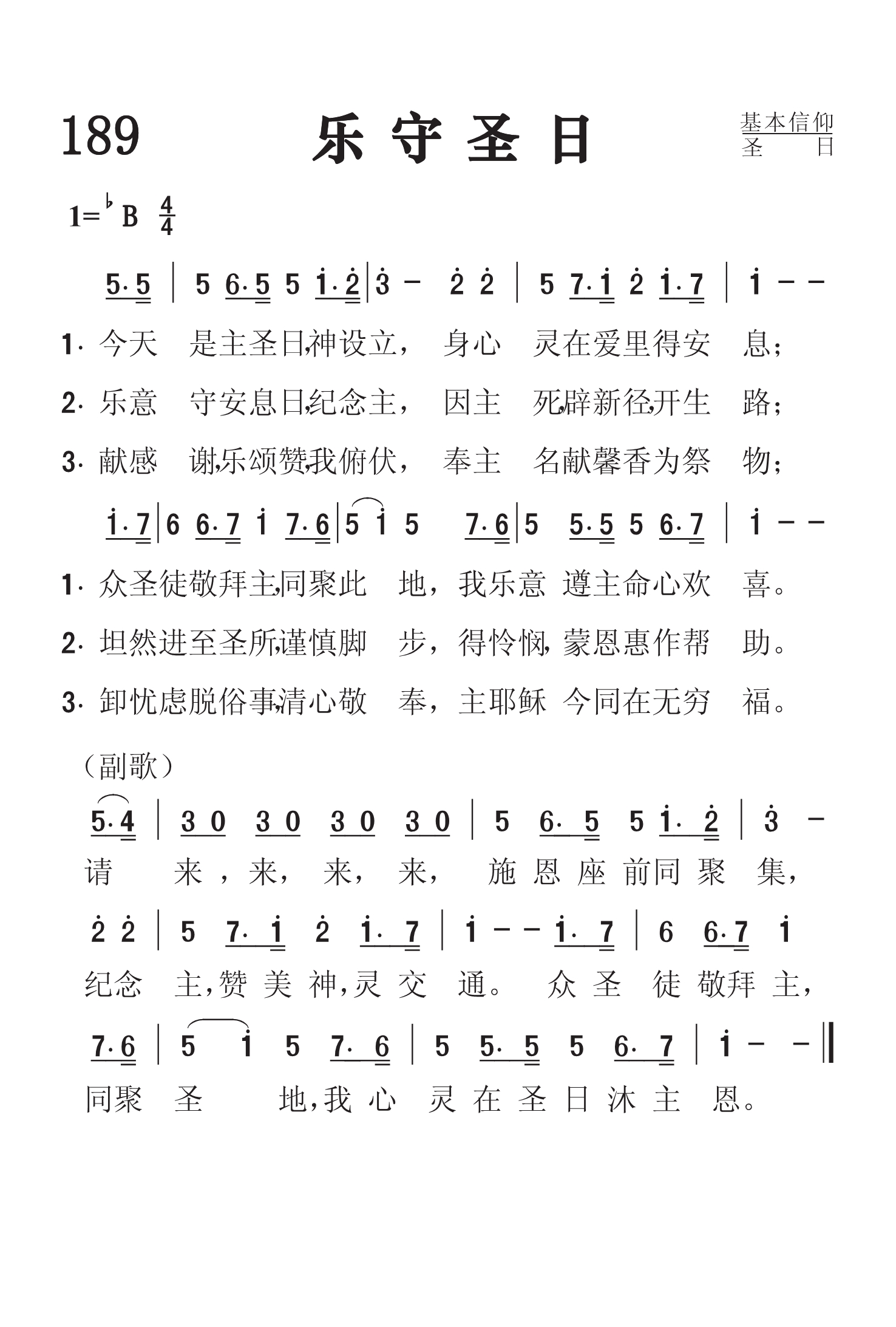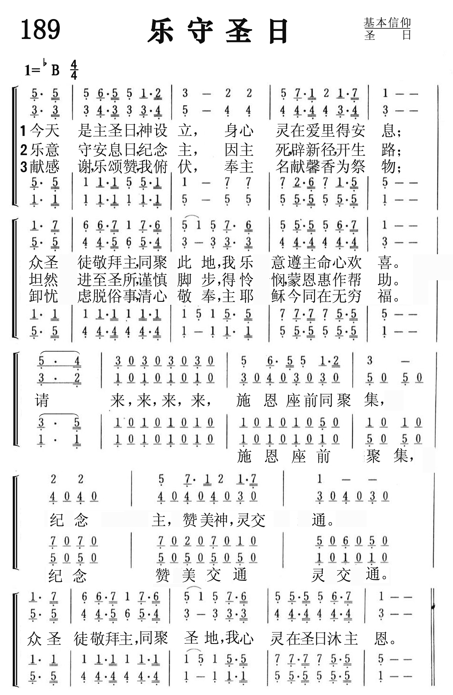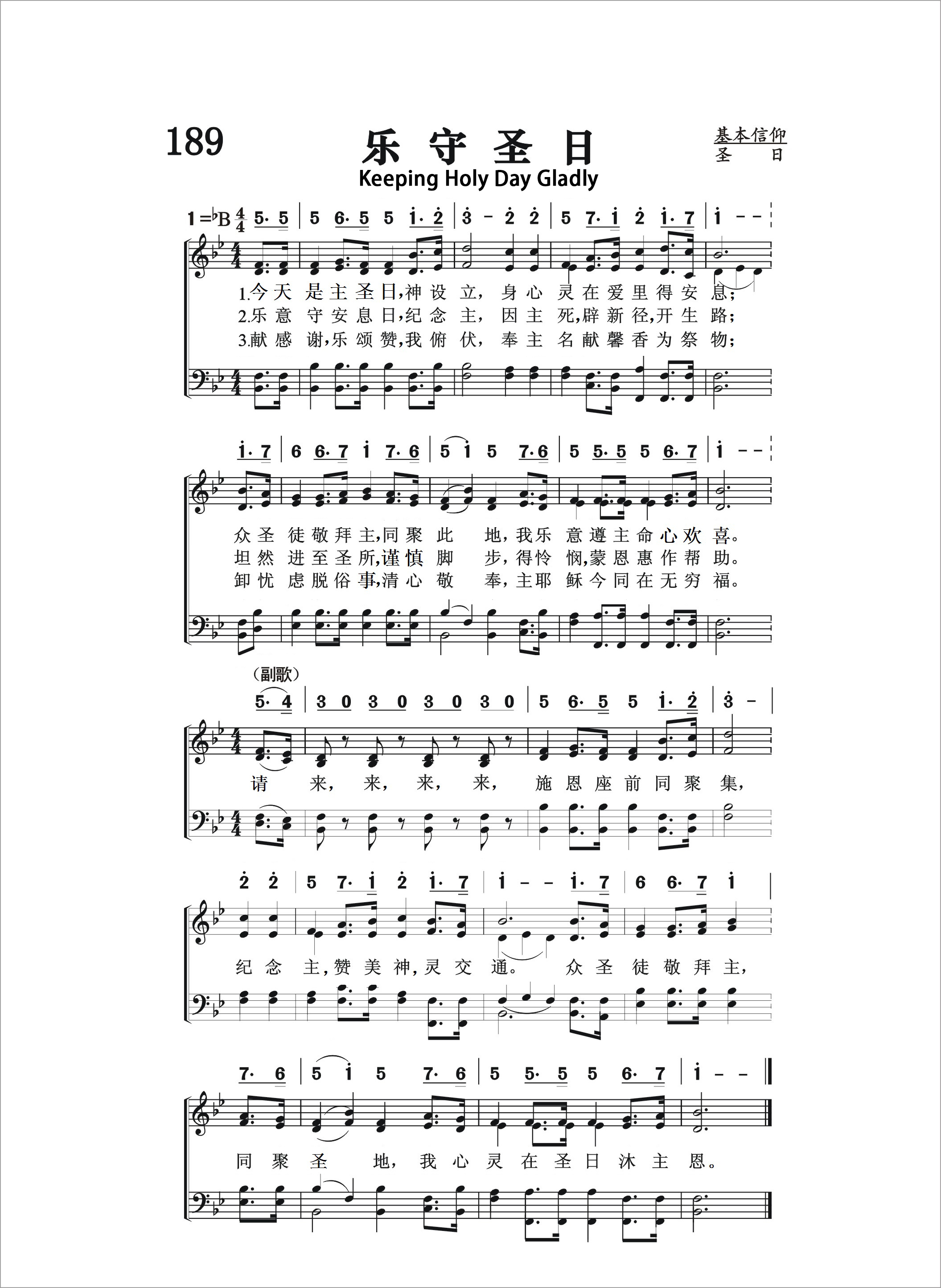 第189首 乐守圣日Keeping Holy Day Gladly 《 颂赞圣诗》508首 今日是主圣日,神设立,身心灵在爱里得安息, 众圣徒敬拜主同聚此地,我乐意遵主命心欢喜。 乐意守安息日,纪念主,因主死辟新径,开生路, 坦然进至圣所,谨慎脚步,得怜悯,蒙恩惠作帮助。 献感谢,乐颂赞,我俯伏,奉主名献譬香为祭物, 忧虑脱世俗,清心敬奉,主耶稣今同在无穷福。 请来,来,来,来,施恩座前同聚集,纪念主,赞美神,灵交通。 众圣徒敬拜主,同聚圣地,我心灵在圣日沫主恩。 上帝设立安息日的目的,使让人得到身心的安息,从世俗的杂务中摆脱,亲近创造我们、救赎我们的宇宙主宰。所以我们要以遵守安息日为最大的乐事。要怀着愉快的心情,参赴圣会,同心敬拜,唱诗赞美,向主献呈感恩之心,好让上帝设立安息日的初衷,得以实现在我们身上。