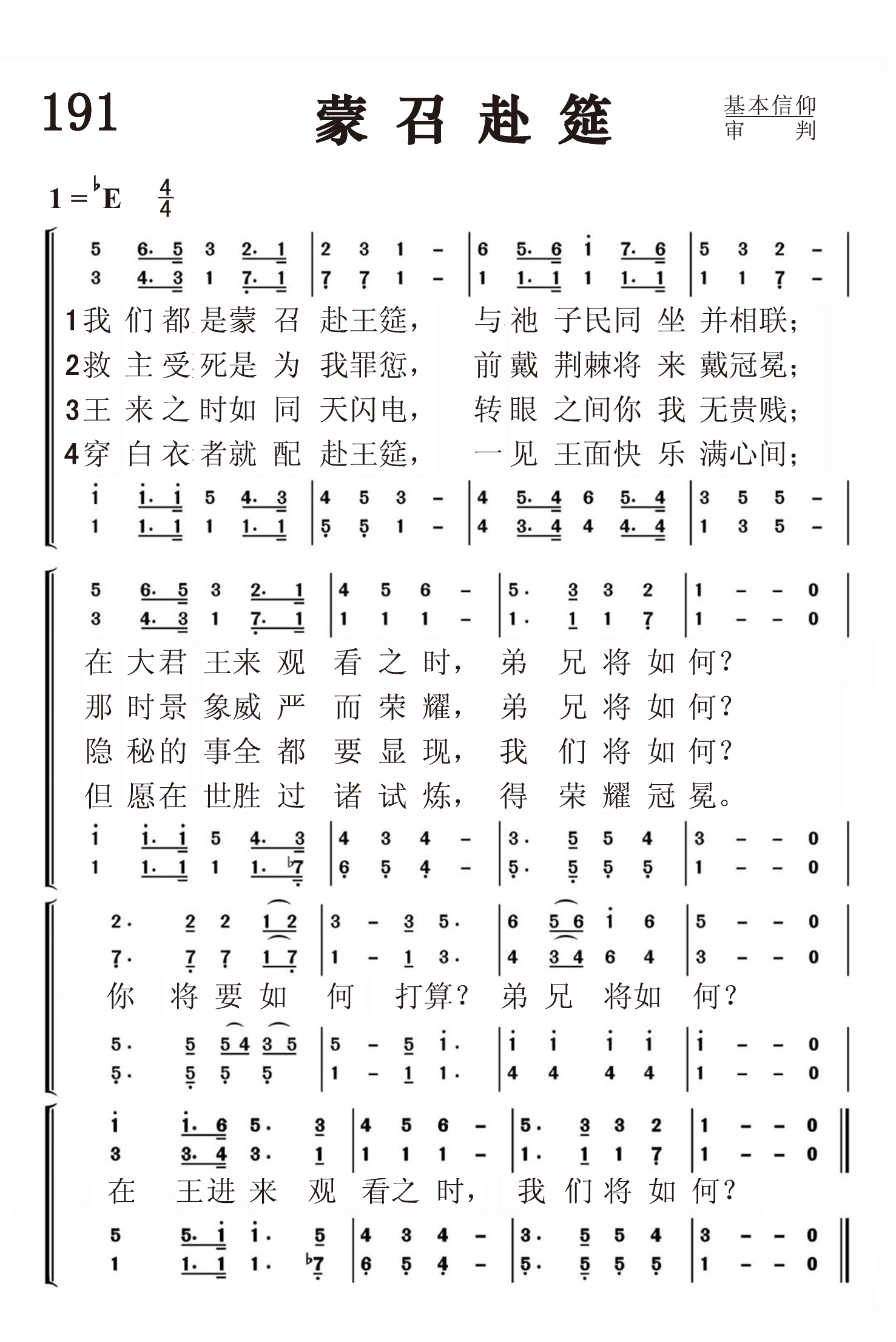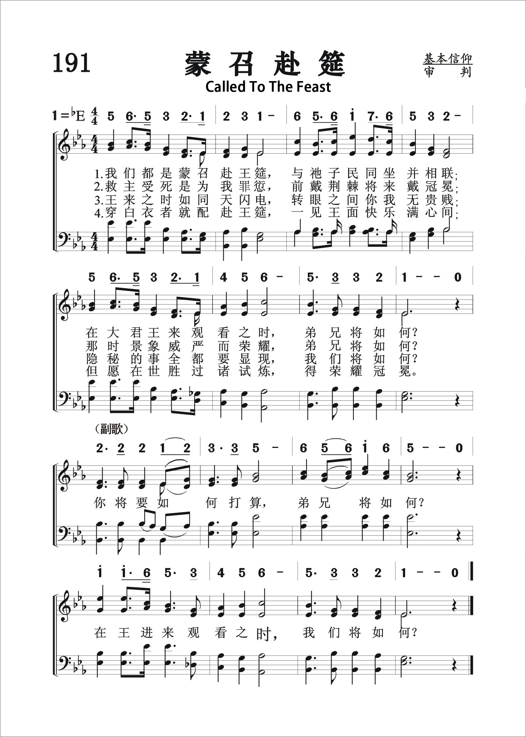 第191首蒙召赴筵Called to the Feast 兰德(J.E.Landor,十九世纪)作词,洛兰茨(E.S.Lorenz,1854-1942)作曲 我们都是蒙召赴王筵,与祂子民同坐并相联; 在大君王来观看之时.弟兄将如何 救主受死是为我罪愆,前戴荆棘将来戴冠冕; 那时景象威严而荣耀,弟兄将如何 王来之时如同天闪电,转眼之间你我无贵贱; 隐秘的事全都要显现,我们将如何 穿白衣者就配赴王筵,一见王面快乐满心间; 但愿在世胜过诸试炼,得荣耀冠冕。 你将要如何打算,弟兄将如何 在王进来观看之时,我们将如何 本诗的词作者兰德不详。曲作者洛伦茨(E.S.Lorenz,1854-1942)在学生时代就显示出非凡的编辑才能。他从耶鲁大学毕业以后,就开始从事教会音乐的出版工作。1890年,他创办了洛伦茨出版公司,不断地为各地教会提供赞美诗歌。