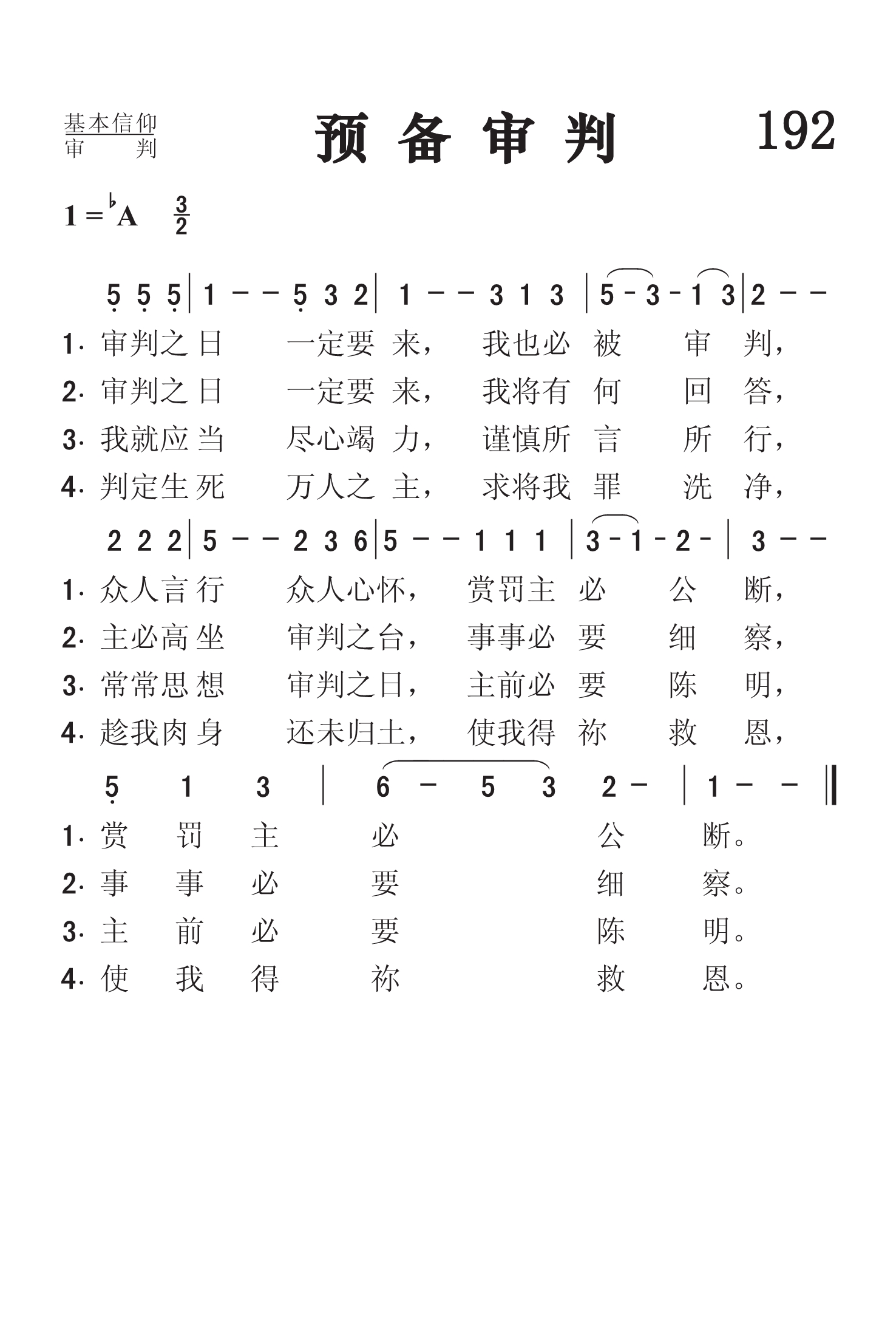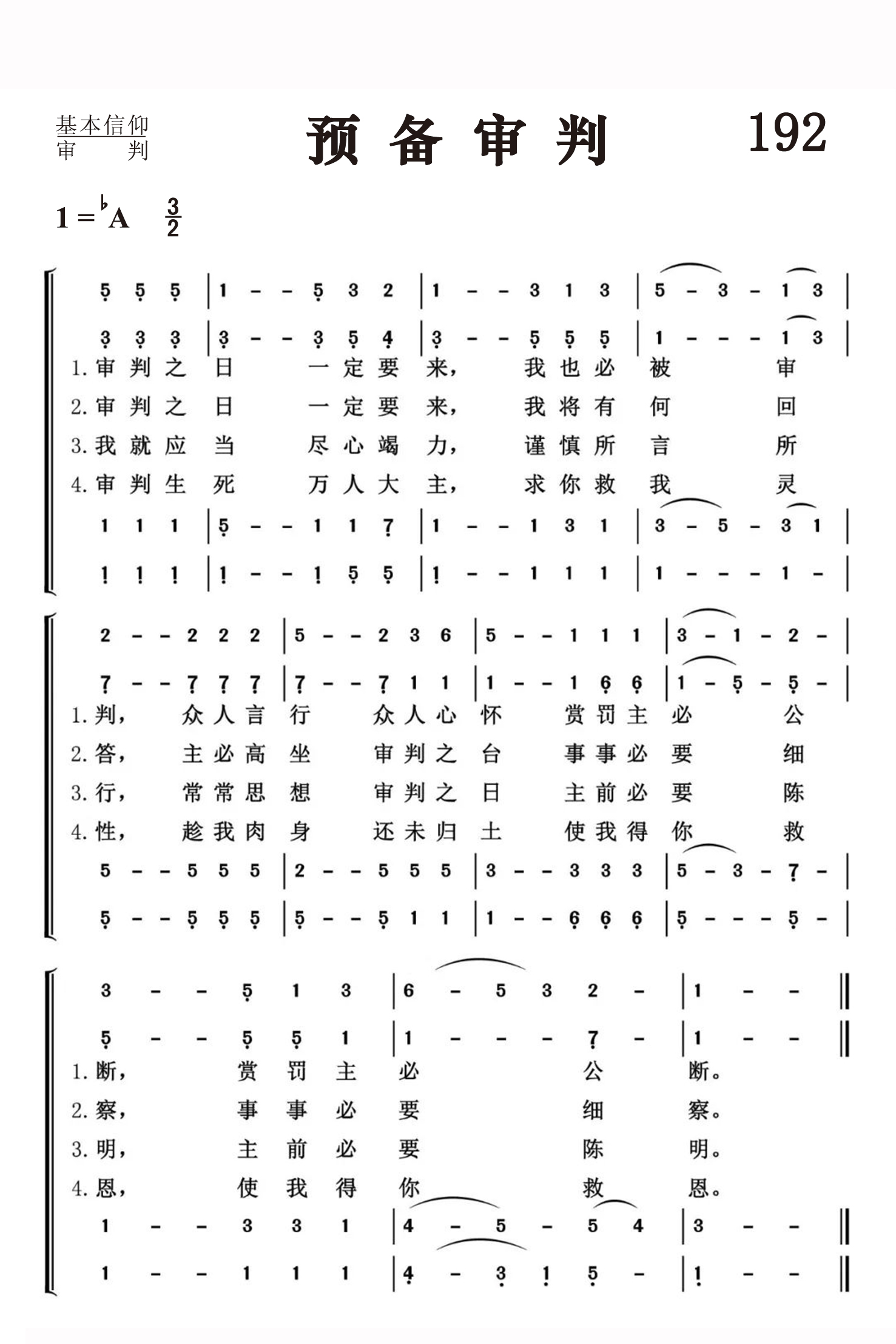 第192首预备审判 The Judgment Day 词作者佚名,伍德伯里(I.B.Woodbury,1819-1853)作曲 审判之日,一定要来,我也必被审判; 众人言行,众人心怀,赏罚主必公断。 审判之日一定要来,我将有何回答, 主必高坐审判之台,事事必要细察。 我就应当尽心竭力,谨慎所言所行, 常常思想审判之日,主前必要陈明。 判定生死万人之主,求将我罪洗净, 趁我肉身还未归土,使我得祢救恩。 上帝秉公审判天下万民,这是圣书真理的重要主题之一。善有善报,恶有恶报。虽然我们的言行可能暂时逃脱世人的查究,但暗中监察的主已在天上的册子中记录了我们哪怕是最细微的行为和动机。到了审判的日子,我们是无法逃脱的。所以我们要像本诗第四节所唱的,赶紧求主用宝血洗净我们的一切罪孽,趁着今生短暂的光阴,接受主耶稣的奇妙救恩,使我们的罪恶的记录,能在天上的册子中得以涂抹,好享受离罪的自由和快乐。 曲作者伍德巴里是著名的圣诗编辑兼作曲家。他出生于美国马萨诸塞州贝弗里市,自幼在附近的波士顿学习音乐。19岁前往伦敦和巴黎进修。他在波士顿教了6年书,随马萨诸塞州合唱团走遍新英格兰。后来住到佛蒙特州的贝洛斯福尔斯,组织了新罕布尔什和佛蒙特音乐协会。1849年他定居纽约市,指导拉特格斯街教会音乐直至1851年因健康原因离职。他担任《纽约音乐评论》的编辑,1852年再赴欧洲为杂志搜集资料。1858年他因劳累过度而病倒。原想去南方调养,不料在到达加州南部的哥伦比亚后的三天逝世。他作曲的还有318首《行在光中》,611首《巍巍圣堂》和港版416首《天国景象》等。