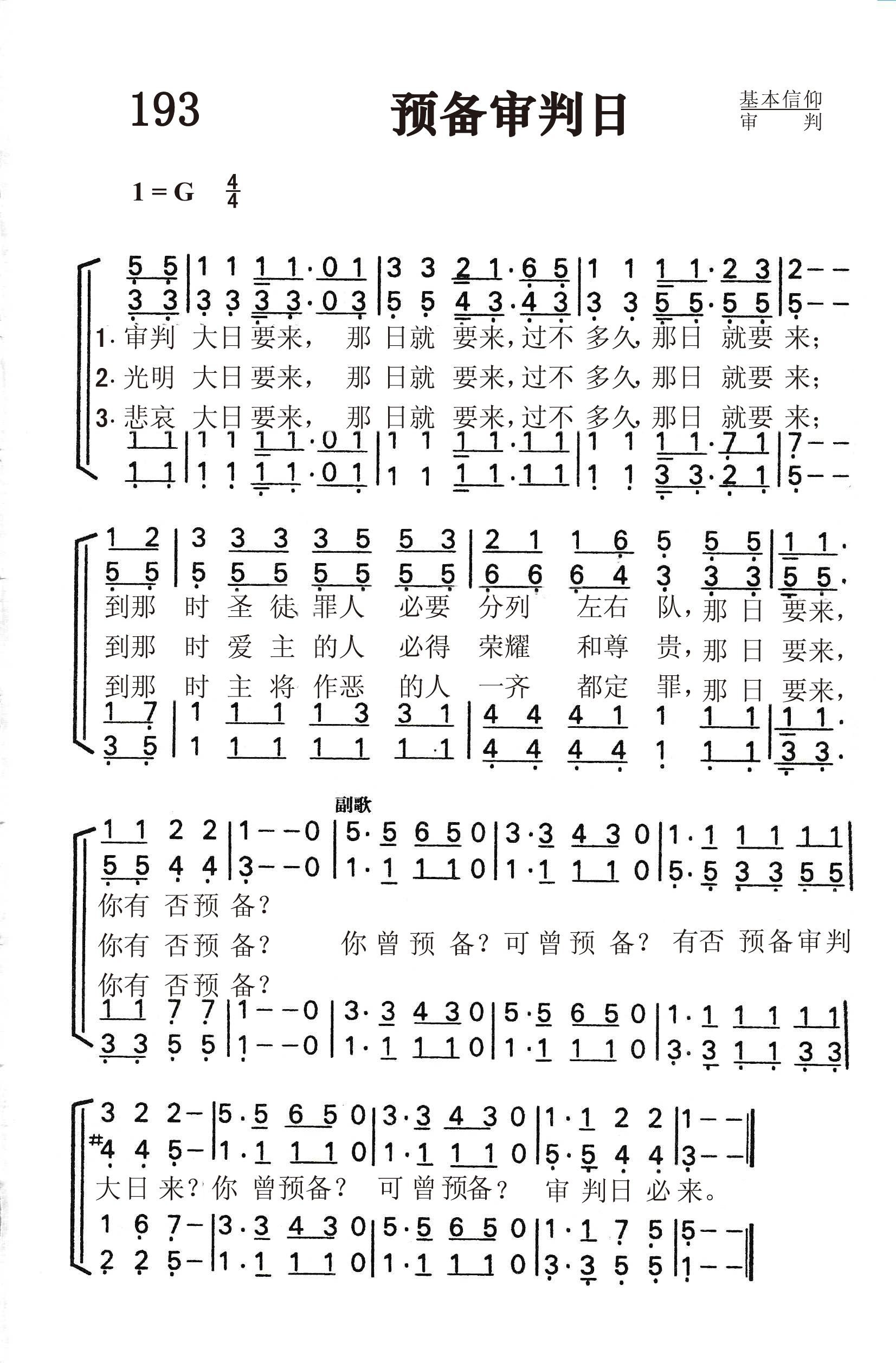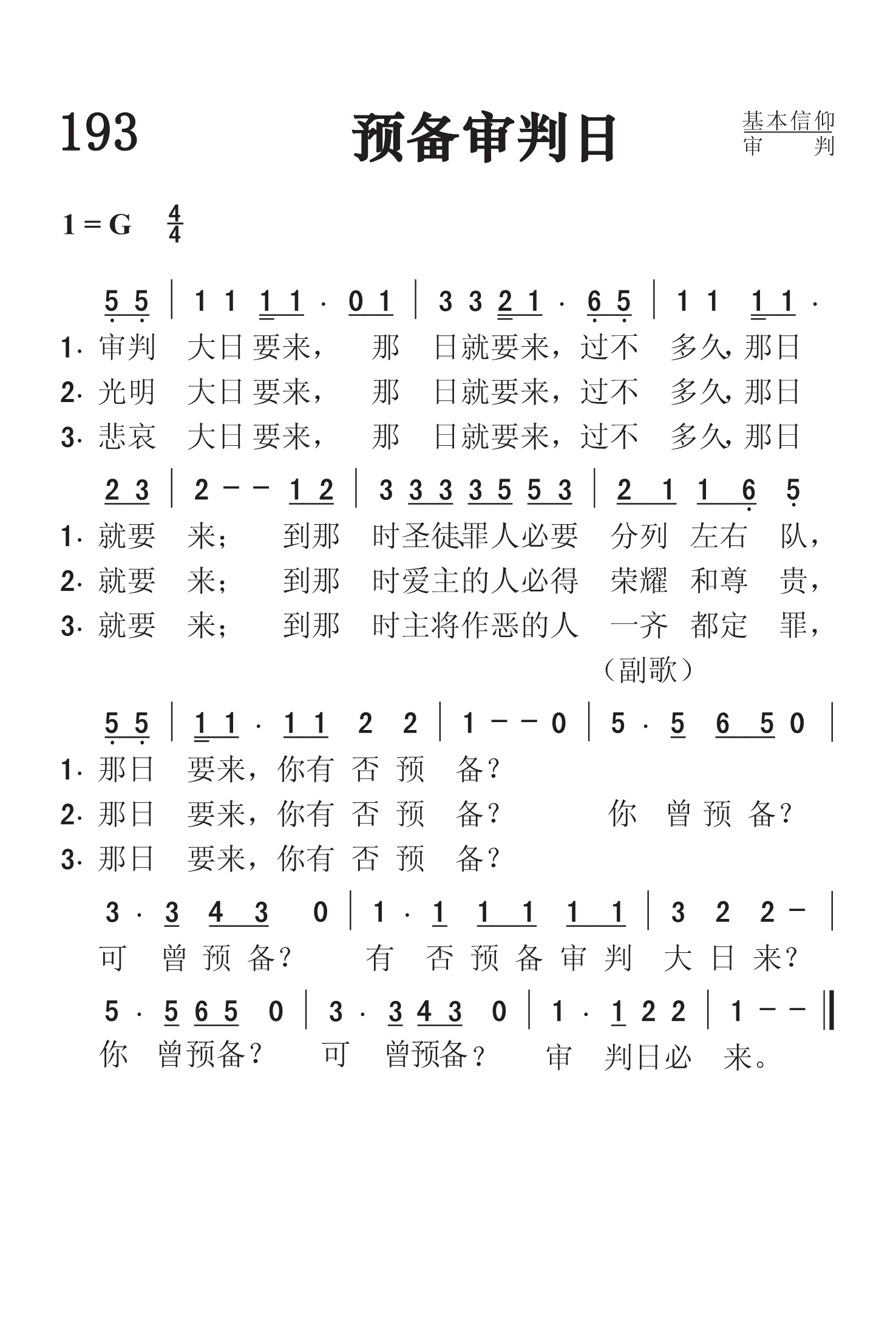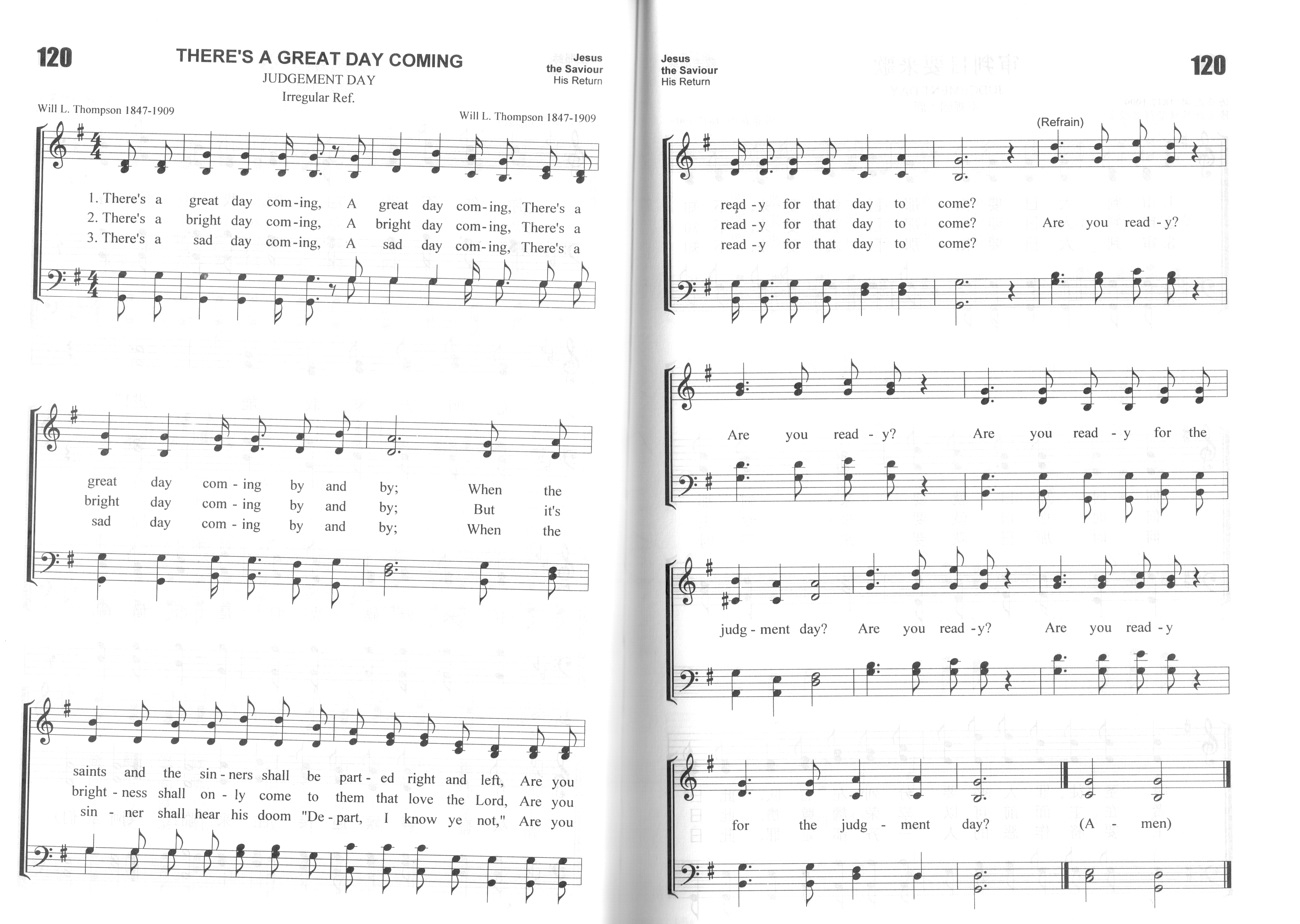 第193首预备审判日There ’s a Great Day Coming 汤普森(Will.L.Thompson,1847,11,7-1909,2,20)作词作曲 审判大日要来,那日就要来,过不多久,那日就要来; 到那时圣徒\罪人必要分列左右队,那日要来,你有否预备? 光明大日要来,那日就要来,过不多久,那日就要来; 到那时爱主的人必得荣耀和尊贵,那日要来,你有否预备? 悲哀大日要来,那日就要来,过不多久,那日就要来; 到那时主将作恶的人一齐都定罪,那日要来,你有否预备? 你曾预备 可曾预备有否预备审判大日来 你曾预备可曾预备审判日必来。 汤普森的这首诗歌也是以审判作为主题的。当基督复临之时,耶稣要坐在白色的大宝座上审判天下的万民。那时已经准备好的义人将受到主永远的奖赏,进入那荣耀的天城。但对于尚未准备好的罪人来说,乃是永久的遗憾。所以我们要趁着今生短暂的时光,赶紧接受耶稣为个人的救主,靠着祂的恩典,过得胜的生活,克服与生俱来和后天养成的一切罪恶倾向。这样,我们就回坦然无惧地面对将来。 被誉为“俄亥俄的诗人”和“百万富翁歌唱家”的汤普森出生于美国俄亥俄州的东利物浦,父亲是个商人。他自幼即表现出音乐天才,16岁就开始制谱作曲。他从波士顿音乐学校毕业以后,留学德国,学成回国后分别在芝加哥和他的故乡创办汤普森出版社,主要印刷发行音乐书刊。他除了自己创作福音圣诗以外,还出版了许多爱国歌曲。他的作品很受欢迎,成为当时很有名望的青年音乐家。他觉得这一切都是上帝特别的施恩和祝福,就决心完全奉献,将他的天才全部用在圣诗创作中去。他在自己的出版社里专门出版圣诗和赞美上帝的乐谱。单是四重唱一项就发行了两百万份,使他的福音歌曲不胫而走,传遍全球。当时交通很不便,农村既无留声机,也无收音机,农民没有机会听到有名的歌曲,汤普森就用马车装上钢琴深入农村自编自唱,受到群众的欢迎。布道家慕迪称赞说:“汤普森的品德与他创作的诗歌是一致的——真诚,朴素,正直。”
