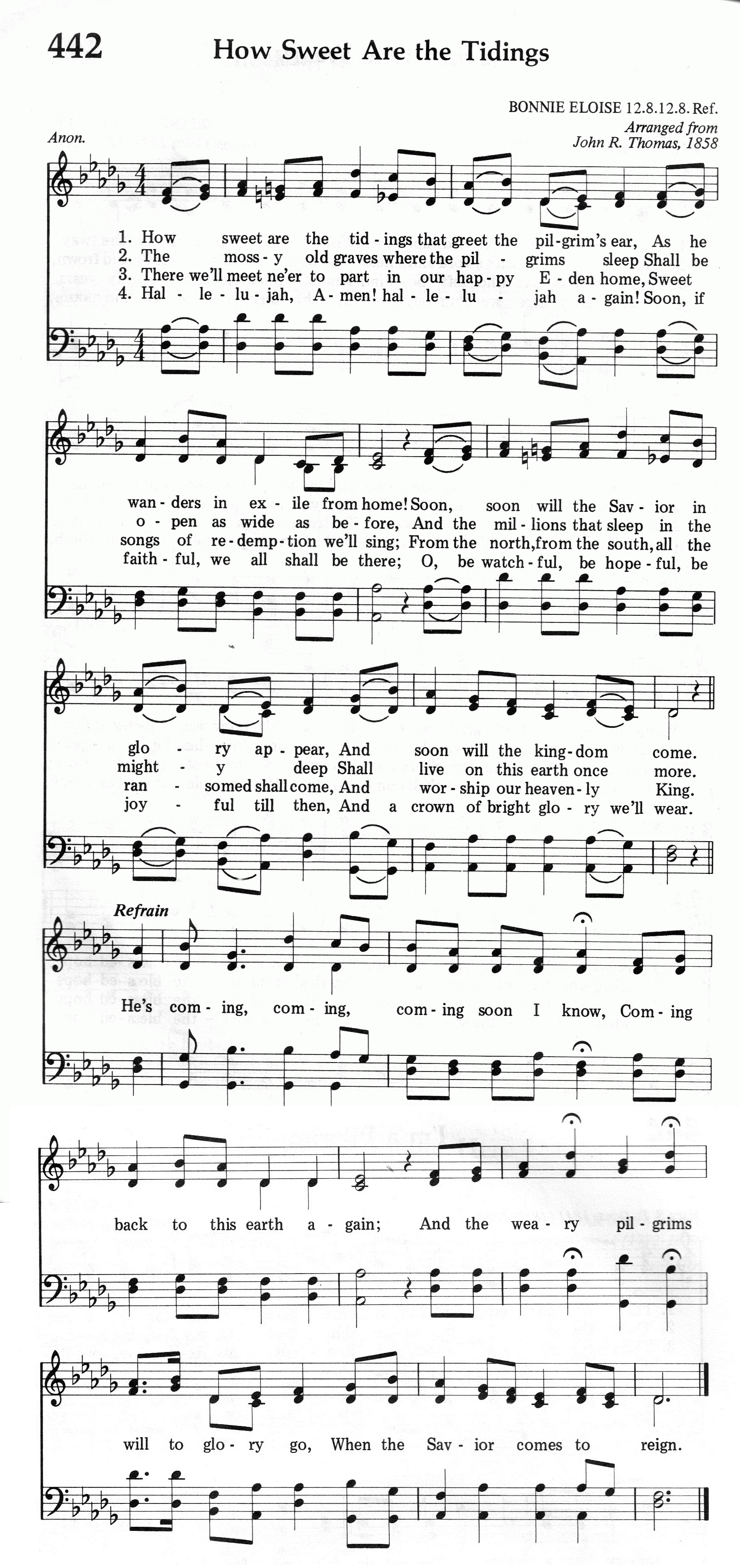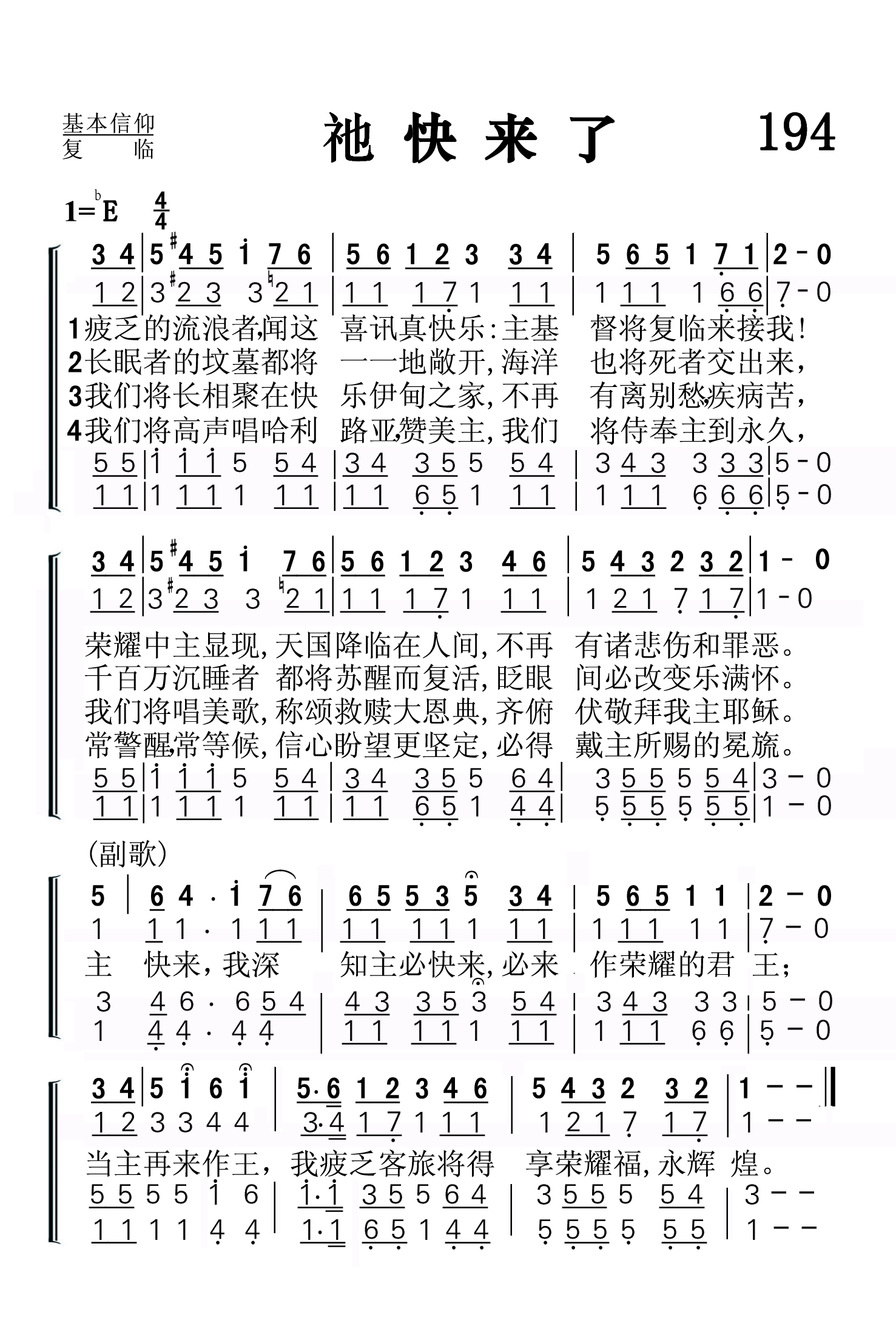 第194首祂快来了He’s Coming 约翰.托玛斯(John Rogers Thomas,1830.3.26-1896.4.5)作曲(1858年),赵典仁、吴涤申汉译 疲乏的流浪者,闻这喜讯真快乐:主基督将复临来接我! 荣耀中主显现,天国日后在人间,不再有诸悲伤和罪恶。 长眠者的坟墓都将一一地敞开,海洋也将死者交出来, 千百万沉睡者都将苏醒而复活,眨眼间必改变乐满怀。 我们将长相聚在快乐伊甸之家,不再有离别愁,疾病苦, 我们将唱美歌,称颂救赎大恩典,齐俯伏敬拜我主耶稣。 我们将高声唱哈利路亚,赞美主,我们侍奉主直到永久, 常警醒常等候,信心盼望更坚定,必得戴主所赐的冠冕。 主快来,我深知主必快来,必来作荣耀的君王; 当主再来作王,我疲乏客旅将得享荣耀福,永辉煌。 这是一首早期复临诗歌,收录在《SDA赞美诗》第442首。曲作者约翰.托玛斯出生于英国威尔士。他以男中音歌手和作曲家的身份随一个英国歌剧团来到美国,对发展中的美国音乐产生了兴趣。他随布赖恩特旅行音乐团出行歌唱,后定居在纽约。他写了一百多首美国流行歌曲和三部大型作品,还写了一些圣歌,在布鲁克林和纽约市担任教师。