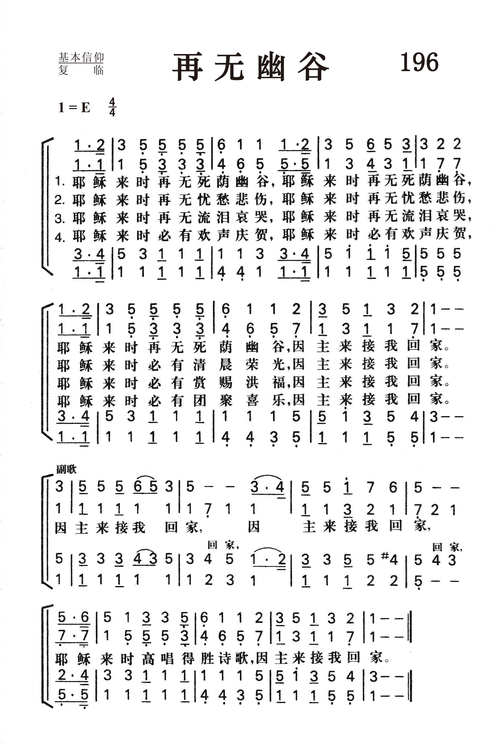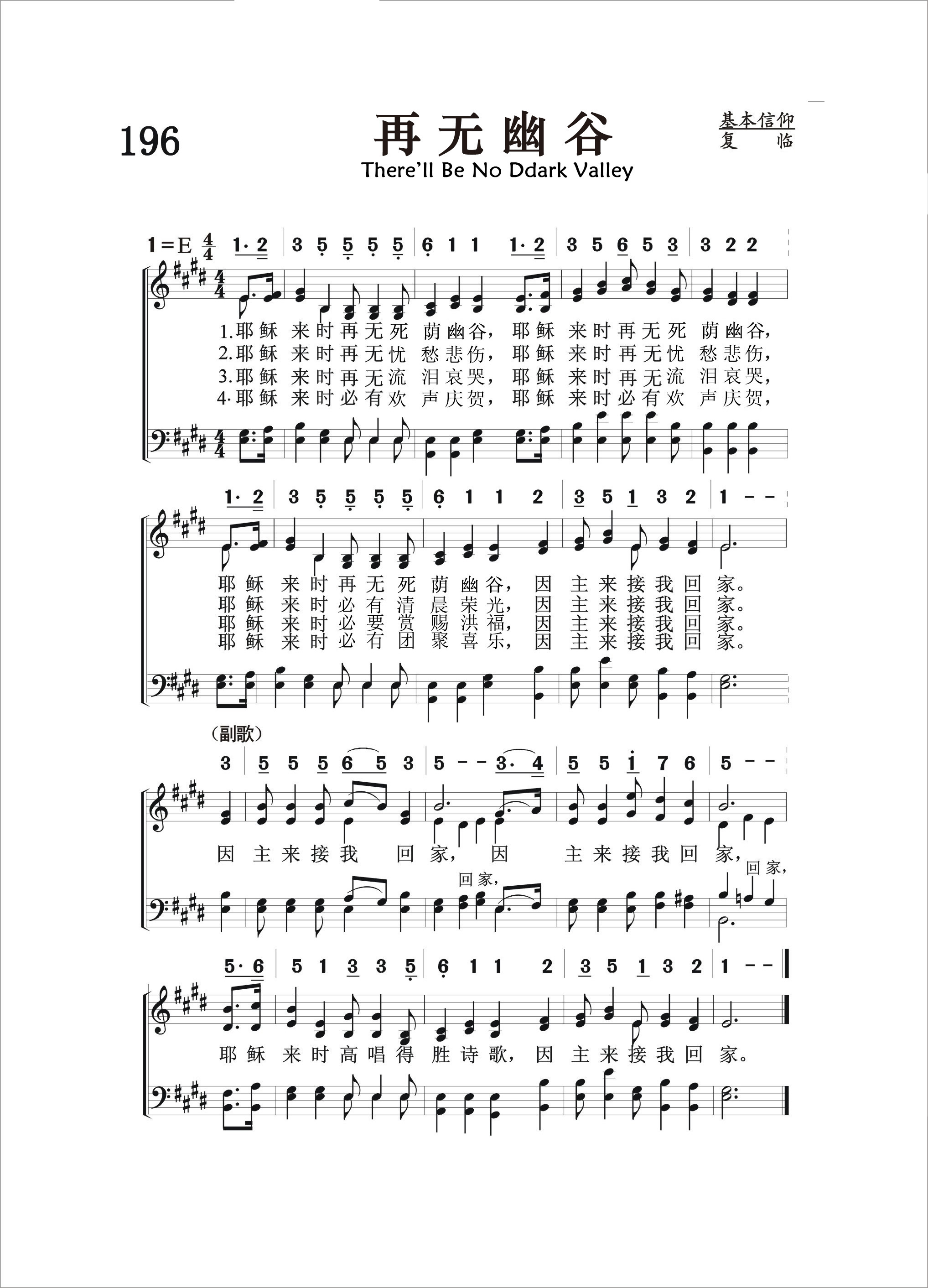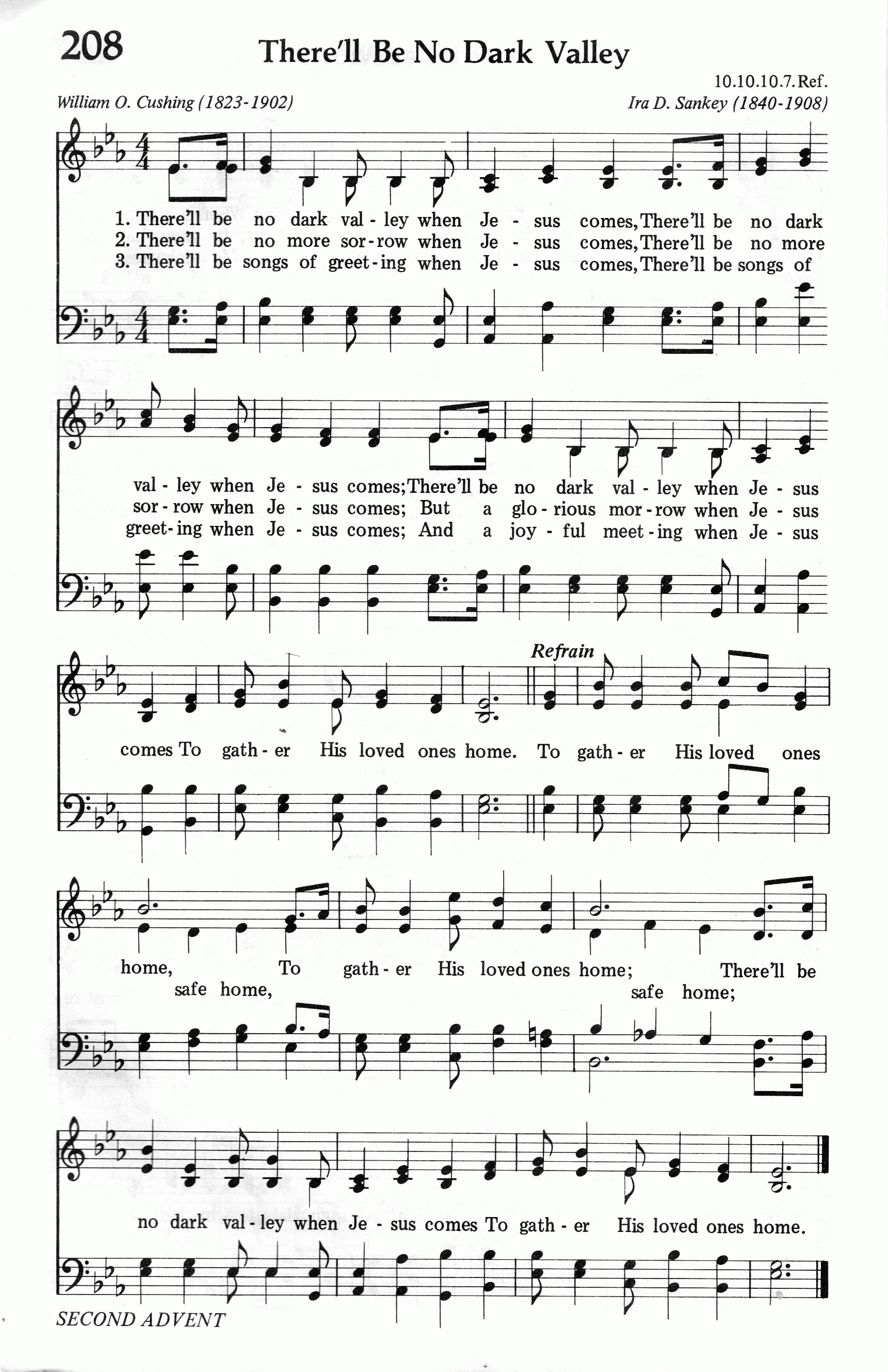 第196首 再无幽谷There’ll be no dark valley 库欣(WOCushing, 1823-1902)作词,桑基(Ira D.Sankey,1840-1908)作曲 耶稣来时再无死荫幽谷,耶稣来时再无死荫幽谷, 耶稣来时再无死荫幽谷,因主来接我回家。 耶稣来时再无忧愁悲伤,耶稣来时再无忧愁悲伤, 耶稣来时必有清晨荣光,因主来接我回家。 耶稣来时再无流泪哀哭,耶稣来时再无流泪哀哭, 耶稣来时必要赏赐洪福,因主来接我回家。 耶稣来时必有欢声庆贺,耶稣来时必有欢声庆贺, 耶稣来时必有团聚喜乐,因主来接我回家。 因主来接我回家,因主来接我回家。 耶稣来时高唱得胜诗歌,因主来接我回家。 “我虽然行过死荫的幽谷,也不怕遭害”(诗23:4)。 这首诗歌描述主耶稣再来时的欢乐,表达了作者对生活的坚强信念,曾鼓舞许多在人生道路上跌倒的人,使他们重新鼓起勇气,改邪归正。有一位在大都市贫民区工作的传道士曾经这样写道:“我从内心的深处感觉到我应该感谢这首赞美诗的作者,因为我唱这首诗歌时,从中得到了主耶稣的极大恩惠。我也清楚地看到,这首诗歌曾使许多跌倒的人重新站立起来。当我们战胜了罪恶的死亡,见到了主耶稣以后,就再无忧伤,流泪,再无死荫的幽谷。这首诗不但使我,而且许多人因信而在主复临时,可再无幽谷而‘高唱得胜诗歌’。” 但愿感动他们的灵,也大大地感动我们。 词作者库欣于美国新英格兰,自幼信主;青年时代受奋兴布道的影响,献身事奉主,担任牧师圣职。1870年他47岁时,不幸患病,健康恶化。后来疾病虽愈,但口以不能说话,无法再宣传主道,于是求主赐下写作圣诗的才能。此后,他以惊人的毅力写了圣诗三百余首,感动了许多人。他以坚强的信心,在世上又生活了三十三年,去世时80岁。他的圣诗多由鲁特、桑基、劳里等福音派圣诗作曲家为他配曲。 《颂赞诗歌》228首《美载乐园》,272首《天国钟声悠扬》,527首《蒙主保佑》,第571首《隐藏于耶稣》,606首《耶稣珍宝》等,也是库欣作词的。 曲作者桑基生于美国宾夕法尼亚州,自幼参加教会活动。17岁时,他的父亲说:“我看这孩子将来除了每天在腋下夹着一本赞美诗到处歌唱之外,不会找别的工作。”的确,他经常在教会的主日学中教唱赞美诗,后来果然成为一位世界著名的福音圣诗歌唱家。他曾担任宾夕法尼亚州青年会的总干事。为建造青年会会址,他募集了4万美元。后来他与慕迪(Moody)同工,在布道会上教唱福音诗歌,也曾编辑并创作过许多首赞美诗。他曾经将他的作品编辑好,准备出版,但一次失火将他的原稿烧毁。1906年他眼睛失明后,还出版了一本《我的生平及福音赞美诗的故事》。在书中说:“我不是一个音乐家,也不是一个歌唱家,我从来没有学过声乐,也没有受过艺术教育,但我对所唱诗歌的每一句和每一字都深有体验。我每唱一首诗都必须把它唱到每一个听众的心里。我常感到好的旋律易找,但好的歌词却不易找。” 桑基一生创作了几十首福音赞美诗,其中三十首至今仍在教会的聚会中传唱。
