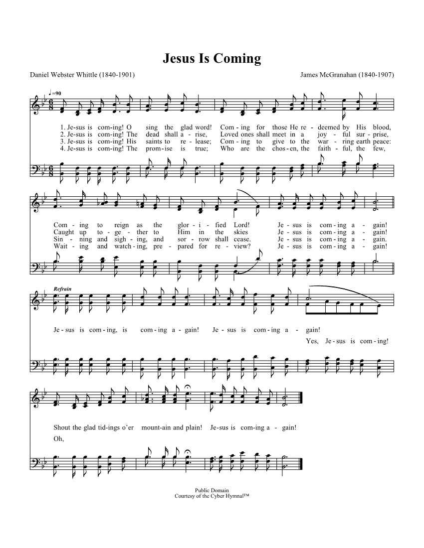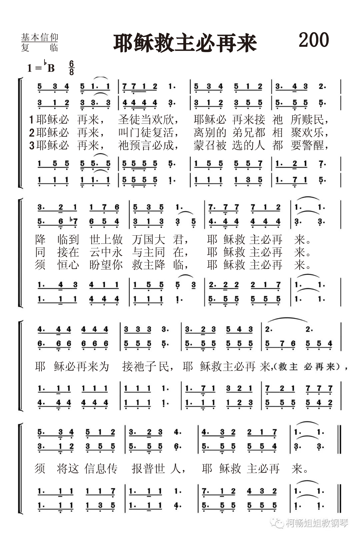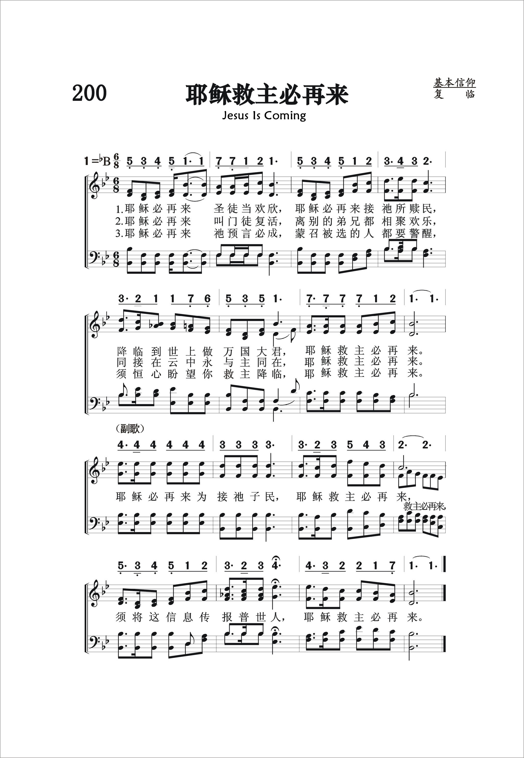 第200首 耶稣救主必再来Jesus Is Coming 惠特尔(D.W.Whittle,1840,11,22-1901,3,4)作词,麦格雷纳汉(James McGranahan,1840,7,4-1907,7,9)作曲。 耶稣必再来,圣徒当欢欣,.耶稣必再来接祂的赎民, 降临到世上做万国大君,耶稣救主必再来。 耶稣必再来,叫门徒复活,离别的弟兄都相聚欢乐, 同接在云中永与主同在,耶稣救主必再来。 耶稣必再来,祂预言必成,蒙召被选的人都要警醒, 须恒心盼望你救主降临,耶稣救主必再来。 耶稣必再来为接祂子民,耶稣救主必再来, 须将这信息传报普世人,耶稣救主必再来。 词作家丹尼尔. 惠特尔是美国奋兴布道家和歌唱家,出生在美国麻萨诸塞州。他在少年时代随家迁往芝加哥,因家庭贫苦很早就参加工作,担任银行职员。廿一岁时参加南北战争,在步兵营任少尉,后晋升到陆军少校。 1862年夏,在他结婚的翌日,他随舍曼将军(General Sherman)进军海滩,在维克斯堡(Vicksburg)战役中受伤,失去右手而被俘。 在俘虏营中,他想到母亲在他参军前送给他的一本圣书,就拿出来阅读,因圣灵的感动,他接受了十字架的救恩。 战后在芝加哥一家有名的钟表公司担任司库。 不久他遇见著名布道家慕迪。 他们的相遇相知,改变了惠特尔的一生。1873年,他辞去了高薪的工作,加入了慕迪布道团。后与慕迪,桑基,斯宾斯特等一同周游各大城市布道。晚年他自己也动手写诗,深受同道的欢迎。最初,他与布利斯配合从事音乐圣工。布利斯意外身亡后,他便与作曲家麦格雷纳汉(James McGranahan)同工。 他写了二百多首圣诗,多数是麦格雷纳汉谱曲。他们两人曾多次同赴英国布道。他们合作的名诗,尚有《主活在我心》(Christ Liveth in Me),《高举主旗》(The Banner of the Cross)等。 惠特尔在圣诗创作上有较高的造诣。他说:“我不希望创作一首不包含信息的圣诗。所写的诗要以上帝的话为基础,传递上帝爱的信息”。他认为福音诗歌创作的严肃性值得人们付出最高的代价。他写诗除了注重实质内容以外,还在结构上严格遵守音步和韵律的规则。他共创作了二百来首圣诗。慕迪曾说:“我认为惠特尔少校创作了本世纪一些最优秀的圣诗”。 115首《恩雨大降》和 539首《时刻蒙恩》(谱曲是他的女儿,也是慕迪的儿媳)也是他作词的。 曲作者麦格雷纳汉出生于美国的一个农民家庭,所受的正式教育很有限,却靠自己的努力和爱好,使他在19岁时就出任音乐教师。以后他到纽约州布雷德伯里所办的音乐学校短期学习,接着便参加福音布道团以歌声宣扬主名。1877年,福音歌唱家、作曲者布利斯突然去世,他便与诗人惠特尔合作,组织布道团,旅行美国各地并前往英国,担任唱诗班领唱,以他优美动听的男高音和亲切感人的魅力大获成功。他还首先组织完全是男声的唱诗班,曾与桑基,鲁特•斯特宾斯等人合编出版多本福音诗歌集,其中较有名的有《男声福音圣诗》二卷,《福音圣诗》等。他自己也写诗,如《颂赞诗歌》317首《信主得生命》。