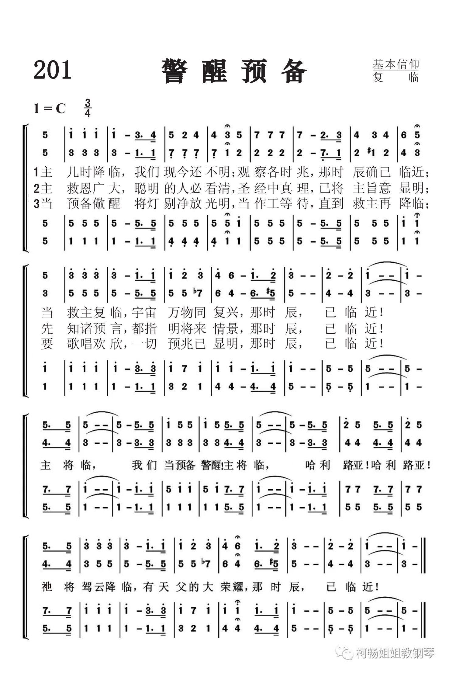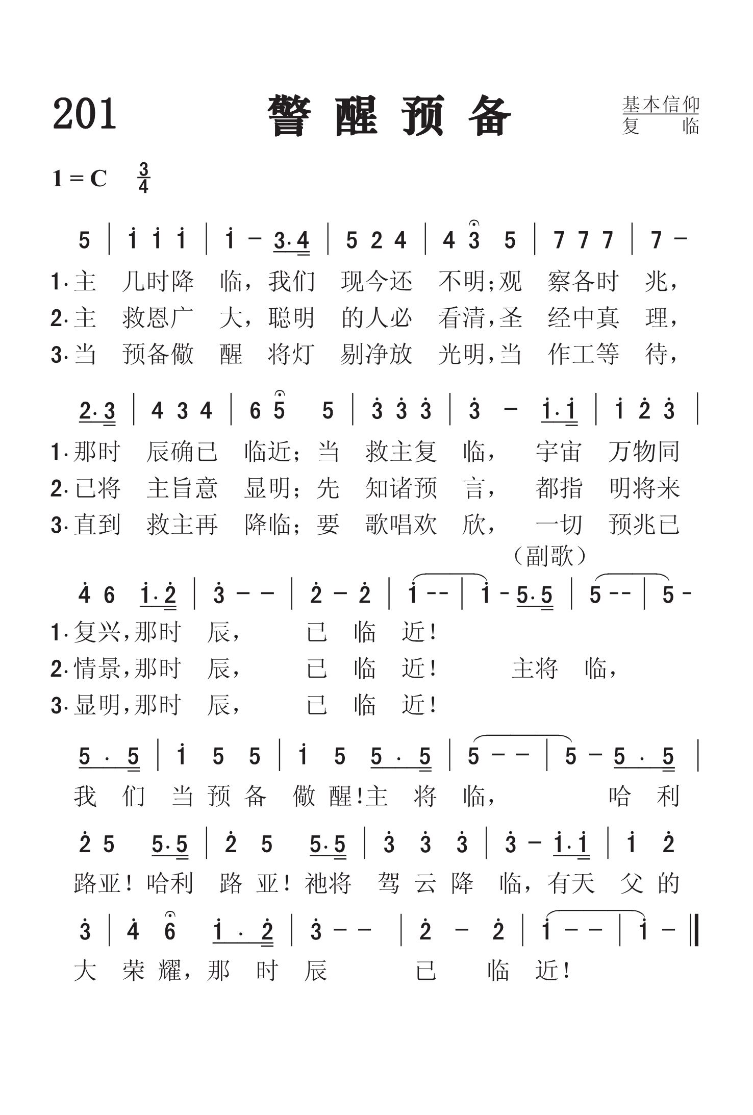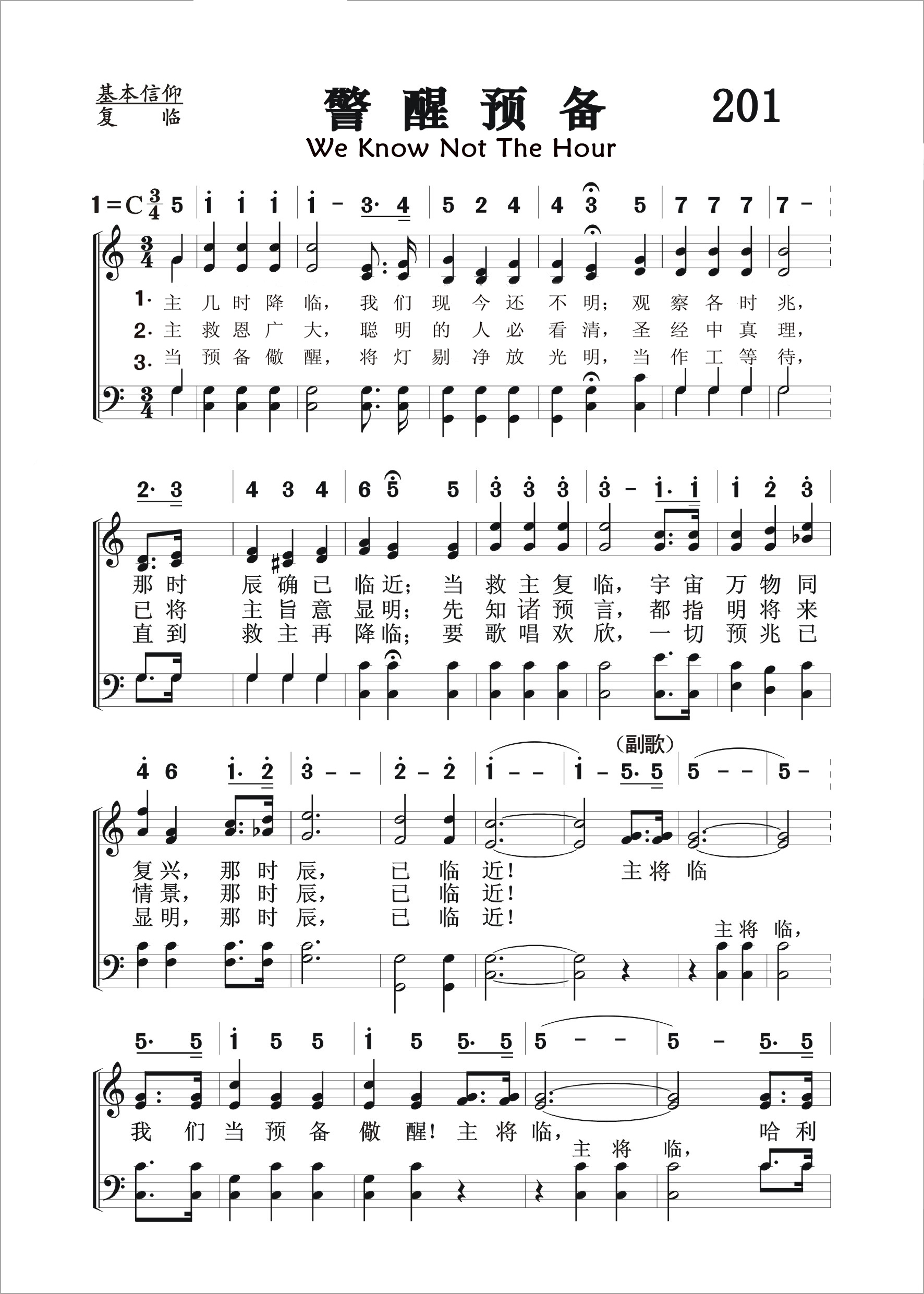 第201首警醒预备We Know Not the Hour 贝尔登(Franklin.B.Belden,1858-1945)作词作曲(1886年) 主几时降临,我们现今还不明;观察各时兆,那时辰确己临近; 当救主复临,宇宙万物同复兴,那时辰,已临近! 主救恩广大,聪明的人必看清,圣书中真理,已将主旨意显明; 先知诸预言,都指明将来情景,那时辰,已临近! 当预备儆醒,将灯挑亮放光明,当作工等待,直到救主再降临, 要歌唱欢欣.一切预兆已显明,那时辰,已临近! 主将临,我们当预备儆醒!主将临,哈利路亚!哈利路亚! 祂将驾云降临,有天父的大荣耀,那时辰,已临近! 这是一首优美而鼓舞人心的有关基督复临的诗歌。其经文依据也是《马太福音》第24章。作者贝尔登是复临派最杰出的音乐家之一,也是基督复临安息日会早期赞美诗的主要编辑。他曾就读于巴特尔克里克学院,1876年在加州开始教会音乐工作,后因健康原因迁往克罗拉多州。1881年他与一位极具音乐天赋的女子结合。贝尔登具有惊人的即兴创作努力。他常常在集会的时候当场用牧师的讲题写诗。等到牧师讲完道时,他连曲调也配好了,然后夫妇二人登台献唱,作为礼拜的结束曲。他逝世以后,所有的文稿都存放在基督复临安息日会的神学院里。