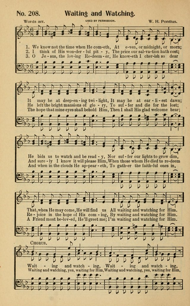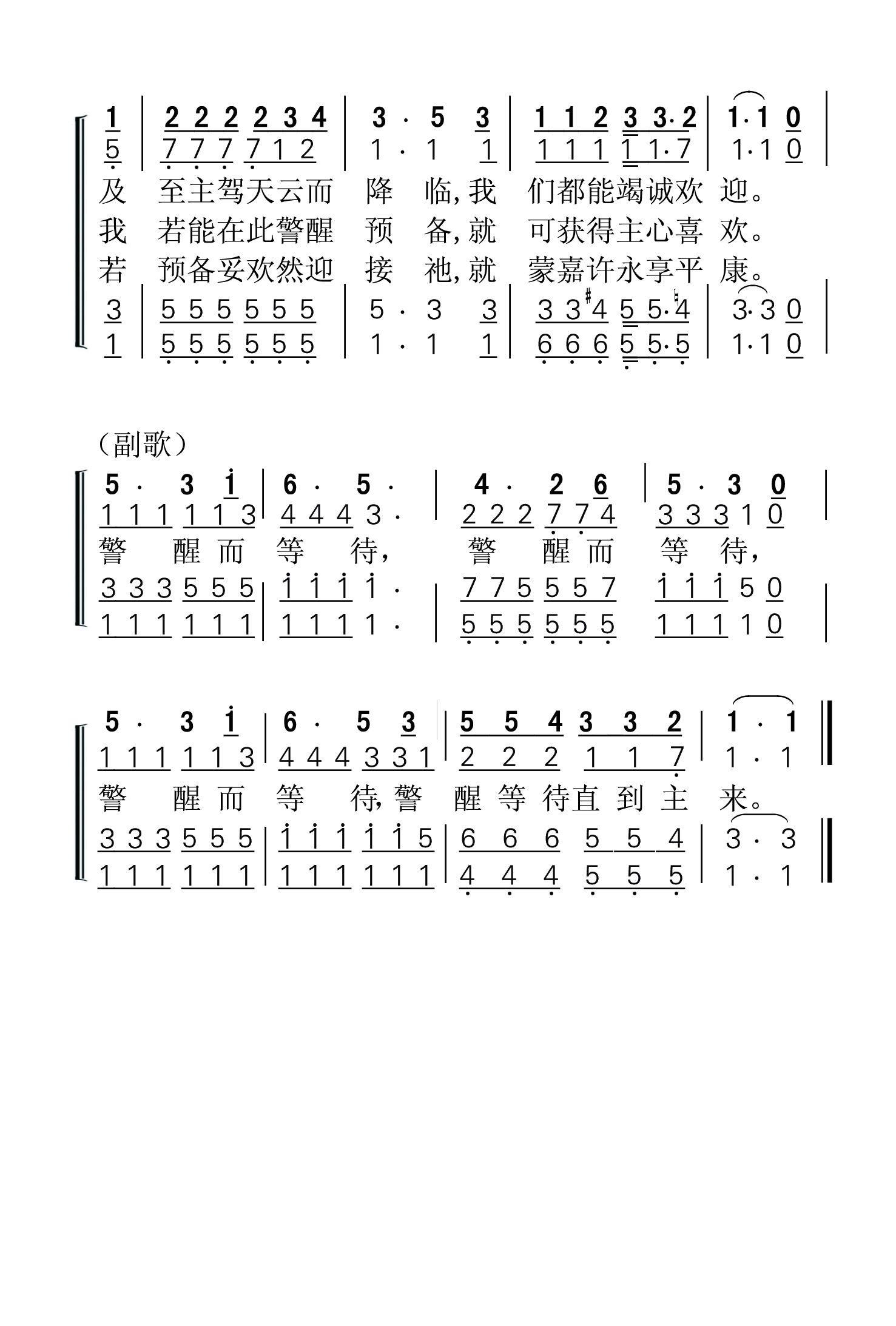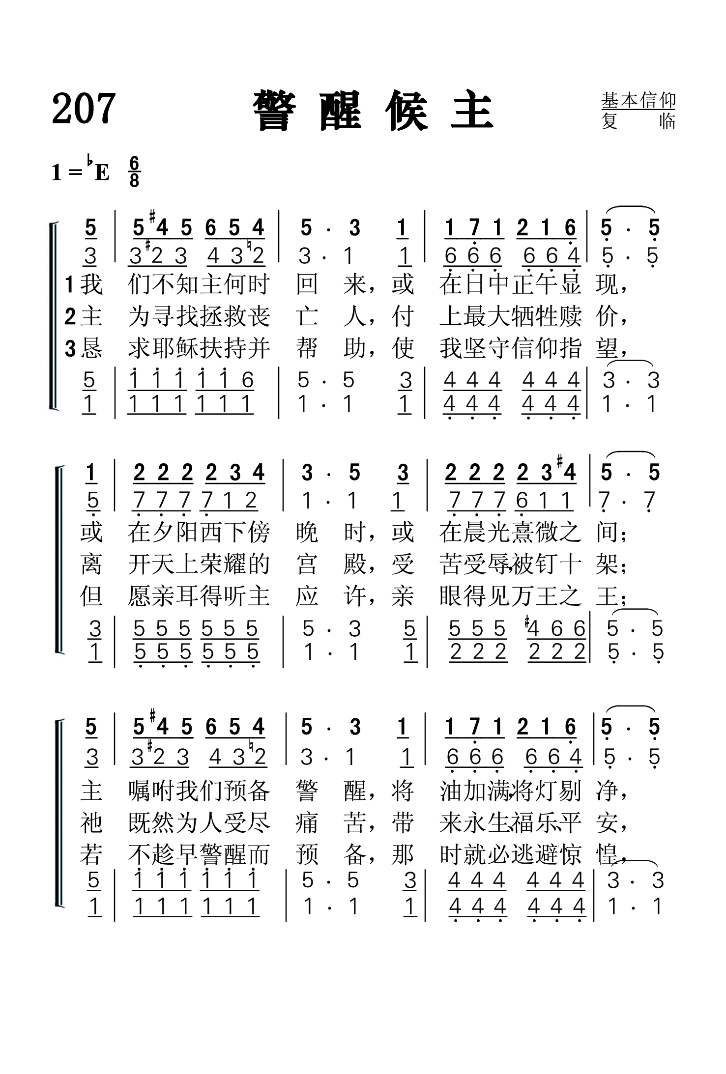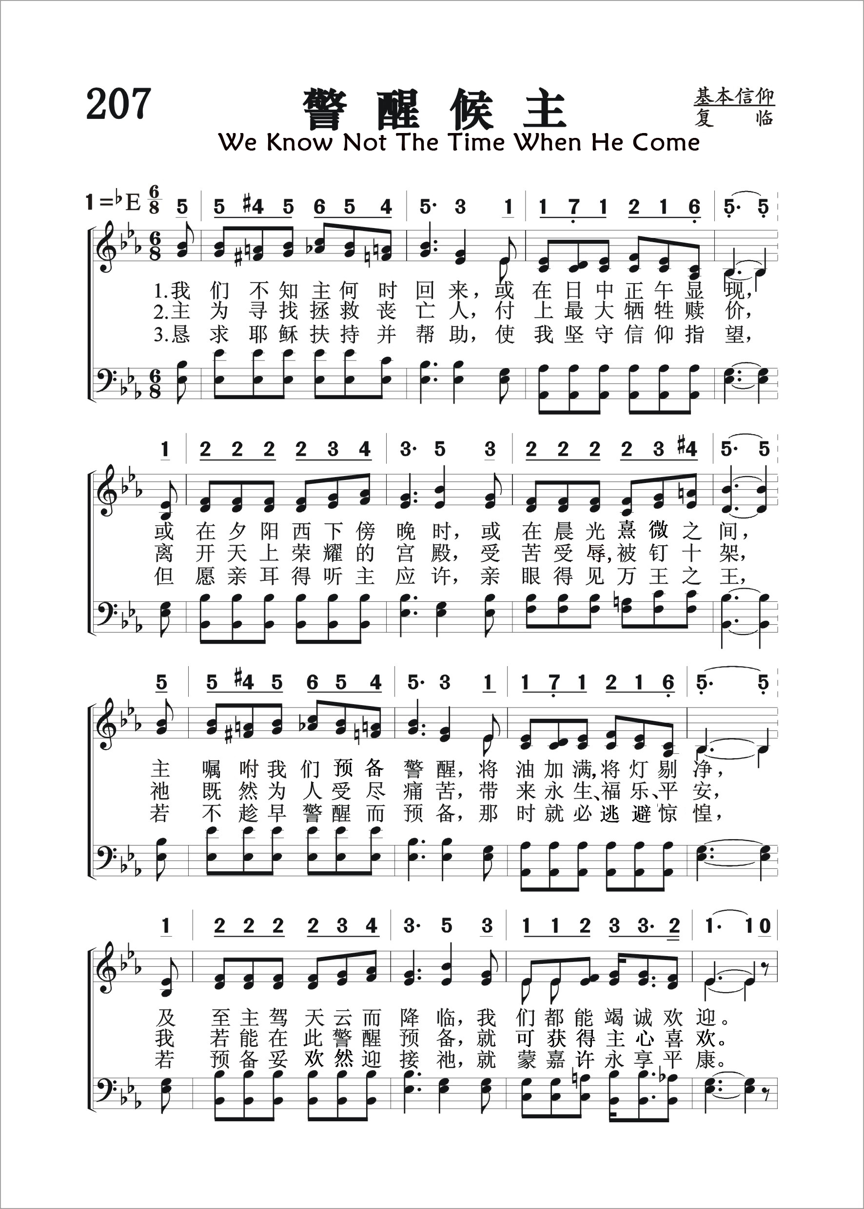 第207首警醒候主We Know Not the Time When He Come S.M.H作词,庞修斯(Will H.Pontius)作曲 我们不知主何时回来,或在日中正午显现, 或在夕阳西下傍晚肘,或在晨光黎明之间, 主嘱咐我们时刻警醒,将油加满将灯剔净, 及至主驾天云而降临,我们都能竭诚欢迎。 主为寻找拯救丧亡人.付上最大牺牲赎价, 离开天上荣耀的宫殿,受苦受骂被钉十架, 祂既然为人受尽痛苦,带来永生、福乐、平安, 我若能在此警醒预备,就蒙嘉奖永享平康。 恳求耶稣扶持并帮助,使我坚守信仰指望, 但愿亲耳得听丰应许,亲眼得见万王之王, 若不趁早警醒而预备,那时就必逃避惊惶, 若预备妥当而迎接祂.就蒙嘉奖永享平康。 警醒而等待,警醒而等待, 警醒而等待,警醒等待直到主来。 这首以基督复临为主题的赞美诗,用真诚感人的语言,表达了基督徒世代相传的坚定信念。第一节说明我们并不知道救主在何时何刻降临,所以要剔净灯火,随时作好准备。第二节回顾救主为拯救丧亡人类而降世受苦受难,奉劝我们感怀主的救恩,警醒预备,好让主的心意得到满足。第三节是祈求和盼望,同时也是信徒愿意警醒等候的心声。本诗词曲作者的生平不详。
