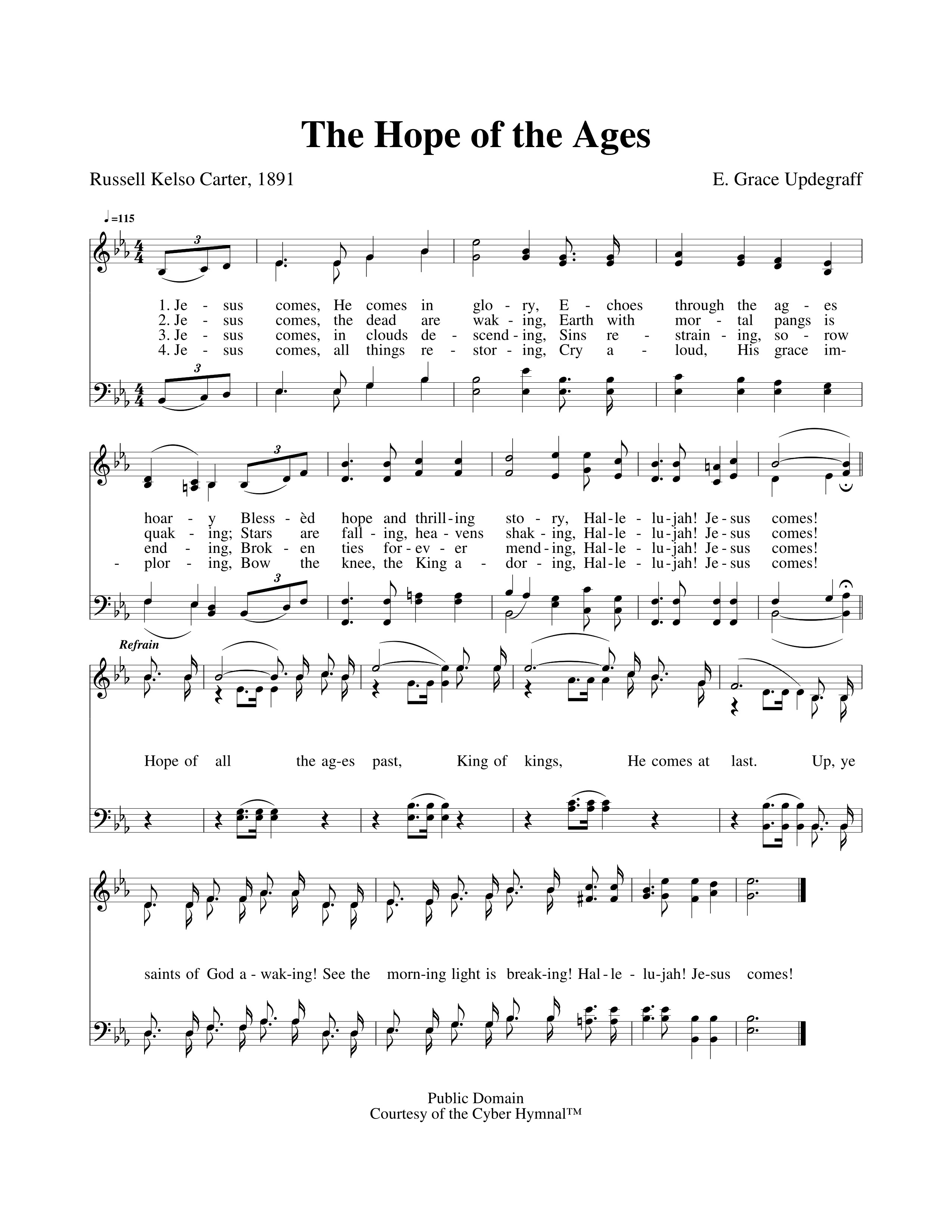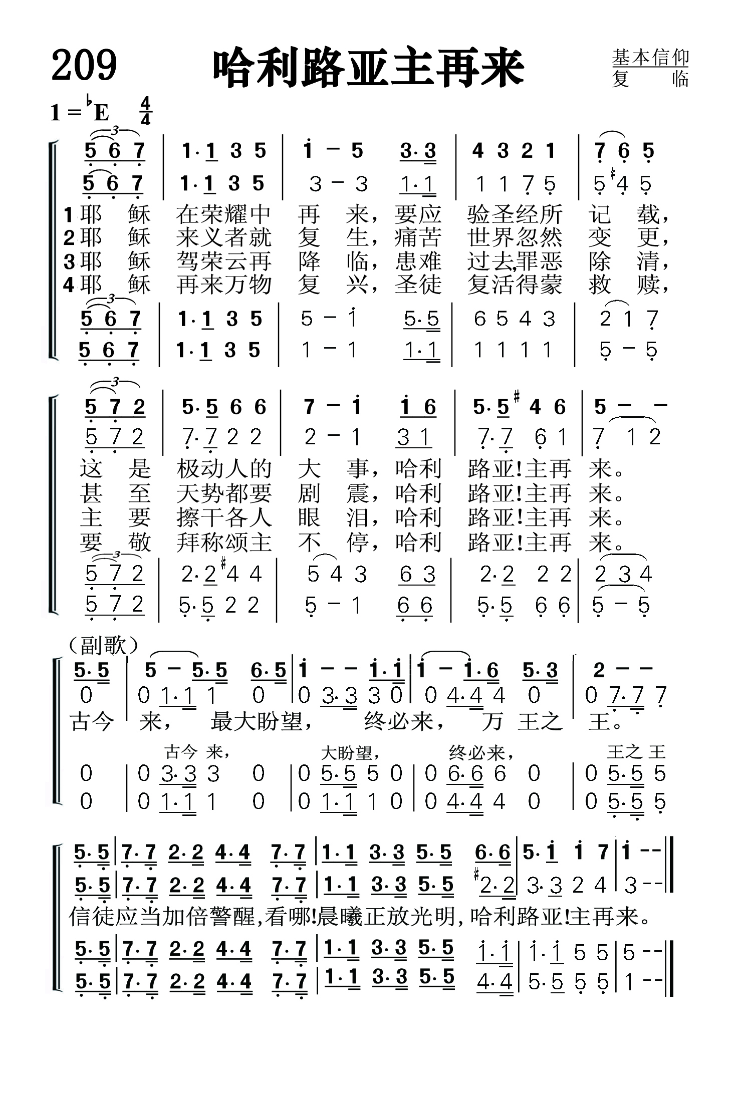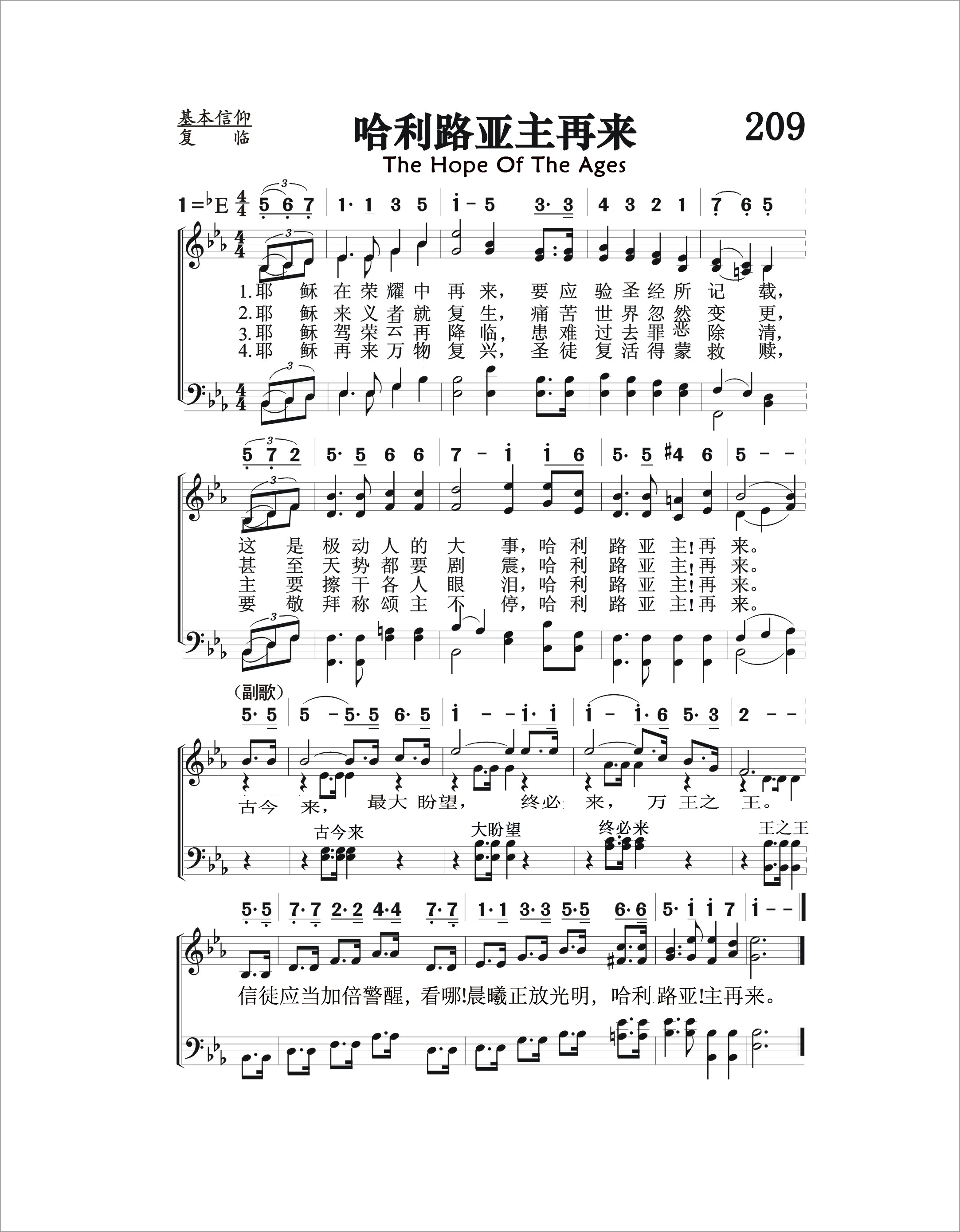 第209首 哈利路亚主再来The Hope of the Ages 卡特(Russell K.Carter,1849,11,18-1926)作词,厄普德格拉夫(Eliza.Grace Updegraff,1871,2,16-1964,6,25)作曲 耶稣在荣耀中再来.要应验圣书所记载, 这是极动人的大事,哈利路亚!主再来。 耶稣来义者就复生,痛苦世界忽然变更, 甚至天势都要剧震,哈利路亚主再来。 耶稣驾荣云再降临,患难过去罪恶除清, 主要擦干各人眼泪,哈利路亚!主再来。 耶稣再来万物复兴,圣徒复活得蒙救赎, 要敬拜称颂主不停,哈利路亚!主再来。 主耶稣万王之王,有一日终必再来。 听啊号筒已经吹响.看哪耶稣驾云而来,哈利路亚!主再来。 这是一首有关基督复临的诗歌。词作者拉塞尔.卡特出生于美国巴尔的摩市,毕业于宾夕法尼亚州军事学院第一期,为杰出的棒球运动员。1869年留校任教。1872年升任化学与自然科学教授。1881年转任土木工程和高等数学教授。1873-1876年到加利福尼亚州牧羊。1887年接受卫理公会授予的牧师圣职,积极参与圣洁运动和露天布道会的活动。他在宗教,数学和自然科学方面著作甚丰,还出版小说若干本。他与辛普森合作,编写《基督徒生活诗歌》(1891年)。他创作了了其中52首的歌词和44首的曲谱,还改编了25首的曲谱。 曲作者厄普德格拉夫出生于美国俄亥俄州的芒特普莱曾特的一个公谊会的牧师家庭。作为一名歌唱家,钢琴家和作曲家,她在十九世纪九十年代与凯尔索.卡特合作。1906年,她与一位改革教会的牧师结婚。1964年她去世以后,她的女儿和女婿在芝加哥的森林湖学院设立奖学金以纪念她。
