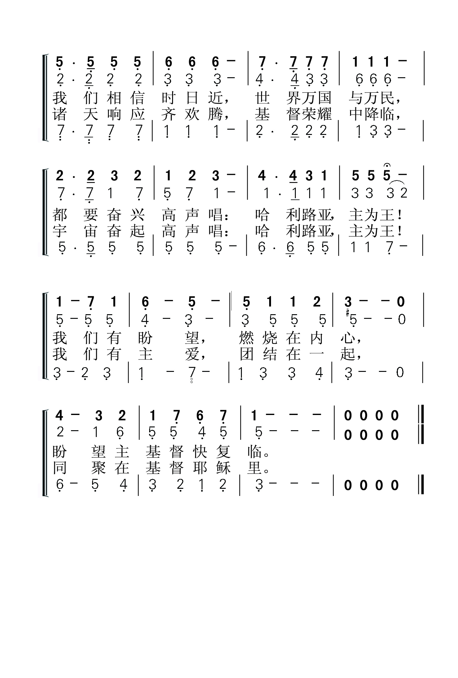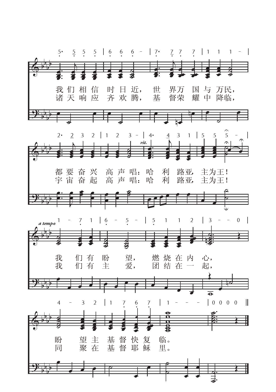 第210首 我们有盼望We Have This Hope 韦恩.胡珀(Wayne Hillard Hooper,1902.7.4-2007.2.27)作词作曲 我们有盼望,燃烧在内心,盼望主基督快临。 我们有信心,基督赐宏恩,信主应许喜乐无尽。 我们相信时日近,世界万国与万民, 都要奋兴高声唱:哈利路亚,主为王! 我们有盼望, 燃烧在内心,同聚在基督耶稣里。 我们有主爱, 团结在一起,同聚在基督耶稣里。 千万人面前, 主慈爱显明,恩典充满饥渴心灵。 诸天响应齐欢腾, 基督荣耀中降临, 宇宙奋起高声唱: 哈利路亚, 主为王! 我们有主爱, 团结在一起,同聚在基督耶稣里。 韦恩.胡珀出生在阿肯色州小石城,父亲是诗班歌手和声乐老师。他从加州莱斯雅拉大学获得音乐学位之后,曾在俄勒冈州的波特兰学院和内布拉斯加州林肯市的联合学院教授音乐。他在美国著名的圣乐组合《君王四重唱》中担任男中音达18年。他的歌声随着这个组合传遍美国、加拿大、中南美、加勒比地区和欧洲。他为这个组合作曲和配乐达33年,担任《预言之声》广播的音乐编导,和撒那出版社的经理,1985年版基督复临安息日会《赞美诗》的音乐编辑。他鉴于他的杰出贡献,安德烈大学和莱斯雅拉大学曾授予他荣誉音乐博士学位。《赞美诗》506版第52首《耶稣罪人奇妙良友》,第91首《圣婴孩基督已降生》,346首《我愿像耶稣》,357首《你在哪里吗》,423首《全无阻隔》,和第448《感恩歌颂》也是他创作或改编的。 他最著名的作品《我们有盼望》是他为1962年在旧金山举行的基督复临安息日会全球大会所写的主题曲。在1966年,1975年,1995年和2000年的全球大会上,这首歌依然作为主题曲,已翻译成多种文字。