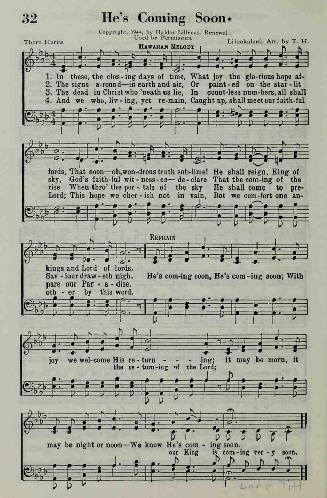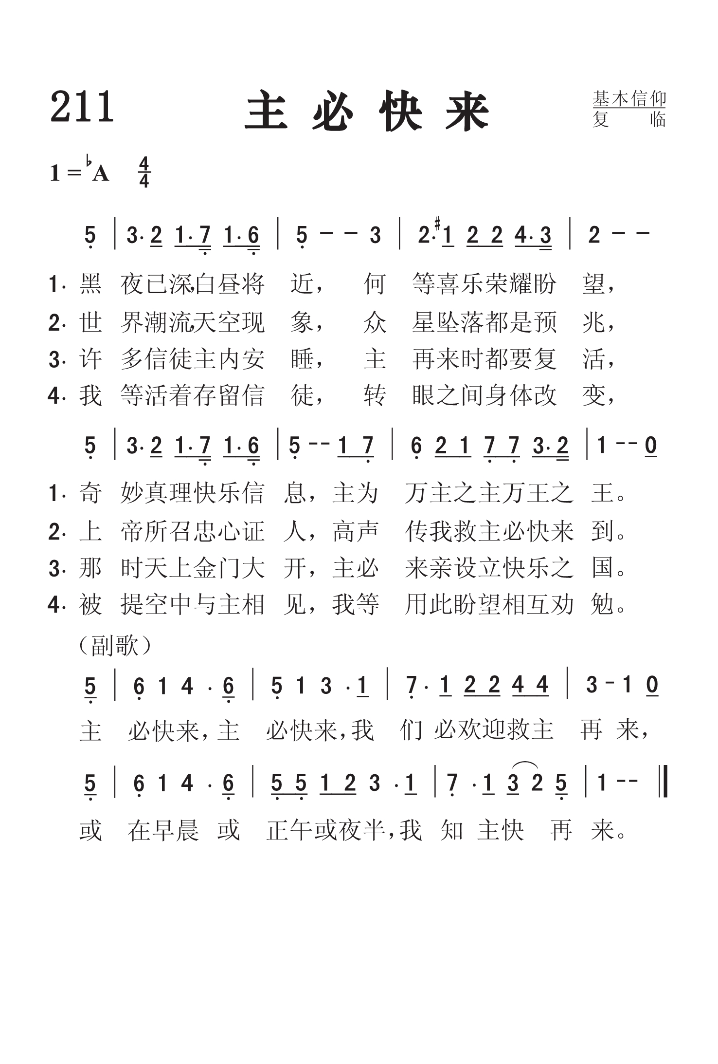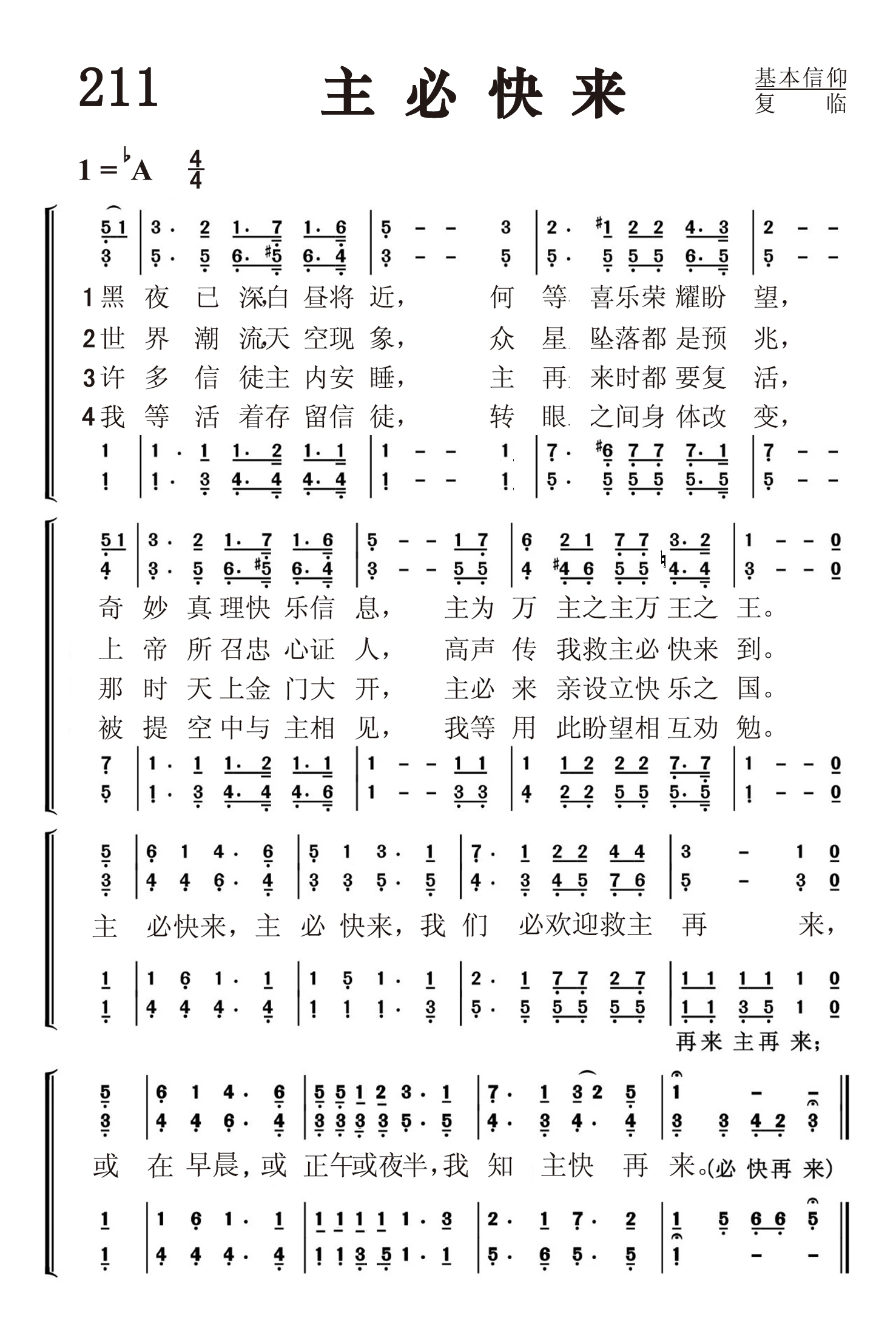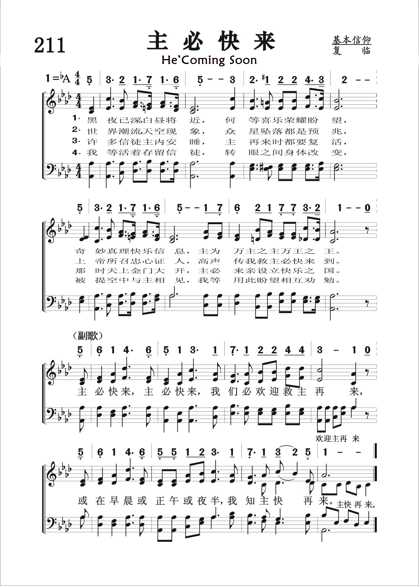 第211首 主必快来He’sComing Soon 索罗.哈里斯(Thoro Harris,1874,3,31-1955,3,27)作词并根据夏威夷民歌改编曲调(1918年) 黑夜已深,白昼将近,何等喜乐荣耀盼望, 奇妙真理快乐信息,主为万主之主,万王之王。 世界潮流天地景象, 众星坠落都是预兆, 上帝所召忠信证人,高声传我救主必快来到。 许多信徒主内安睡.主再来时都要复活, 那时天上金门大开,主必来亲设立快乐之国。 我等活着存留信徒.转眼之间身体改变, 被提空中与主相见,我等用此盼望相互勉勉。 主必快来,主必快来,我们必欢迎救主再来, 或在早晨或正午或夜半,我知主快再来。 这是一首仰望基督复临的赞美诗。诗人用世界上和自然界所发生的种种事件和圣书的应许,见证主的再来就在眼前。信徒务必警醒祈祷,作好充分的准备迎接主的来临。词作者索罗.哈里斯出生于美国首都华盛顿。曾就读于密歇根州的巴特尔克里克学院。1902年,他在波士顿创作了第一首圣诗。后应比洪(见《赞美诗》505版89首介绍)的邀请前往芝加哥。1932年他前往阿肯色州的尤里卡斯普林斯。他常常背着旅行袋四处销售福音书籍。本诗是他的代表作品。曲调是根据夏威夷民歌《俪歌》改编的。