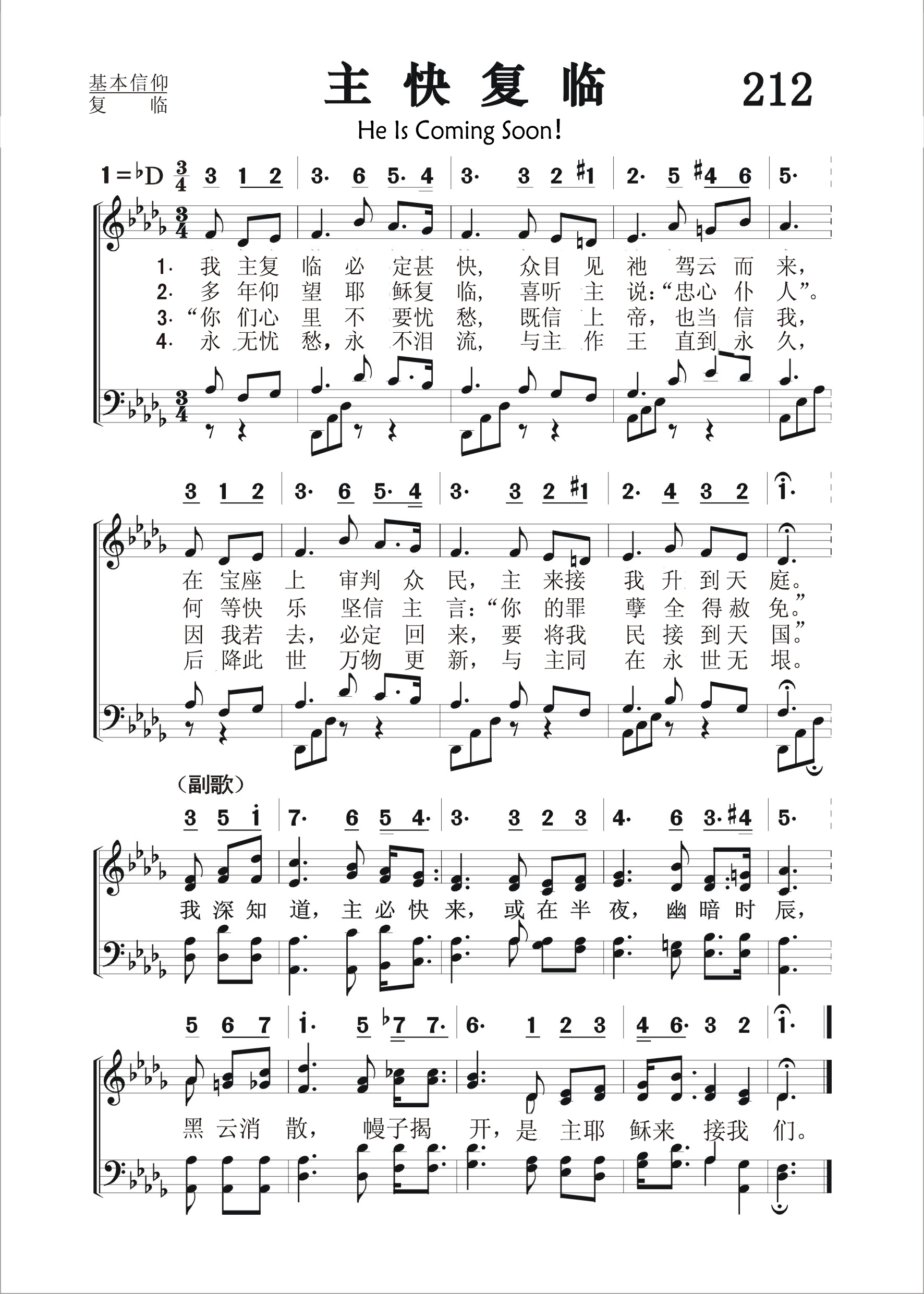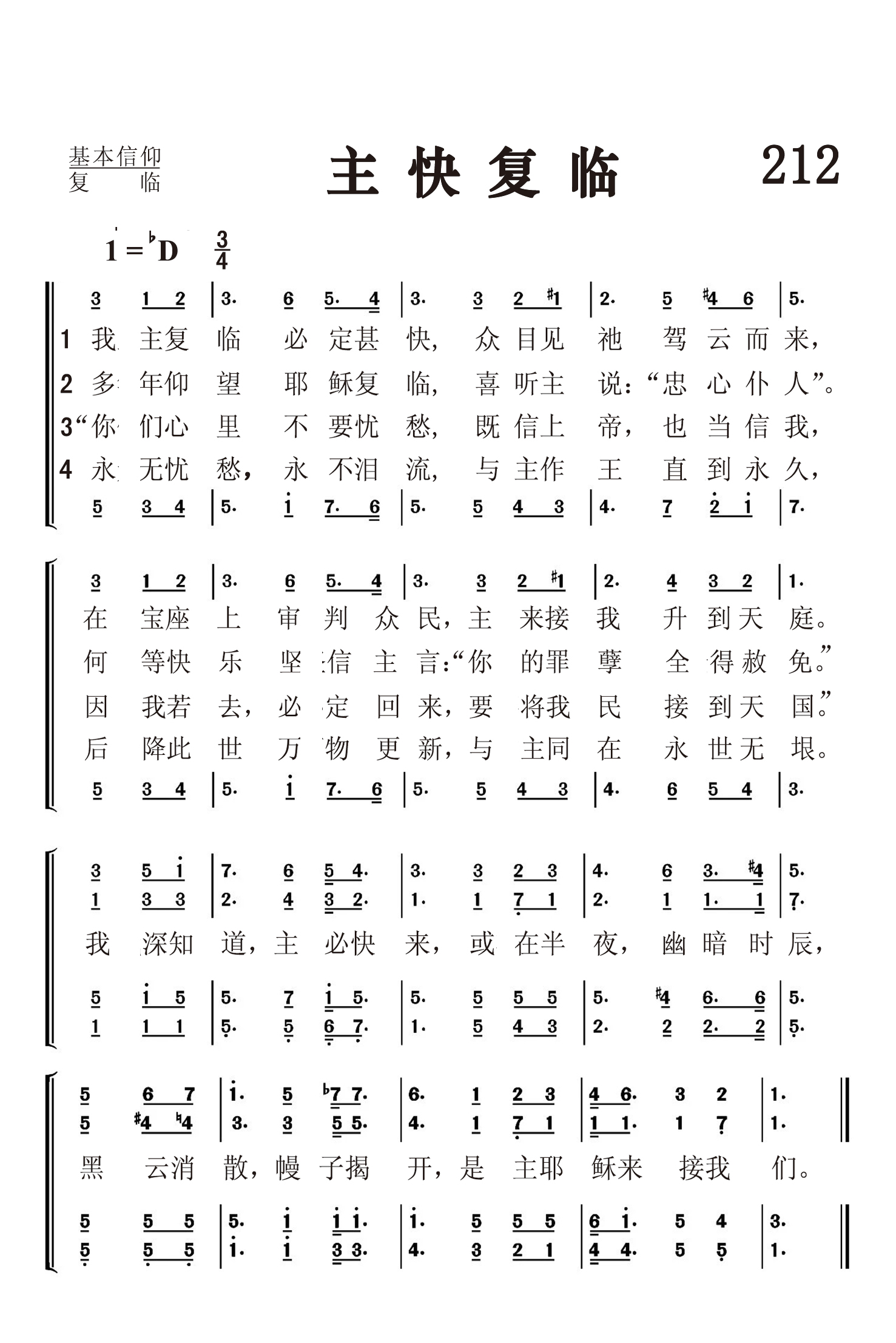 第212首主快复临 He Is Coming Soon! 我主复临必定很快,众目见祂驾云而来, 在宝座上审判众民,主来接我升到天庭。 多年仰望耶稣复临,喜听主说:忠心仆人。 何等快乐坚信主言:你的罪孽全得赦免。 “你们心里不要忧愁.既信上帝,也当信我, 因我若去,必定回来,要将我民接到天国”。 永无忧愁,永不泪流,与主作王直到永久, 后降此世万物更新,与主同在永世无垠。 我深知道,主必快来.或在半夜,幽暗时辰, 黑云消散,幔子揭开,是主耶稣来接我们。 这是一首以基督复临为主题的诗歌。自从救主辞别人世,驾云升天以来,历代信徒一直在盼望着祂带着荣耀回来,接他们回到永久的家乡。好在这样的等候不会太长久了。因为黑夜已深,白昼将近,所有的时兆都证明主的再来已近在眼前了。那时万象将要更新,上帝的儿女再也没有悲伤和流泪。他们要永远与主同在。
