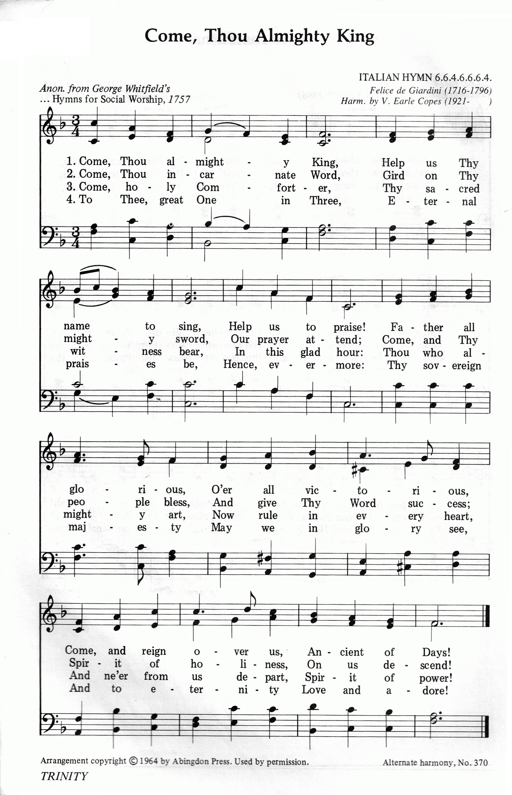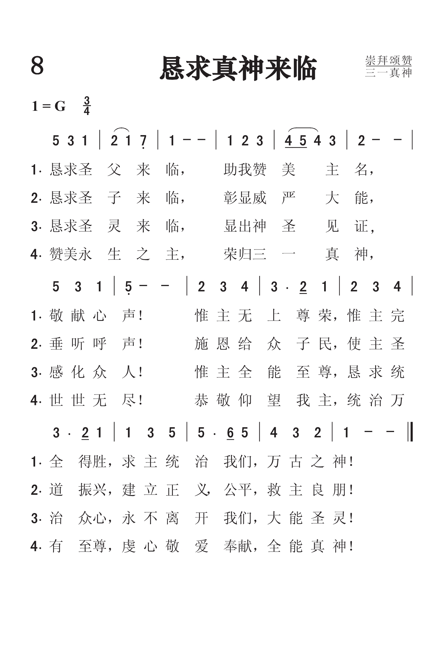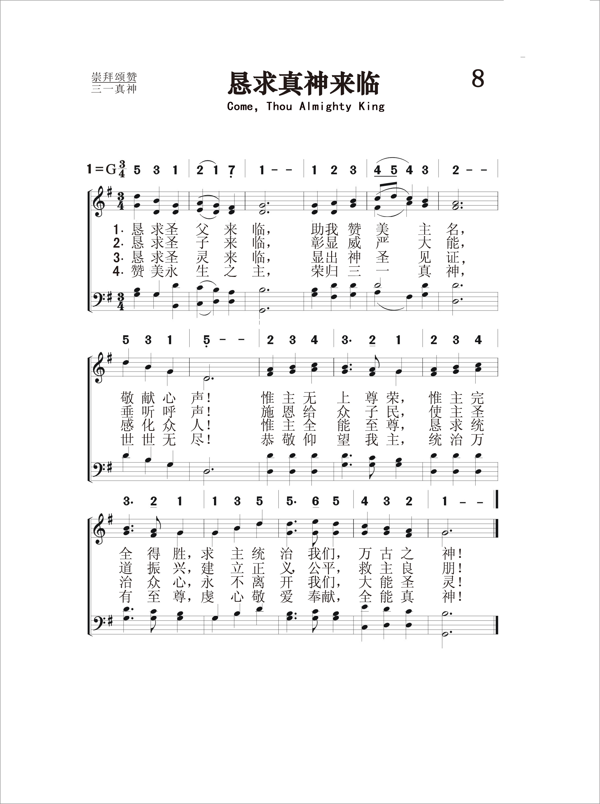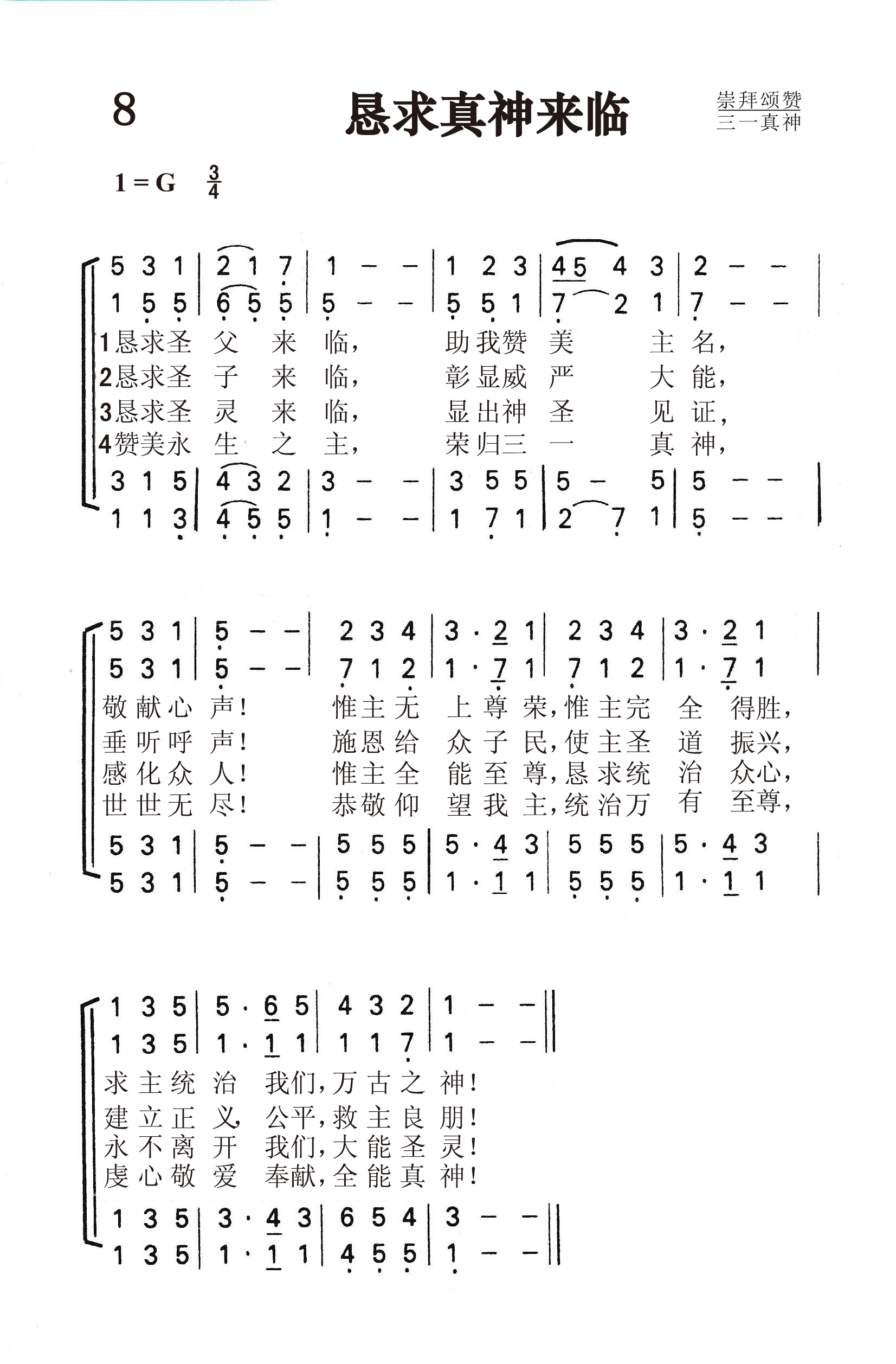 第8首恳求真神来临 Come,Thou Almighty King 据传查理.卫斯理作词,贾迪尼(F.Giardini,1716,4,12-1796)作曲,刘廷芳、杨荫浏原译(1934年) 恳求圣父来临,助我赞美主名,敬献心声! 惟主无上尊荣,惟主完全得胜, 求主统治我们,万古之神! 恳求圣子来临,彰显威严大能,垂听呼声! 施恩给众子民,使主圣道振兴, 建立正义,公平,救主良朋! 恳求圣灵来临,显出神圣见证,感化众人! 惟主全能至尊,恳求统治众心, 永不离开我们,大能圣灵! 赞美永生之主,荣归三一真神,世世无尽! 恭敬仰望我主,统治万有至尊, 虔心敬爱奉献,全能真神! 在赞美三一真神的圣诗中,《恳求真神来临》无疑是最优美,流传最为广泛的,曾被译成多种文字。虽然这是一首祈祷的诗,颂赞却占了主要的成分。在短短的四节中,对三一真神用了八个不同的称呼。第一段赞美圣父为无上尊荣,万古之神;第二段歌颂圣子降世,为人类的救主良朋;第三节称颂圣灵感化人心的大能;最后一节愿万民虔诚讴歌三一真神,直到永世无穷。 查理.卫斯理在1757年曾把这首诗印成单张发行,所以一度有人认为它是卫斯利所作。但他从来没有承认过。况且他写诗也未曾用过这种格律。这首诗显然是模仿英国国歌《上帝保佑我王》的格律写成的。相传在美国独立战争期间,一队英国士兵闯进长岛的一个教堂,强迫会众唱英国国歌,于是牧师宣布让大家唱《恳求真神临格》,终于化险为夷。 本诗所采用的是意大利著名音乐家,小提琴演奏家,米兰大教堂圣诗班指挥贾迪尼所谱的曲,调名《意大利圣诗》。贾迪尼还曾与其它音乐家合作,写过一部清唱剧《路得》。