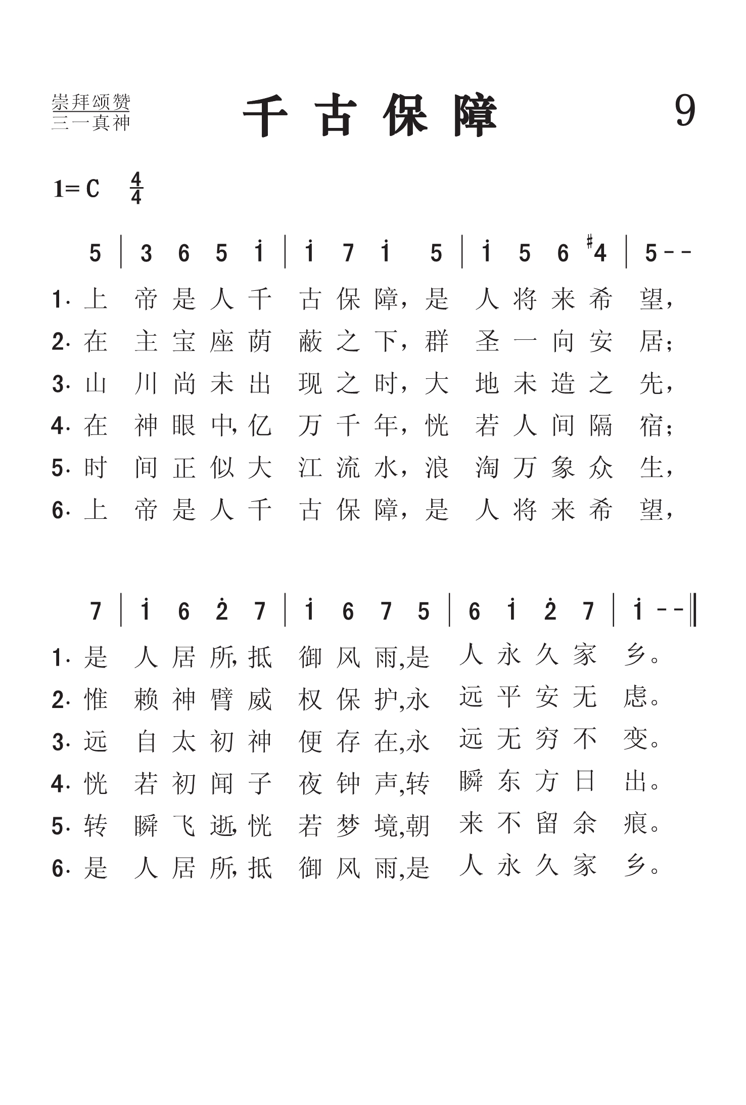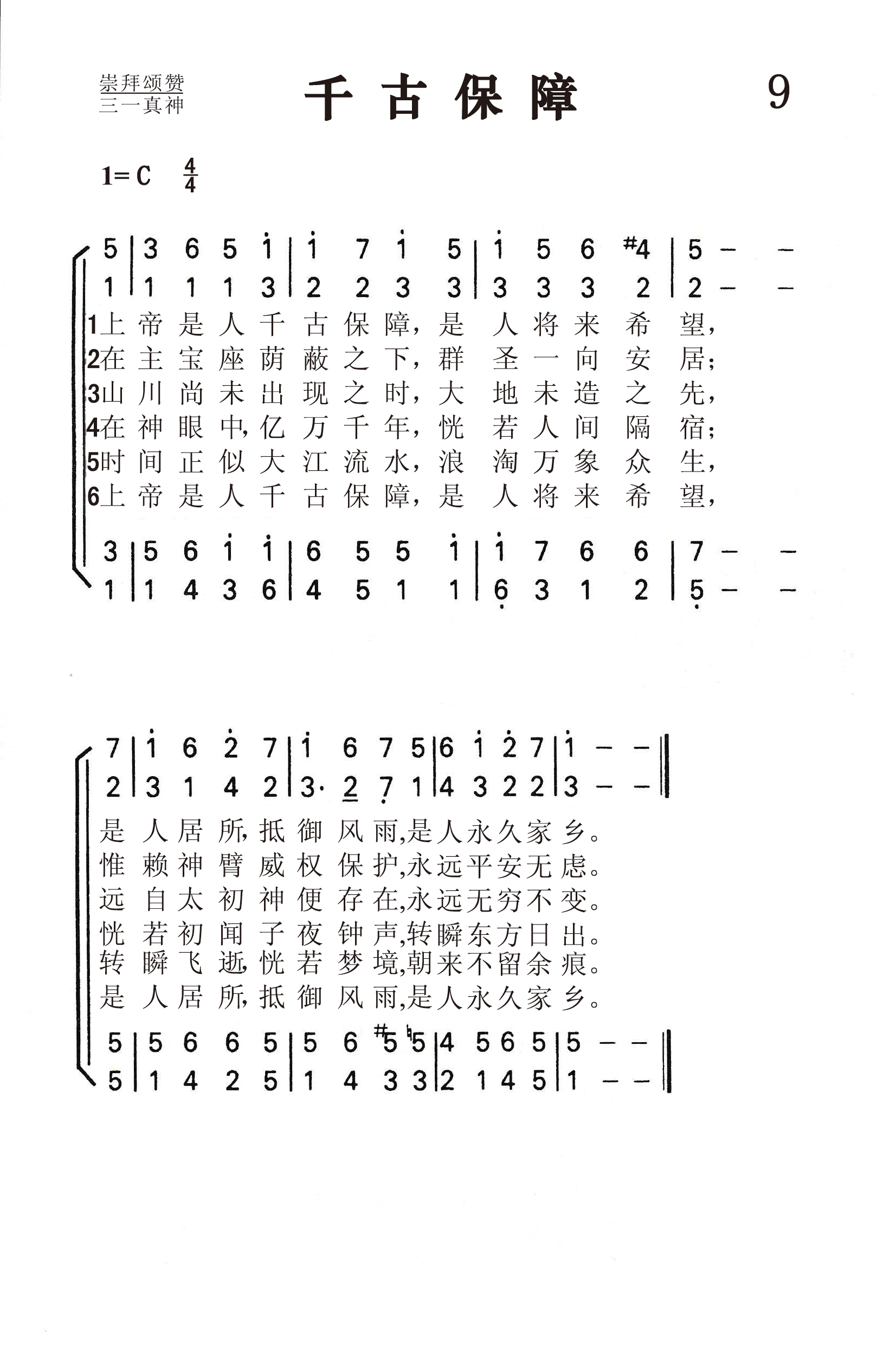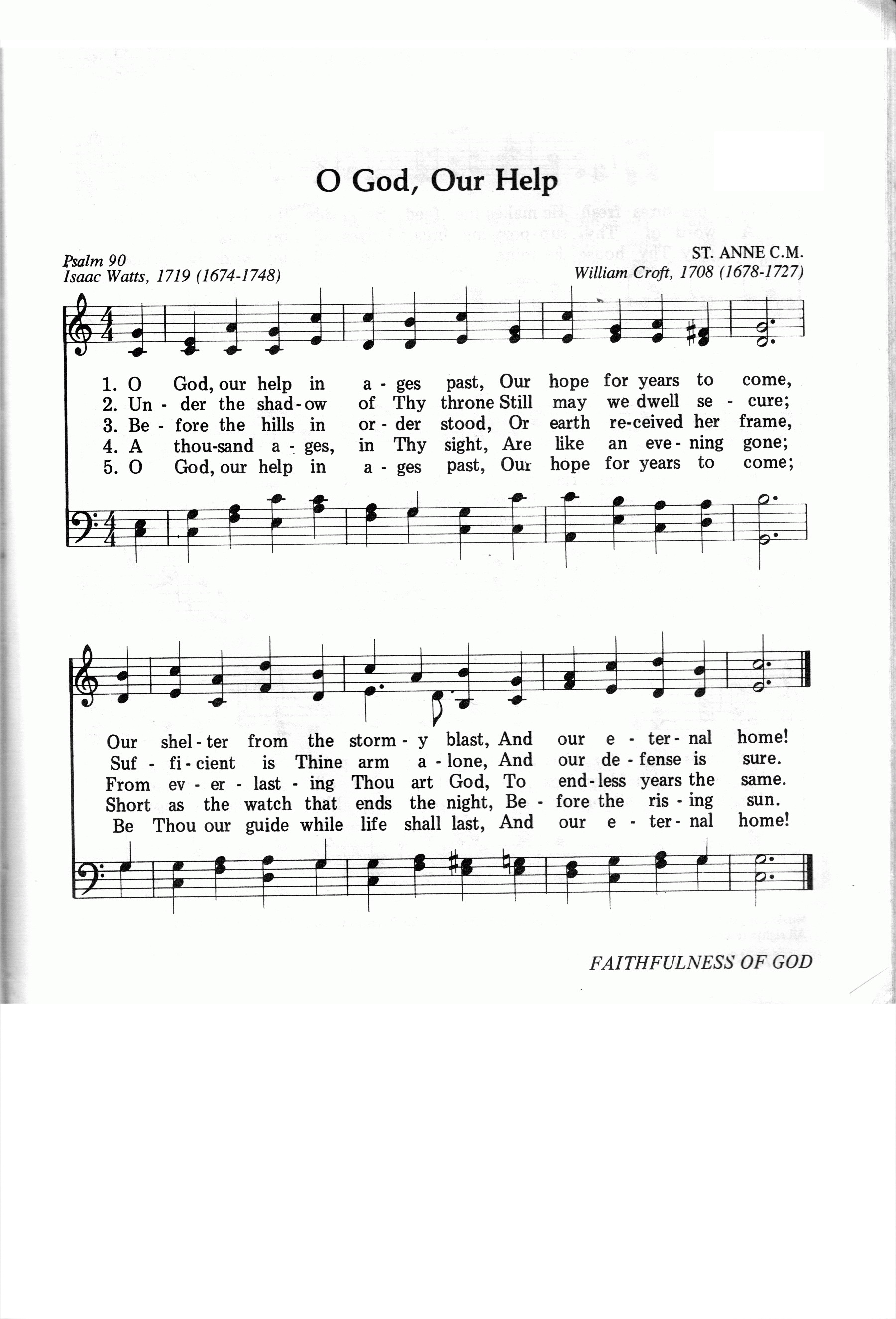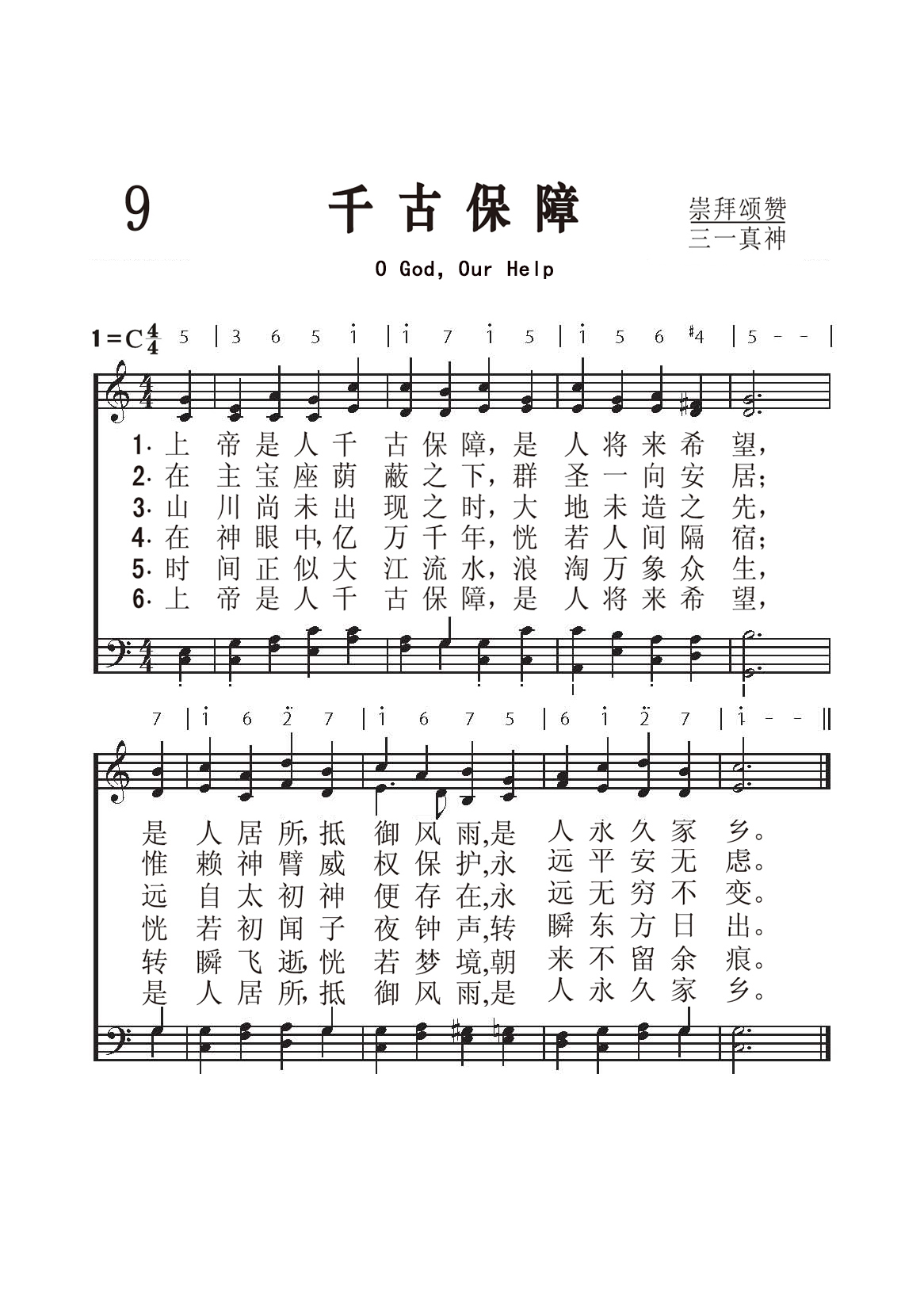 第9首千古保障 O God,Our Help (《赞美诗》506版第74首) 瓦茨(I.Watts. 1674,7,17-1748,11,25)作词(1719年),克罗夫特(W.Croft〈1678-1727,8,14〉改编并配和声(1708年),刘廷芳译(1933年) 上帝是人千古保障,是人将来希望, 是人居所, 抵御风雨,是人永久家乡。 在主宝座荫蔽之下,众圣一向安居; 惟赖神臂威权保护, 永远平安无虑。 山川尚未出现之时,大地未造之先, 远自太初神便存在, 永远无穷不变。 在神眼中, 亿万千年,恍若人间隔宿; 恍若初闻 子夜钟声, 转瞬东方日出。 时间正似大江 流 水,浪淘万象众生, 转瞬飞逝, 恍若 梦 境,朝来不留余痕。 上帝是人千古保障,是人将来希望, 是人居所, 抵御风雨,是人永久家乡。 本诗是瓦茨《诗篇》90篇的韵文新译。诗歌描写以色列人在民族存亡的危急关头,坚信上帝为永不动摇的依靠。原作共有6段。第一段(诗90:1)叙述上帝是人世世代代的居所;第二段说明在上帝荫庇之下,圣徒“平安无虑”(诗90:17);第三段是诗90:2的意译,称上帝是无始无终的永在之神;第四段是诗90:4的扩大:“亿千万年,恍若人间隔宿”;第五段是诗90:5的表意:“时间正似大江流水,浪淘万象众生;”第六段是第一段的重复,也是全诗的总结。 本诗创作于英国新教徒处在内忧外患之际。1714年,安娜女王准备于8月1日宣布宗教统一令,废除宗教改革,恢复天主教,但她却在那一天突然去世,新王乔治一世及时阻止了对新教徒的迫害,使教会化险为夷。本诗素有英国“第二国歌”之称。每逢重大庆典和国家危急时刻,都要唱这首歌。 曲调名《圣安妮》,来源不明,可能是因改编和和声编配者克罗夫特曾在圣安妮教堂当过11年的管风琴师而得名。亨德尔曾用本曲的旋律写成《查思多斯赞美诗》的开始段落。巴赫也曾用这个旋律写过著名的《降E调圣安妮赋格曲》。 词作者瓦茨(Isaac Watts, 1674-1748)出生于英国独立教会一位执事的家庭。当时不属国教的信徒横遭迫害,瓦茨的父亲曾因此被捕入狱,但他们全家人都信仰坚定,刚强不屈。母亲常抱着小瓦茨去探监。由于家境贫困,营养不足,小瓦茨从小身体虚弱,身体矮小。及至长大无钱上学。曾有人愿出资供他上学,但以毕业后要在国教内任圣职为条件,遭到他父子的坚决拒绝,毅然决定自己到伦敦私立学校半工半读。 瓦茨从小就表现出文学方面的才华。18岁那年他从伦敦学校回家度暑假,根据《启示录》第5章写了一首八节的长诗,题为《颂赞被杀的羔羊》,受到信徒热烈的欢迎。于是他几乎每周都写一首,到他21岁时便积累了一百多首,先后出版了好几本圣诗集,其中以1707年问世的《圣诗与灵歌》和1719年出版的《以新约的言语仿写大卫的诗篇》,最为脍炙人口。这些以旧约的诗篇为依据所写的具有福音特点的现代圣诗,为教会的崇拜增色不少。 瓦茨虽然很有才华,却平易近人。他一生健康欠佳, 却坚持登台讲道,诲人不倦。1712年,瓦茨因身体不佳,接受了伦敦阿布尼爵士夫妇的邀请,到他家别墅休养。原定做客一星期,谁知一住就是36年,直到去世。瓦茨的许多诗文是在这个别墅内写成的。除写圣诗以外,瓦茨还将《诗篇》译为韵诗,且着《逻辑学》一书,英国牛津大学曾选作课本。1728年爱丁堡大学授予他荣誉博士学位;他的名字被列入《英国诗人传》之中。他去世后,英国威斯敏斯特教堂特为他立了一个纪念碑。 瓦茨一生写诗600余首,至今仍有许多为人传诵不衰。 曲作者克罗夫特是英国著名的圣乐作曲家和管风琴师。1713年牛津大学授予他音乐博士学位。他的作品甚丰,主要有《圣乐》,《圣歌选》和《羽管键琴曲选》等。 《赞美诗》505版第320首《凡属主仆人》和418首《唯教会稳固》也是克罗夫特作曲的。