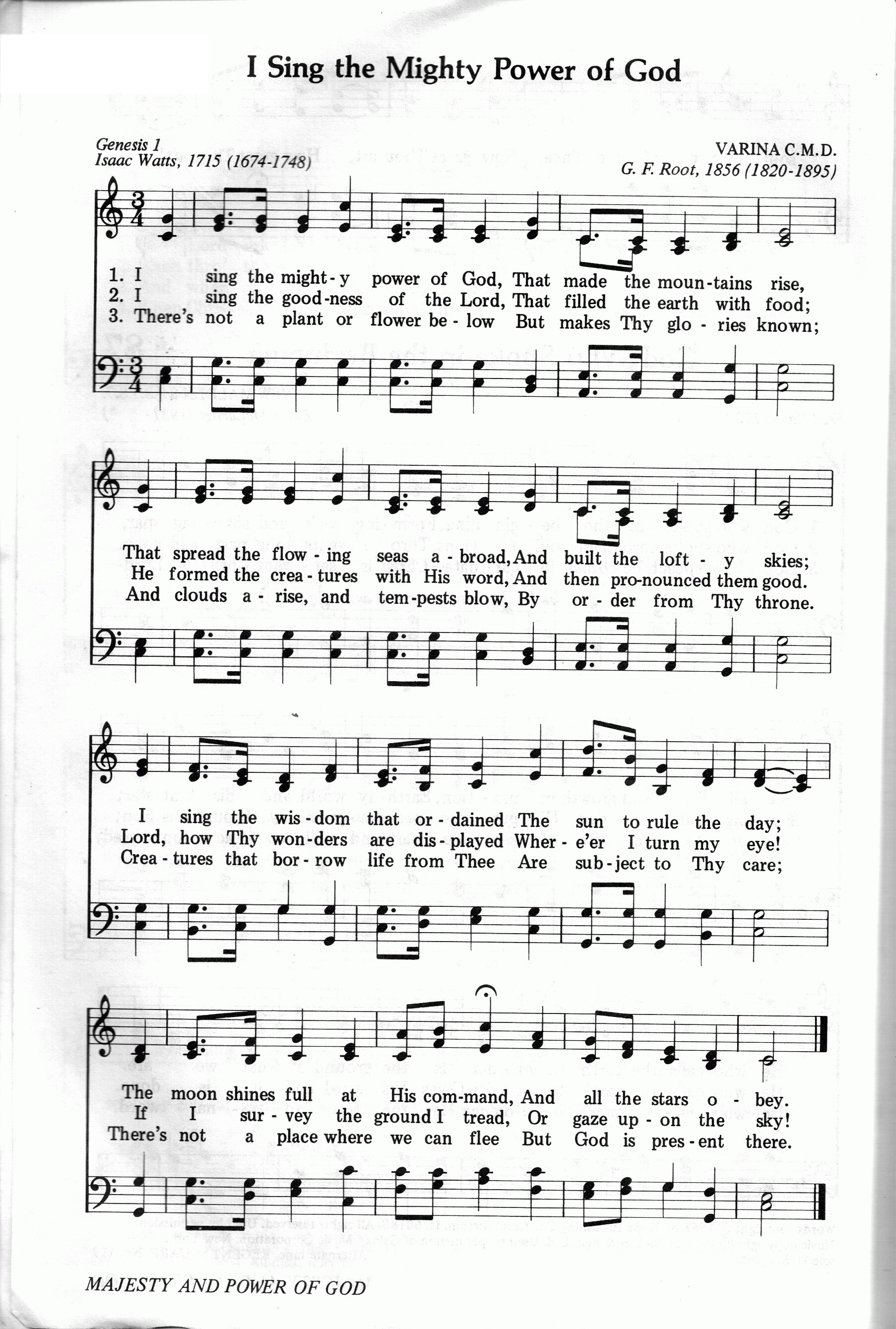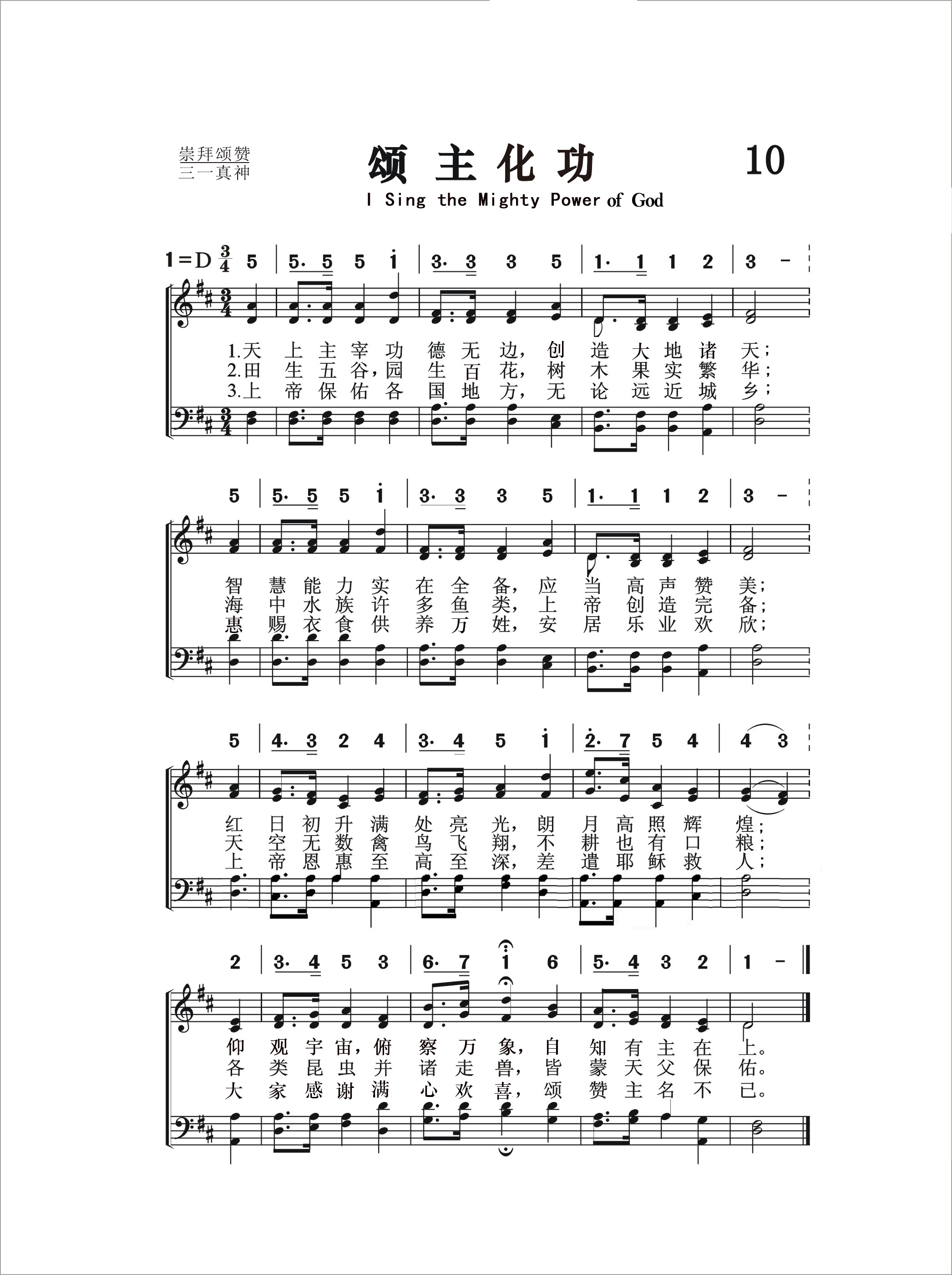 第10首颂主化功 I Sing the Mighty Power 瓦茨(Isaac Watts, 1674-1748)作词,鲁特(G.F.Root.1820-1895)作曲 天上主宰功德无边,创造大地诸天; 智慧能力实在全备,应当高声赞美; 红日初升满处亮光,朗月高照辉煌; 仰观宇宙,俯察万象,自知有主在上。 田生五谷,园生百花, 树木果实繁华; 海中水族许多鱼类 ,上帝创造完备; 天空无数禽鸟飞翔, 不耕也有口粮; 各类昆虫并诸走兽 ,皆蒙天父保佑。 上帝保佑,各国地方 无论远近城乡; 并赐衣食供养万姓 ,安居乐业欢欣; 上帝恩惠至高至深, 差遣耶稣救人; 大家感谢满心欢喜 ,颂赞主名不已。 “地和其中的所充满的,世界和住在期间的,都属耶和华”(诗24:1)。 这首诗歌的首句为“天上主宰功德无边,造成厚地高天,”最早发表于瓦茨1715年编辑出版,为儿童所写的圣诗集内,原题为《颂赞上帝创造与天恩》,全诗共八段,一般赞美诗选其中三段或四段。 瓦茨在该诗集的序言之中说:“这本小册里所集的圣诗大部分是前几年的作品。……我的目的是希望无论青年或少年,也无论是圣公会或是独立派,受过洗的儿童或未受洗的儿童,都能联合起来,异口同声地唱这些诗歌。我尽量用儿童们所能理解的词汇,并尽可能地坚持用这些词汇,让他们共同获益,而不愿有人受到伤害。” 词作者瓦茨出生于英国独立教会一位执事的家庭。当时不属国教的信徒横遭迫害。瓦茨从小身体虚弱,身体矮小。及至长大无钱上学。曾有人愿出资供他上学,但以毕业后要在国教内任圣职为条件,遭到他父子的坚决拒绝,毅然决定自己到伦敦私立学校半工半读。 瓦茨从小就表现出文学方面的才华。18岁就根据《启示录》第5章写了一首八节的长诗,题为《颂赞被杀的羔羊》,到21岁时便积累了一百多首,先后出版了好几本圣诗集,其中以1707年问世的《圣诗与灵歌》和1719年出版的《以新约的言语仿写大卫的诗篇》,最为脍炙人口。这些以旧约的诗篇为依据所写的具有福音特点的现代圣诗,为教会的崇拜增色不少。 瓦茨在1712年因身体不佳,就接受了伦敦阿布尼爵士夫妇的邀请,到他家别墅休养。一住就是36年,直到去世。瓦茨的许多诗文是在这个别墅内写成的。除写圣诗以外,瓦茨还将《诗篇》译为韵诗,且着《逻辑学》一书,英国牛津大学曾选作课本。1728年爱丁堡大学授予他荣誉博士学位;他的名字被列入《英国诗人传》之中。他去世后,英国威斯敏斯特教堂特为他立了一个纪念碑。 瓦茨一生写诗600余首,至今仍有许多为人传诵。 曲作者鲁特是美国19世纪著名音乐家。在他来改行谱写和出版福音圣诗歌曲之前,就已经是一位遐尔闻名,家喻户晓的作曲家,因为他所谱的《自由战歌》,《健儿们前进》是当时北方军队的进行曲,几乎人人都会唱,至今仍相当流行,并且已经有人将之配到赞美诗中来。鲁特长期从事圣乐教学和创作,一生共着有75部宗教歌曲的乐谱和几百首赞美诗,包括与盲诗人克罗斯比合作编着宗教歌剧《花后》。 《颂赞诗歌》261首《主在圣殿中》,272首《天国钟声悠扬》,330首《谁是收割人》和606首《耶稣珍宝》等也是鲁特作曲的。