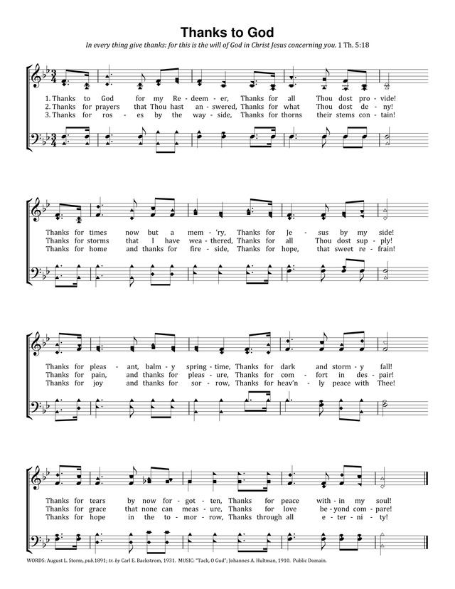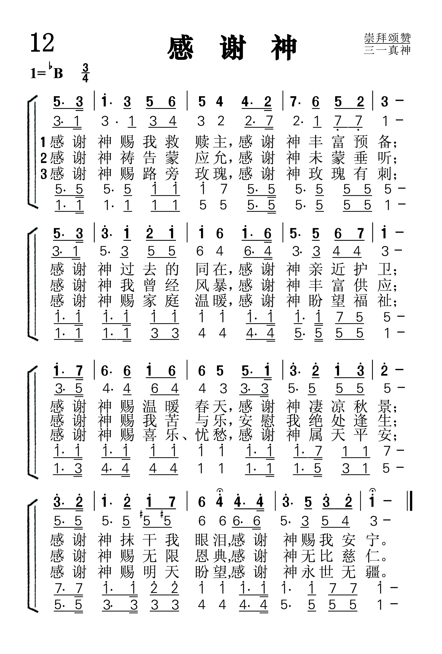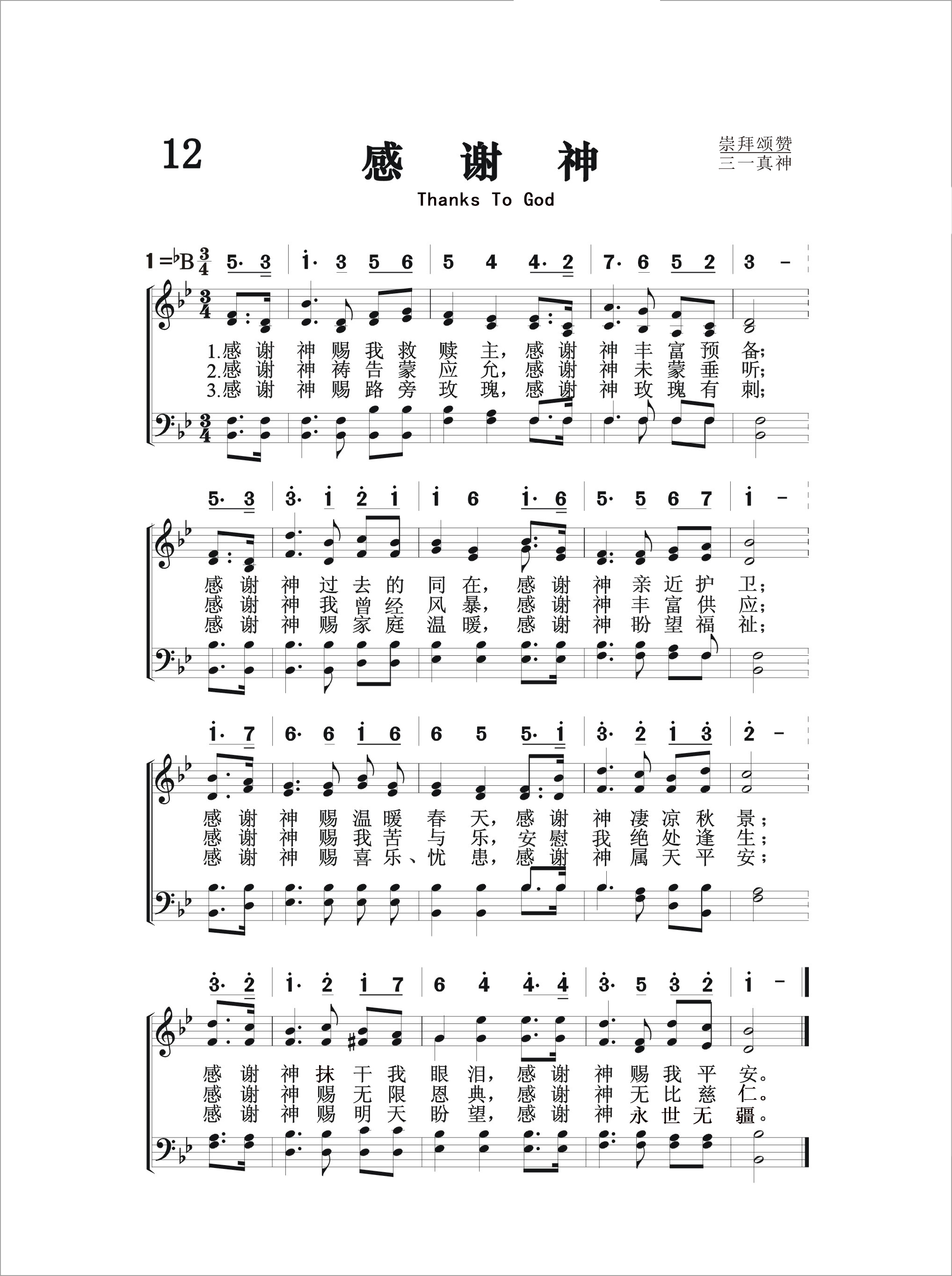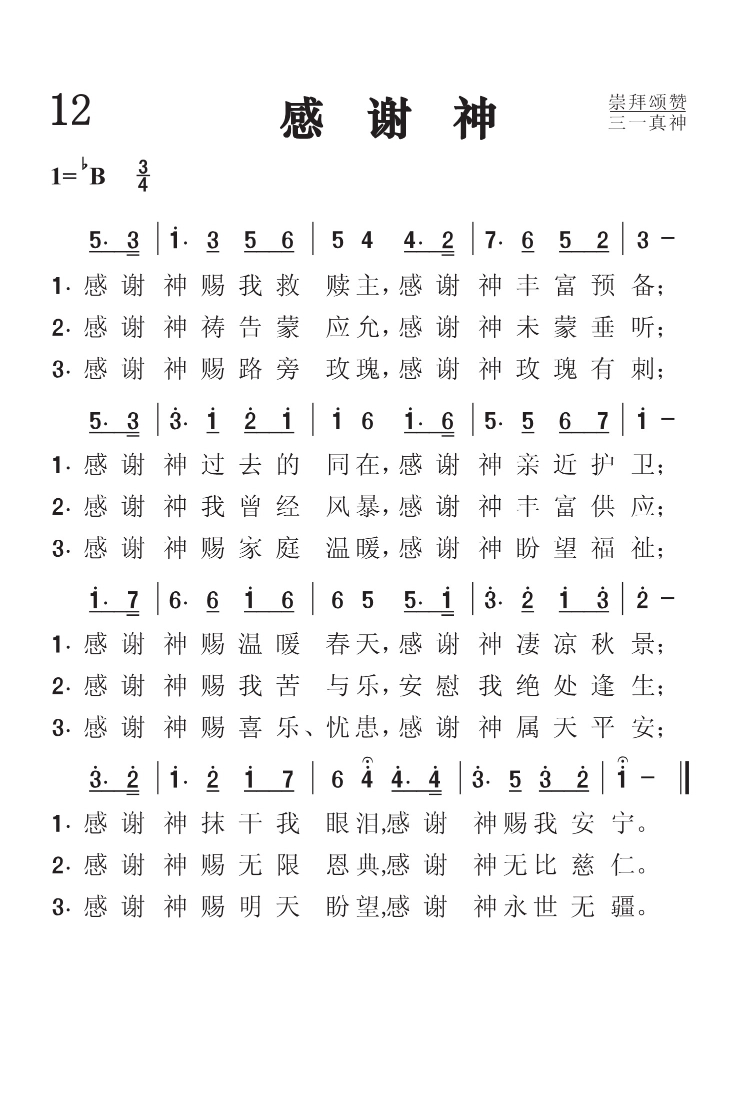 第12首感谢神 Thanks to God 斯托姆(August Ludvig Storm, 1862-1914)作词91891N),赫尔特曼(John A. Hultman, 1861-1942)作曲,巴克斯特伦(Carl Ernest Backstrom )英译(1931年),刘福群、何统雄、林翠微原汉译 感谢神赐我救赎主,感谢神丰富预备; 感谢神过去的同在,感谢神亲近护卫; 感谢神赐温暖春天,感谢神凄凉秋景; 感谢神抹干我眼泪,感谢神赐我安宁。 感谢神祷告蒙应允, 感谢神未蒙垂听; 感谢神我经历风暴, 感谢神丰富供应; 感谢神赐我苦与乐, 感谢神绝处逢生; 感谢神赐无限恩典, 感谢神无比慈仁。 感谢神赐路旁玫瑰, 感谢神玫瑰有刺; 感谢神赐家庭温暖, 感谢神盼望福祉; 感谢神赐喜乐、忧患, 感谢神属天平安; 感谢神赐明天盼望 ,感谢神永世无疆。 这是一首著名的瑞典圣诗。原文共有四节,每句都以“感谢神”开头,共有三十二个“感谢神”。 巴克斯特伦在把这首诗译成英语时删除了第三节。 词作者斯托姆在救世军的聚会中蒙恩,后来成为瑞典救世军领导人之一。 这首诗是为救世军的刊物而作。斯托姆在三十七岁时,背部受重伤,以至终身残疾,不时疼痛不已,但他继续在救世军聚会中讲道,并为刊物写作。 曲作者赫尔特曼也是瑞典人,童年时随父母移民美国。六十多年时间里,他以优美的歌声,往返于瑞典和美国之间,进行圣诗演唱,广受欢迎,被誉为“阳光歌手”。他共创作过五百多首歌。 他八十一高龄在加利福尼亚州的一个教会里演唱福音圣诗时逝世。
