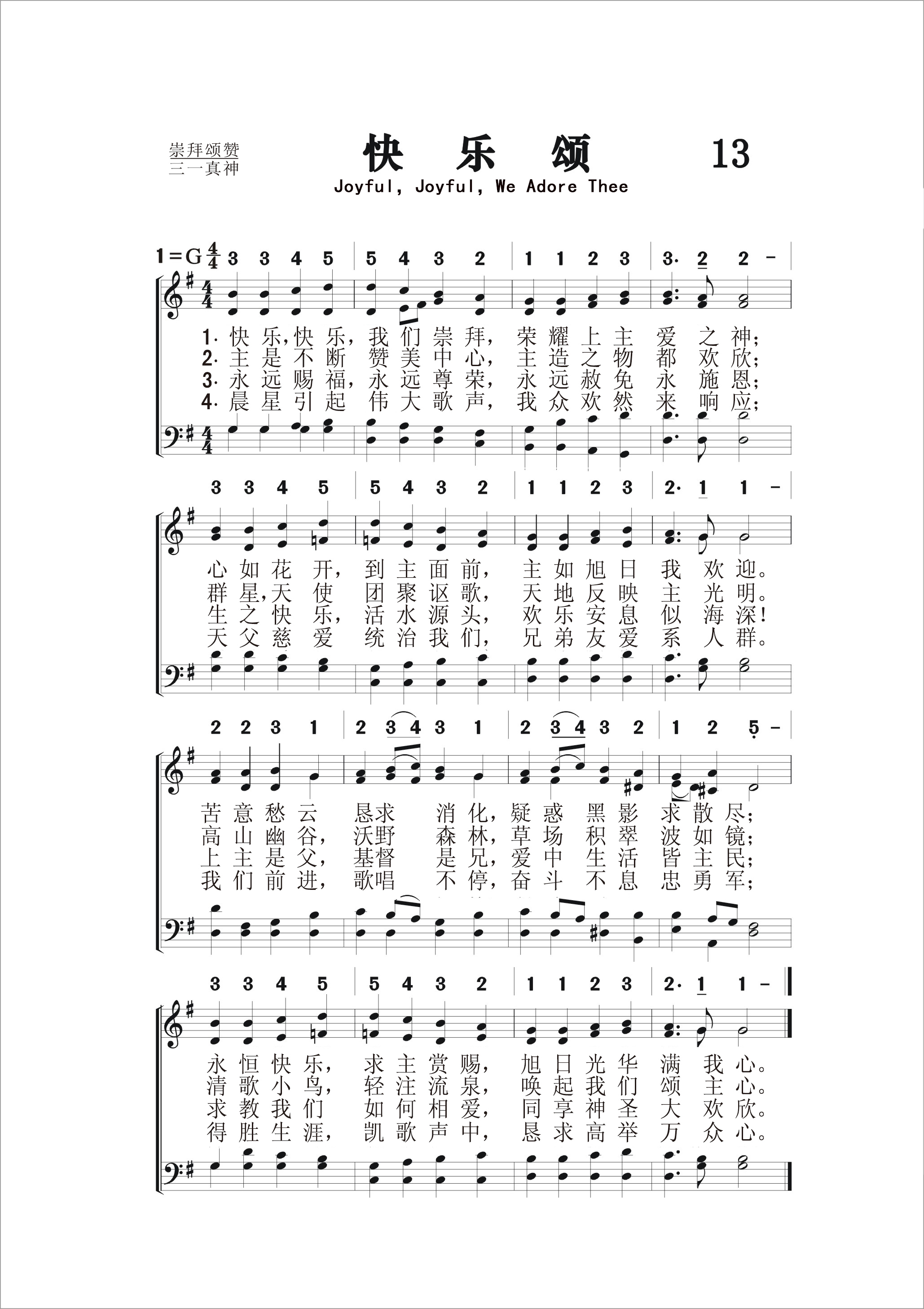 第13首快乐颂 Joyful,Joyful,We Adore Thee 范.戴克(Henry Van Dyke,1852-1933)作词(1908年),贝多芬(Ludwig van Beethoven,1770,12,16-1827,3,26)作曲(1823年),霍奇斯(E.Hodges,1796,7,20—1867,9,1)改编。刘廷芳译(1934年)。 快乐,快乐,我们崇拜,荣耀上主爱之神; 心如花开,到主面前,主如旭日我欢迎。 苦意愁云恳求消化,疑惑黑影求散尽; 永恒快乐,求主赏赐,旭日光华满我心。 主是不断赞美中心,主造之物都欢欣; 群星天使团聚讴歌, 天地反映主光明。 高山幽谷,沃野森林 ,草场积翠波如镜; 清歌小鸟,轻注流泉, 唤起我们颂主心。 永远祝福,永远尊荣 ,永远赦免永施恩; 生之快乐,活水源头, 欢乐安息海样深! 上主是父,基督是兄, 爱中生活皆主民; 求教我们如何相爱, 同享神圣大欢欣。 晨星引起伟大歌声, 我众欢然来响应; 天父慈爱统治我们 ,兄弟友爱系人群。 我们前进,歌唱不停, 奋斗不息忠勇军; 得胜生涯,凯歌声中 ,恳求高举万众心。 词作者范.戴克是美国著名牧师,作家和外交官。他于1873年毕业于普林斯顿大学以后进入普林斯顿神学院学习,历任好几个长老会会堂的牧师。1899年起,他回母校普林斯顿大学任文学教授;1913年被威尔逊总统任命为驻荷兰和卢森堡公使。第一次世界大仗时,他任美国海军随军牧师。晚年他从事写作,当选为美国艺术和文学研究会主席。他一共着书25本,如《第四博士》,《兰花》和《伤心的牧人》等。1905年起,他担任长老会《公共礼拜礼文》的主编。 1907年,范.戴克应邀到美国威廉斯大学演讲。那里的青翠山峦激发了他写下这首《快乐歌》,献给威廉斯大学的校长,并嘱咐他必须配上贝多芬《第九交响曲》(《欢乐颂》)的主题。 音乐大师贝多芬是著名的德国作曲家和钢琴演奏家,13岁就开始举办钢琴演奏会。后因耳聋而改以作曲为主。他热爱生活,热爱自然,虽然一生贫苦潦倒,屡经坎坷,但他用音乐表达了他的激情和向往。他去世时,维也纳出动了上万辆马车,有两万人为他送葬。他还创作过许多宗教音乐,如《D大调庄严弥撒》,《C调弥撒》,清唱剧《基督在橄榄山上》。《第九交响曲》是他的晚年之作,写于1817-1823年,原词中有:“我拥抱你们,亿万人民……一切生命都蒙福,昆虫也得到上帝的祝福,撒拉弗与上帝同在一起。”表达了他对于人类和大自然的爱。其主旋律后经英国圣诗作者霍奇斯稍加改动。1911年长老会新编的赞美诗集把它与范.戴克的歌词相配,遂成了世界各地的信徒所爱唱的一首赞美诗。