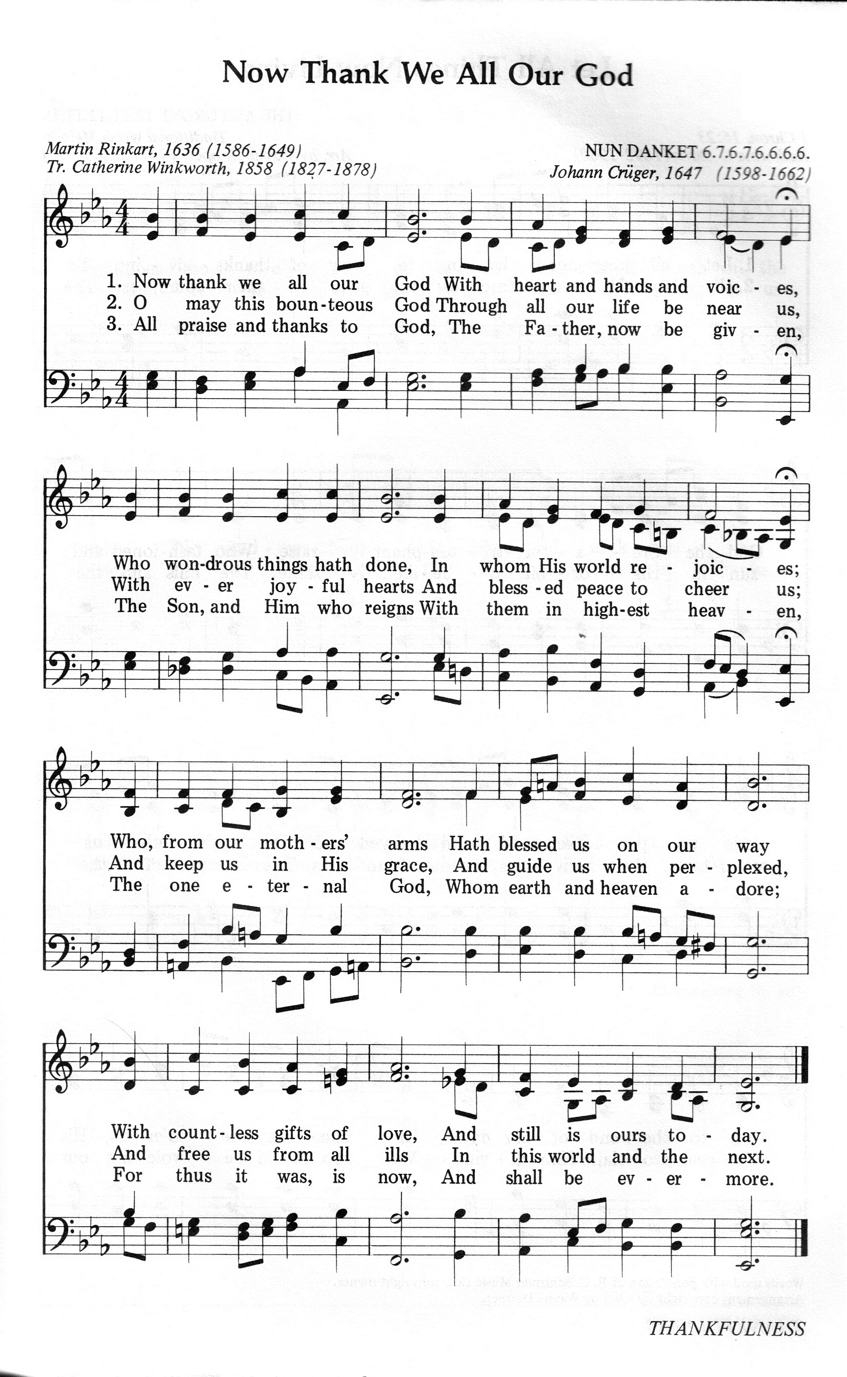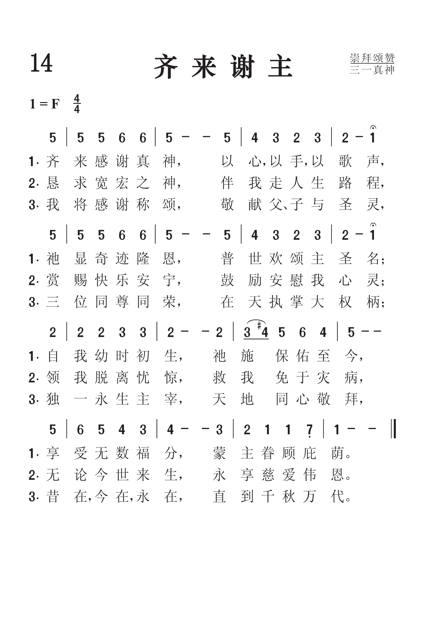 第14首齐来颂主 Now Thank We All Our God 马丁.林卡特(M.Rinkart,1586,4,23-1649,12,8)作词,克吕格尔(J.Cruger,1598,4,9-1662,2,23)作曲(1648年),凯瑟琳.温可沃思(Cathering Winkworth,1827,9,13-1878,7,1)英译(1858年) 齐来感谢真神,以心,以手, 以歌声, 祂显奇迹隆恩,普世欢颂主圣名; 自我幼时初生,祂施保佑至今, 享受无数福分,蒙主眷顾庇荫。 恳求宽宏之 神,伴我走人生路程,, 赏赐快乐安宁, 鼓励安慰我心灵; 领我脱离忧惊, 救我免于灾病, 无论今生来世 ,永享慈爱伟恩。 我将感谢颂扬, 敬献父、子、与圣灵, 三位同尊同荣,在天执掌大权柄; 独一永生主宰,天地同心敬拜, 昔在、今在、永在,直到 千秋万代。 这是一首德国圣诗。词作者林卡特是德国著名的牧师,作家,音乐家和戏剧家。他出生于萨克林省艾伦堡。父亲是制桶工人。虽然家境贫寒,却节衣缩食供儿子上学。林卡特先后就读于艾伦堡中学和莱比锡托玛斯十年制学校。他担任过托玛斯大教堂唱诗班指挥,表现出非凡的音乐才能。1607年起担任牧者圣职长达32年,无畏地宣传上帝的道,同情劳动人民,谴责在饥荒中为富不仁的高利贷者和骗子。1615年他被封为桂冠诗人。 1617年他升任艾伦堡区牧师长。第二年爆发了以德国为主要战场的三十年战争。艾伦堡饱受兵难,三次遭到劫掠,又经历黑死病之灾。有一段时期全城只剩下他一个牧师,每天都要举行十次至几十次的葬礼。单1637年一年,他就主持了4480次葬礼。死者包括他的妻子,兄弟,同事和好几为议员。 黑死病以后,又遇饥荒。林卡特牧师与全城居民同甘共苦。他把自己的全部财产都捐献购买粮食济贫。面对乱兵的骚扰,他多次挺身而出,并率领信徒虔诚祈祷,终于盼来了解放的日子。 战争结束以后,政府号召举行全国性的感恩礼拜,以《圣书后典.便西拉智训》50:22,23作为各堂的讲题:“现在你们当称颂万有的上帝,因为祂在世上行了奇事。主提拔世人出离母胎,又照祂的旨意恩待我们。愿主赐给我们快乐的心;愿我们的日子永庆太平。”林卡特感慨万分,就据此写了这首诗,表达了他对上帝的感恩和赞美。首唱以后,德国每遇重大事件,如国王登基,新堂落成,都要献唱这首诗。它被誉为德国的《赞美颂(Te Deum Laudamus)》。 这首诗格律严谨,语言庄重,感情充沛。全诗共分三段。第一段为感恩,第二段为祈祷,第三段为赞美。 曲作者是德国著名音乐理论家和作曲家克吕格尔。他曾就读于威丁堡大学。自1662年起到逝世,他一直担任柏林圣尼古拉大教堂圣诗班总监和指挥。他曾亲历三十年战争的悲惨,在信仰是越加坚定。他创作了许多赞美诗的曲谱,至今仍传唱不绝。本诗旋律曾被门德尔松和巴赫的作品所吸收和改编。德国一些教堂的大钟也经常鸣奏它。 《赞美诗》(505版)第440首《主定之日》也是克吕格尔作曲(1653年)的。 本诗英译者凯瑟琳.温可沃思国一位才德兼备的女基督徒,终生关注妇女的教育工作,担任过一些相关组织的重要职务。她热心于翻译事业,曾把数百首德语赞美诗译成英语。《颂赞诗歌》第16首《赞美全能真神》(505版)第22首《遵命聚集》和第110首《长夜将尽》等也是温可沃思英译的。