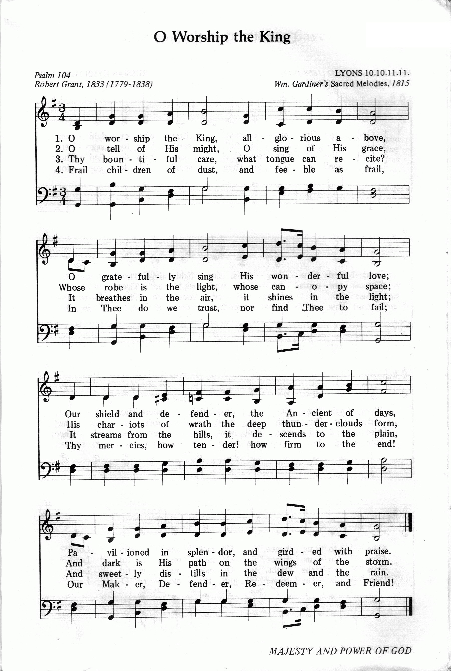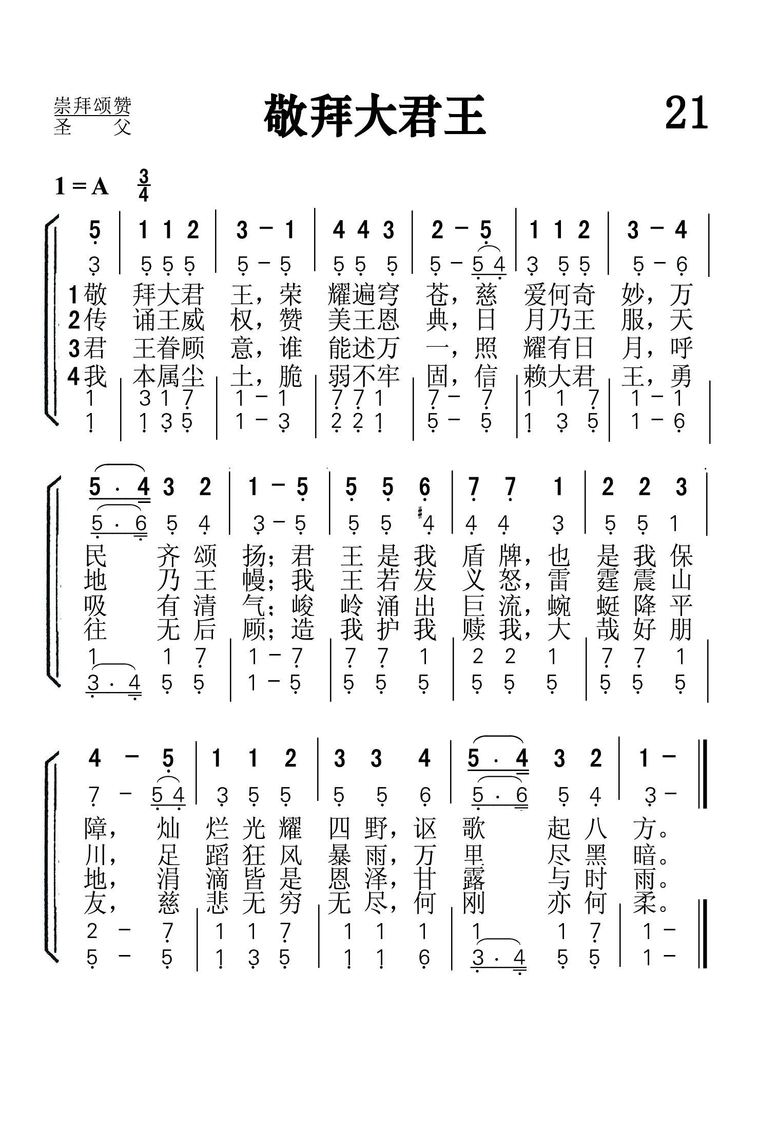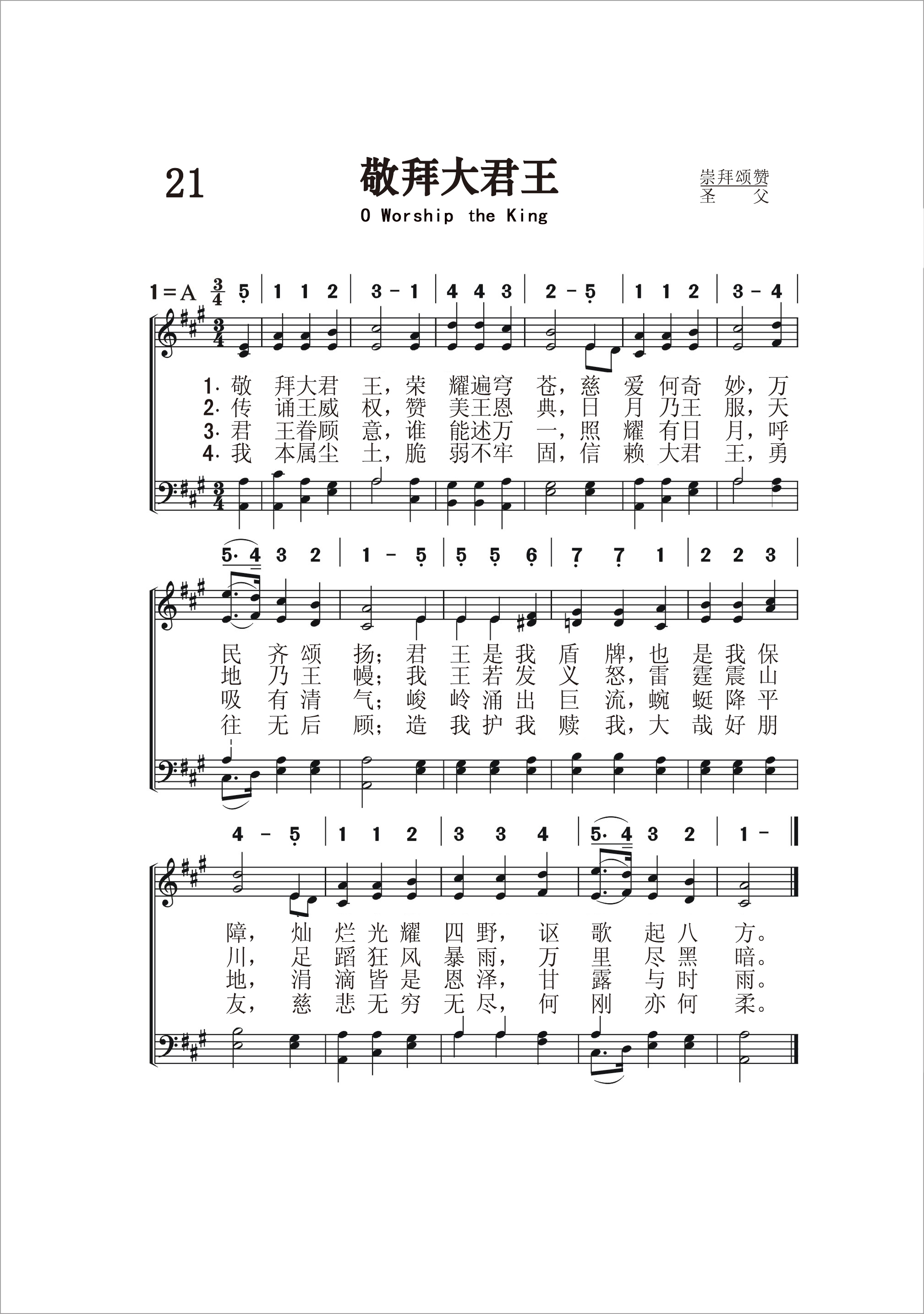 第21首敬拜大君王 O Worship the King 格兰特(G..Grant,1779-1838,7,9)作词(1834年),迈克尔.海顿(M.Haydn,1737,9,14-1806,8,10)作曲(1770年) 敬拜大君王,荣耀遍穹苍,慈爱何奇妙,万民齐颂扬; 君王是我盾牌,也是我保障,灿烂光耀四野,讴歌起八方。 传诵王威权 ,赞美王恩典,日月乃王服, 天地乃王幔; 我王若发义怒 ,雷霆震山川,足蹈狂风暴雨, 万里尽黑暗。 君王眷顾意 ,谁能述万一,照耀有日月, 呼吸有清气 俊岭涌出巨流 ,蜿蜒降平地,涓滴皆是恩泽 甘露与时雨。 我本属尘土 ,脆弱不牢固,信赖大君王 ,雄飞无后顾, 造我护我赎我,大哉好朋友,慈悲无穷无尽,何刚亦何柔。 词作者格兰特是英国圣公会的平信徒,出生于印度的孟加拉国国,因他父亲在英国东印度公司任要职。格兰特在剑桥大学毕业后于1807年担任律师。1818年当选为议会议员。1833年在议会倡议取消限制犹太人的苛律,取得成功。1832年起担任最高法院法官。两年后出任英国驻孟买总督。他同时又是一位虔诚的基督徒,经常写诗投稿《基督教观察报》。他去世后,他的哥哥把他所写的十二首圣诗结集出版。 《敬拜大君王》是格兰特根据十六世纪苏格兰长老会牧师基思(W.Kethe)的《日内瓦诗篇》104篇改写的。原诗共有六节,气势魁伟而雄峻,表现了上主无限的威仪和权能,以及人类在祂面前所应有的谦恭和崇敬。 本诗所采用的曲调为迈克尔.海顿所作。他是奥地利音乐大师海顿(清唱剧《创世记》等的作者)的弟弟。他既是男高音歌唱家,同时又精通多种乐器。和他的哥哥一样,他是一位无师自通的天才音乐家,曾创作圣歌近460首,长期担任教会司琴和圣乐队指挥。610首《上主真光照临》,《赞美诗》(505版)101首《宝贵救主》也是他作曲的。