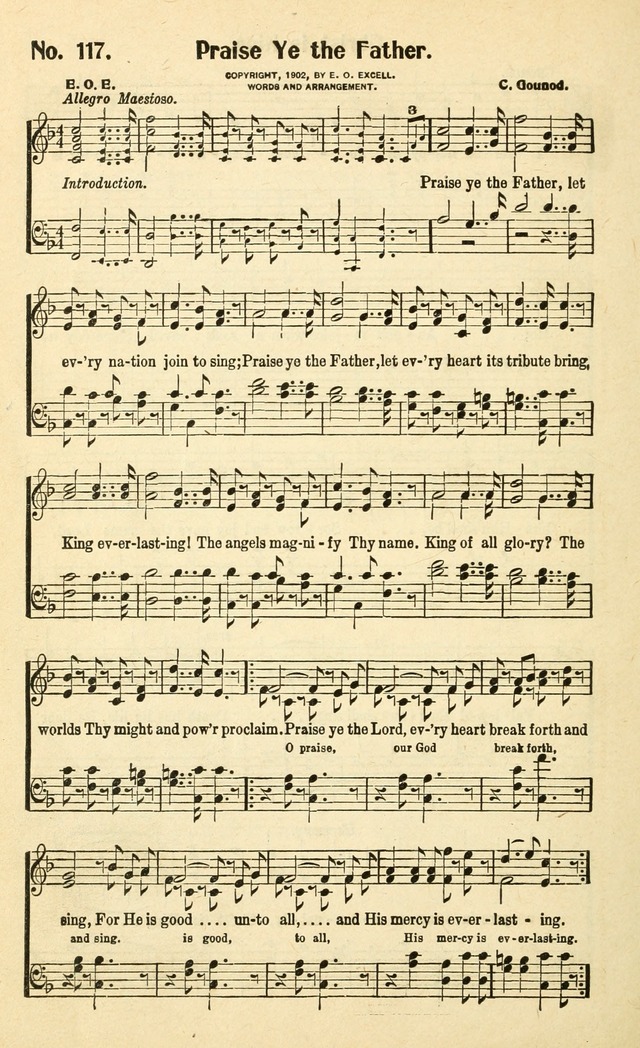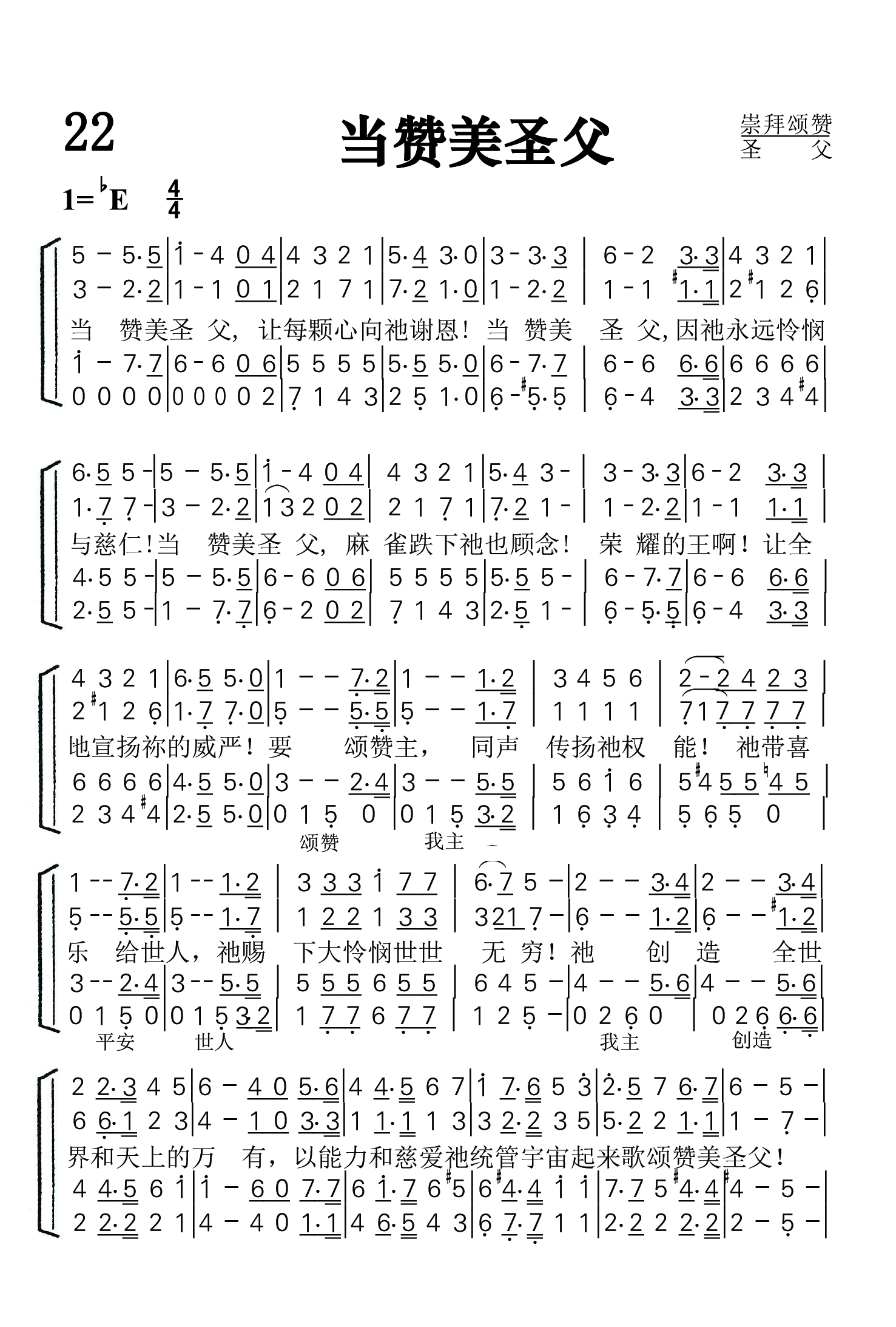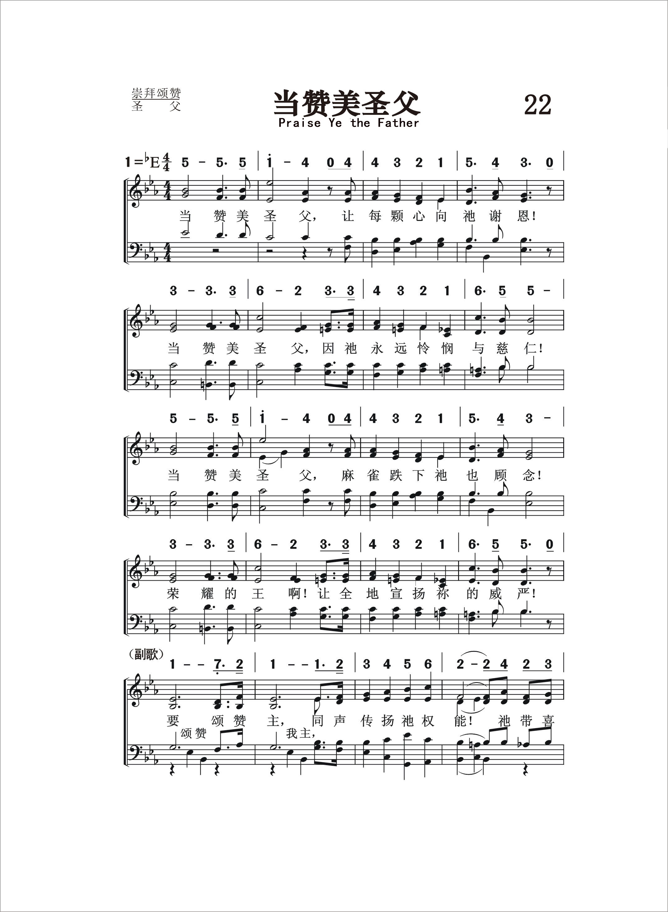 第22首 当赞美圣父 Praise Ye the Father 根据法国作曲家古诺(Charles Francios Gounod,1818-1893)的原曲改编 当赞美圣父,让每颗心向祂谢恩! 当赞美圣父,因祂永远怜悯与慈仁! 当赞美圣父,麻雀跌下祂也顾念! 荣耀的王啊!让全地宣扬祢的威严! 要颂赞主,同声传扬祂权能, 祂带喜乐给世人,祂赐下大怜悯世世无穷; 祂创造全世界和天上的万有, 以能力和慈爱祂统管宇宙, 起来歌颂赞美圣父! 赞美归于圣父 ,归于圣子,归于圣灵, 万国当赞美祂 ,全世界都因祂欢腾! 荣耀归于我君王! 荣耀归于祂永远的名! 愿全地喜悦在祂爱中欢欣,当赞美我主 古诺毕业于巴黎音乐学院,1839年获罗马大奖,后去奥地利和德国访问。回国后在巴黎的外国传教团教堂任管风琴师与唱诗班指挥。他曾受过神职训练,但没有接受按立。1851年开始创作歌剧。1852-1860年任俄耳菲昂联合合唱协会指挥,后移居英国(1870-1875年),组织了一个唱诗班,为后来皇家合唱团的前身。他最有名的歌剧是《浮士德》(巴黎,1859年)。他是一位多产的作曲家,作有歌剧,清唱剧,康塔塔,教堂乐曲和管弦乐曲多部。