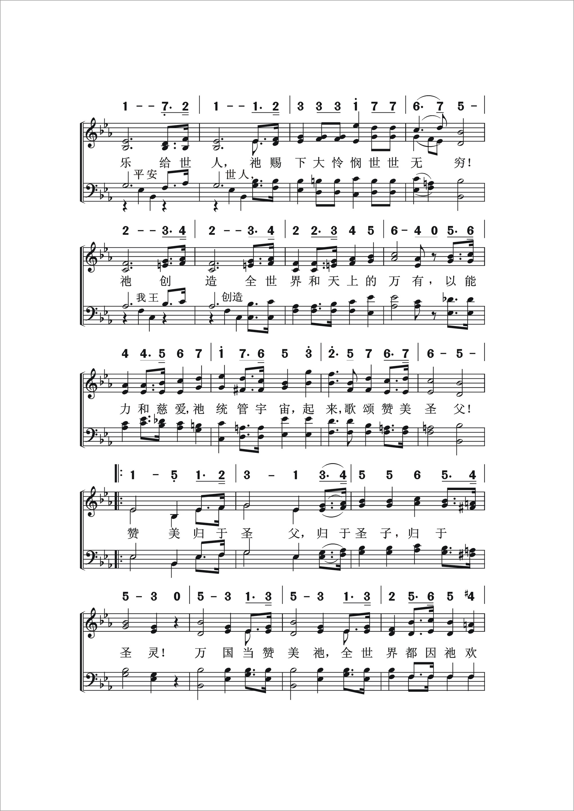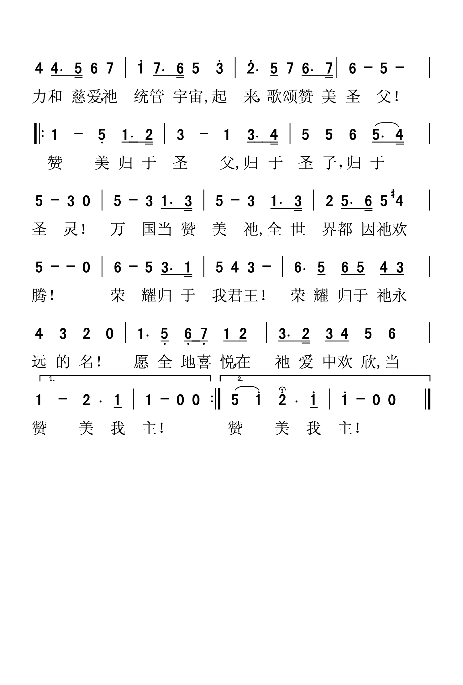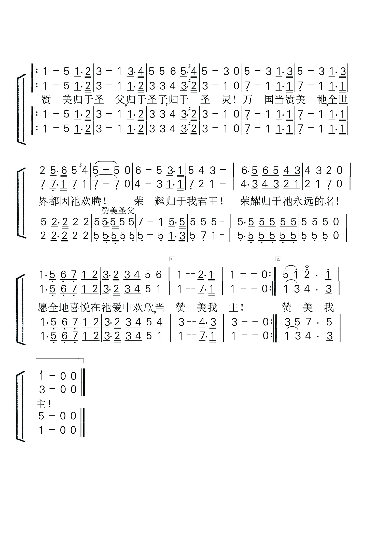 第22首 当赞美圣父 Praise Ye the Father 根据法国作曲家古诺(Charles Francios Gounod,1818-1893)的原曲改编 当赞美圣父,让每颗心向祂谢恩! 当赞美圣父,因祂永远怜悯与慈仁! 当赞美圣父,麻雀跌下祂也顾念! 荣耀的王啊!让全地宣扬祢的威严! 要颂赞主,同声传扬祂权能, 祂带喜乐给世人,祂赐下大怜悯世世无穷; 祂创造全世界和天上的万有, 以能力和慈爱祂统管宇宙, 起来歌颂赞美圣父! 赞美归于圣父 ,归于圣子,归于圣灵, 万国当赞美祂 ,全世界都因祂欢腾! 荣耀归于我君王! 荣耀归于祂永远的名! 愿全地喜悦在祂爱中欢欣,当赞美我主 古诺毕业于巴黎音乐学院,1839年获罗马大奖,后去奥地利和德国访问。回国后在巴黎的外国传教团教堂任管风琴师与唱诗班指挥。他曾受过神职训练,但没有接受按立。1851年开始创作歌剧。1852-1860年任俄耳菲昂联合合唱协会指挥,后移居英国(1870-1875年),组织了一个唱诗班,为后来皇家合唱团的前身。他最有名的歌剧是《浮士德》(巴黎,1859年)。他是一位多产的作曲家,作有歌剧,清唱剧,康塔塔,教堂乐曲和管弦乐曲多部。