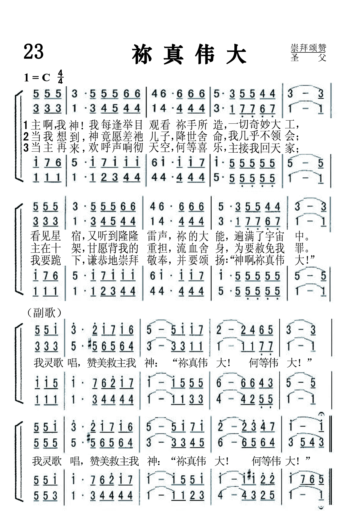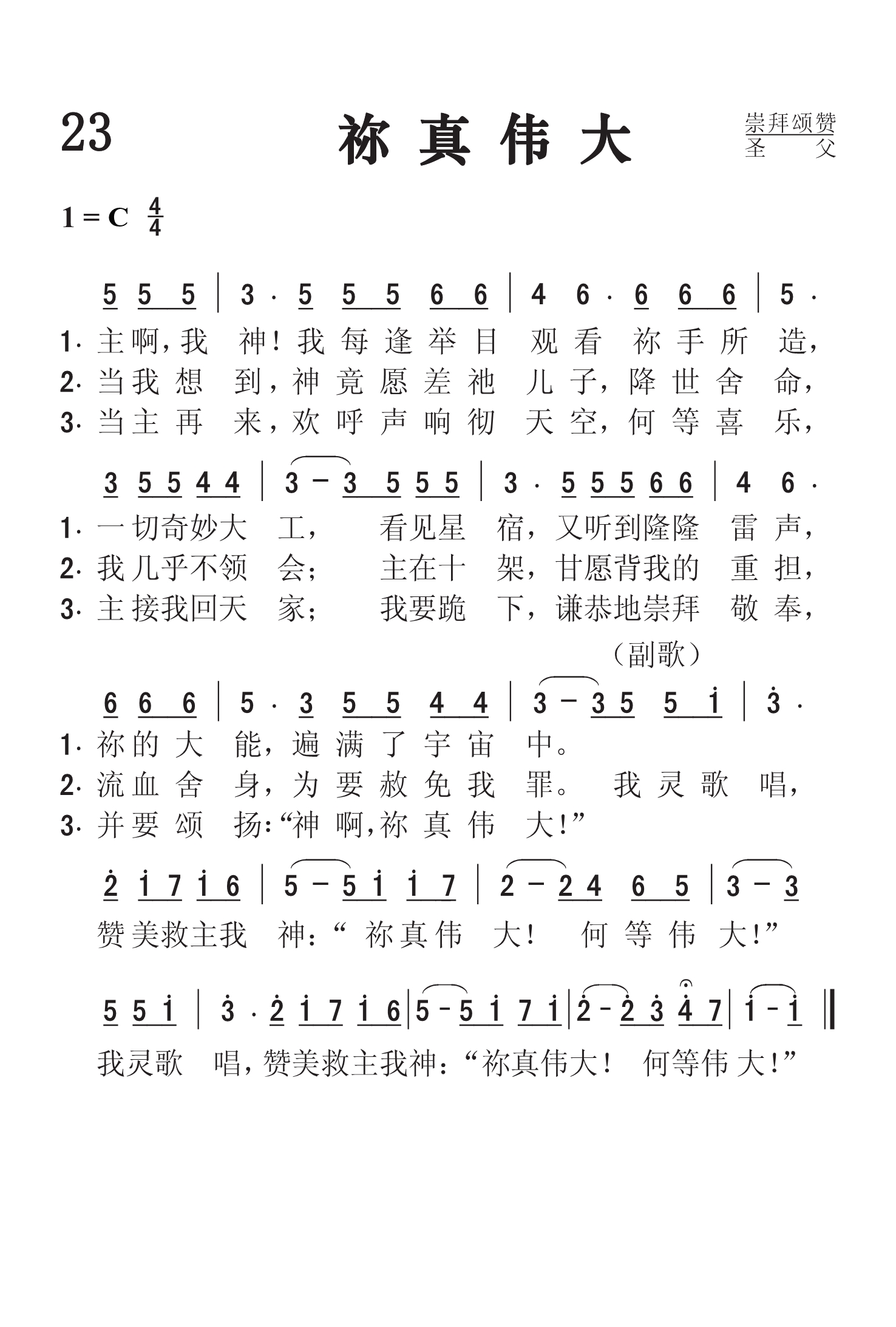 第23首 祢真伟大 How Great Thou Art 卡尔.波伯特(Carl G.Boberg,1859,8,16-1940,1,7)作词,海因(Stuart K.Hine,1899,7,25-1989)英译,休斯(R.J.Hughes)根据瑞典民歌曲调改编,黄永熙汉译(1976年) 主啊,我神!我每逢举目观看祢手所造,一切奇妙大工, 看见星宿,又听到隆隆雷声,祢的大能,遍满了宇宙中。 当我想到 ,神竟愿差祂儿子,降世舍命,我几乎不领会; 主在十架 ,甘愿背我的重担,流血舍命,为要赦免我罪。 当主再来,欢呼声响彻天空,何等喜乐,主接我回天家 我要跪下 ,谦恭地俯伏敬拜,并要颂扬:“神啊,祢真伟大!” 我灵歌唱,赞美救主我神:祢真伟大!何等伟大! 这首诗歌的词作者卡尔.波伯特出生于瑞典东南海岸蒙斯特拉斯的一个在船坞工作的木匠家庭。他18岁信主,就读克里斯蒂尼汉姆圣书学校,并开始在本地传道。1890-1916年任基督教周刊《真理见证》编辑。1911-1924年代表本城任瑞典国会上院议员。这首诗原名《O Store Gud》。 1880年夏,有一天波伯特郊游时,突遇雷雨,不及躲避。一时雷声隆隆,电光闪闪,暴雨倾盆而下。然而瞬间雨霁天晴,阳光普照,大地苏醒,清澈宁静,花草上满缀着晶莹水珠,枝头小鸟飞回轻唱。 他震惊于宇宙主宰创造的伟大和奇妙,屈膝赞美神的大能,他的心灵如沐而更新,于是写下了九段诗章;随着雨后的彩虹,踏上归途。回家后他将诗分成二节,配上瑞典古老民谣的曲调。其后他在讲道时,与信徒分享这一段经历和诗歌,一时大受欢迎。 1886年这首诗经付印后,传咏瑞典全国各教会。1907年被译成德文。 1927年,有一位俄国人将这首圣诗自德文译成俄文。同年有一位英国卫理公会的宣教士海因(Stuart K. Hine)到乌克兰传道,听到这首歌后,十分喜欢,经常在传福音时,与妻子合唱此圣诗。数年后他返国,遍走欧洲各国传道,当他在捷克一个小山庄工作时,就把它译成英文,但并未付印。二次世界大战后,海因在英国居住了十年。1948年,他去探望一个难民营,那里有数百流亡的俄国人,他们虽在寄居之地有较多的自由与安全,但内心无时不在思念何日才能归故乡。有感于这些难民的情操,他写下了第三节,颂扬主再来时的喜乐,而交给一个小出版商付印。 1954年葛理翰布道大会时,有人递给谢伊(George Beverly Shea)这首圣诗。翌年他在加拿大多伦多布道大会时,由数百人联合的诗班,将这首圣诗唱得气势磅礡,接着又在伦敦的布道大会选唱。不久它就流传全球。《祢真伟大》和《奇异恩典》是现代最热门的两首圣诗。 猫王(Elvis Presley)在1967年度第10届格莱美奖中凭借 《祢真伟大》获得了最佳圣乐表演奖(Best Sacred Performance),1975年举行的1974年度第17届格莱美颁奖中他凭借此曲取得最佳非古典类灵感奖(Best Inspirational Performance)。 本诗的英译者海因出生于英国伦敦,曾在库柏公司学校接受教育。第一次世界大战时在法国服役。后由卫理公会授予圣职,到俄国,乌克兰,罗马尼亚,波兰和捷克等国传道(1923-1939年)。1939年因战争爆发而返英,在十万东欧难民中开展圣工,用他们自己的文字印发各种福音传单,播撒真理的种子。